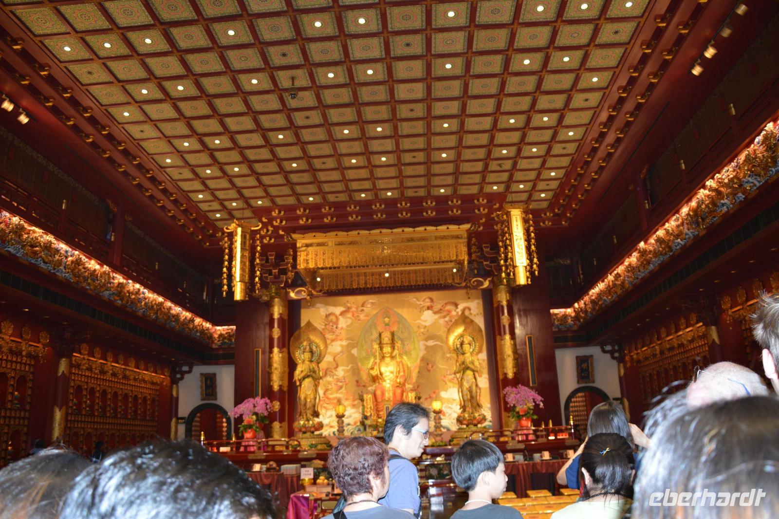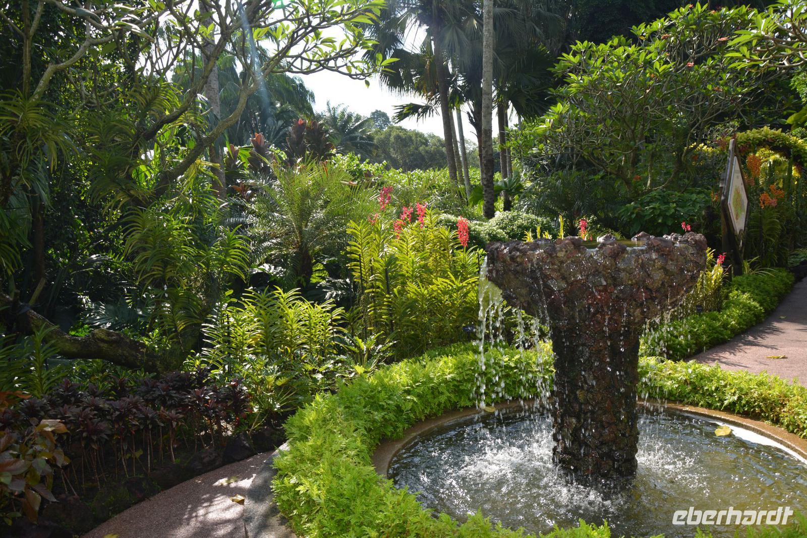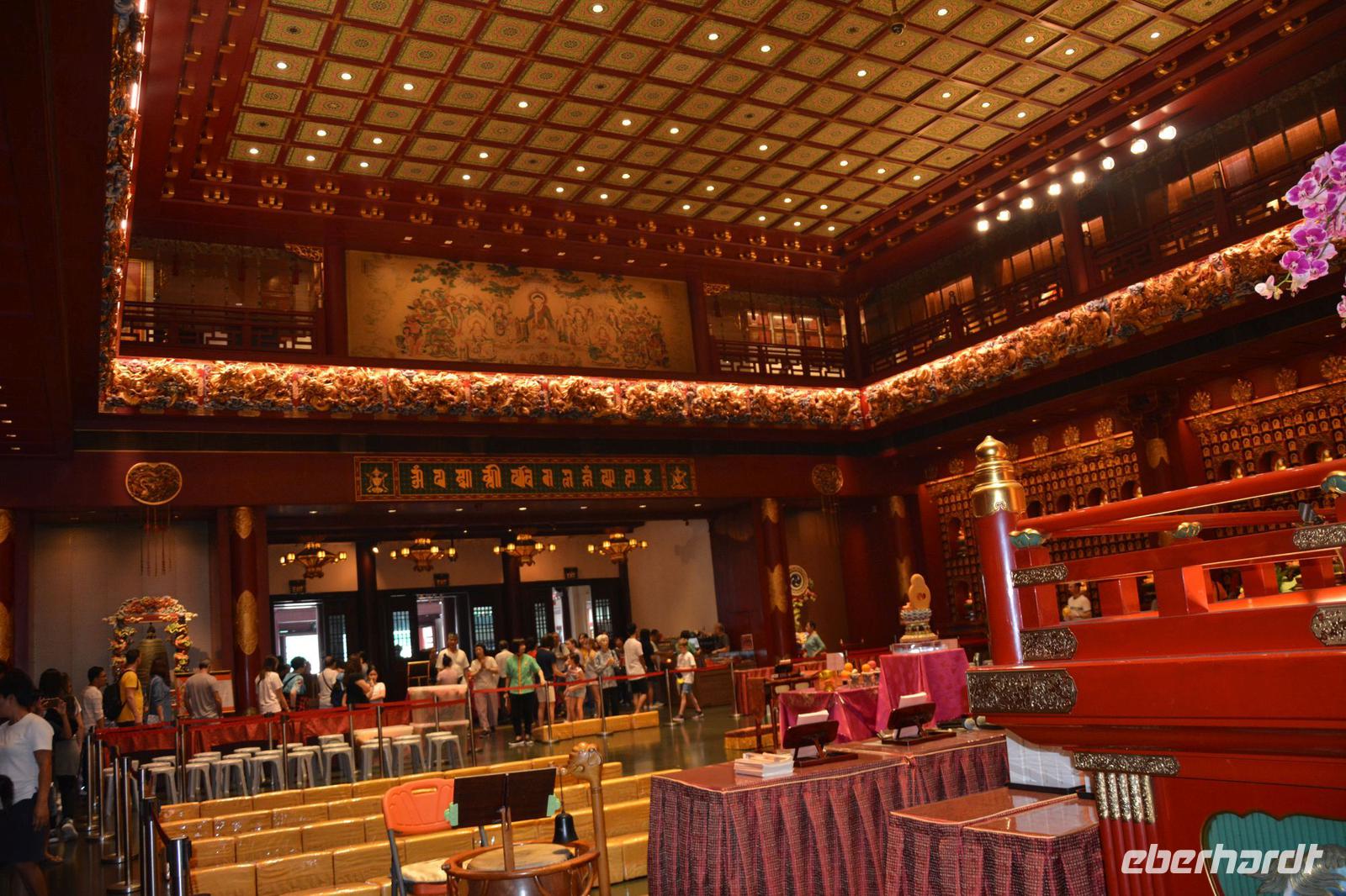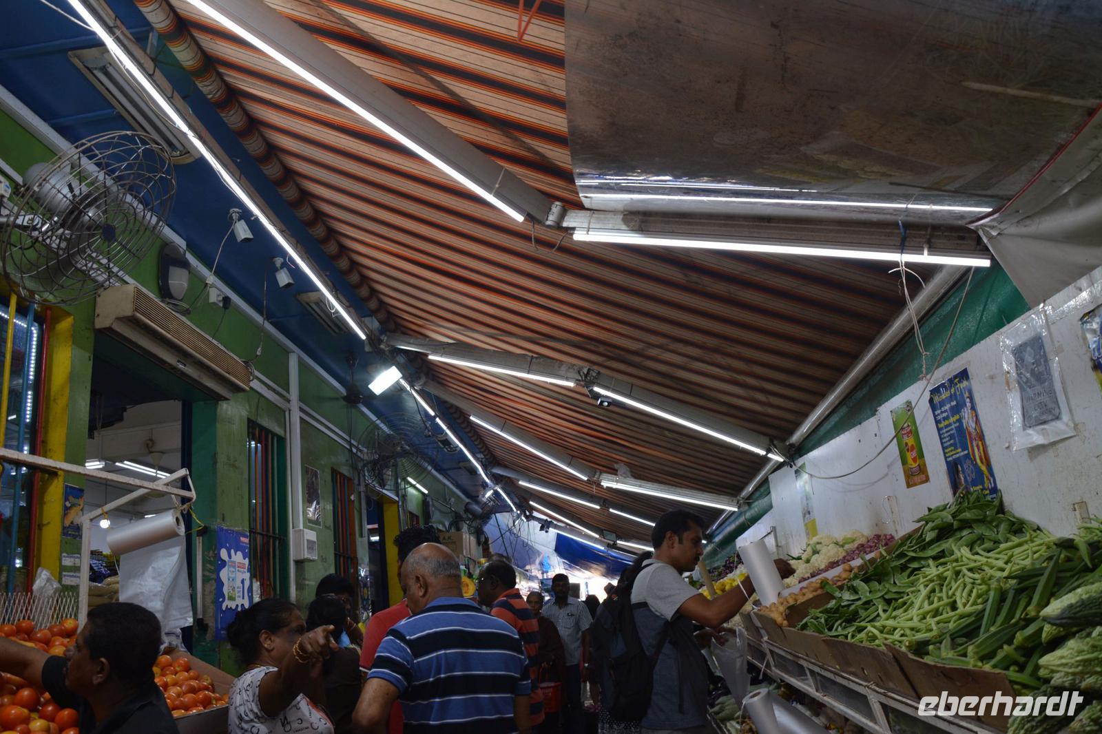 Nach dem Frühstück machten wir uns heute auf Singapur zu erkunden. Von Tan lernten wir über die recht kleine Größe des Stadtstaates. Doch in den Tagen sollten wir sehen, was Singapur so alles zu bieten hat! Unser erstes Ziel des Tages war der Botanische Garten. Im Orchideengarten spazierten wir auf den gepflegten Wegen der wunderschönen Anlage und konnten allerhand Pflanzen und Orchideen in verschiedenen Farben und Formen bewundern. Wir waren sogar im richtigen Moment da, sodass wir einen recht großen Leguan sagen, wie er gemächlich aus dem Gebüsch über den Weg lief und kurze Zeit später auch in so einem wieder verschwand. Nach dem ersten Teil des Botanischen Gartens lernten wir die Stadt kennen. Als erstes führte uns die Fahrt in den Stadtteil Little India. Auf einer der ältesten Straßen, der Serangoon Road steigen wir aus. Dann spazierten wir durch das indische Viertel, vorbei an Händlern, die Gemüse und Obst anboten. Hier lernten wir von uns nich fremden Arten und die verschiedenen Gerüche der angebotenen Waren, Gewürze und Blumengewinden stiegen uns in die Nase. Mit dem Bus ging es anschließend weiter vorbei am bekannten Raffles Hotel, welches aber momentan renoviert wird. Hier wurde in der trotzdem geöffneten Long Bar des Hotels der bekannte Cocktail Singapur Sling erfunden. In der Nähe des Raffles Hotel liegt Singapurs bekannte Orchard Road. Hier lernen wir, dass aufgrund des Platzproblems In Singpaur, viele Geschäfte und ganze Einkaufszentren unterirdisch liegen. Um die Mittagszeit stiegen wir wieder aus dem Bus aus und spazierten zu Singapurs bekanntester Stadtansicht, der Marina Bay. Die Bucht mit dem bekannten Luxushotel Marina Bay Sands, der Statue des Merlion und dem eindrucksvollen Blick auf die Wolkenkratzer des Banken- und Geschäftsviertels sollte uns in den nächsten Tagen zu verschiedenen Tageszeiten und Aussichtspunkten immer wieder beeindrucken. Zum Abschluss stand dann noch Chinatown auf dem Programm. Hier besuchten wir den chinesischer Tempel Thian Hock Keng, erkundeten einen kleinen Teil des Viertels beim Spaziergang zum hinduistischen Tempel Sri Mariamman und weiter zum buddhistischen Tempel.Nach etwas Zeit für individuelle Freizeitgestaltung trafen wir uns abends in unserem Hotel und spazierten entlang des Singapur Flusses zur Marina Bay. Im Dunkeln erstrahlt die Stadt und wir sahen uns eine Lichtershow an, die besonders den Merlion in allerhand Farben und Lichtmustern beleuchten ließ.