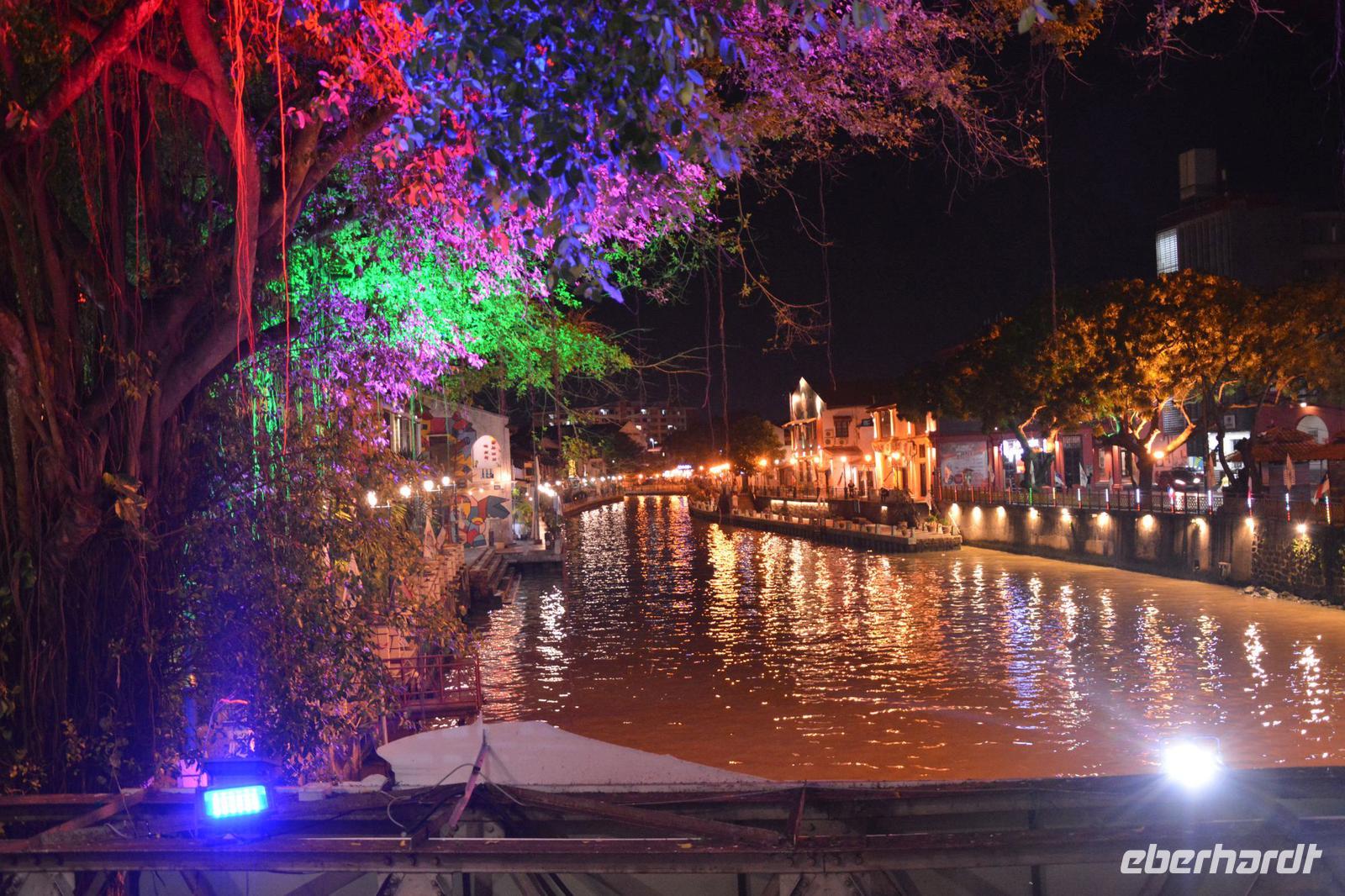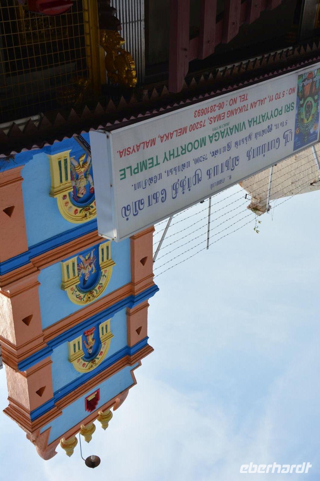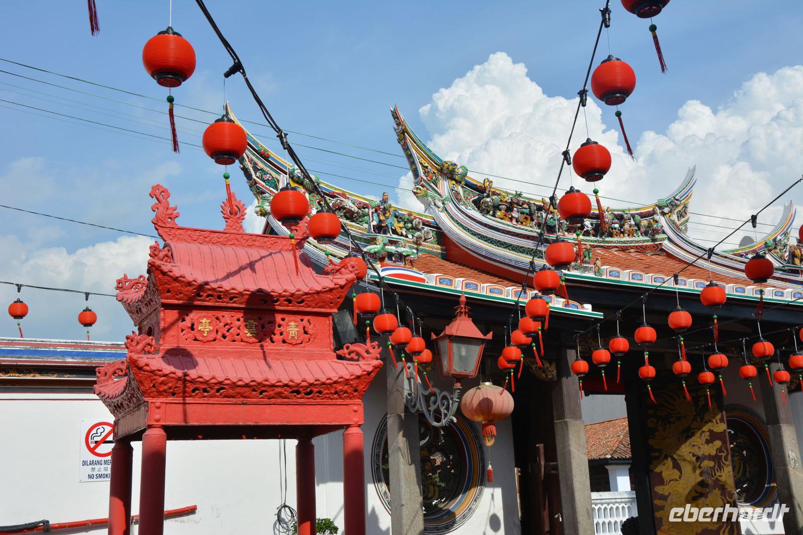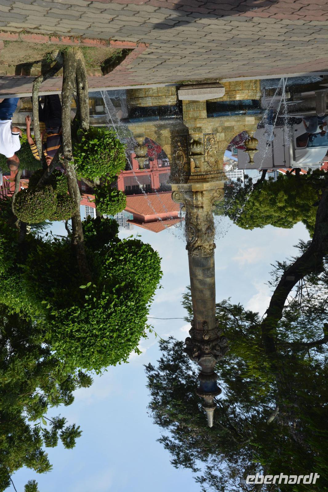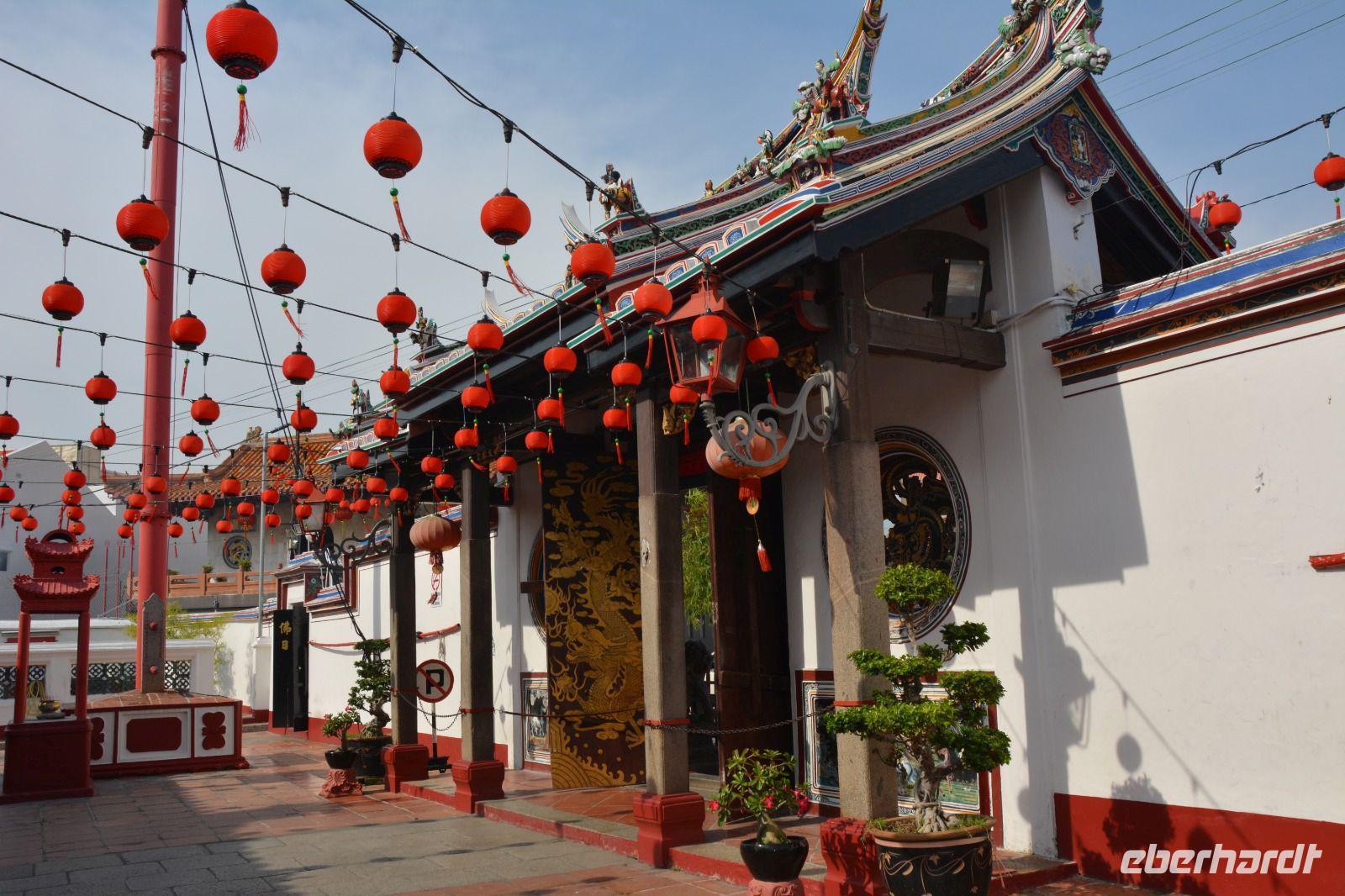 Am sechsten Tag unserer Silvesterreise machten wir uns nach dem Frühstück auf, Singapur zu verlassen und über die Grenze nach Malaysia zu fahren. Nach der offiziellen Ausreise von Singapur und Einreise nach Malaysia hieß es beim Überqueren der Brücke nach Johor Bahru herzlich Willkommen in Malaysia! Wir treffen hier auf unseren neuen Reiseleiter und neuen Busfahrer. Von ihm hörten wir erste Einführungen zu Malaysia und fuhren zunächst durch kargere grüne Landschaft. Nun hieß es gemütlich mit dem Bus gen Norden fahren, um unser nächstes Ziel die Stadt Malakka zu erreichen. Das sanfte Schaukeln des Busses und die Hitze der letzten Tage verleiteten zu einem kleinen Nickerchen. Zwischendurch mal eine Toilettenpause und die Möglichkeit Obst oder Snacks zu kaufen, ging es weiter entlang grüner Palmenplantagen und üppiger Wälder. Nach der Pause war es noch circa eine Stunde bis Malakka. Unser Reiseleiter spricht schon ein wenig über die Stadt und die Veränderungen in Malaysia in den letzten Jahrzehnten. Mit der Zeit sehen wir erste Dörfer und Ansiedlungen, eine Moschee und Reisfelder, ehe wir allmählich Stadtgebiet erreichen. Nach Ankunft in der Stadt hieß es erst einmal Essen, ehe wir uns auf Stadterkundung aufmachten. So kehrten wir in ein Restaurant ein, wo wir die für Malaysia typische Nyonya Küche verkosteten. Diese Küche stellt eine Vermischung von chinesischen Einflüssen der ersten Siedler in Malaysia und malaiischer Küche dar. So gab es Garnelen in Kokosmilch und Ananas, gebratenes Hähnchen, Reis, gedünstetes Gemüse, Hühnchencurry und noch einiges mehr. Gesättigt starteten wir danach unseren Rundgang durch Malakka. Unser Reiseleiter zeigte uns zunächst einen Schuhmacher, wo wir noch die winzigen Schuhe der Frauen zu sehen waren, deren Füße gebunden wurden und deshalb so kleine Schuhe tragen konnten. Danach noch schnell zur Wechselstube, um Malaysische Ringgit zu erhalten und weiter ging es zum Cheng Hoon Tempel. Dies ist ein chinesischer Tempel, übersetzt auch Grüner Wolkentempel, aus braunem Holz mit Goldverzierungen und chinesischen Papierlampen im Hof. Als wir den Tempel besuchten, war gerade eine Gebetszeremonie im Gange. Wir lernten über die Glückbringende Farbe Rot, die Symbolik der goldenen Elemente und lauschten den Erklärungen unseres Reiseleiters, während uns der Geruch der Räucherstäbchen begleitete. Bei der weiteren Erkundung des Tempels hörten wir auch von dem chinesischen Aberglaube in Bezug auf Farben und Zahlen. Weiter ging es über die Straße der Harmonie zur Kampung Kling Moschee. Nach kurzer Besichtigung schallte schon der Ruf des Muezzin durch die Gegend. Wenige Schritte später, waren wir auch schon an einem weiteren Ort der nächsten Religion. Vor dem Hindu Tempel Sri Poyyatha Vinayaga Moorthy Tempel, der momentan geschlossen war, weil gerade keine Gebetszeit ist, lernten wir über die religiöse Praxis der Hindus durch das Schmeißen der Kokosnuss im Behältnis vor dem Tempel. Wir setzten unseren Spaziergang über die bekannte Jonker Street fort zum Roten Platz. Hier beeindruckte uns nicht nur die rote Kirche, sondern auch die bunt geschmückten Rikschas, welche mit lauter Musik durch die Straßen fuhren. Zu Fuß ging es dann noch einen kleinen Hügel hoch zu den Ruinen der St. Pauls Kirche. Die ursprünglich von den Portugiesen im 16. Jahrhundert gebaute Kirche, steht nun als Denkmal auf einem die Stadt überblickenden Hügel. Hinab ging es dann an der ehemaligen portugiesischen Festung A Famosa vorbei zu unserem Bus, der uns schließlich in unser wunderschönes Hotel brachte. Direkt am Malakka Fluss gelegen, ruhten wir uns in unserem Hotel aus oder unternahmen von hier einen kleinen Spaziergang durch die Gassen dieser kleinen, aber charmanten Stadt.