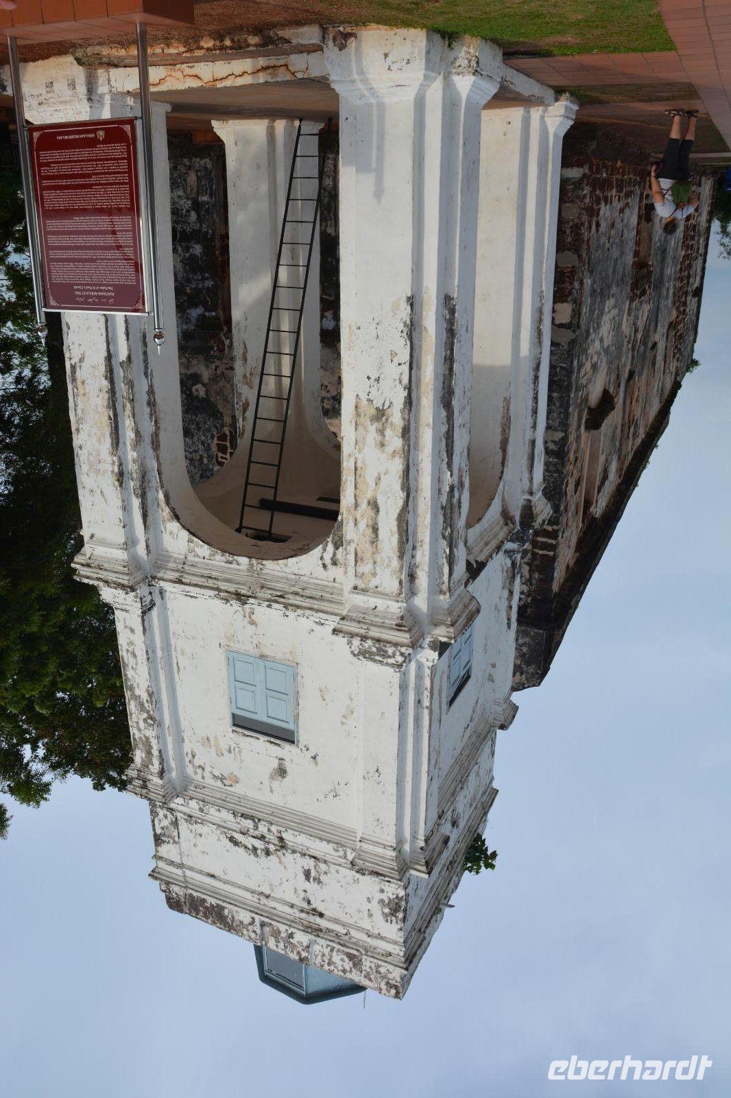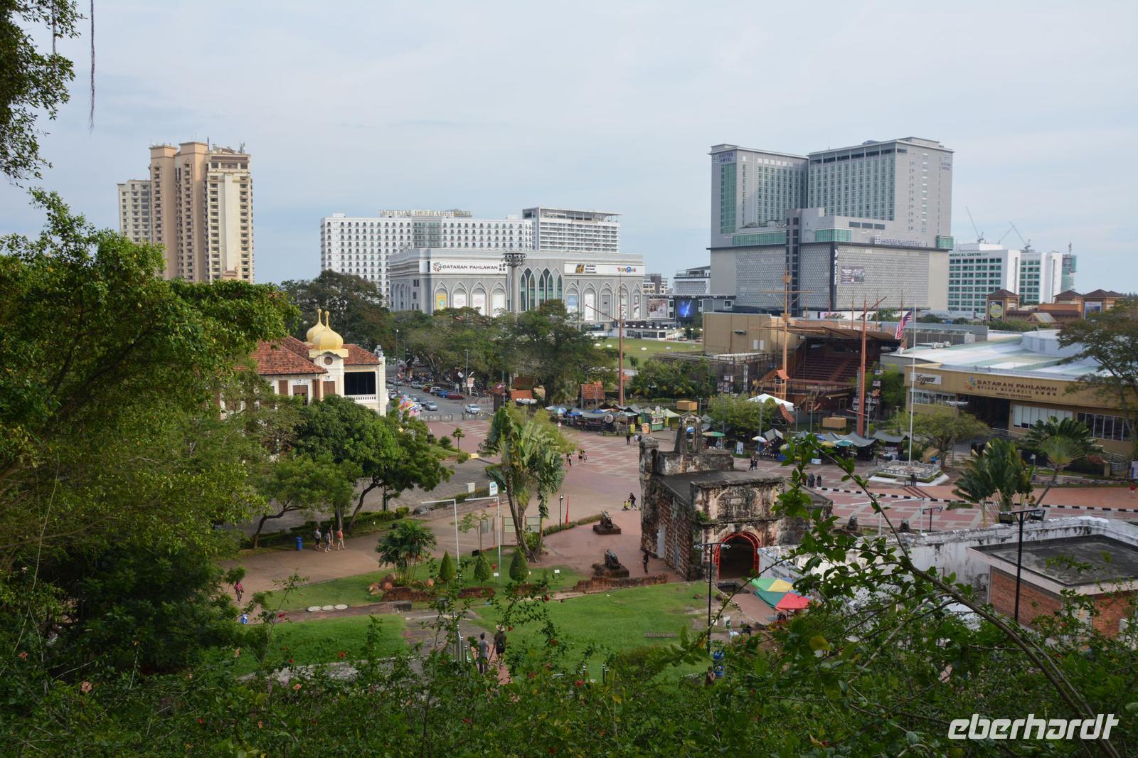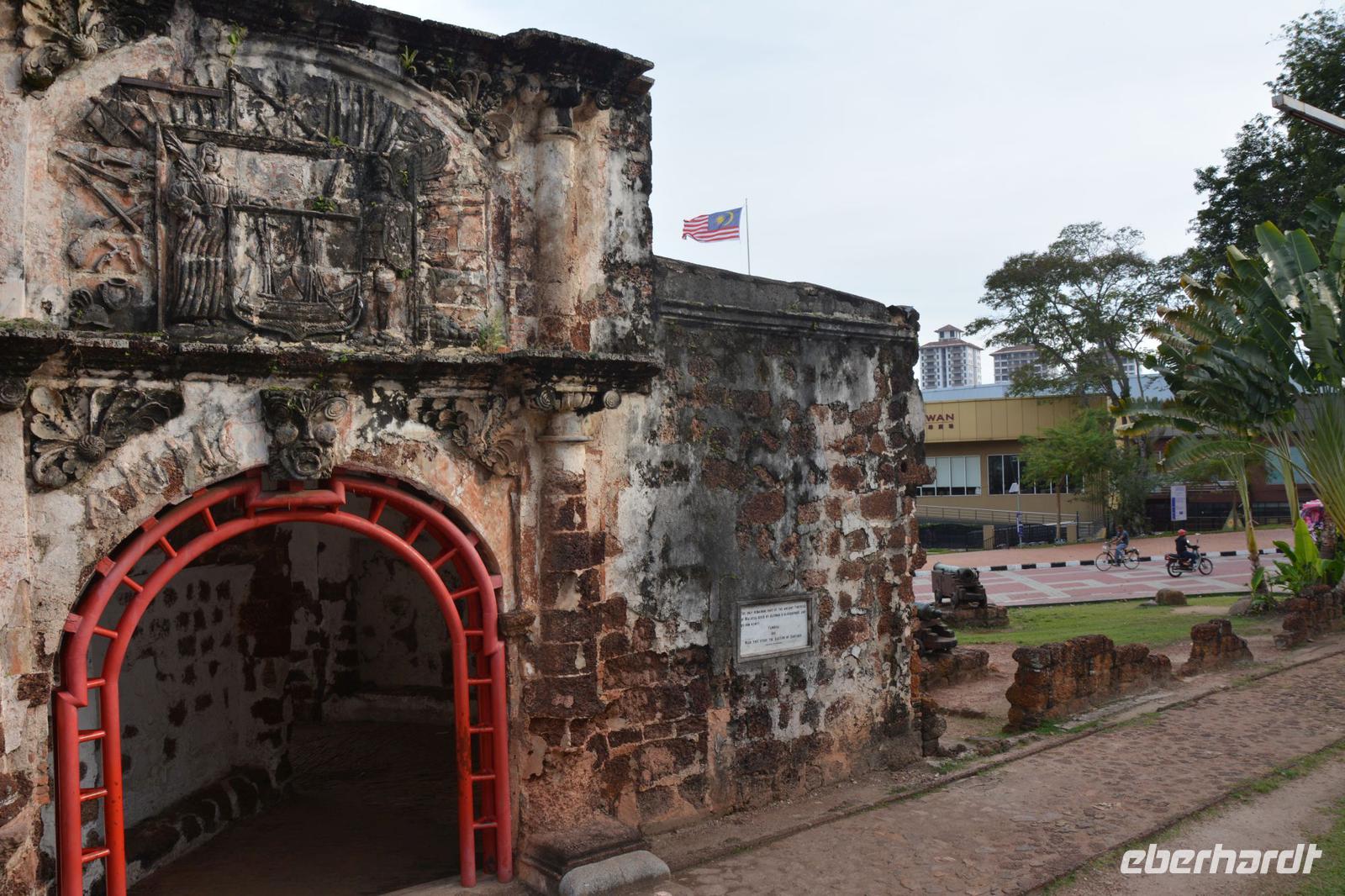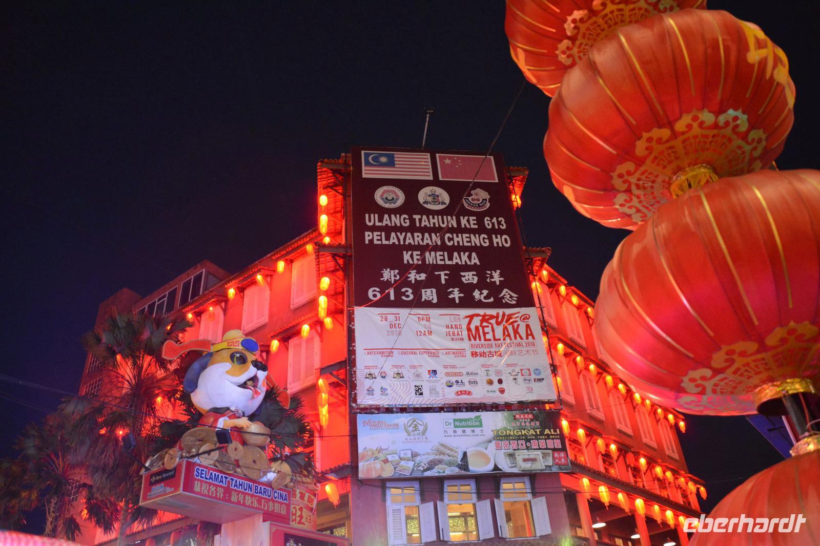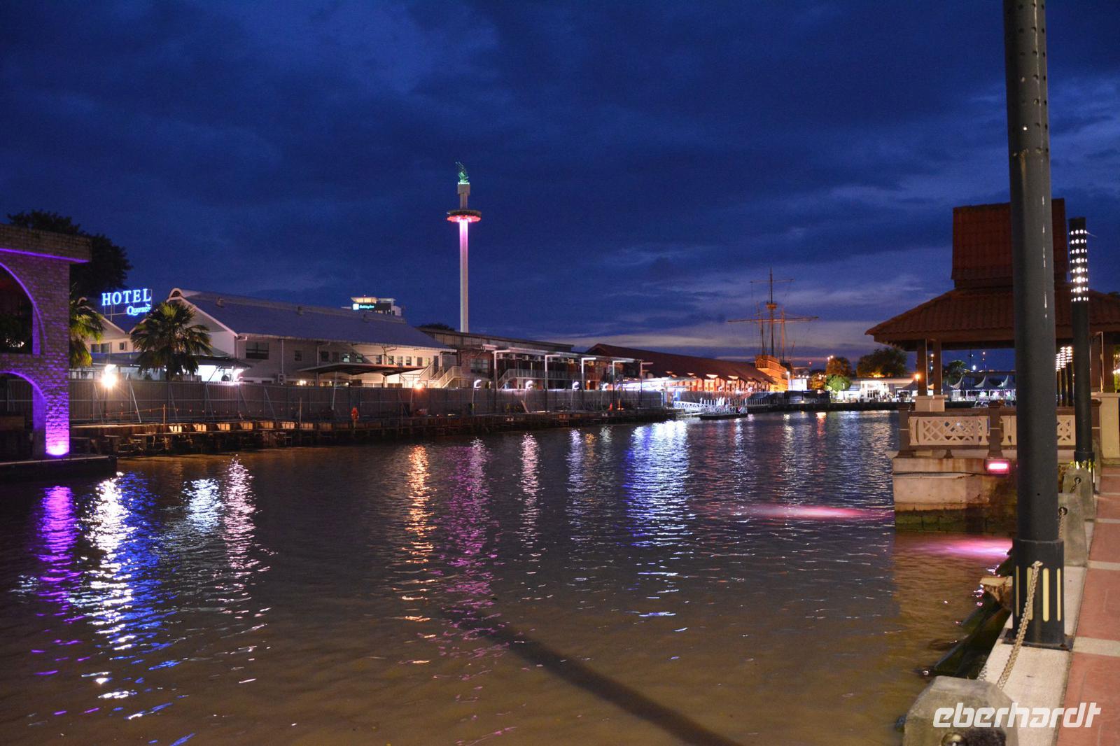 Am sechsten Tag unserer Silvesterreise machten wir uns nach dem Frühstück auf, Singapur zu verlassen und über die Grenze nach Malaysia zu fahren. Nach der offiziellen Ausreise von Singapur und Einreise nach Malaysia hieß es beim Überqueren der Brücke nach Johor Bahru herzlich Willkommen in Malaysia! Wir treffen hier auf unseren neuen Reiseleiter und neuen Busfahrer. Von ihm hörten wir erste Einführungen zu Malaysia und fuhren zunächst durch kargere grüne Landschaft. Nun hieß es gemütlich mit dem Bus gen Norden fahren, um unser nächstes Ziel die Stadt Malakka zu erreichen. Das sanfte Schaukeln des Busses und die Hitze der letzten Tage verleiteten zu einem kleinen Nickerchen. Zwischendurch mal eine Toilettenpause und die Möglichkeit Obst oder Snacks zu kaufen, ging es weiter entlang grüner Palmenplantagen und üppiger Wälder. Nach der Pause war es noch circa eine Stunde bis Malakka. Unser Reiseleiter spricht schon ein wenig über die Stadt und die Veränderungen in Malaysia in den letzten Jahrzehnten. Mit der Zeit sehen wir erste Dörfer und Ansiedlungen, eine Moschee und Reisfelder, ehe wir allmählich Stadtgebiet erreichen. Nach Ankunft in der Stadt hieß es erst einmal Essen, ehe wir uns auf Stadterkundung aufmachten. So kehrten wir in ein Restaurant ein, wo wir die für Malaysia typische Nyonya Küche verkosteten. Diese Küche stellt eine Vermischung von chinesischen Einflüssen der ersten Siedler in Malaysia und malaiischer Küche dar. So gab es Garnelen in Kokosmilch und Ananas, gebratenes Hähnchen, Reis, gedünstetes Gemüse, Hühnchencurry und noch einiges mehr. Gesättigt starteten wir danach unseren Rundgang durch Malakka. Unser Reiseleiter zeigte uns zunächst einen Schuhmacher, wo wir noch die winzigen Schuhe der Frauen zu sehen waren, deren Füße gebunden wurden und deshalb so kleine Schuhe tragen konnten. Danach noch schnell zur Wechselstube, um Malaysische Ringgit zu erhalten und weiter ging es zum Cheng Hoon Tempel. Dies ist ein chinesischer Tempel, übersetzt auch Grüner Wolkentempel, aus braunem Holz mit Goldverzierungen und chinesischen Papierlampen im Hof. Als wir den Tempel besuchten, war gerade eine Gebetszeremonie im Gange. Wir lernten über die Glückbringende Farbe Rot, die Symbolik der goldenen Elemente und lauschten den Erklärungen unseres Reiseleiters, während uns der Geruch der Räucherstäbchen begleitete. Bei der weiteren Erkundung des Tempels hörten wir auch von dem chinesischen Aberglaube in Bezug auf Farben und Zahlen. Weiter ging es über die Straße der Harmonie zur Kampung Kling Moschee. Nach kurzer Besichtigung schallte schon der Ruf des Muezzin durch die Gegend. Wenige Schritte später, waren wir auch schon an einem weiteren Ort der nächsten Religion. Vor dem Hindu Tempel Sri Poyyatha Vinayaga Moorthy Tempel, der momentan geschlossen war, weil gerade keine Gebetszeit ist, lernten wir über die religiöse Praxis der Hindus durch das Schmeißen der Kokosnuss im Behältnis vor dem Tempel. Wir setzten unseren Spaziergang über die bekannte Jonker Street fort zum Roten Platz. Hier beeindruckte uns nicht nur die rote Kirche, sondern auch die bunt geschmückten Rikschas, welche mit lauter Musik durch die Straßen fuhren. Zu Fuß ging es dann noch einen kleinen Hügel hoch zu den Ruinen der St. Pauls Kirche. Die ursprünglich von den Portugiesen im 16. Jahrhundert gebaute Kirche, steht nun als Denkmal auf einem die Stadt überblickenden Hügel. Hinab ging es dann an der ehemaligen portugiesischen Festung A Famosa vorbei zu unserem Bus, der uns schließlich in unser wunderschönes Hotel brachte. Direkt am Malakka Fluss gelegen, ruhten wir uns in unserem Hotel aus oder unternahmen von hier einen kleinen Spaziergang durch die Gassen dieser kleinen, aber charmanten Stadt.