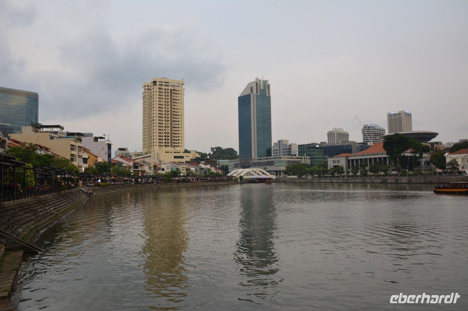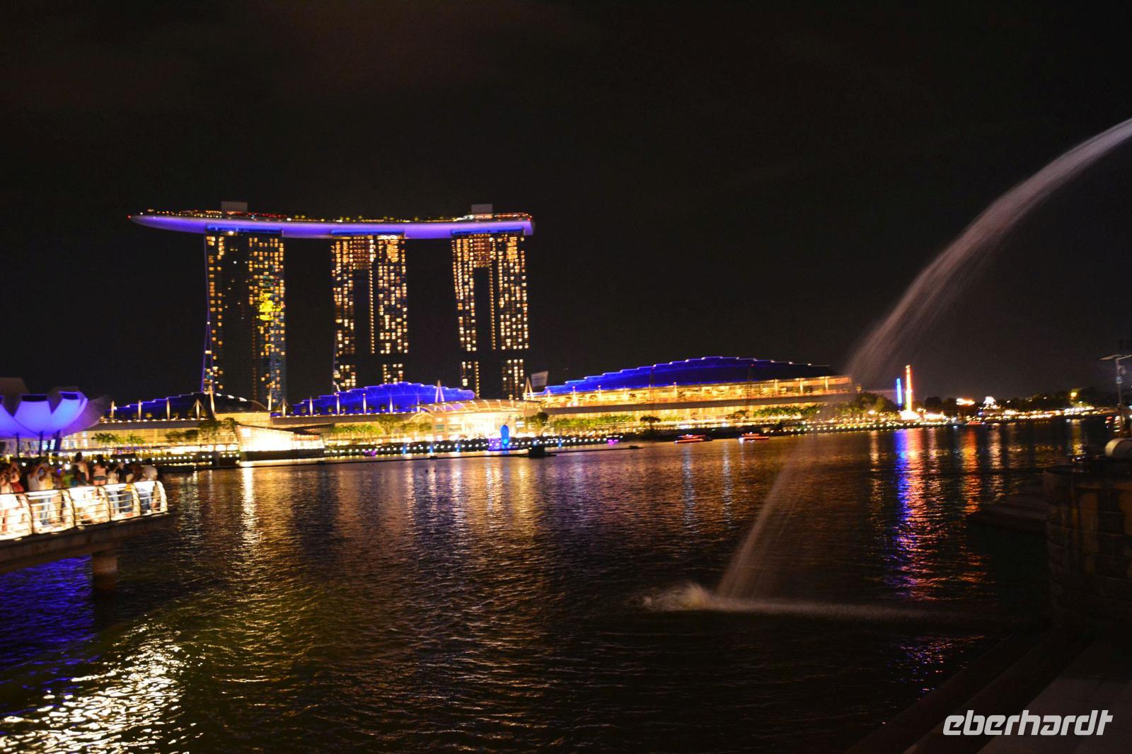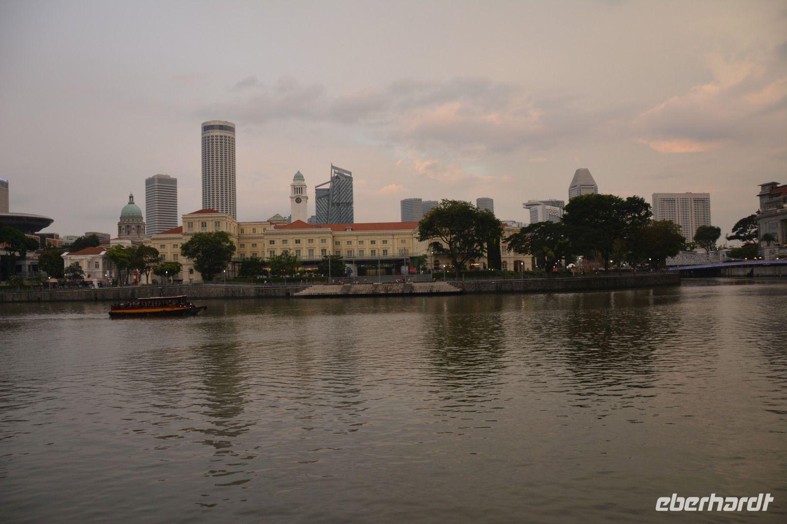 Nach Stunden im Flugzeug, eingeschlafenen Beinen und mehr oder weniger Schlaf landeten wir am heutigen Abend in Singapur. Zunächst ging es für uns ersteinam zu den Schaltern der Einreise. Nach dem Ausfüllen der Einreisekarten und dem Warten in der Schlange, ging es nach Erledigung dieser offiziellen Angelegenheiten weiter zum Kofferband, wo wir hofften, dass alle Gepäckstücke vollzählig und unbeschadet angekommen waren. Das war zum Glück der Fall. Noch fix zur nächsten Wechselstube und eingedeckt mit Singapur Dollarn begaben wir uns zum Ausgang. Hier wurden wir schon von unserem Reiseleiter erwartet und stiegen in unseren Bus ein. Tan, so der Name unseres Reiseleiters, versorgte uns schon am ersten Abend in Singapur mit vielen grundlegenden Information zum Stadtstadt und seinen Bewohnern. Vorbei an den grüngesäumten Straßen und Bäumen mit langen über die Erde reichenden Wurzeln, fuhren wir in unser Hotel. Nach dem Einchecken erholten wir uns kurz von dem langen Flug und machten es uns in unseren Hotelzimmern für die nächsten Tage in Singapur bequem. Am Abend trafen wir uns dann alle wieder für einen ersten gemeinsamen Spaziergang in das erst am Abend zum Leben erwachsende Viertel der Clark Quay. Hier zeigen im sich zahlreiche Restaurants, Bars und Discos an einander. Einige gingen dann auf eigene Faust Essen und die anderen besuchten ein Restaurant, welches auf mehrere Booten an Rande des Singapur Flusses lag. Nach dem Essen und ersten Kennenlerngesprächen würde noch ein wenig die Gegend erkundet und eventuell der ein oder andere Drink probiert, wie beispielsweise den bekannten Singapore Sling.