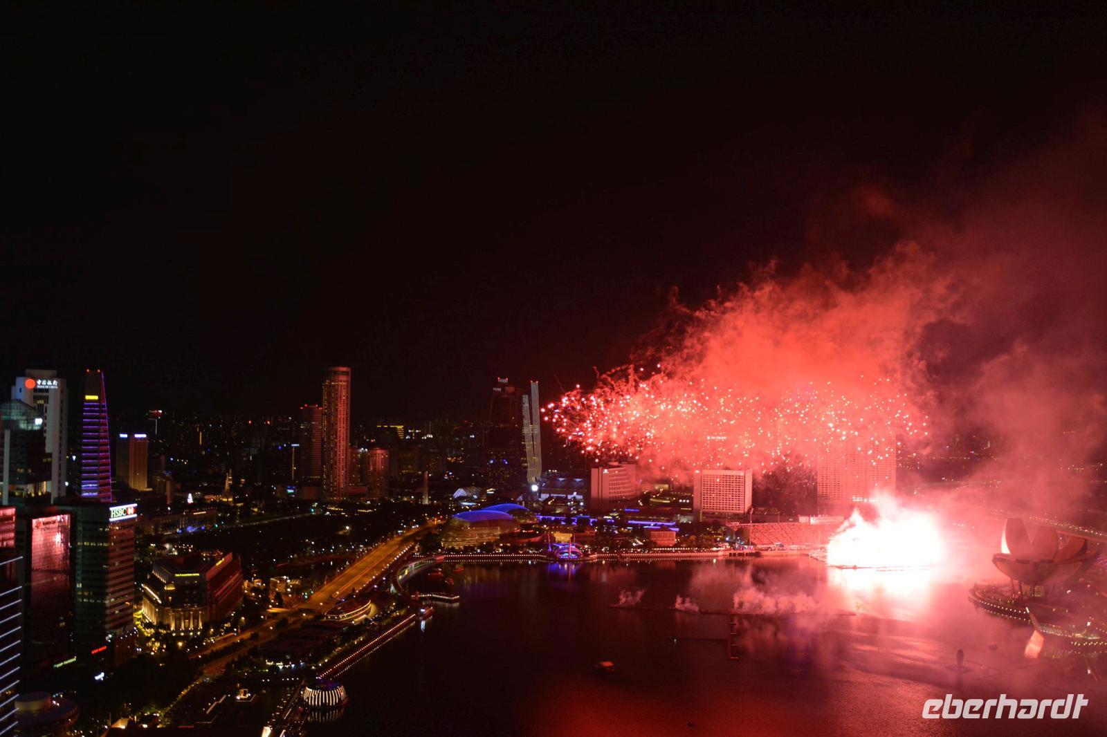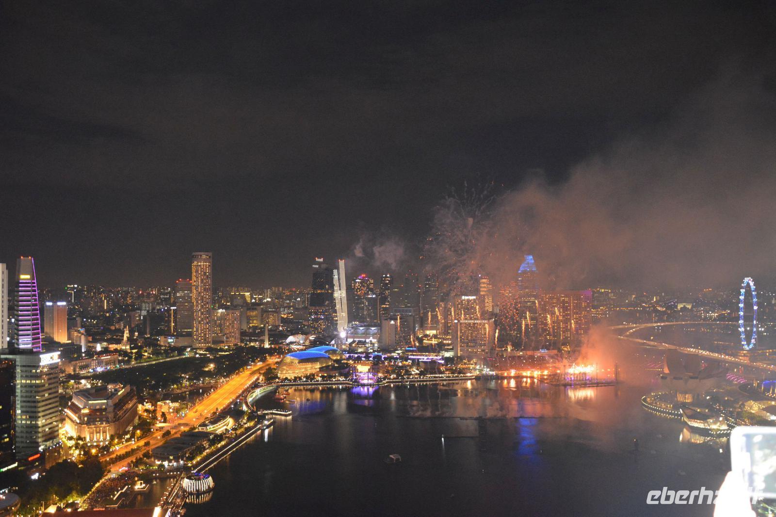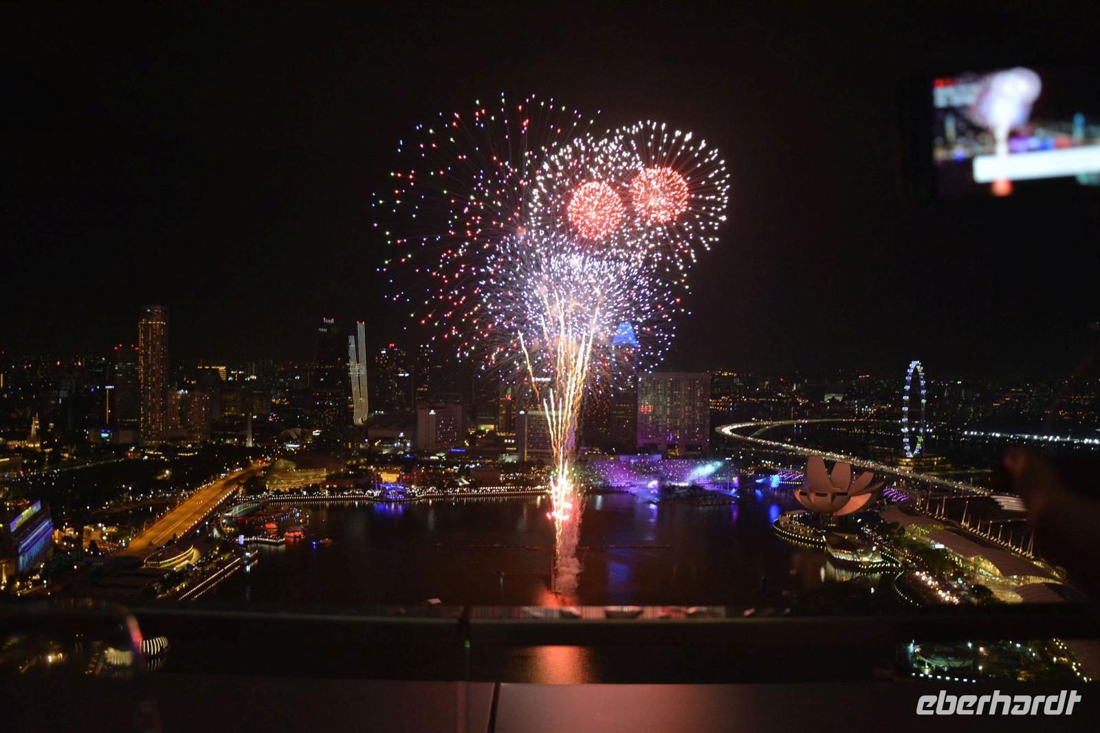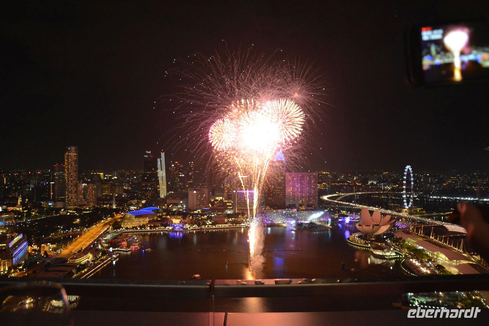 Doch bevor wir zu unserer Silvesterfeier am Abend aufbrechen sollten, unternahmen wir heute einen Ausflug auf die Vergnügungsinsel Sentosa. Die fünf Quadratkilometer große aufgeschüttete Insel im Süden Singapurs bietet zahlreiche Unterhaltungsmöglichkeiten für Touristen, aber auch einen Ort für Erholung und Abenteuer für die Singapurianer. Mit dem Bus fuhren wir am Morgen zum Mount Faber. Dort stiegen wir aus und nach ein paar Fotos, reihten wir uns in die Schlange bei den Seilbahnen. Mit der Seilbahn ging es dann in circa zehn Minuten auf die Insel nach Sentosa. Als erster Programmpunkt stand der Schmetterlingspark auf dem Plan. In einem Gehege standen wir umgeben von zum Teil großen Schmetterlingen in vielen Farben. In der grünen Anlage in Gehege nebenan lifen uns blaue Kronentauben über den Weg. Und eine Schildkröte, Papageien und einen Leguan gab es auch zu sehen. In der Insektenausstellung wurden uns die verschiedensten Arten von Krabbeltieren in unterschiedlichen Größen und Formen gezeigt. Danach ging es weiter über die Insel zum Merlion Platz. Hier steht ein begehbarer Merlion, in welchem bei einer Filmshow zunächst die Geschichte des Merlion erzählt wird und dann die Aussichtsplattform auf dem Kopf der Statue besichtigt werden kann. Mit einer goldenen Münze als Andenken an Sentosa und einem Foto mit den Eckzähnen der Löwenstatue im Gepäck, ging es mit der Bahn weiter in Richtung Aquarium. Im größten Aquarium Südostasiens sahen wir viele Fische, kleinere Haie, zahlreiche bunte Korallen, Sehpferdchen, Quallen und weitere Tiere. Als wir um die Mittagszeit beschlossen zum Strand zu gehen, machte uns leider das Wetter einen Strich durch die Rechnung. Es goss in Strömen. Doch das ist leider ganz normal in den Tropen, so stellten wir uns unter oder suchten in einem Restaurant Zuflucht, ehe wir zum Siloso Strand gingen. Nach weiteren Regengüssen machten wir uns wenig später wieder auf den Rückweg zu unserem Hotel. Nach etwas Freizeit in Vorbereitung auf die Silvesterfeier, trafen wir uns am Abend alle schick gemacht in der Hotellobby. Mit viel Vorfreude und in ausgelassener Stimmung ging es mit dem Bus zum Marina Bay Financial Center, in welchem sich das Restaurant und Bar LeVel 33 befindet. Noch schnell ein Gruppenfoto, dann in den Aufzug in den dreiundreißigsten Stock. Wir sind begeistert von dem Ambiente der Location, der tollen Dekoration auf unserem Tisch direkt an den Glasfenstern und natürlich überwältigt von der gigantischen Aussicht auf die erleuchtete Marina Bay von Singapur. Nach den ersten Fotos von Aussicht, Tisch und Bar, wurde uns auch schon ein leckeres Abendessen gereicht. Mit einem Begrüßungsgetränk stießen wir auf einen wunderbaren Abend an! Ein Gang nach dem anderen, dazu Bier und Wein kostenfrei dazu, verging der Abend wie im Fluge. Die interessanten Essenskombinationen der liebevoll präsentierten Gänge mundete uns, es wurde ausgelassen geplaudert und gelacht. Bald war es ja auch schon Mitternacht. Auf der Terrasse genossen wir das Feuerwerk ab 23 Uhr, welches in der Marina Bay losging. Um Mitternacht wünschten wir uns ein Frohes Neues Jahr und ließen den Abend mit Tanz und Unterhaltungen ausklingen.