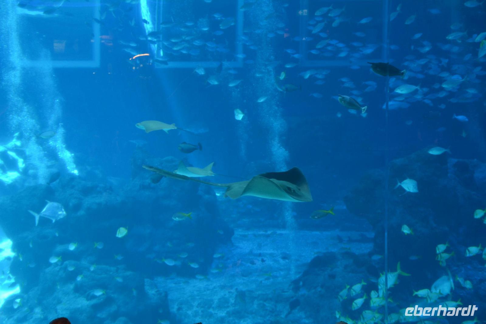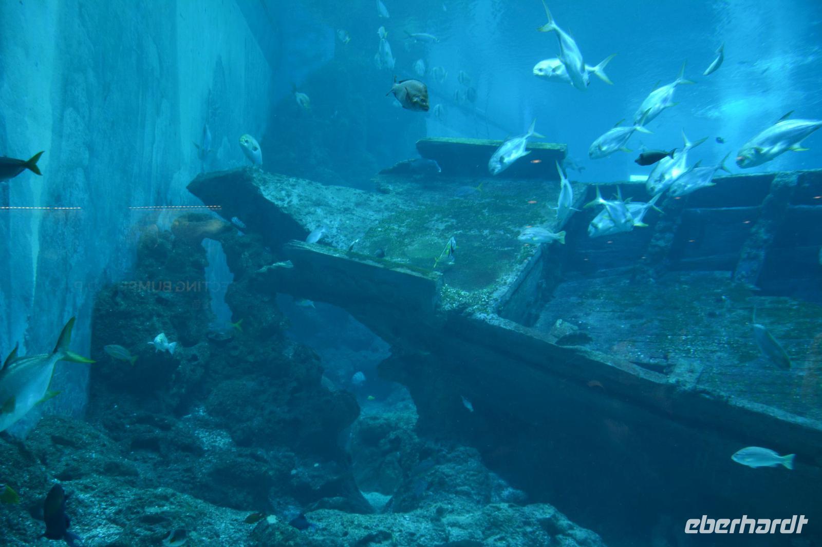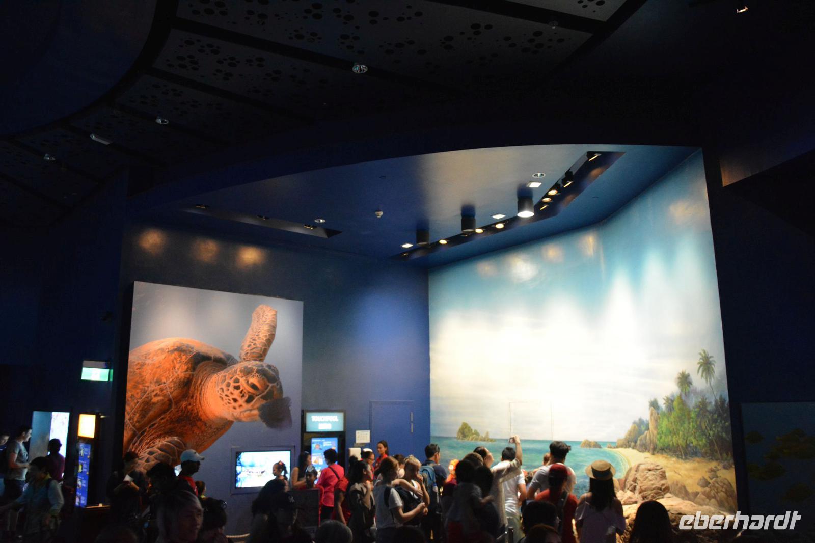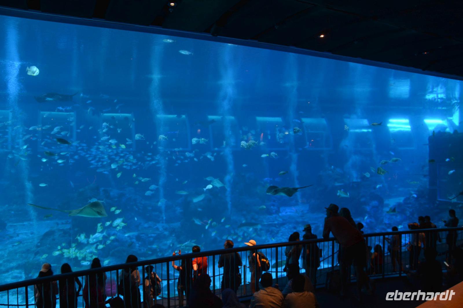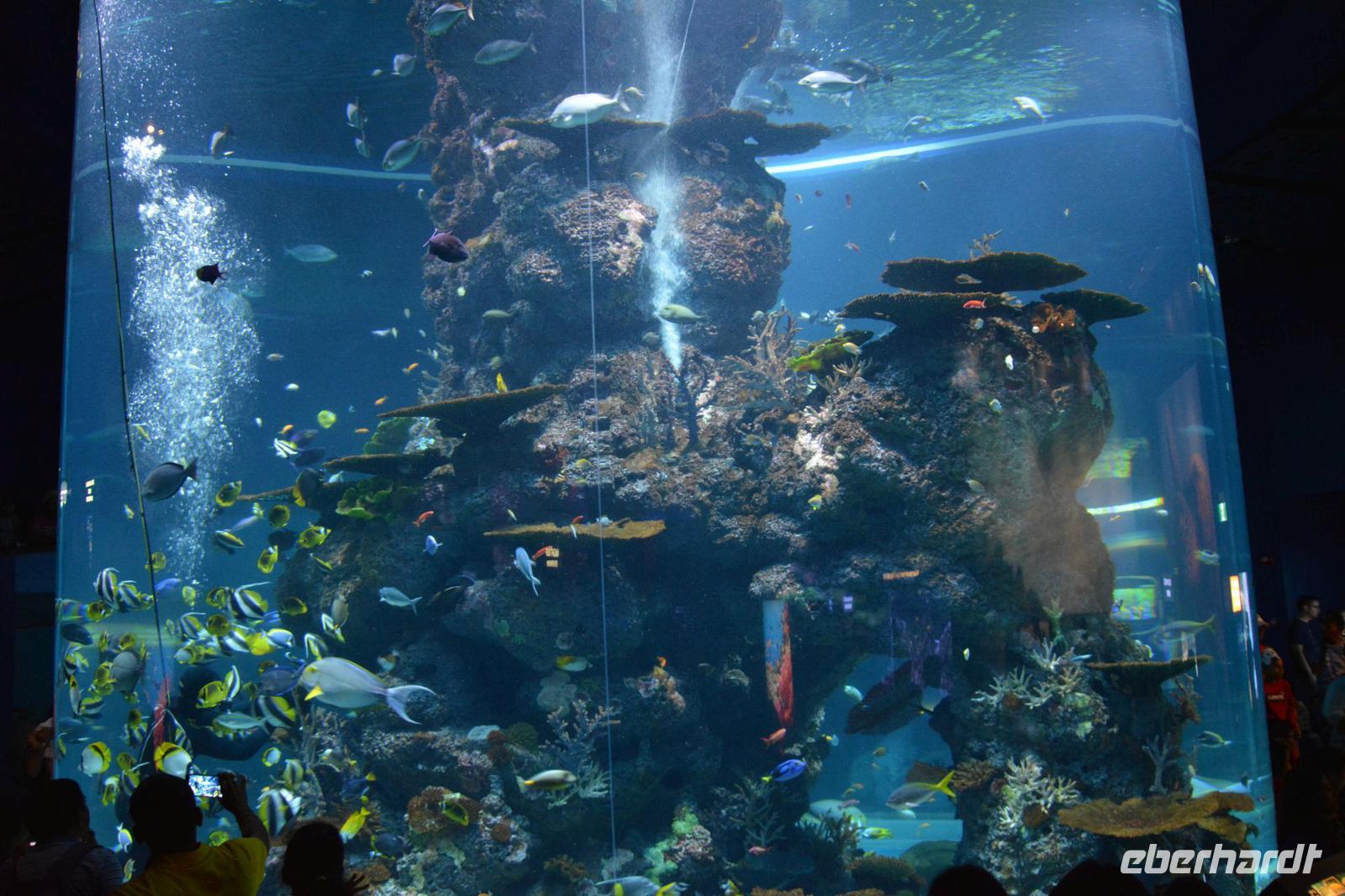 Doch bevor wir zu unserer Silvesterfeier am Abend aufbrechen sollten, unternahmen wir heute einen Ausflug auf die Vergnügungsinsel Sentosa. Die fünf Quadratkilometer große aufgeschüttete Insel im Süden Singapurs bietet zahlreiche Unterhaltungsmöglichkeiten für Touristen, aber auch einen Ort für Erholung und Abenteuer für die Singapurianer. Mit dem Bus fuhren wir am Morgen zum Mount Faber. Dort stiegen wir aus und nach ein paar Fotos, reihten wir uns in die Schlange bei den Seilbahnen. Mit der Seilbahn ging es dann in circa zehn Minuten auf die Insel nach Sentosa. Als erster Programmpunkt stand der Schmetterlingspark auf dem Plan. In einem Gehege standen wir umgeben von zum Teil großen Schmetterlingen in vielen Farben. In der grünen Anlage in Gehege nebenan lifen uns blaue Kronentauben über den Weg. Und eine Schildkröte, Papageien und einen Leguan gab es auch zu sehen. In der Insektenausstellung wurden uns die verschiedensten Arten von Krabbeltieren in unterschiedlichen Größen und Formen gezeigt. Danach ging es weiter über die Insel zum Merlion Platz. Hier steht ein begehbarer Merlion, in welchem bei einer Filmshow zunächst die Geschichte des Merlion erzählt wird und dann die Aussichtsplattform auf dem Kopf der Statue besichtigt werden kann. Mit einer goldenen Münze als Andenken an Sentosa und einem Foto mit den Eckzähnen der Löwenstatue im Gepäck, ging es mit der Bahn weiter in Richtung Aquarium. Im größten Aquarium Südostasiens sahen wir viele Fische, kleinere Haie, zahlreiche bunte Korallen, Sehpferdchen, Quallen und weitere Tiere. Als wir um die Mittagszeit beschlossen zum Strand zu gehen, machte uns leider das Wetter einen Strich durch die Rechnung. Es goss in Strömen. Doch das ist leider ganz normal in den Tropen, so stellten wir uns unter oder suchten in einem Restaurant Zuflucht, ehe wir zum Siloso Strand gingen. Nach weiteren Regengüssen machten wir uns wenig später wieder auf den Rückweg zu unserem Hotel. Nach etwas Freizeit in Vorbereitung auf die Silvesterfeier, trafen wir uns am Abend alle schick gemacht in der Hotellobby. Mit viel Vorfreude und in ausgelassener Stimmung ging es mit dem Bus zum Marina Bay Financial Center, in welchem sich das Restaurant und Bar LeVel 33 befindet. Noch schnell ein Gruppenfoto, dann in den Aufzug in den dreiundreißigsten Stock. Wir sind begeistert von dem Ambiente der Location, der tollen Dekoration auf unserem Tisch direkt an den Glasfenstern und natürlich überwältigt von der gigantischen Aussicht auf die erleuchtete Marina Bay von Singapur. Nach den ersten Fotos von Aussicht, Tisch und Bar, wurde uns auch schon ein leckeres Abendessen gereicht. Mit einem Begrüßungsgetränk stießen wir auf einen wunderbaren Abend an! Ein Gang nach dem anderen, dazu Bier und Wein kostenfrei dazu, verging der Abend wie im Fluge. Die interessanten Essenskombinationen der liebevoll präsentierten Gänge mundete uns, es wurde ausgelassen geplaudert und gelacht. Bald war es ja auch schon Mitternacht. Auf der Terrasse genossen wir das Feuerwerk ab 23 Uhr, welches in der Marina Bay losging. Um Mitternacht wünschten wir uns ein Frohes Neues Jahr und ließen den Abend mit Tanz und Unterhaltungen ausklingen.