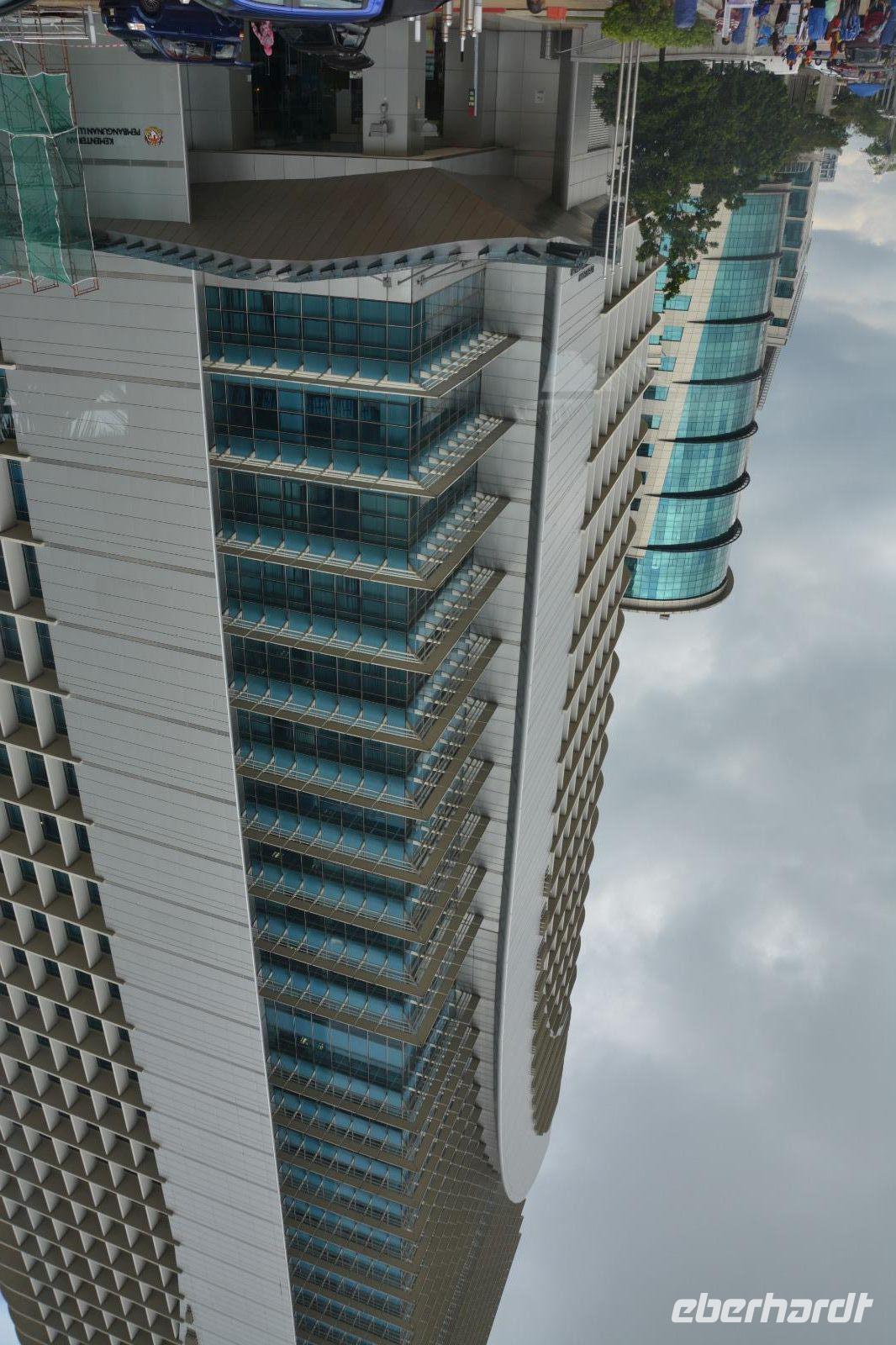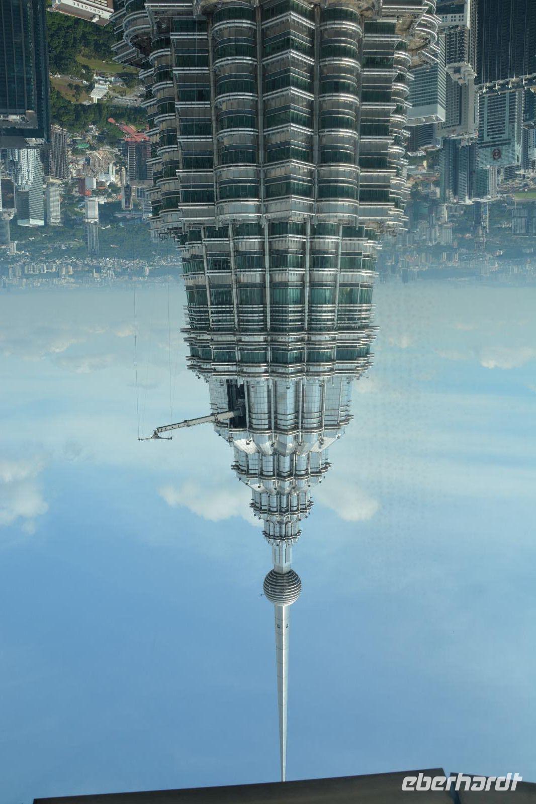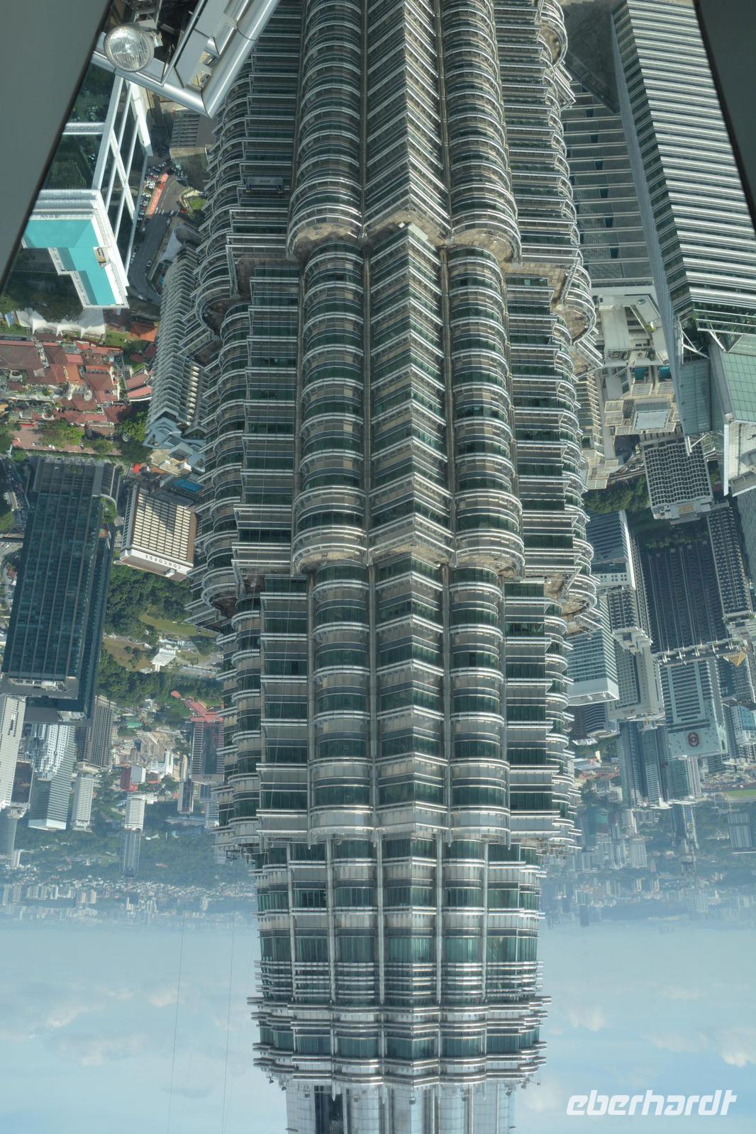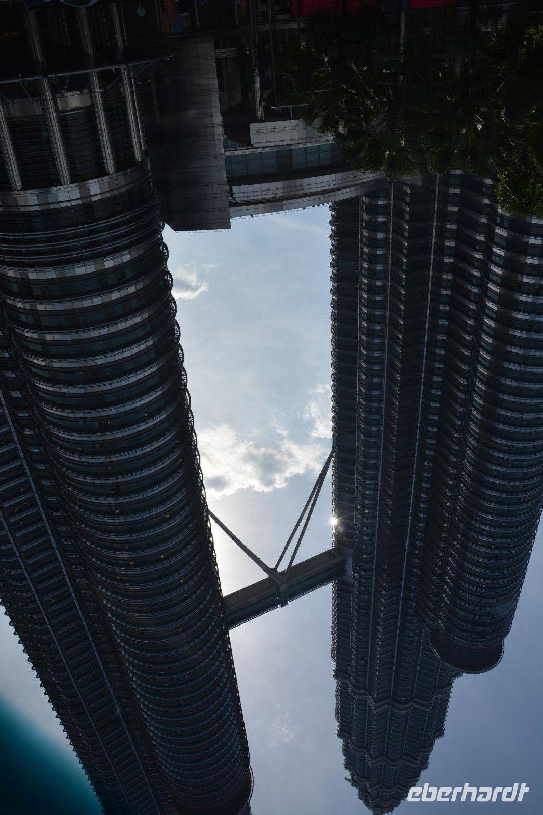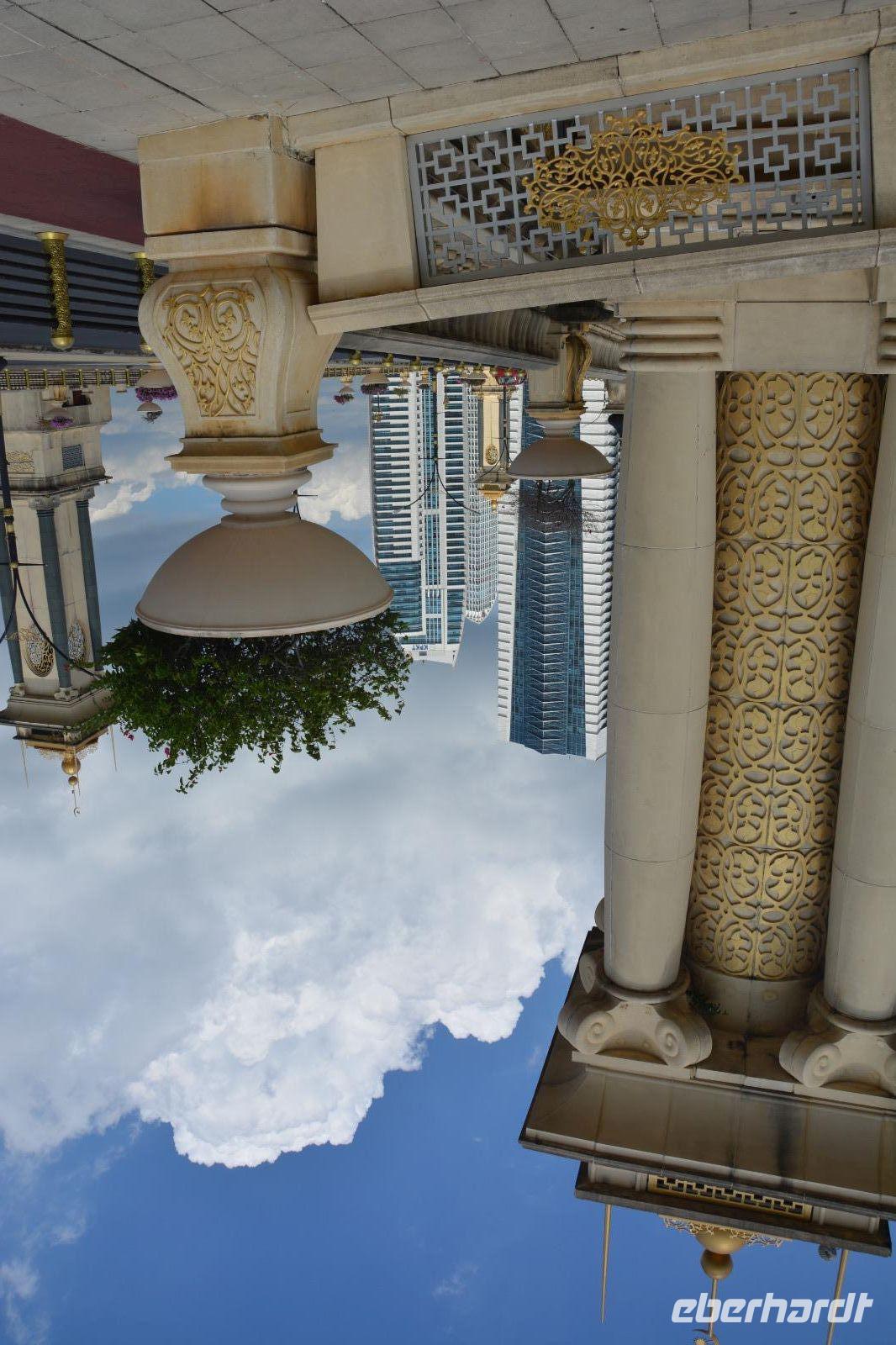 Wenig später stiegen wir am Unabhängigkeitsplatz aus. Hier befindet sich auch das und die im maurischen Stil erbaute älteste Moschee der Stadt, die Jamek Moschee. Danach spazierten wir weiter zur Flussmündung. Ein ganz besonderes Erlebnis war als nächstes vorgesehen: der Besuch der Petronas Towers. Mit dem Aufzug ging es zunächst in die 41.Etage hinauf. Hier liefen wir über die Skybridge, welche die beiden Türme der höchsten Zwillingstürme der Welt miteinander verbindet.