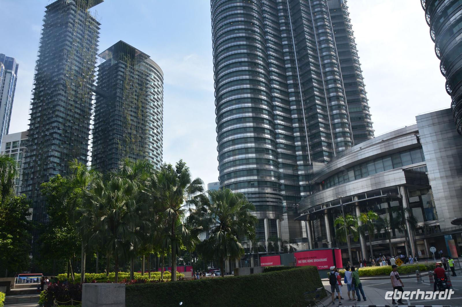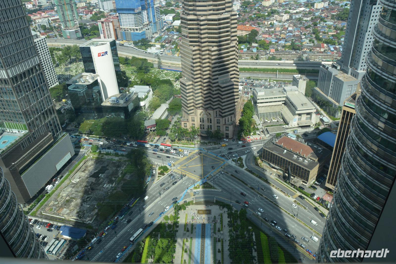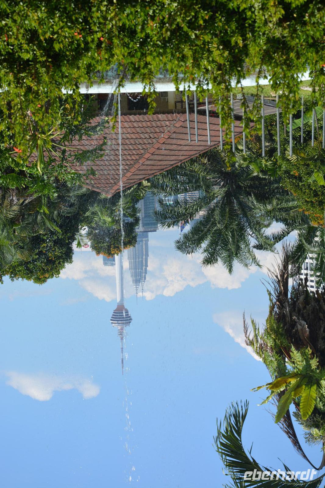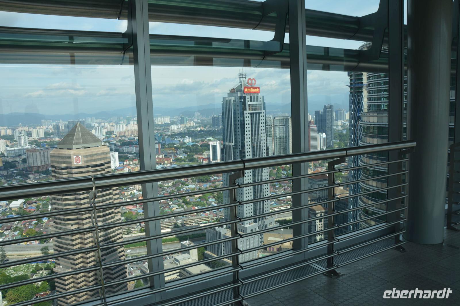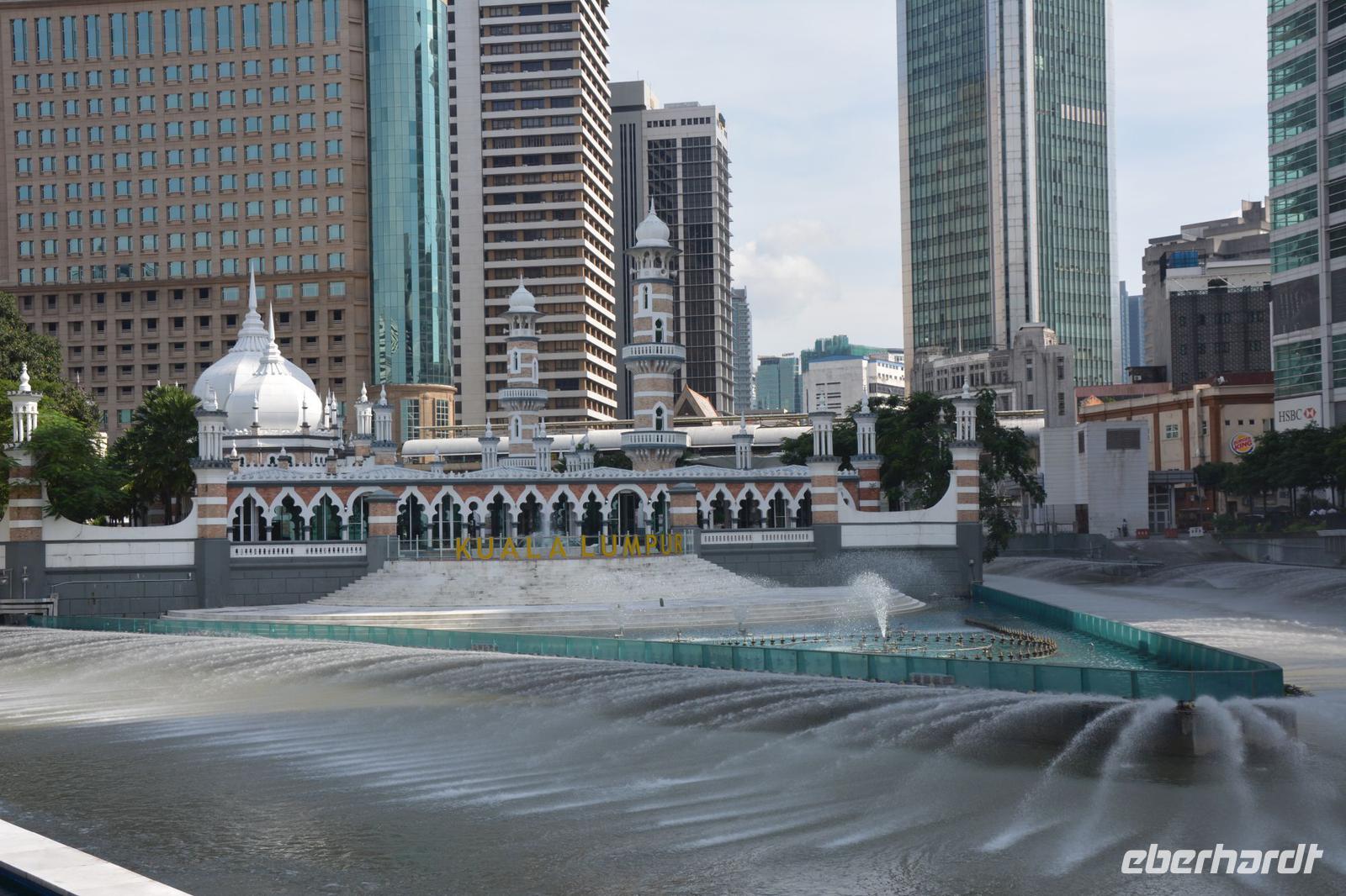Wenig später stiegen wir am Unabhängigkeitsplatz aus. Hier befindet sich auch das und die im maurischen Stil erbaute älteste Moschee der Stadt, die Jamek Moschee. Danach spazierten wir weiter zur Flussmündung. Ein ganz besonderes Erlebnis war als nächstes vorgesehen: der Besuch der Petronas Towers. Mit dem Aufzug ging es zunächst in die 41.Etage hinauf. Hier liefen wir über die Skybridge, welche die beiden Türme der höchsten Zwillingstürme der Welt miteinander verbindet.