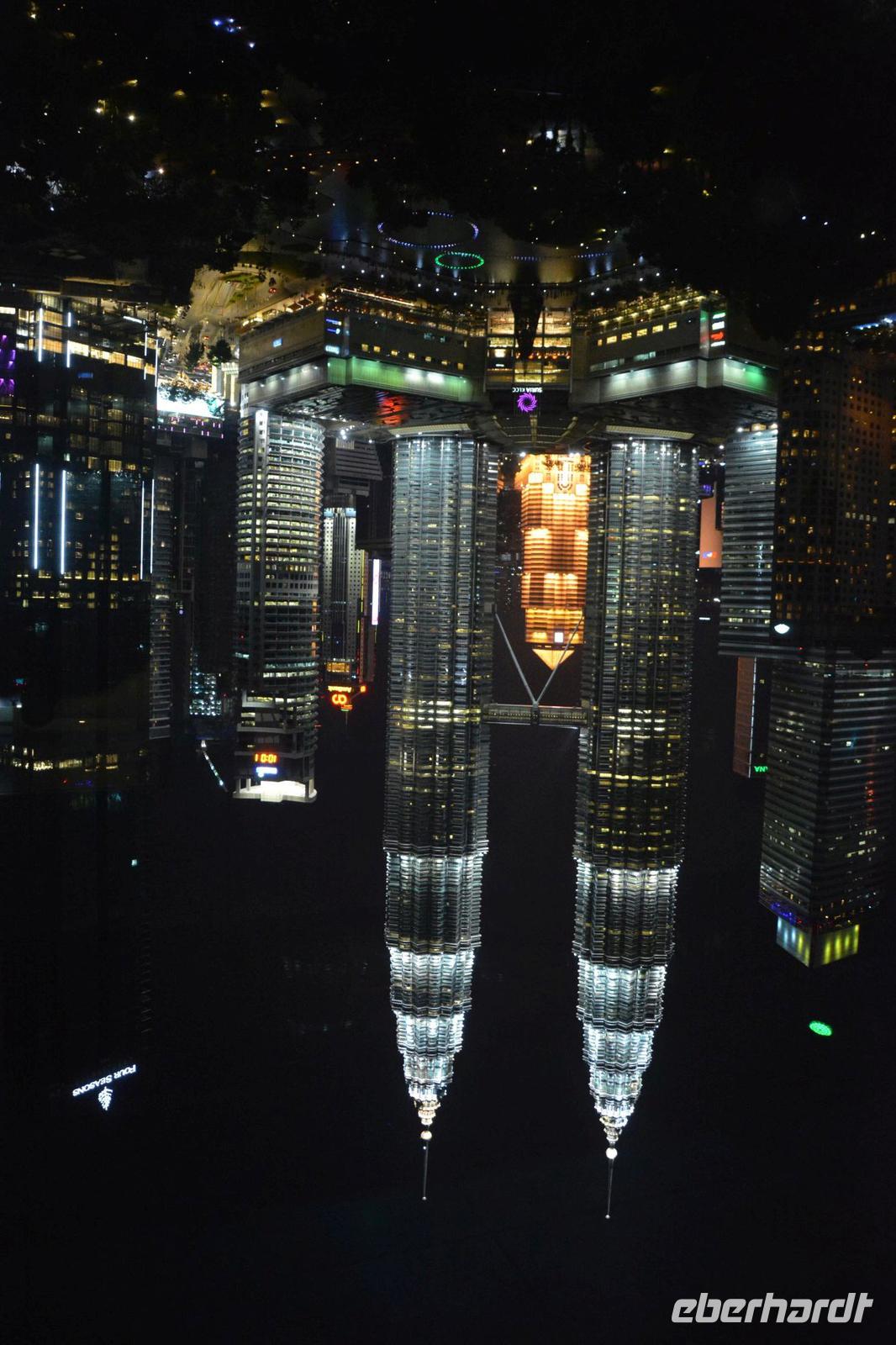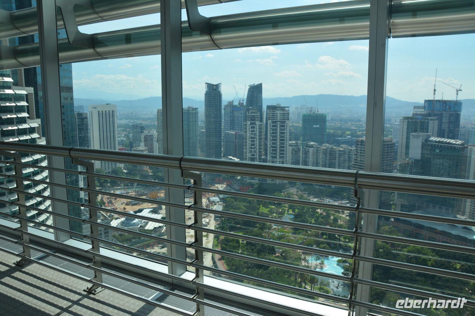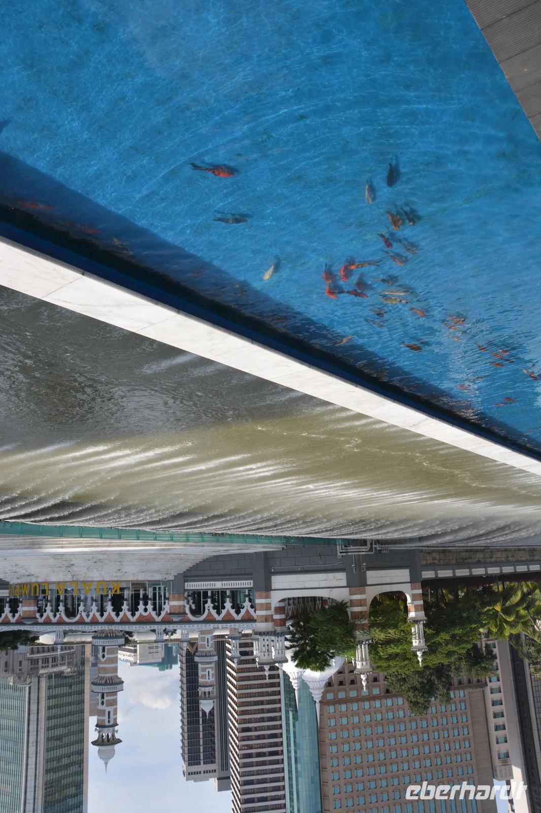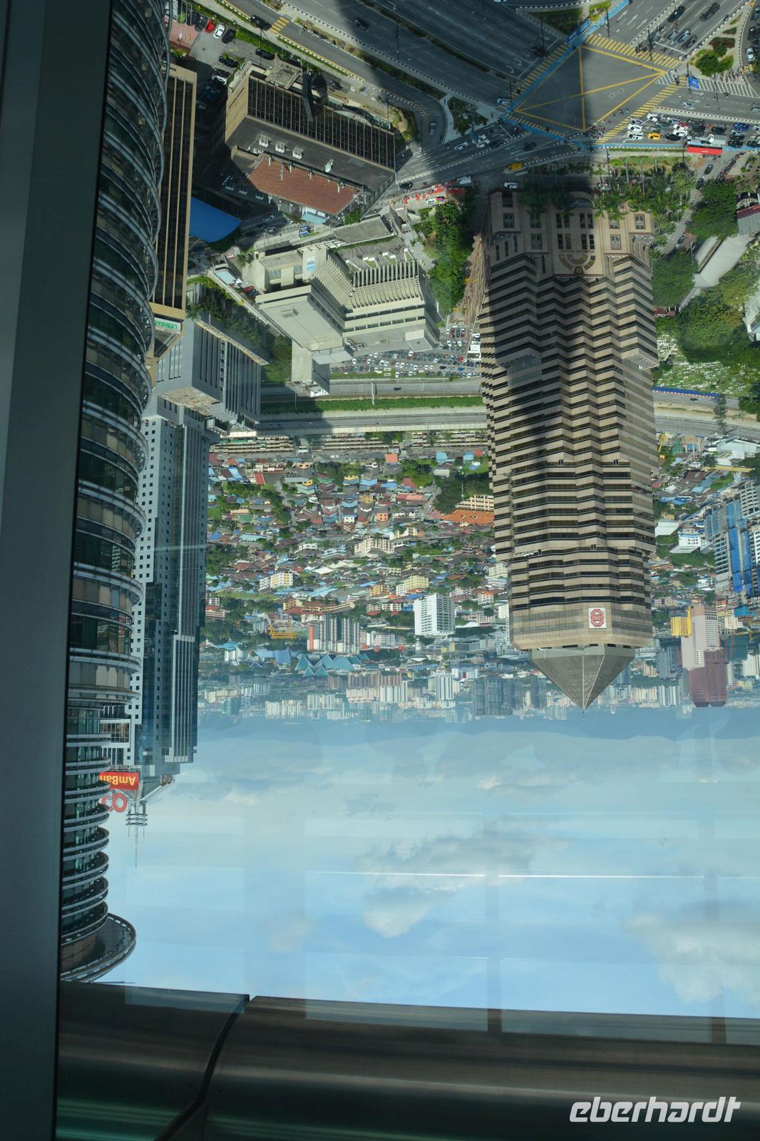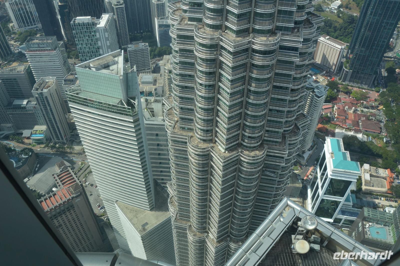 Wenig später stiegen wir am Unabhängigkeitsplatz aus. Hier befindet sich auch das und die im maurischen Stil erbaute älteste Moschee der Stadt, die Jamek Moschee. Danach spazierten wir weiter zur Flussmündung. Ein ganz besonderes Erlebnis war als nächstes vorgesehen: der Besuch der Petronas Towers. Mit dem Aufzug ging es zunächst in die 41.Etage hinauf. Hier liefen wir über die Skybridge, welche die beiden Türme der höchsten Zwillingstürme der Welt miteinander verbindet.
