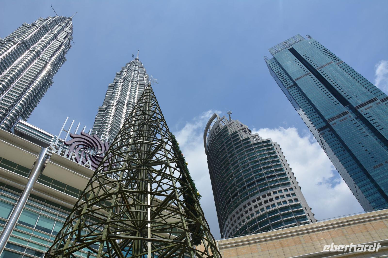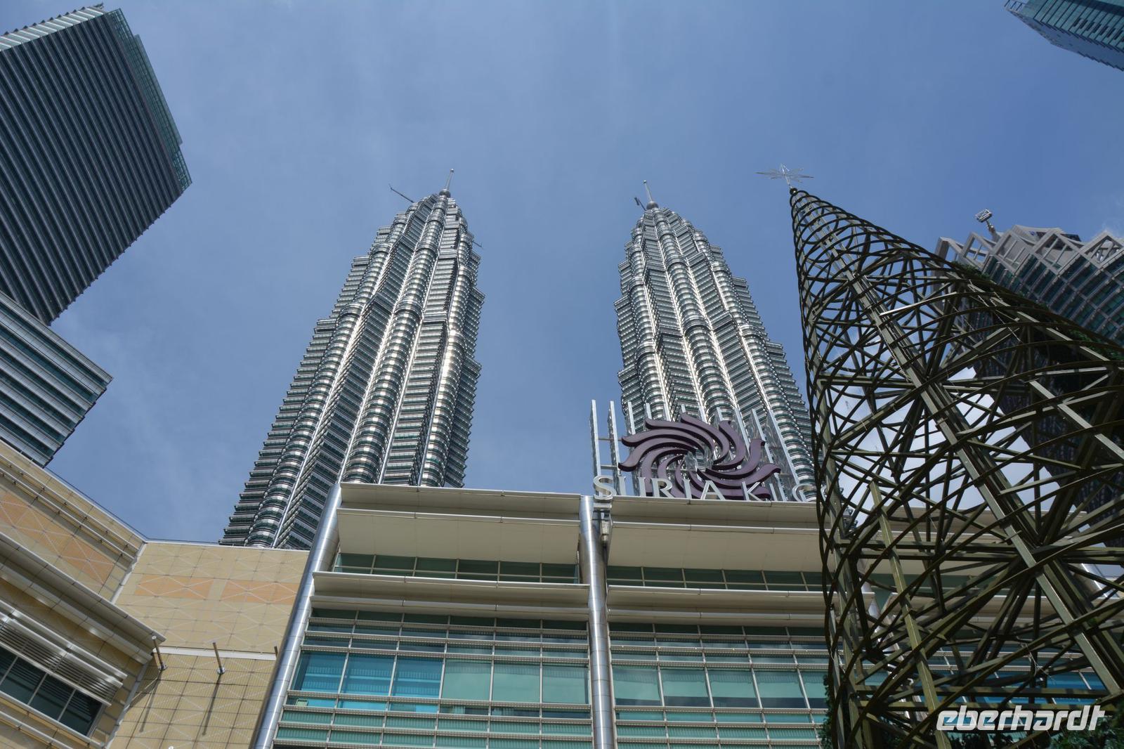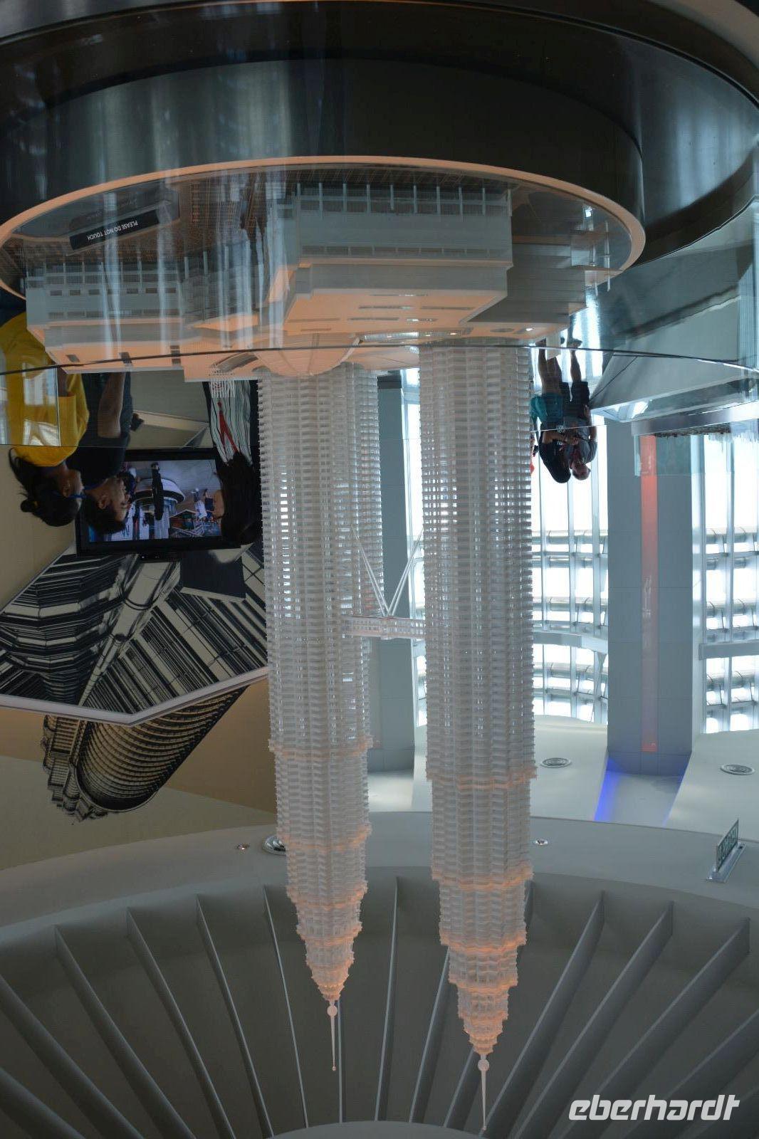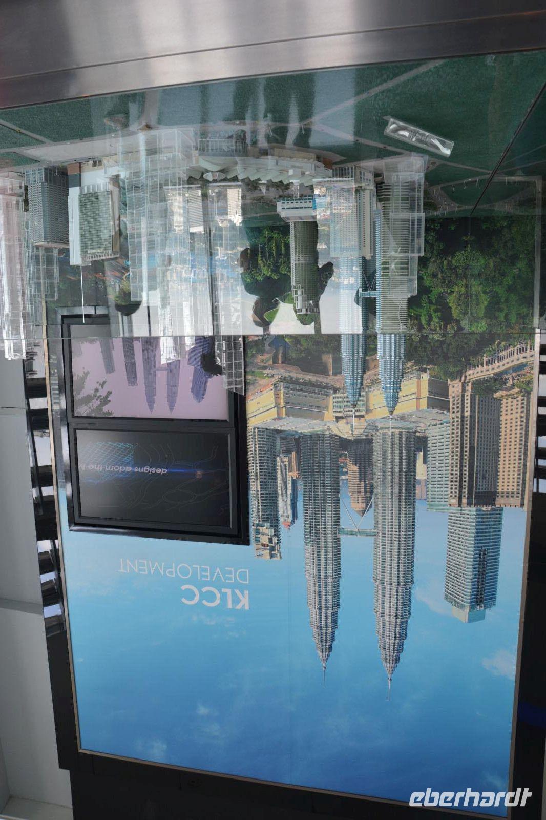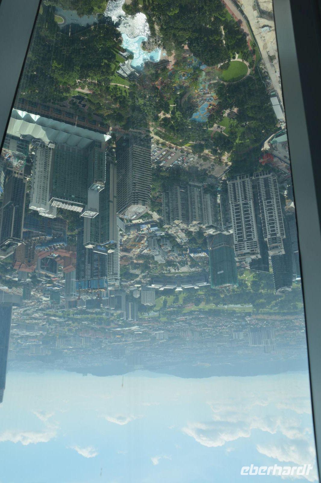Wenig später stiegen wir am Unabhängigkeitsplatz aus. Hier befindet sich auch das und die im maurischen Stil erbaute älteste Moschee der Stadt, die Jamek Moschee. Danach spazierten wir weiter zur Flussmündung. Ein ganz besonderes Erlebnis war als nächstes vorgesehen: der Besuch der Petronas Towers. Mit dem Aufzug ging es zunächst in die 41.Etage hinauf. Hier liefen wir über die Skybridge, welche die beiden Türme der höchsten Zwillingstürme der Welt miteinander verbindet.