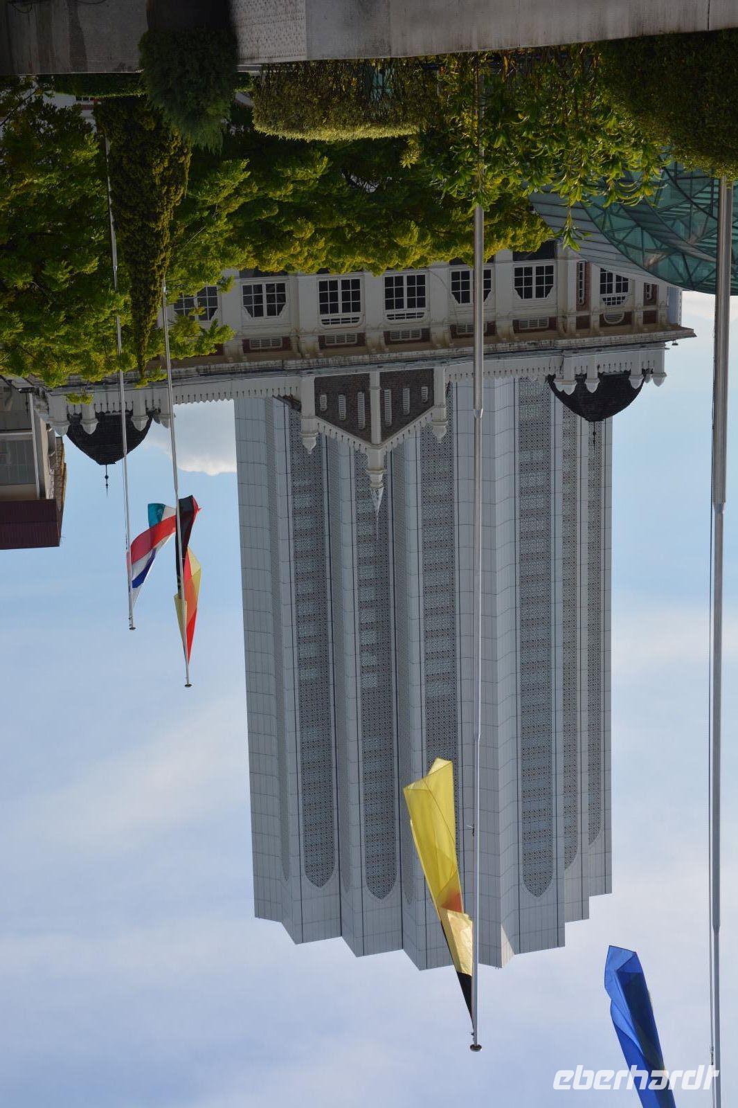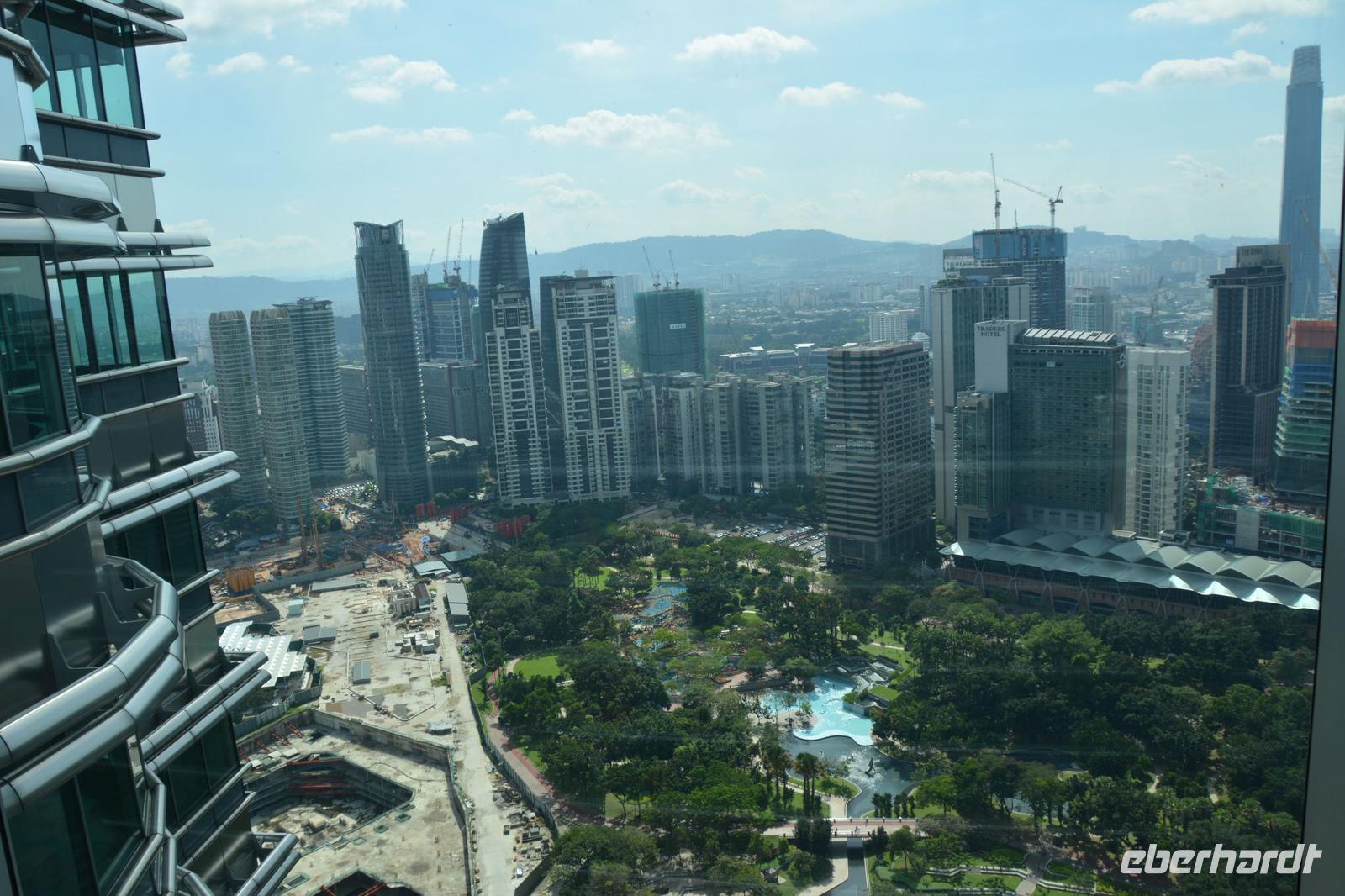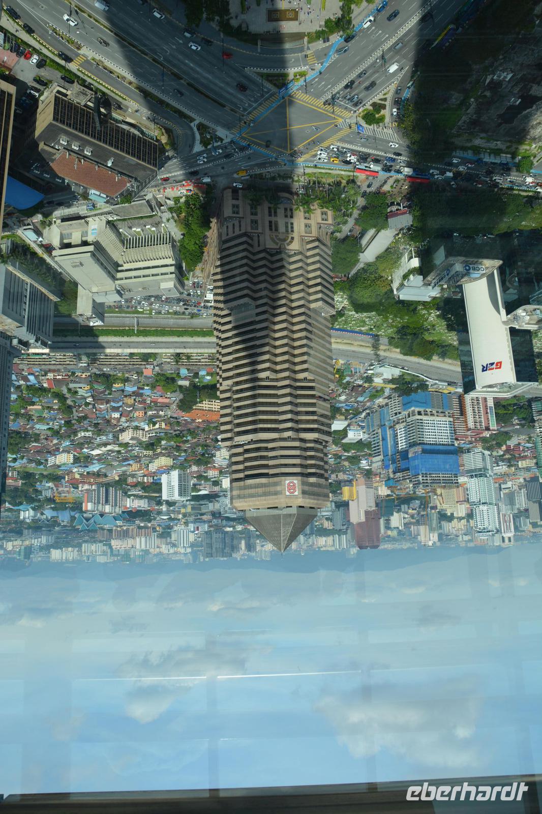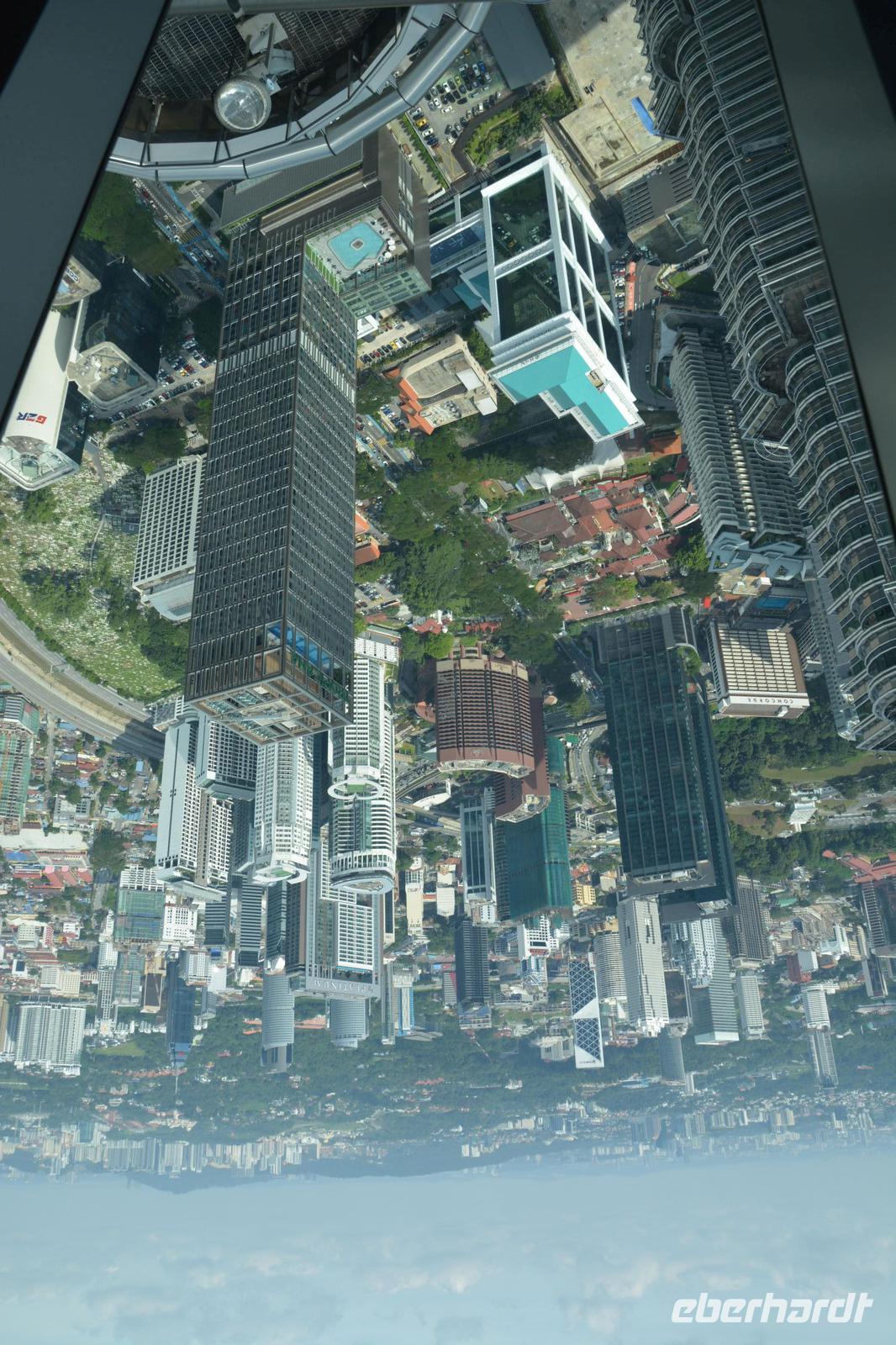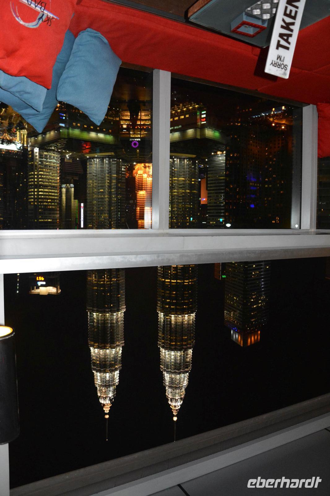 Wenig später stiegen wir am Unabhängigkeitsplatz aus. Hier befindet sich auch das und die im maurischen Stil erbaute älteste Moschee der Stadt, die Jamek Moschee. Danach spazierten wir weiter zur Flussmündung. Ein ganz besonderes Erlebnis war als nächstes vorgesehen: der Besuch der Petronas Towers. Mit dem Aufzug ging es zunächst in die 41.Etage hinauf. Hier liefen wir über die Skybridge, welche die beiden Türme der höchsten Zwillingstürme der Welt miteinander verbindet.