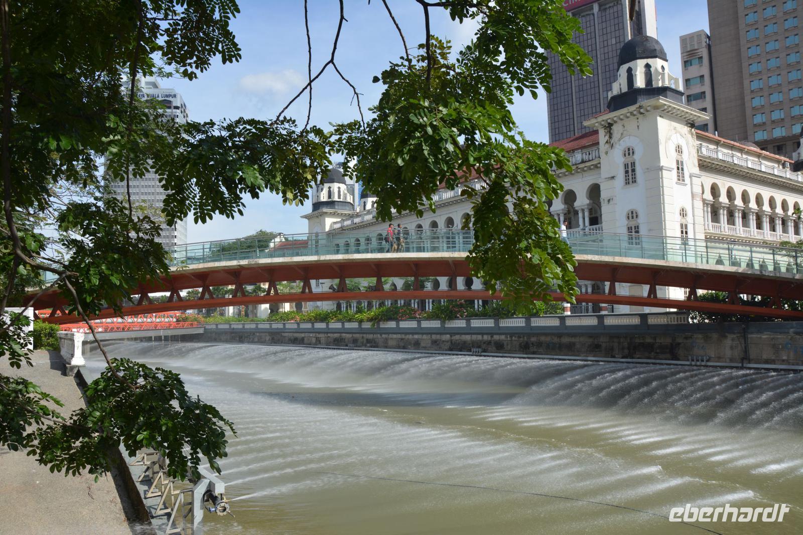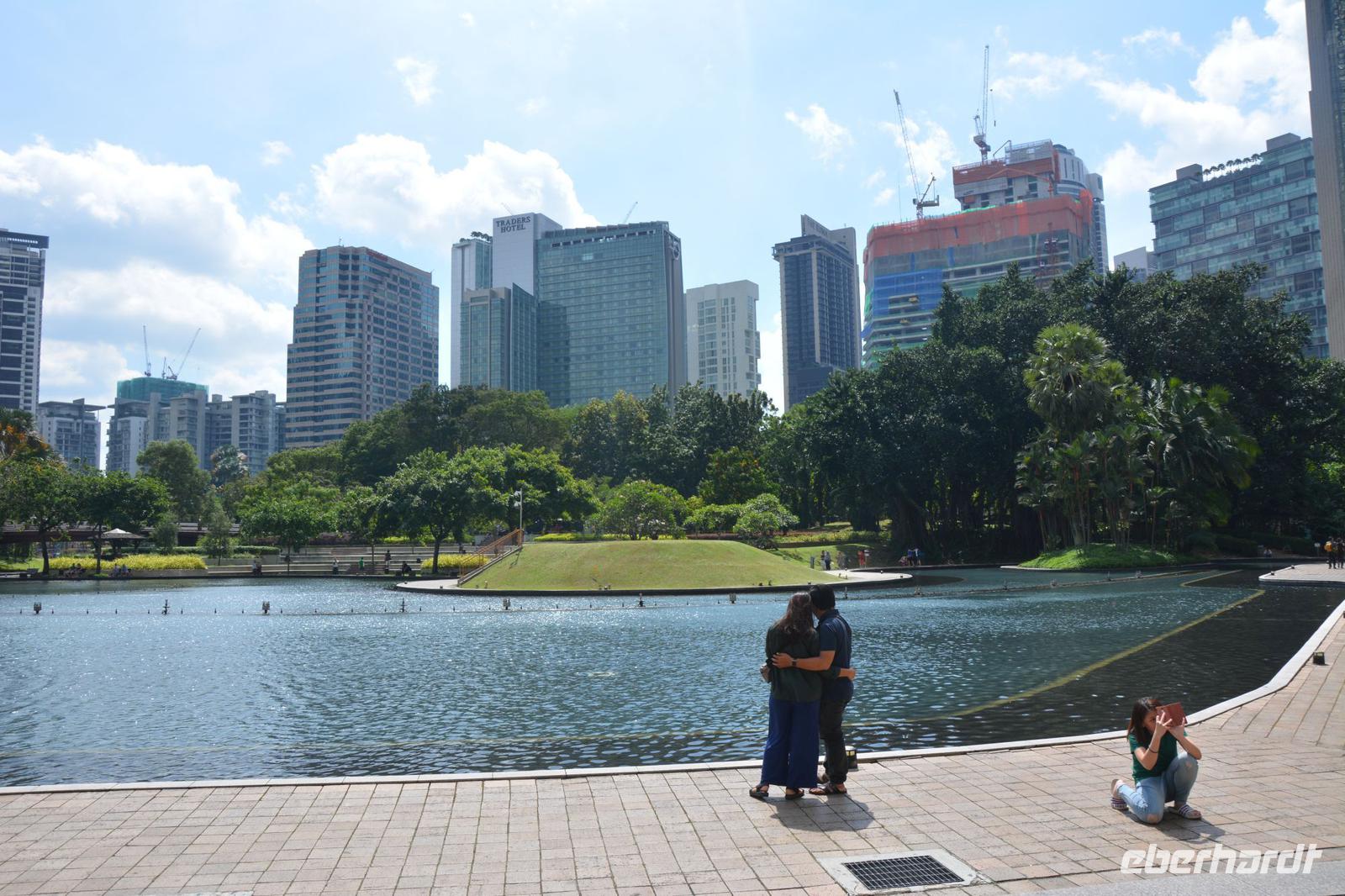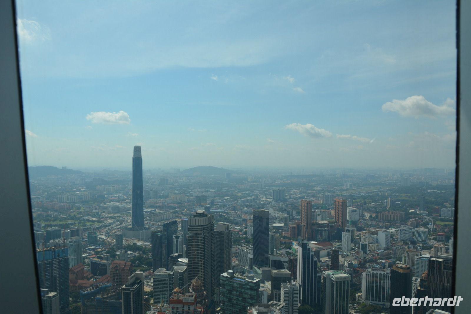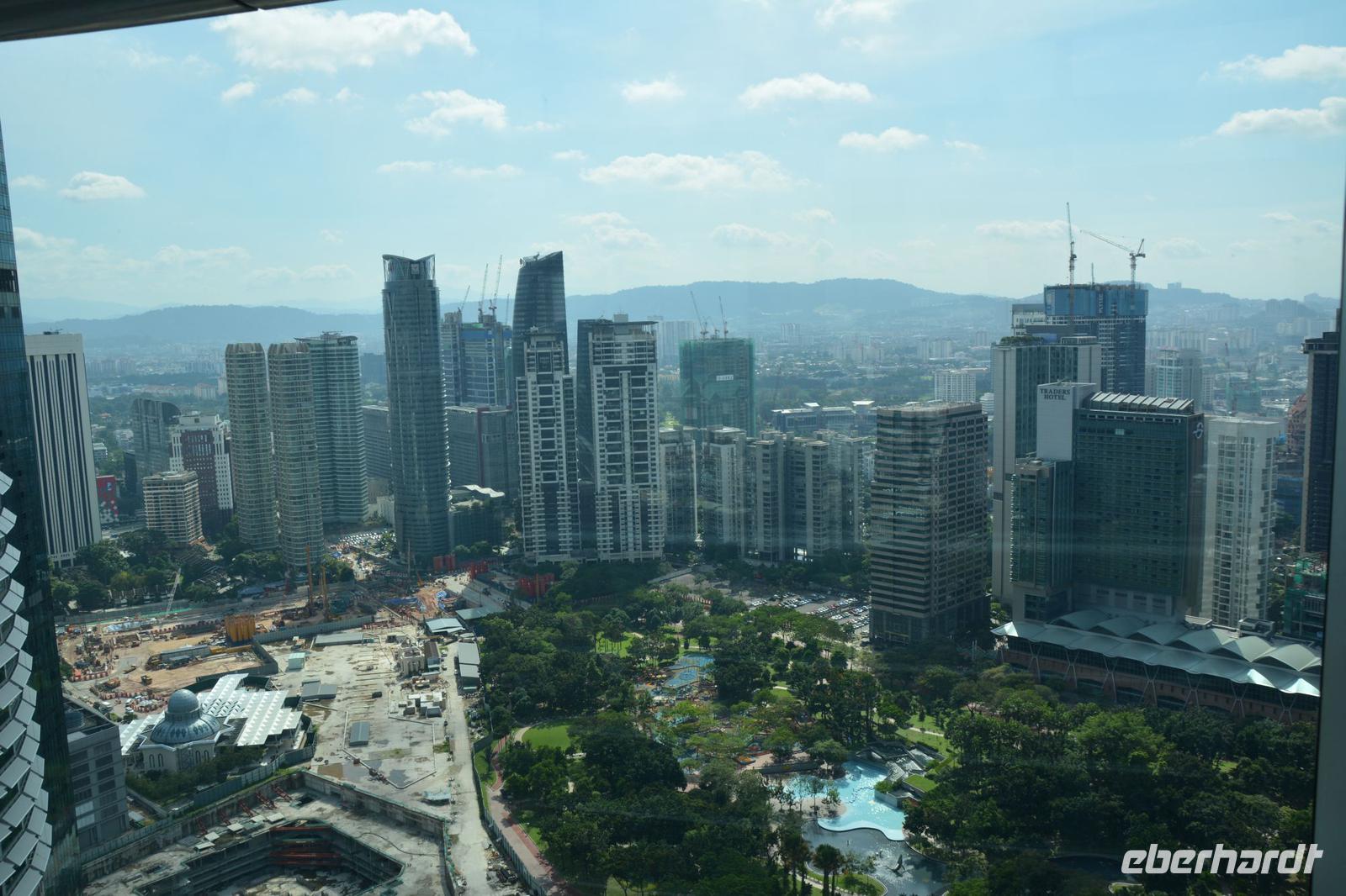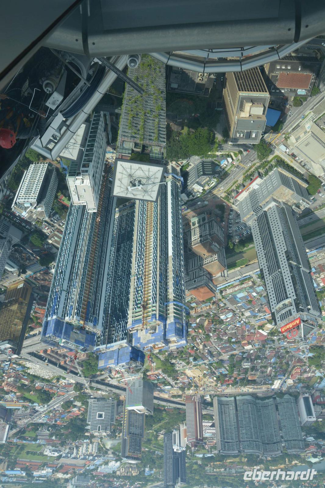 Wenig später stiegen wir am Unabhängigkeitsplatz aus. Hier befindet sich auch das und die im maurischen Stil erbaute älteste Moschee der Stadt, die Jamek Moschee. Danach spazierten wir weiter zur Flussmündung. Ein ganz besonderes Erlebnis war als nächstes vorgesehen: der Besuch der Petronas Towers. Mit dem Aufzug ging es zunächst in die 41.Etage hinauf. Hier liefen wir über die Skybridge, welche die beiden Türme der höchsten Zwillingstürme der Welt miteinander verbindet.