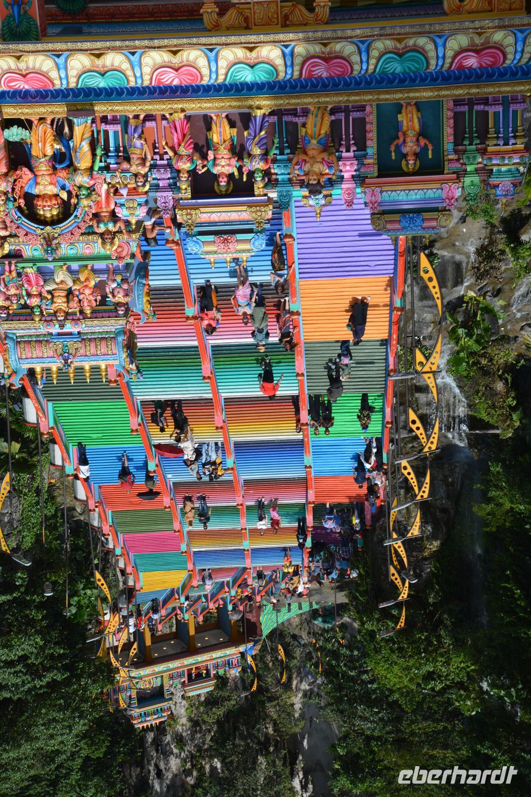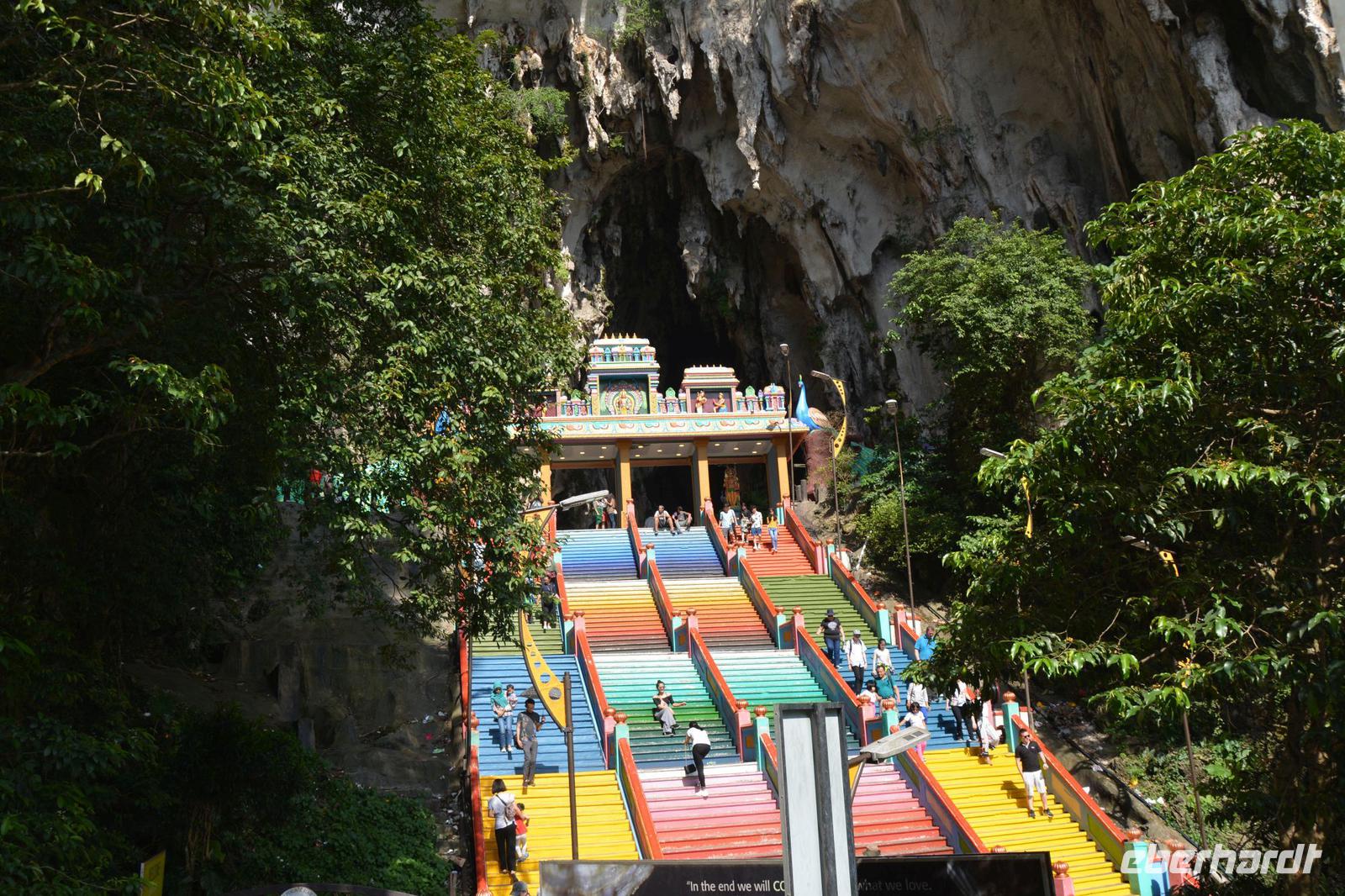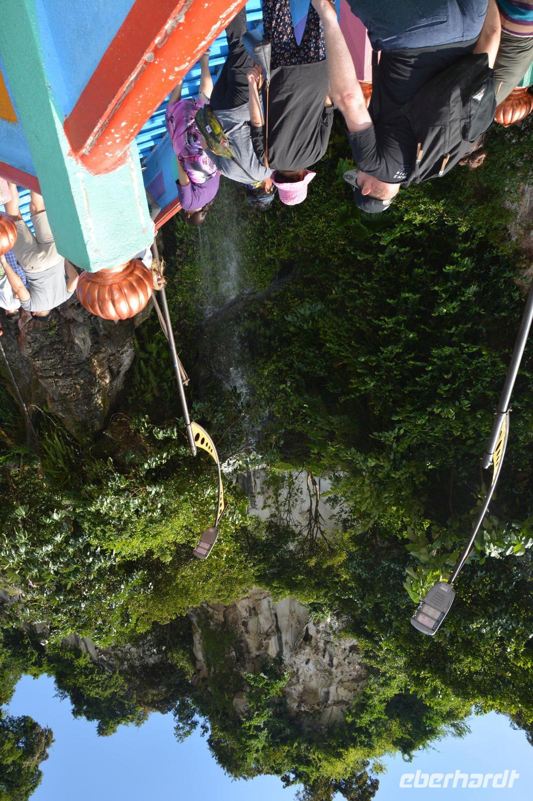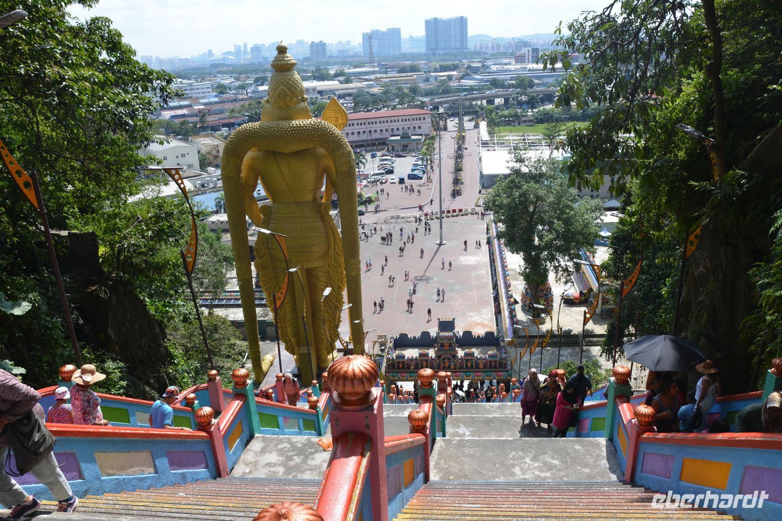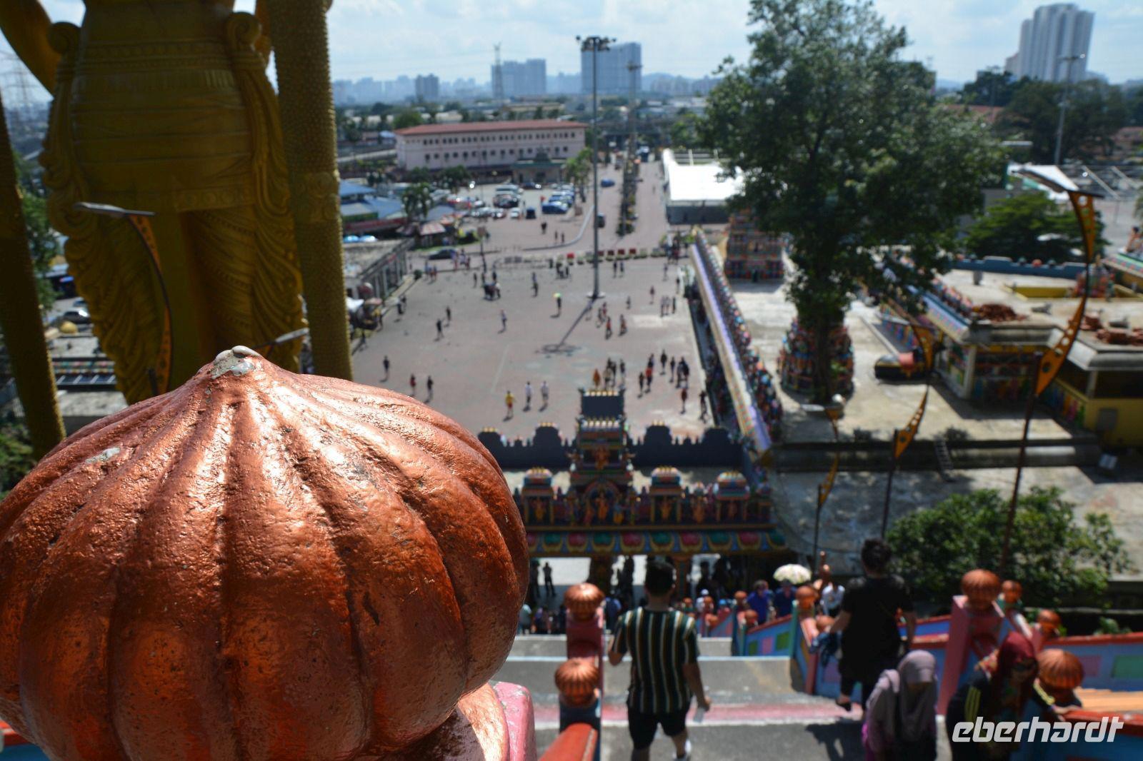 Danach ging es weiter in die 83. Etage mit Umsteigen in einen anderen Aufzug, der uns in die 86. Etage brachte. Von hier oben konnte man die Weite der Stadt sehen und mit Staunen und Erschrecken auch zwei Fensterputzer in luftiger Höhe beim Arbeiten beobachten. Danach fuhren wir wieder nach unten, durch die Shoppingmall zu den Wasseranlagen hinter den Türmen. Danach ging es mit dem Bus in Richtung Chinatown. Im Central Market aßen wir zu Mittag und verbrachten dann noch ein wenig Zeit in der Markthalle gefüllt mit Souvenirläden und anderen Geschäften. Am Nachmittag wartete erneut ein Höhepunkt auf uns: der Besuch der ein wenig außerhalb der Stadt gelegenen Batu Höhlen. Der heilige Ort des Hinduismus empfängt seine Besucher schon mit der 42 Meter großen goldenen Statue des Gottes Murugan. Trotz Hitze meisterten wir die 272 bunten Stufen nach oben, um die Höhlentempel zu besichtigen. Anschließend mussten wir die insgesamt 377 Stufen vorbei an Affen, die hin und wieder den Weg kreuzten, nach unten zu steigen. Zum Abschluss besuchten wir noch die Zinnfabrik Royal Selangor. Der verbleibende Nachmittag wurde dann nach eigenen Wünschen gestaltet, ehe wir am Abend aufbrachen, um am Stadtrand, wo der Dschungel beginnt, in ein nettes Restaurant einzukehren. Hier genossen wir ein asiatisches 5 Gänge Menü und machten uns am späten Abend wieder auf den Heimweg.