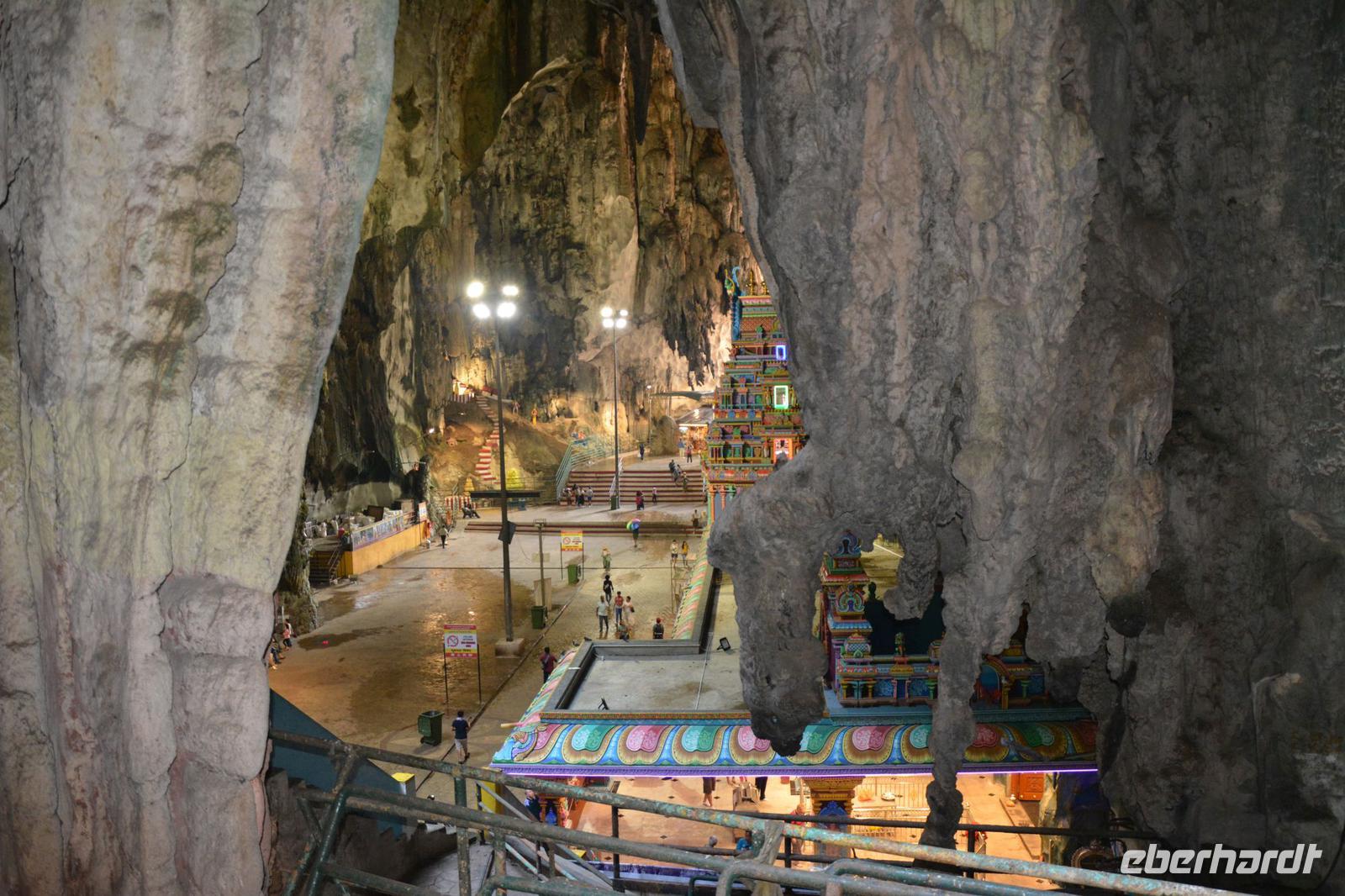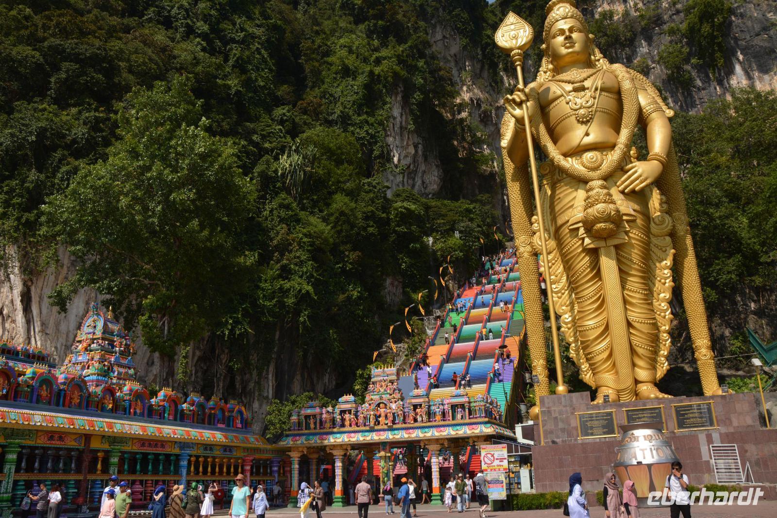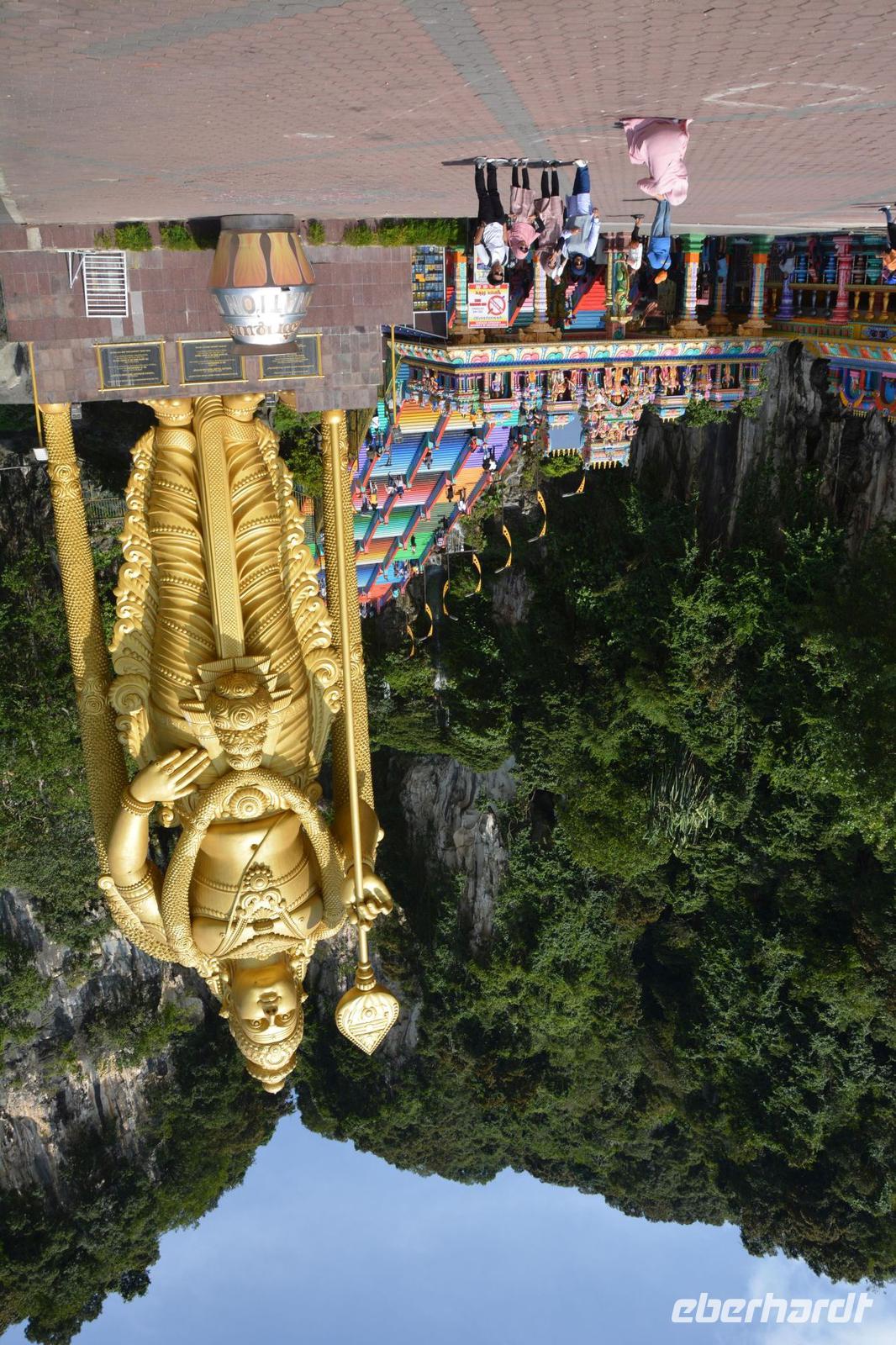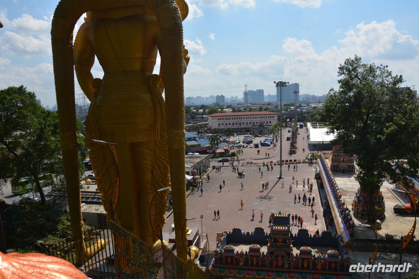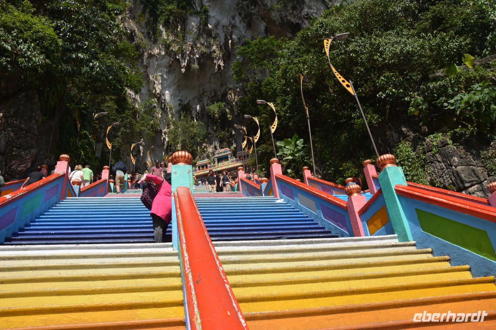 Danach ging es weiter in die 83. Etage mit Umsteigen in einen anderen Aufzug, der uns in die 86. Etage brachte. Von hier oben konnte man die Weite der Stadt sehen und mit Staunen und Erschrecken auch zwei Fensterputzer in luftiger Höhe beim Arbeiten beobachten. Danach fuhren wir wieder nach unten, durch die Shoppingmall zu den Wasseranlagen hinter den Türmen. Danach ging es mit dem Bus in Richtung Chinatown. Im Central Market aßen wir zu Mittag und verbrachten dann noch ein wenig Zeit in der Markthalle gefüllt mit Souvenirläden und anderen Geschäften. Am Nachmittag wartete erneut ein Höhepunkt auf uns: der Besuch der ein wenig außerhalb der Stadt gelegenen Batu Höhlen. Der heilige Ort des Hinduismus empfängt seine Besucher schon mit der 42 Meter großen goldenen Statue des Gottes Murugan. Trotz Hitze meisterten wir die 272 bunten Stufen nach oben, um die Höhlentempel zu besichtigen. Anschließend mussten wir die insgesamt 377 Stufen vorbei an Affen, die hin und wieder den Weg kreuzten, nach unten zu steigen. Zum Abschluss besuchten wir noch die Zinnfabrik Royal Selangor. Der verbleibende Nachmittag wurde dann nach eigenen Wünschen gestaltet, ehe wir am Abend aufbrachen, um am Stadtrand, wo der Dschungel beginnt, in ein nettes Restaurant einzukehren. Hier genossen wir ein asiatisches 5 Gänge Menü und machten uns am späten Abend wieder auf den Heimweg.