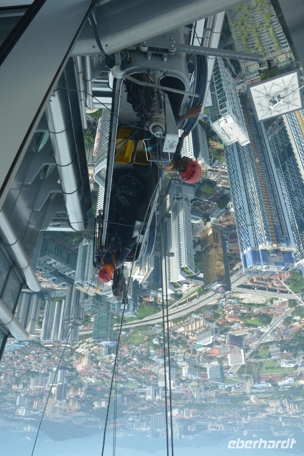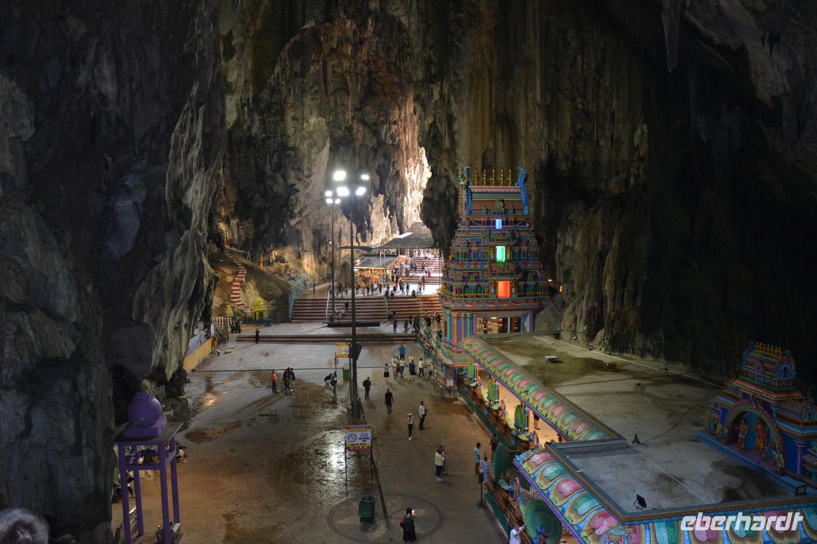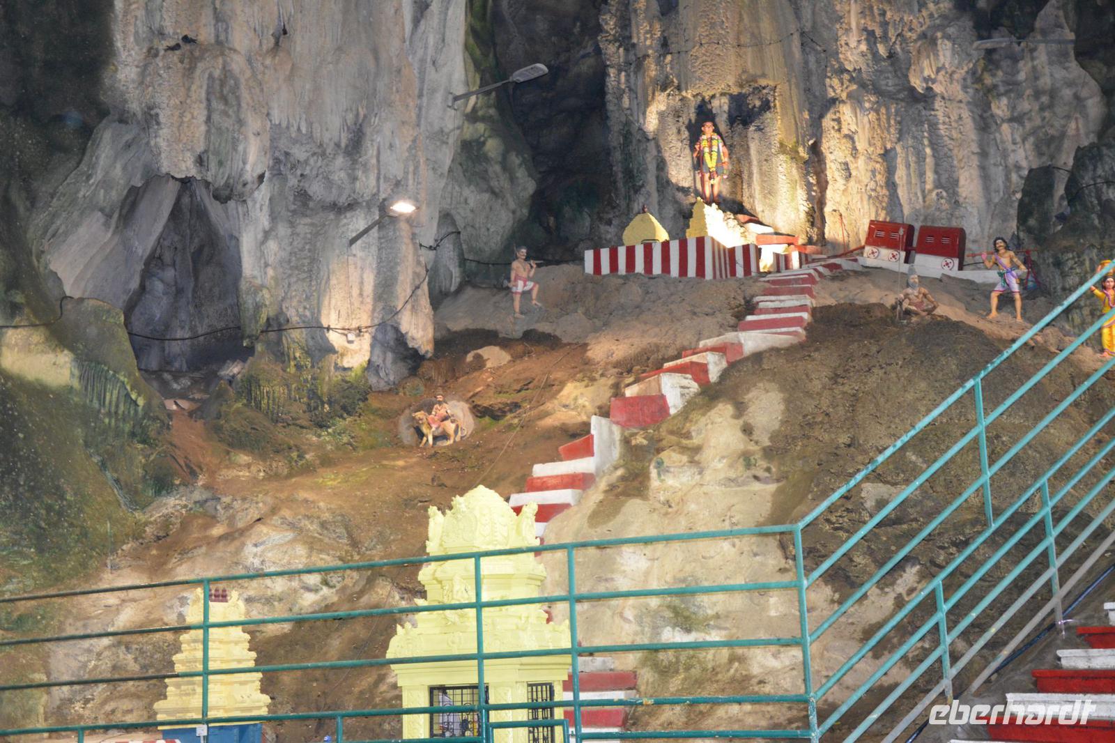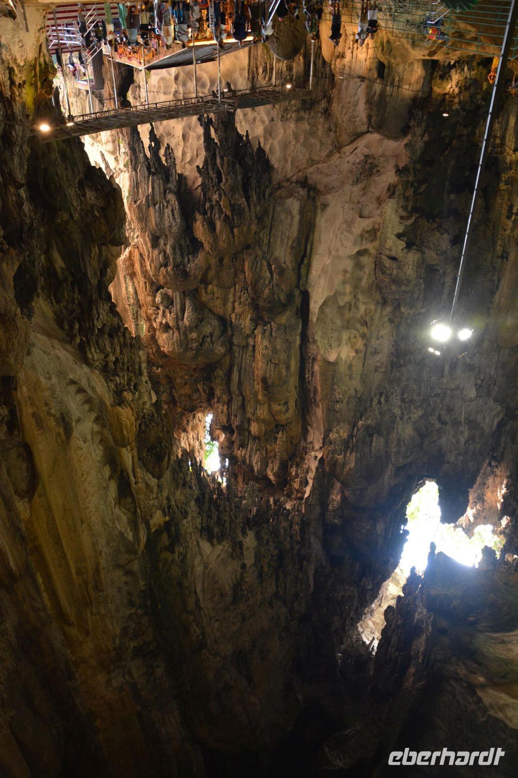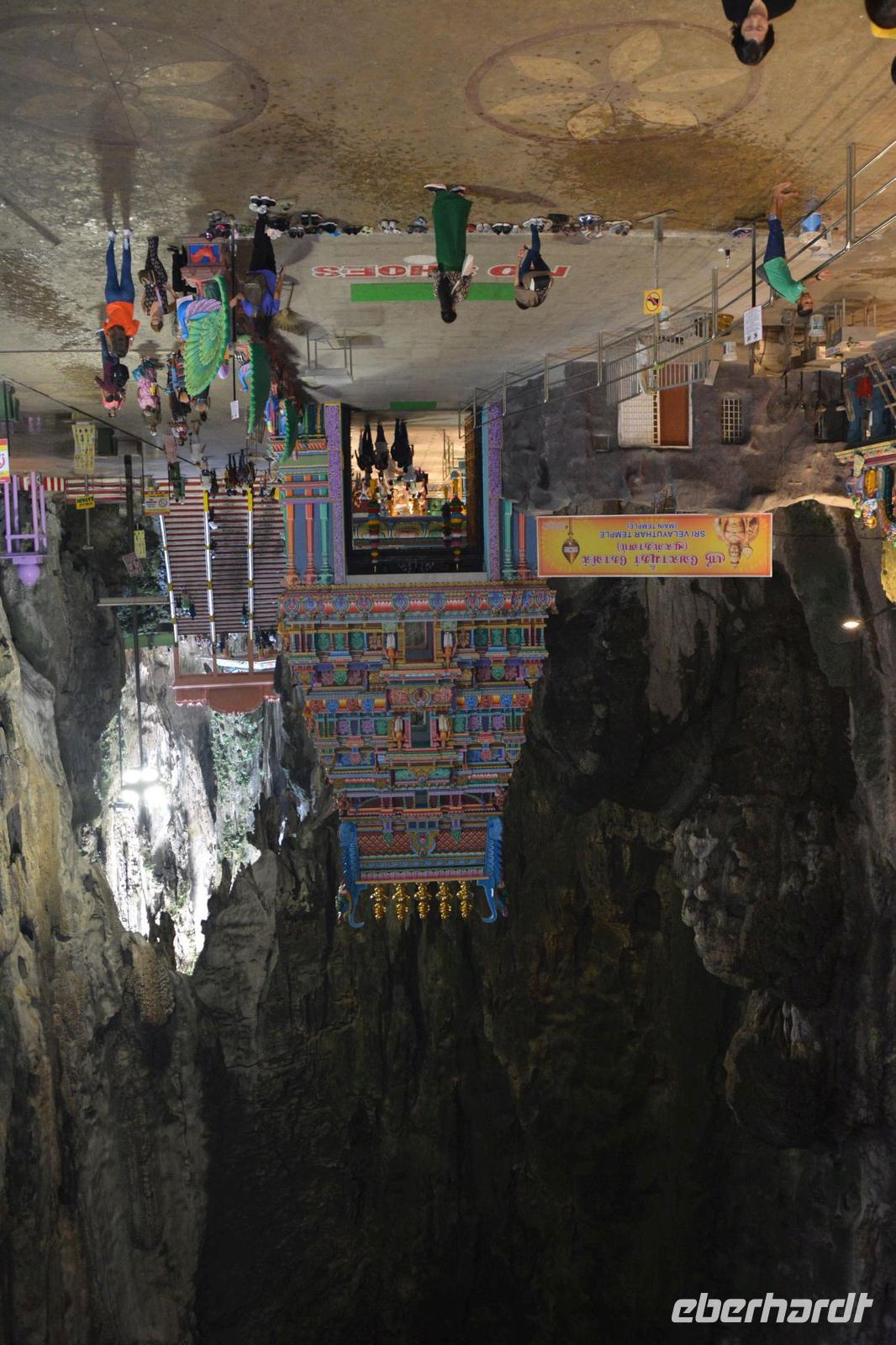 Danach ging es weiter in die 83. Etage mit Umsteigen in einen anderen Aufzug, der uns in die 86. Etage brachte. Von hier oben konnte man die Weite der Stadt sehen und mit Staunen und Erschrecken auch zwei Fensterputzer in luftiger Höhe beim Arbeiten beobachten. Danach fuhren wir wieder nach unten, durch die Shoppingmall zu den Wasseranlagen hinter den Türmen. Danach ging es mit dem Bus in Richtung Chinatown. Im Central Market aßen wir zu Mittag und verbrachten dann noch ein wenig Zeit in der Markthalle gefüllt mit Souvenirläden und anderen Geschäften. Am Nachmittag wartete erneut ein Höhepunkt auf uns: der Besuch der ein wenig außerhalb der Stadt gelegenen Batu Höhlen. Der heilige Ort des Hinduismus empfängt seine Besucher schon mit der 42 Meter großen goldenen Statue des Gottes Murugan. Trotz Hitze meisterten wir die 272 bunten Stufen nach oben, um die Höhlentempel zu besichtigen. Anschließend mussten wir die insgesamt 377 Stufen vorbei an Affen, die hin und wieder den Weg kreuzten, nach unten zu steigen. Zum Abschluss besuchten wir noch die Zinnfabrik Royal Selangor. Der verbleibende Nachmittag wurde dann nach eigenen Wünschen gestaltet, ehe wir am Abend aufbrachen, um am Stadtrand, wo der Dschungel beginnt, in ein nettes Restaurant einzukehren. Hier genossen wir ein asiatisches 5 Gänge Menü und machten uns am späten Abend wieder auf den Heimweg.