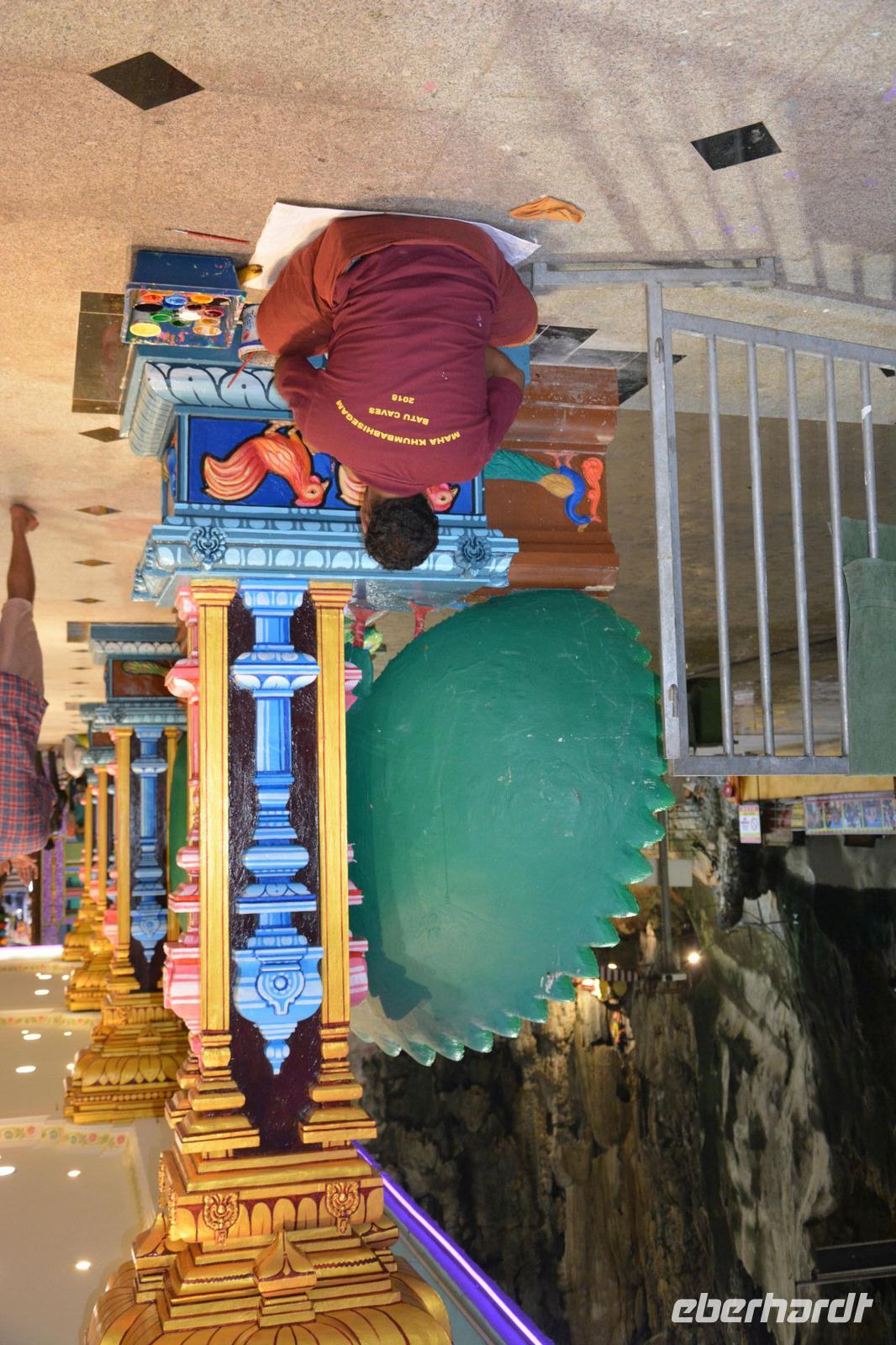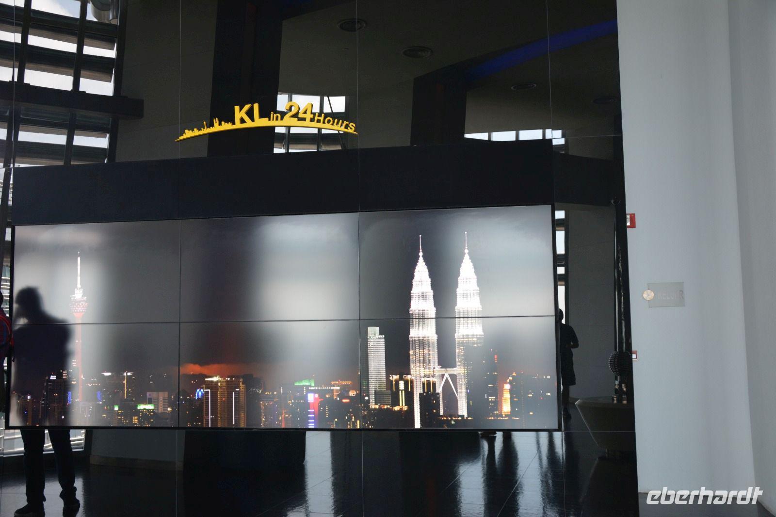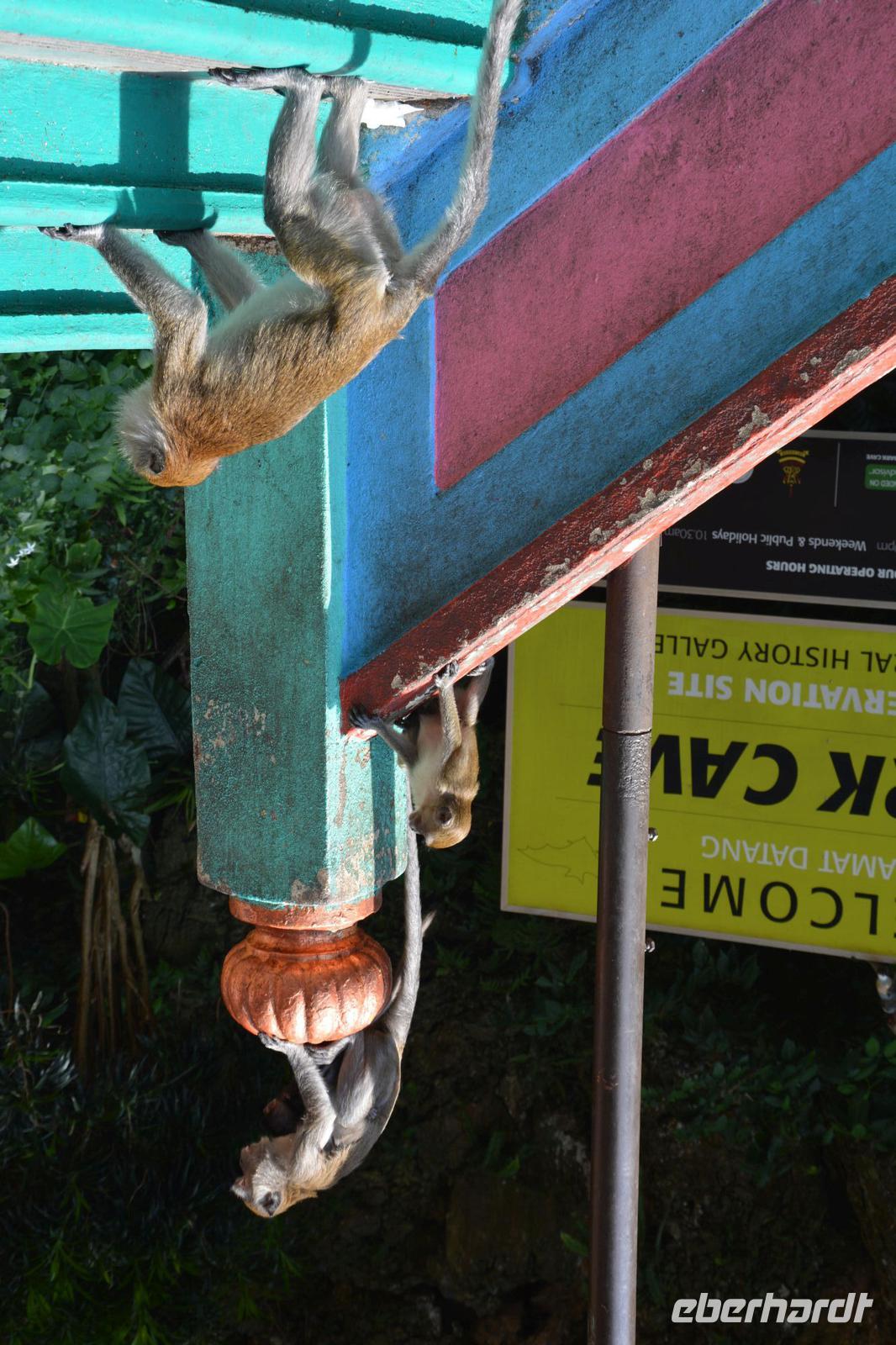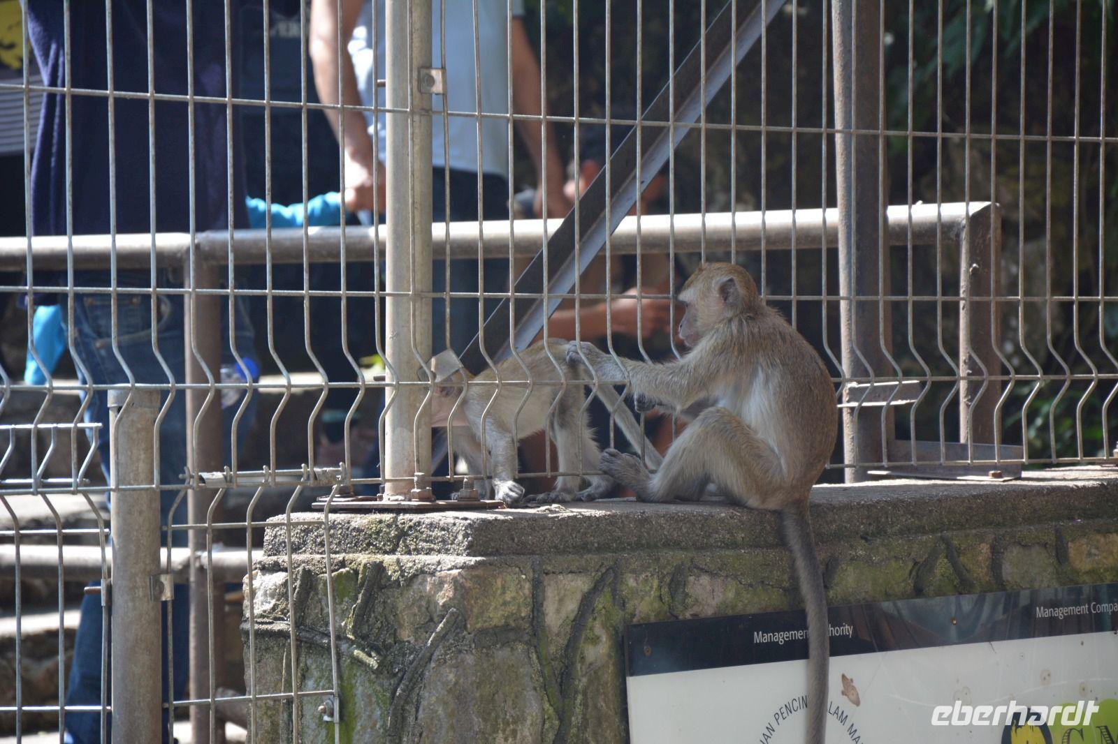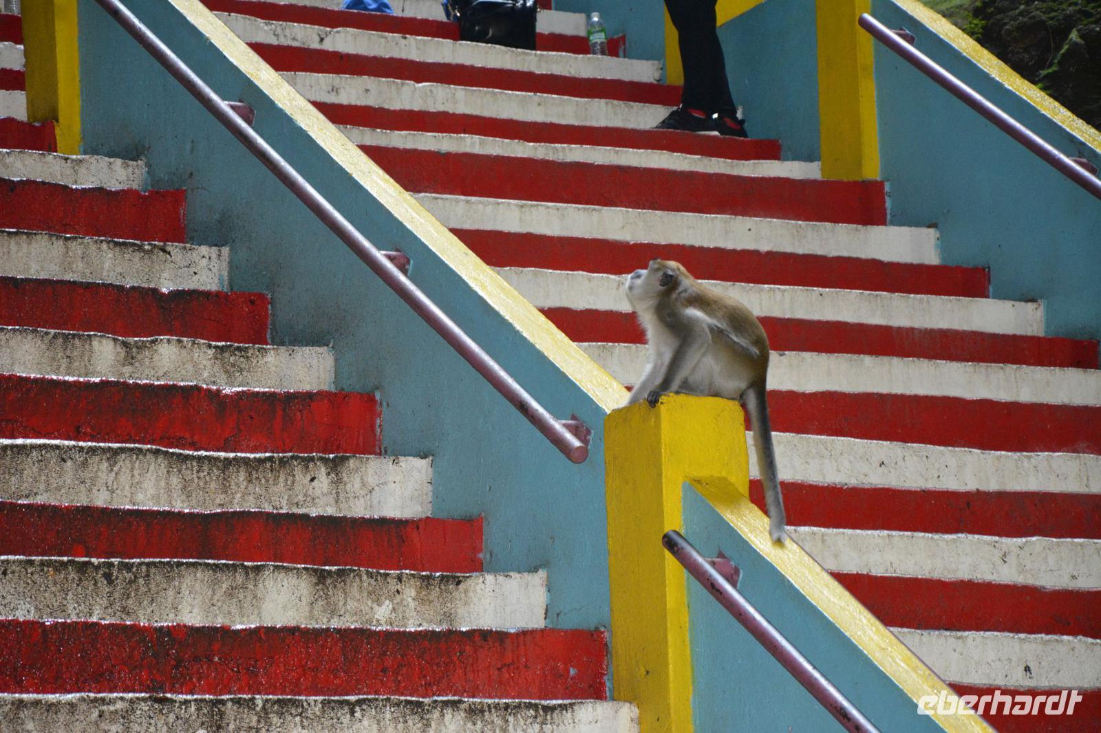 Danach ging es weiter in die 83. Etage mit Umsteigen in einen anderen Aufzug, der uns in die 86. Etage brachte. Von hier oben konnte man die Weite der Stadt sehen und mit Staunen und Erschrecken auch zwei Fensterputzer in luftiger Höhe beim Arbeiten beobachten. Danach fuhren wir wieder nach unten, durch die Shoppingmall zu den Wasseranlagen hinter den Türmen. Danach ging es mit dem Bus in Richtung Chinatown. Im Central Market aßen wir zu Mittag und verbrachten dann noch ein wenig Zeit in der Markthalle gefüllt mit Souvenirläden und anderen Geschäften. Am Nachmittag wartete erneut ein Höhepunkt auf uns: der Besuch der ein wenig außerhalb der Stadt gelegenen Batu Höhlen. Der heilige Ort des Hinduismus empfängt seine Besucher schon mit der 42 Meter großen goldenen Statue des Gottes Murugan. Trotz Hitze meisterten wir die 272 bunten Stufen nach oben, um die Höhlentempel zu besichtigen. Anschließend mussten wir die insgesamt 377 Stufen vorbei an Affen, die hin und wieder den Weg kreuzten, nach unten zu steigen. Zum Abschluss besuchten wir noch die Zinnfabrik Royal Selangor. Der verbleibende Nachmittag wurde dann nach eigenen Wünschen gestaltet, ehe wir am Abend aufbrachen, um am Stadtrand, wo der Dschungel beginnt, in ein nettes Restaurant einzukehren. Hier genossen wir ein asiatisches 5 Gänge Menü und machten uns am späten Abend wieder auf den Heimweg.
