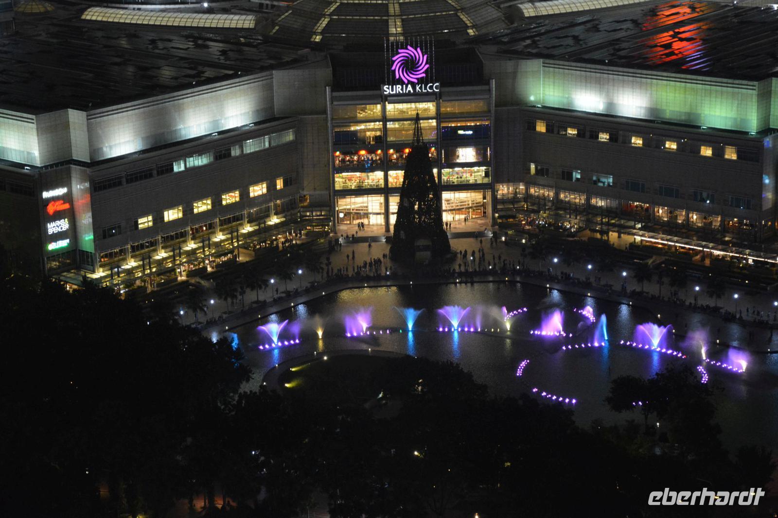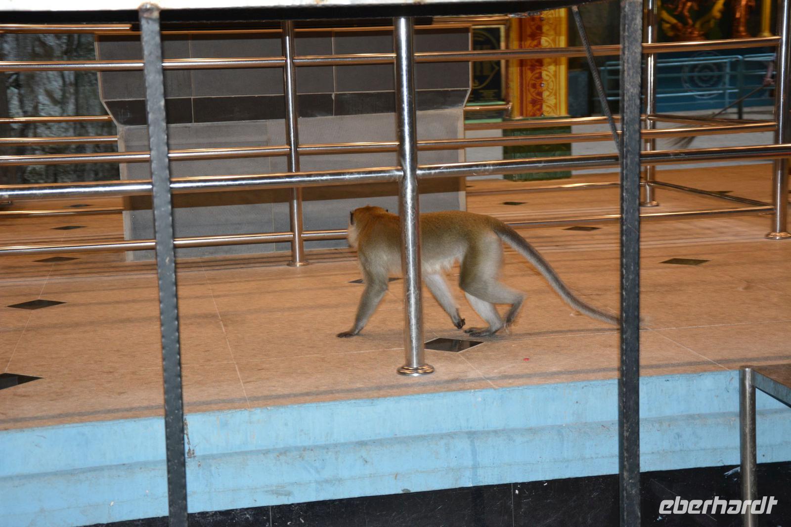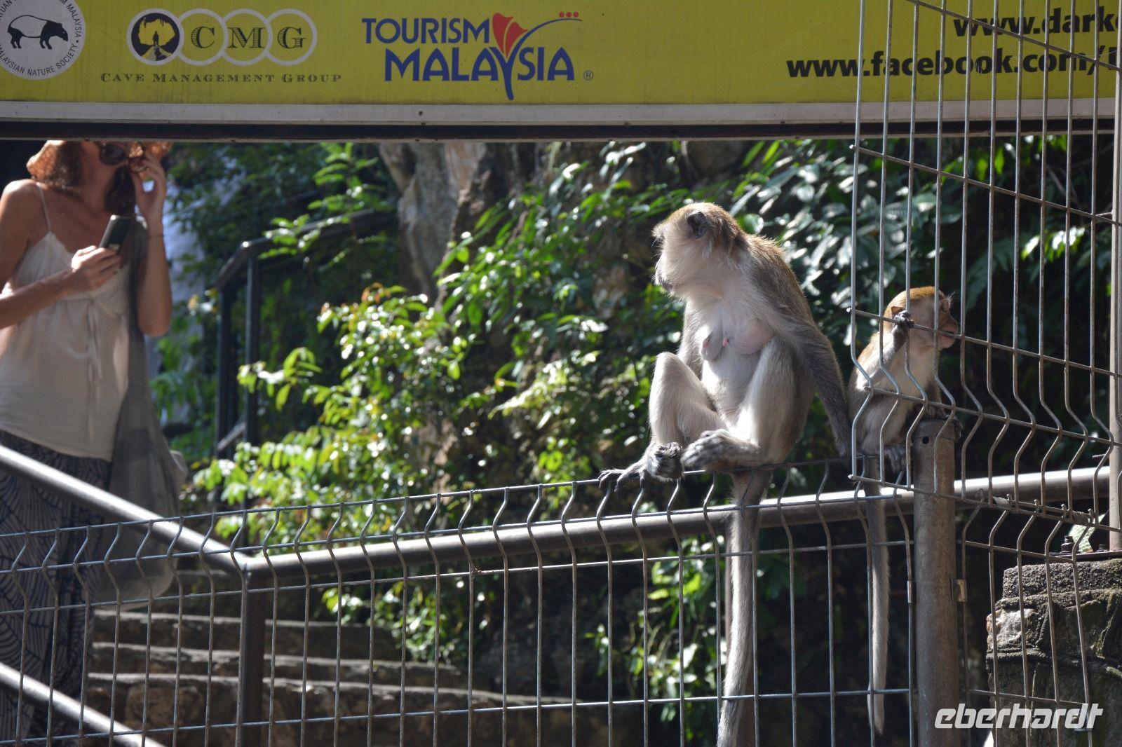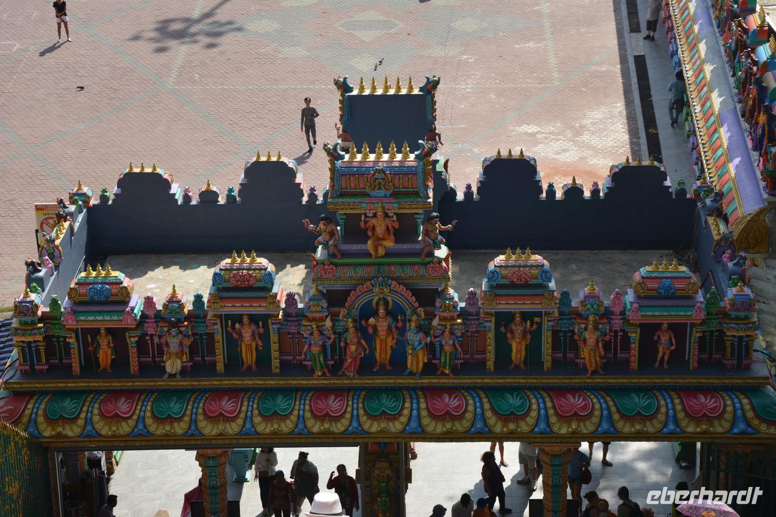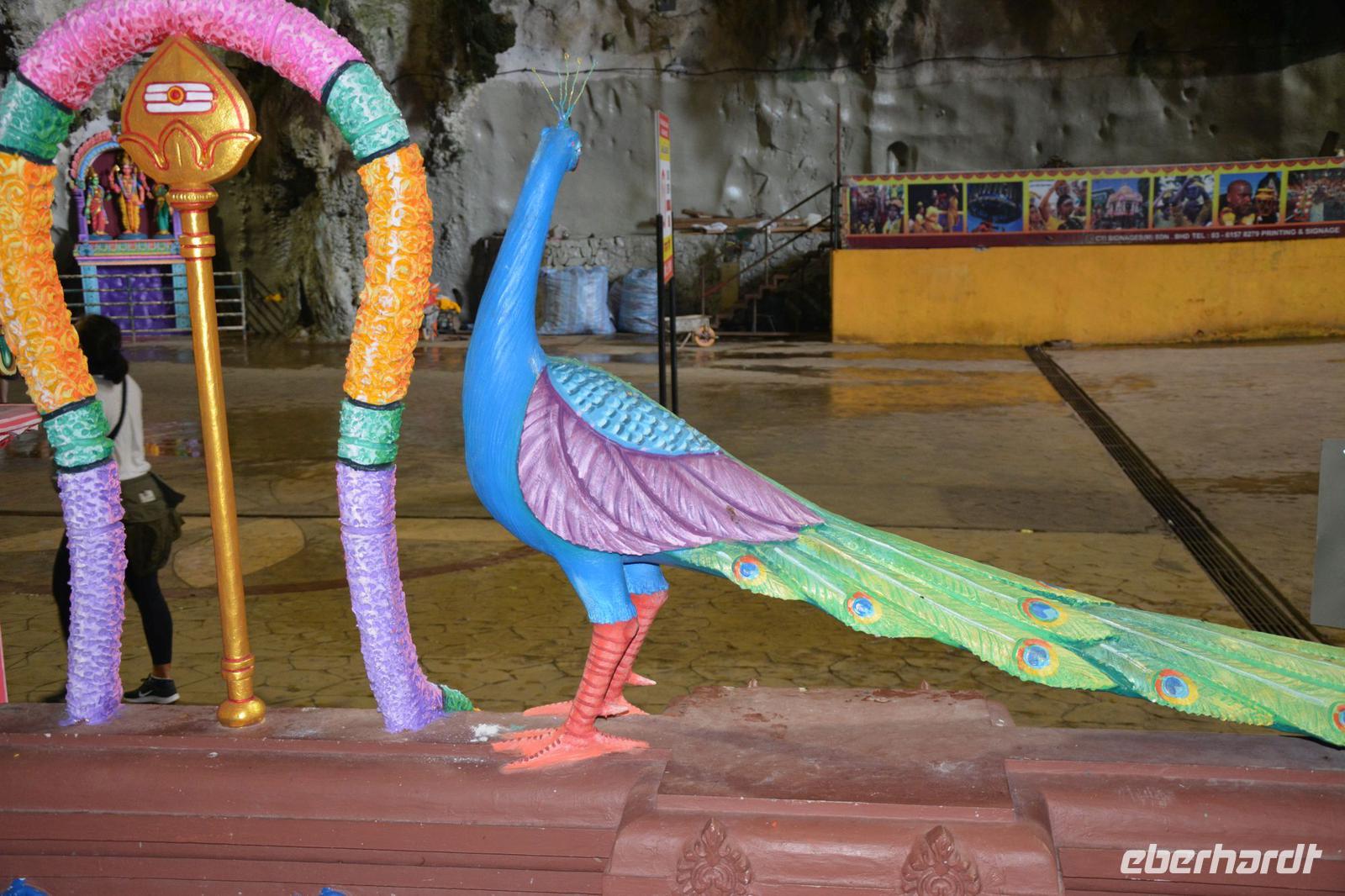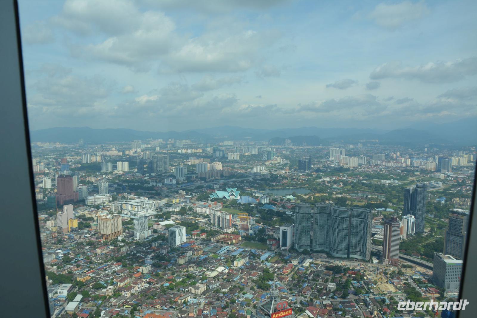 Danach ging es weiter in die 83. Etage mit Umsteigen in einen anderen Aufzug, der uns in die 86. Etage brachte. Von hier oben konnte man die Weite der Stadt sehen und mit Staunen und Erschrecken auch zwei Fensterputzer in luftiger Höhe beim Arbeiten beobachten. Danach fuhren wir wieder nach unten, durch die Shoppingmall zu den Wasseranlagen hinter den Türmen. Danach ging es mit dem Bus in Richtung Chinatown. Im Central Market aßen wir zu Mittag und verbrachten dann noch ein wenig Zeit in der Markthalle gefüllt mit Souvenirläden und anderen Geschäften. Am Nachmittag wartete erneut ein Höhepunkt auf uns: der Besuch der ein wenig außerhalb der Stadt gelegenen Batu Höhlen. Der heilige Ort des Hinduismus empfängt seine Besucher schon mit der 42 Meter großen goldenen Statue des Gottes Murugan. Trotz Hitze meisterten wir die 272 bunten Stufen nach oben, um die Höhlentempel zu besichtigen. Anschließend mussten wir die insgesamt 377 Stufen vorbei an Affen, die hin und wieder den Weg kreuzten, nach unten zu steigen. Zum Abschluss besuchten wir noch die Zinnfabrik Royal Selangor. Der verbleibende Nachmittag wurde dann nach eigenen Wünschen gestaltet, ehe wir am Abend aufbrachen, um am Stadtrand, wo der Dschungel beginnt, in ein nettes Restaurant einzukehren. Hier genossen wir ein asiatisches 5 Gänge Menü und machten uns am späten Abend wieder auf den Heimweg.