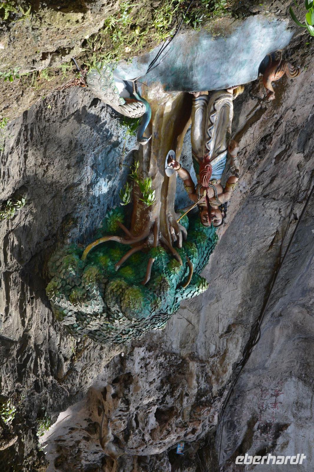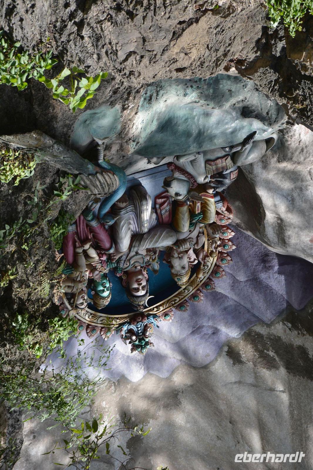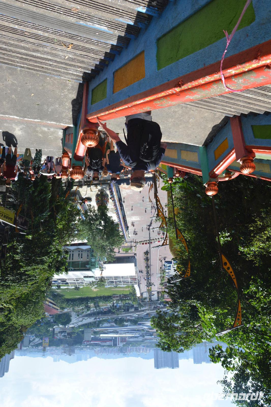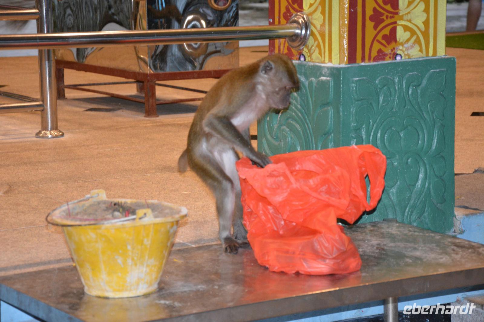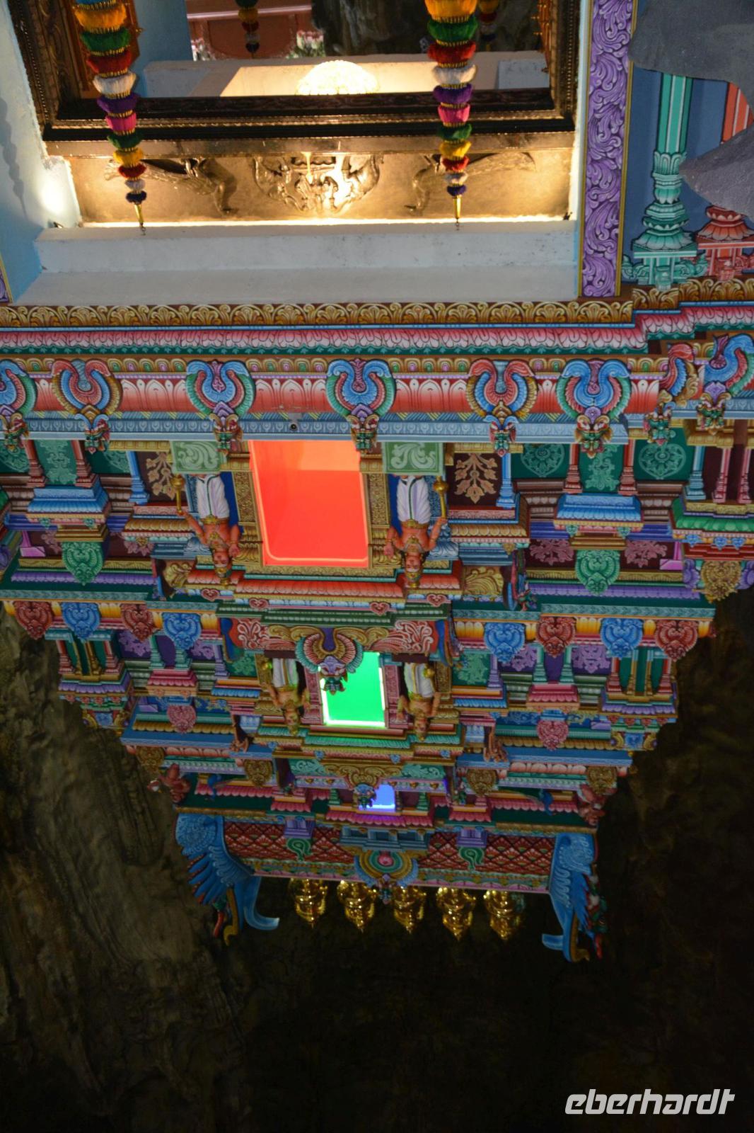 Danach ging es weiter in die 83. Etage mit Umsteigen in einen anderen Aufzug, der uns in die 86. Etage brachte. Von hier oben konnte man die Weite der Stadt sehen und mit Staunen und Erschrecken auch zwei Fensterputzer in luftiger Höhe beim Arbeiten beobachten. Danach fuhren wir wieder nach unten, durch die Shoppingmall zu den Wasseranlagen hinter den Türmen. Danach ging es mit dem Bus in Richtung Chinatown. Im Central Market aßen wir zu Mittag und verbrachten dann noch ein wenig Zeit in der Markthalle gefüllt mit Souvenirläden und anderen Geschäften. Am Nachmittag wartete erneut ein Höhepunkt auf uns: der Besuch der ein wenig außerhalb der Stadt gelegenen Batu Höhlen. Der heilige Ort des Hinduismus empfängt seine Besucher schon mit der 42 Meter großen goldenen Statue des Gottes Murugan. Trotz Hitze meisterten wir die 272 bunten Stufen nach oben, um die Höhlentempel zu besichtigen. Anschließend mussten wir die insgesamt 377 Stufen vorbei an Affen, die hin und wieder den Weg kreuzten, nach unten zu steigen. Zum Abschluss besuchten wir noch die Zinnfabrik Royal Selangor. Der verbleibende Nachmittag wurde dann nach eigenen Wünschen gestaltet, ehe wir am Abend aufbrachen, um am Stadtrand, wo der Dschungel beginnt, in ein nettes Restaurant einzukehren. Hier genossen wir ein asiatisches 5 Gänge Menü und machten uns am späten Abend wieder auf den Heimweg.