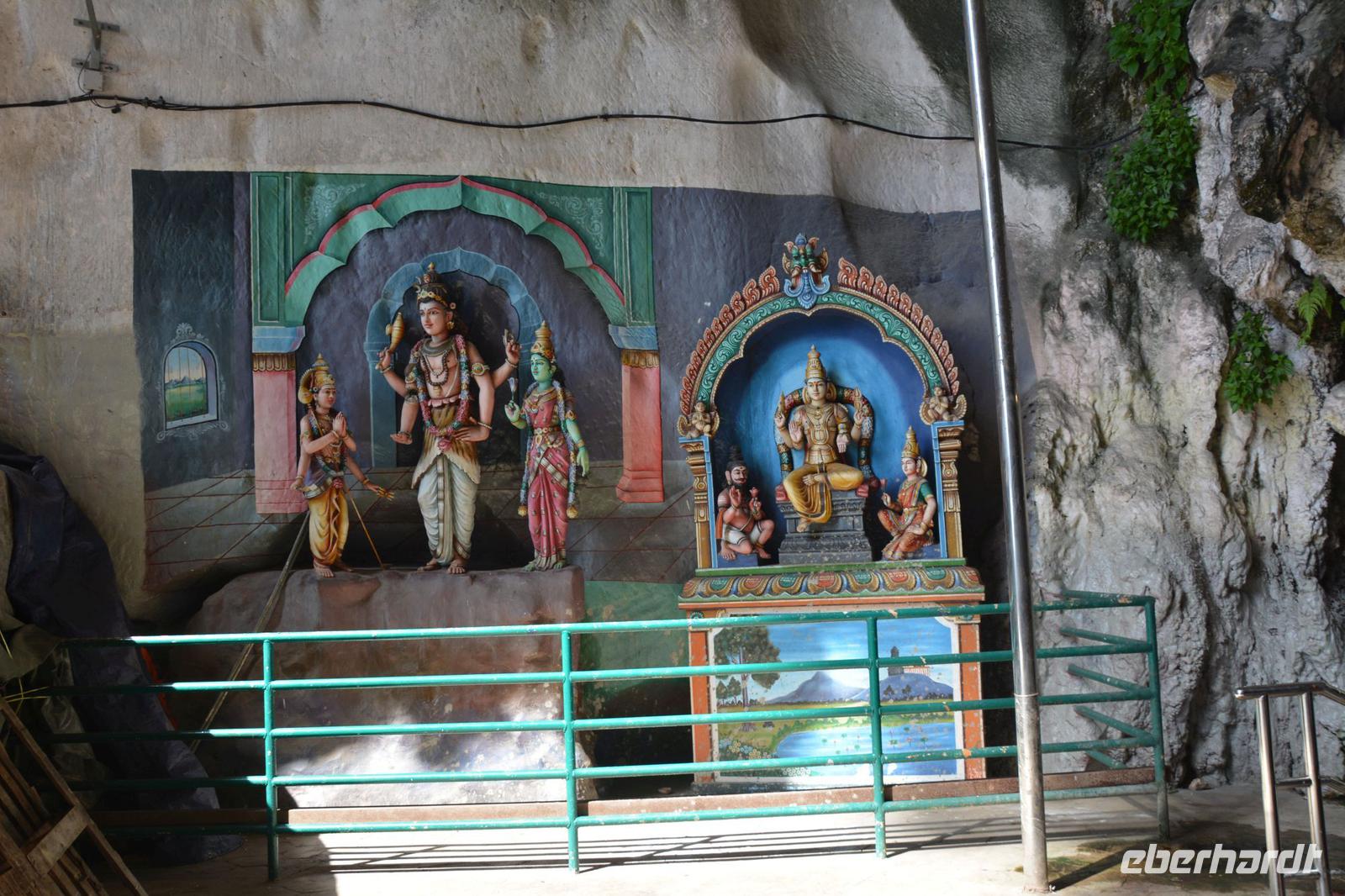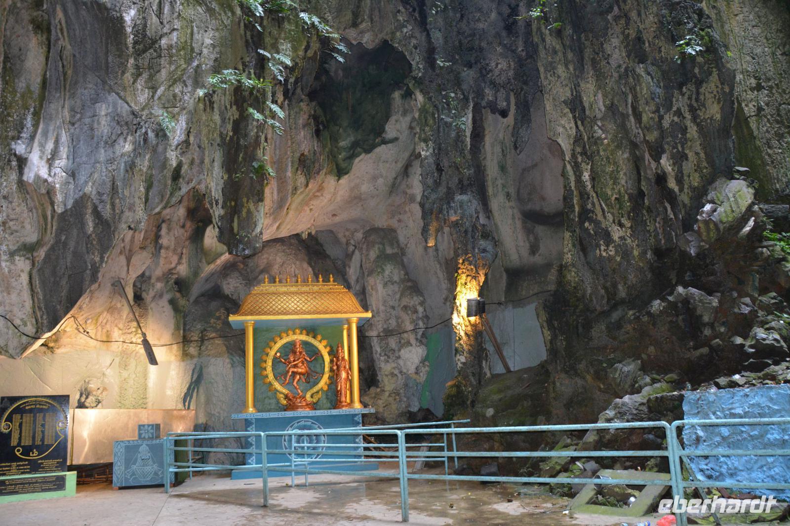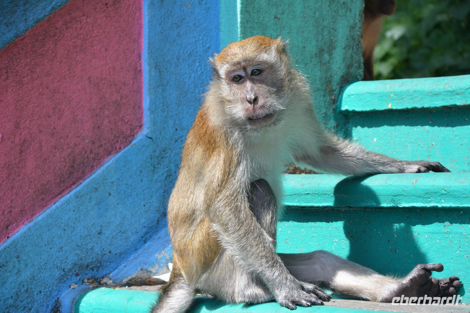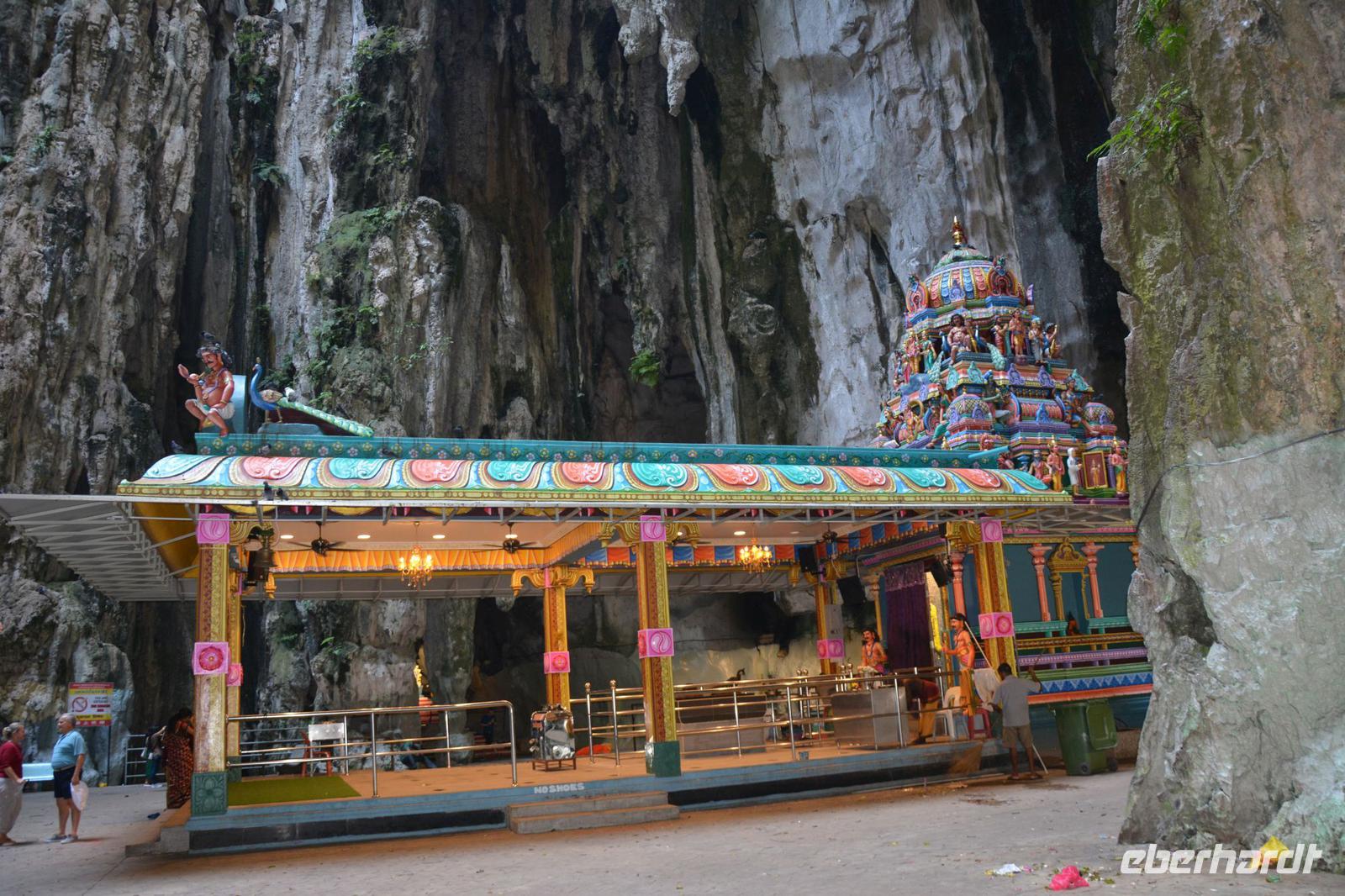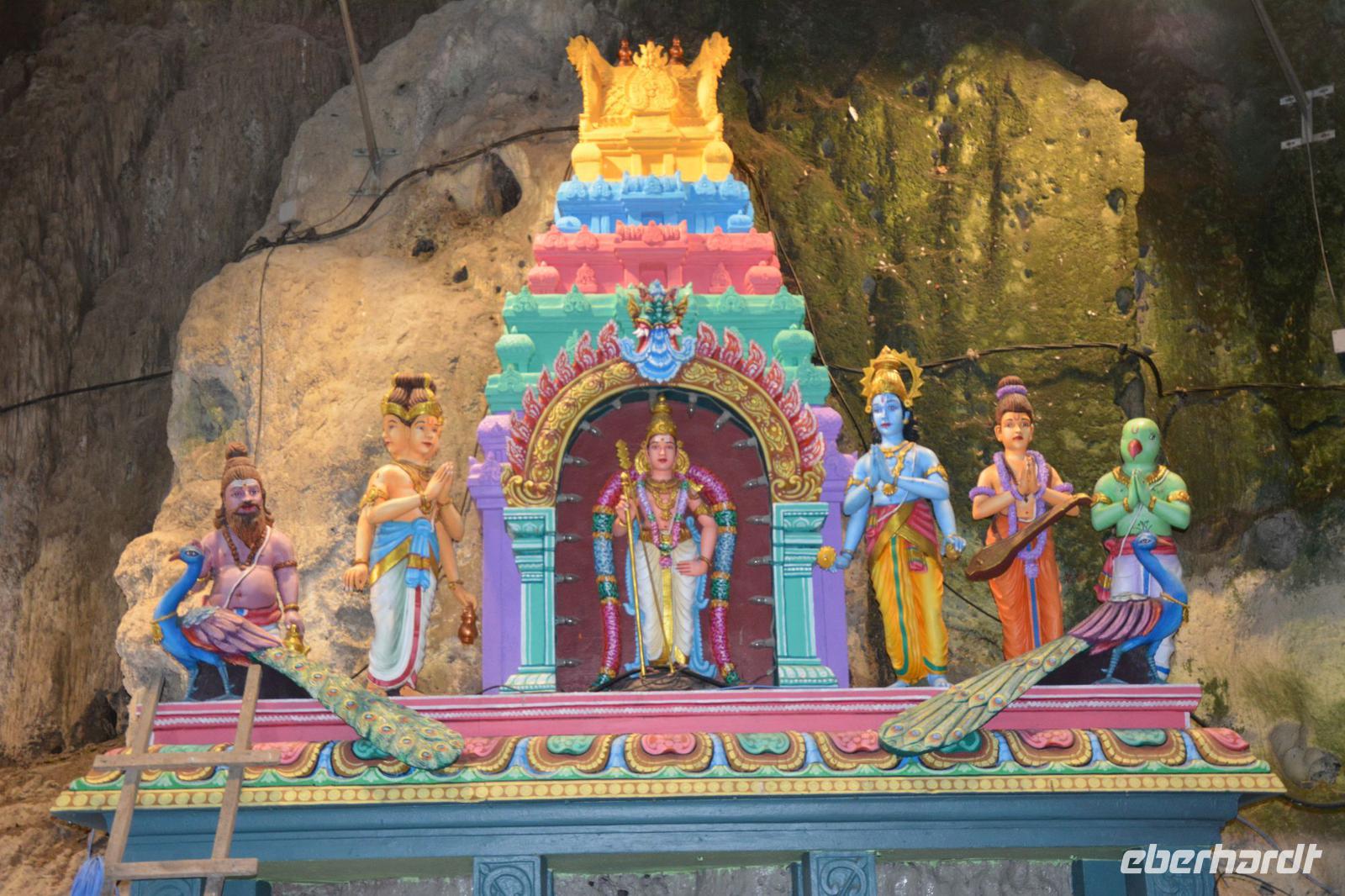 Danach ging es weiter in die 83. Etage mit Umsteigen in einen anderen Aufzug, der uns in die 86. Etage brachte. Von hier oben konnte man die Weite der Stadt sehen und mit Staunen und Erschrecken auch zwei Fensterputzer in luftiger Höhe beim Arbeiten beobachten. Danach fuhren wir wieder nach unten, durch die Shoppingmall zu den Wasseranlagen hinter den Türmen. Danach ging es mit dem Bus in Richtung Chinatown. Im Central Market aßen wir zu Mittag und verbrachten dann noch ein wenig Zeit in der Markthalle gefüllt mit Souvenirläden und anderen Geschäften. Am Nachmittag wartete erneut ein Höhepunkt auf uns: der Besuch der ein wenig außerhalb der Stadt gelegenen Batu Höhlen. Der heilige Ort des Hinduismus empfängt seine Besucher schon mit der 42 Meter großen goldenen Statue des Gottes Murugan. Trotz Hitze meisterten wir die 272 bunten Stufen nach oben, um die Höhlentempel zu besichtigen. Anschließend mussten wir die insgesamt 377 Stufen vorbei an Affen, die hin und wieder den Weg kreuzten, nach unten zu steigen. Zum Abschluss besuchten wir noch die Zinnfabrik Royal Selangor. Der verbleibende Nachmittag wurde dann nach eigenen Wünschen gestaltet, ehe wir am Abend aufbrachen, um am Stadtrand, wo der Dschungel beginnt, in ein nettes Restaurant einzukehren. Hier genossen wir ein asiatisches 5 Gänge Menü und machten uns am späten Abend wieder auf den Heimweg.