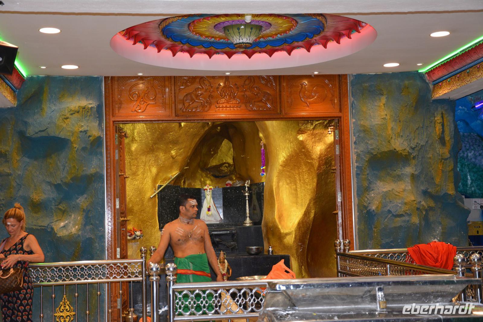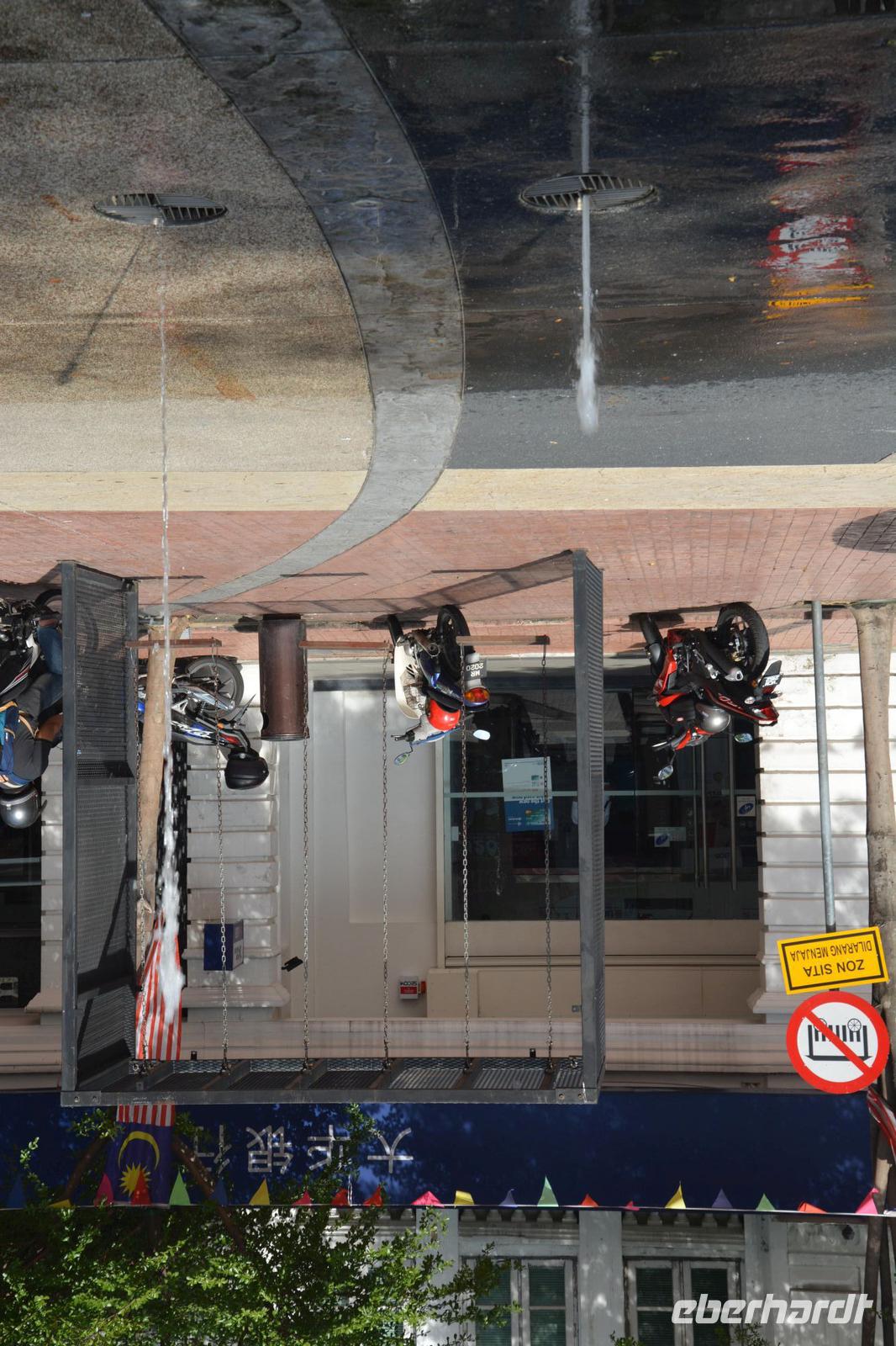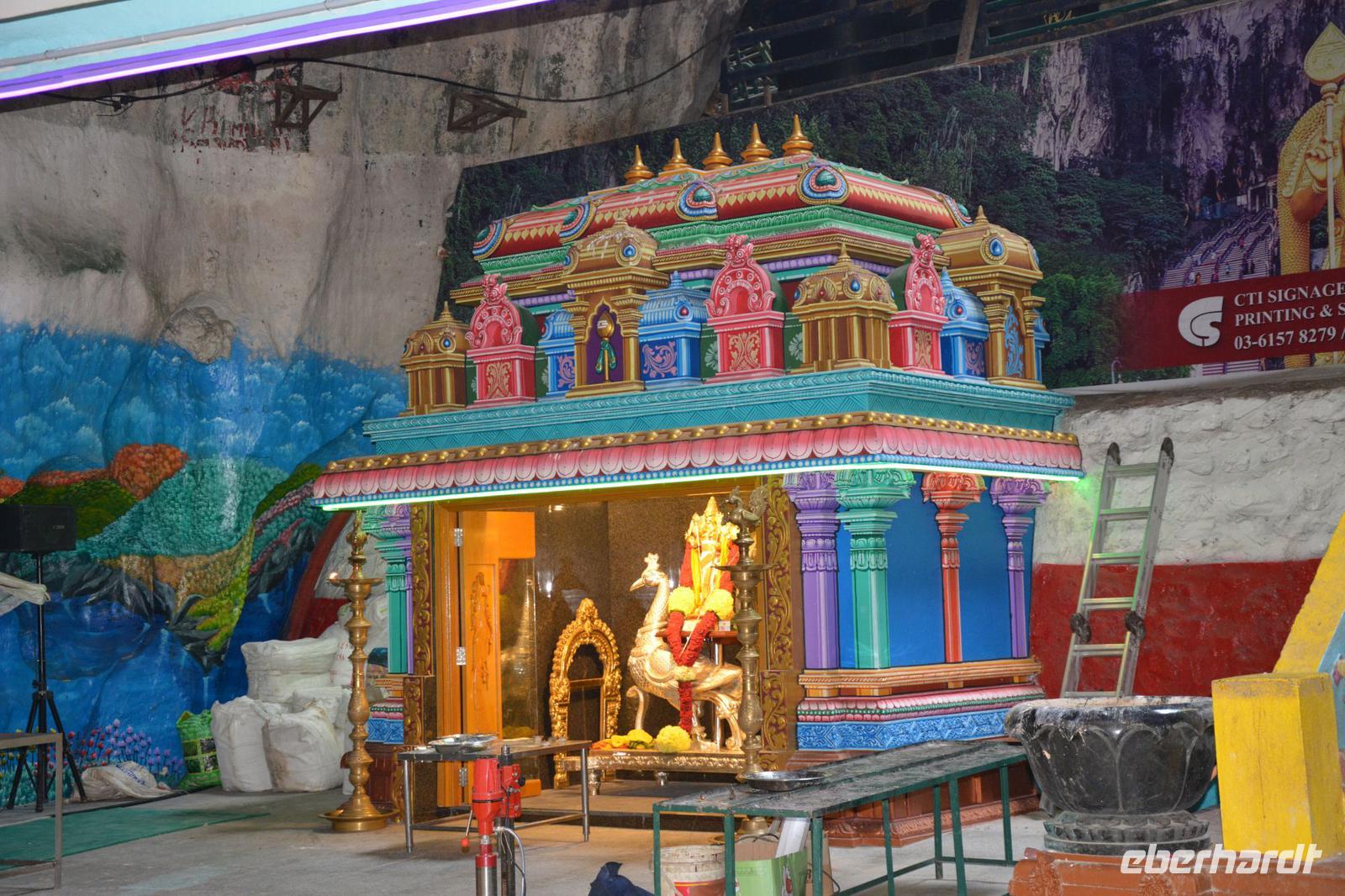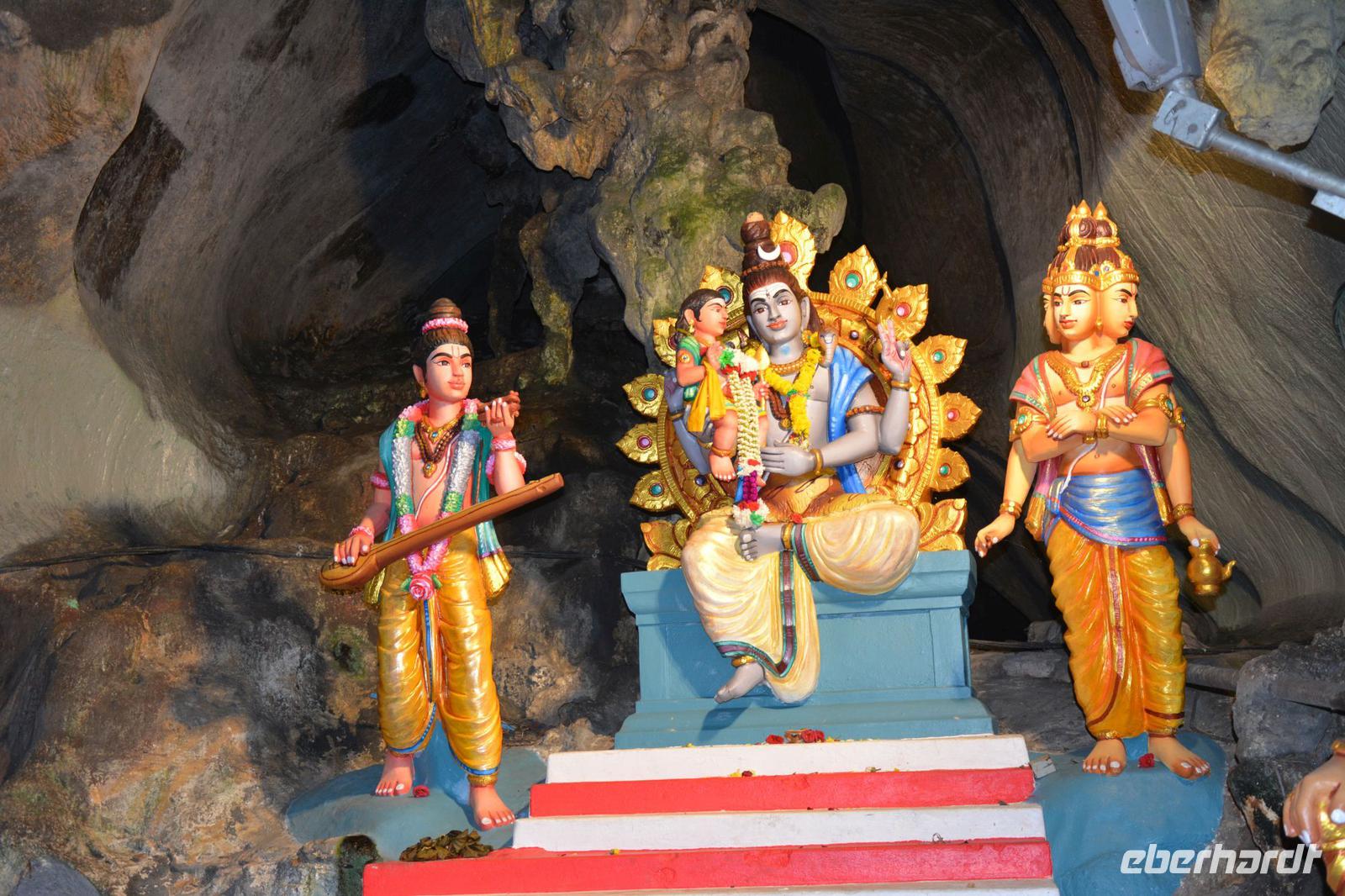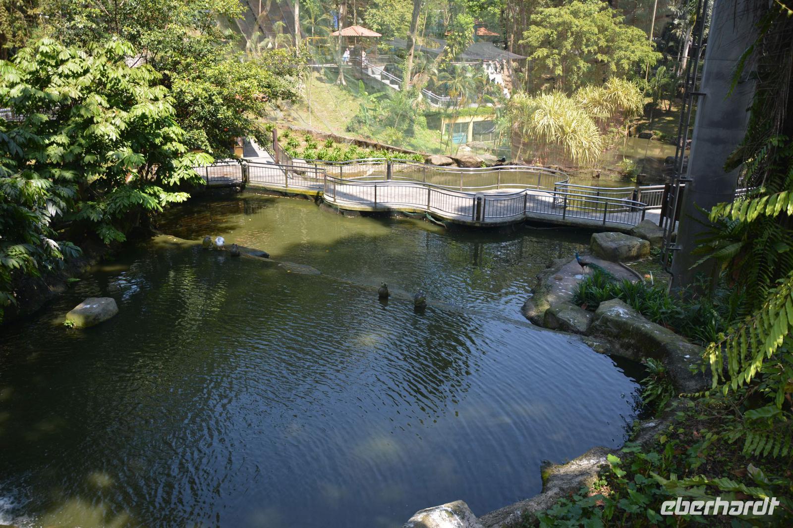 Danach ging es weiter in die 83. Etage mit Umsteigen in einen anderen Aufzug, der uns in die 86. Etage brachte. Von hier oben konnte man die Weite der Stadt sehen und mit Staunen und Erschrecken auch zwei Fensterputzer in luftiger Höhe beim Arbeiten beobachten. Danach fuhren wir wieder nach unten, durch die Shoppingmall zu den Wasseranlagen hinter den Türmen. Danach ging es mit dem Bus in Richtung Chinatown. Im Central Market aßen wir zu Mittag und verbrachten dann noch ein wenig Zeit in der Markthalle gefüllt mit Souvenirläden und anderen Geschäften. Am Nachmittag wartete erneut ein Höhepunkt auf uns: der Besuch der ein wenig außerhalb der Stadt gelegenen Batu Höhlen. Der heilige Ort des Hinduismus empfängt seine Besucher schon mit der 42 Meter großen goldenen Statue des Gottes Murugan. Trotz Hitze meisterten wir die 272 bunten Stufen nach oben, um die Höhlentempel zu besichtigen. Anschließend mussten wir die insgesamt 377 Stufen vorbei an Affen, die hin und wieder den Weg kreuzten, nach unten zu steigen. Zum Abschluss besuchten wir noch die Zinnfabrik Royal Selangor. Der verbleibende Nachmittag wurde dann nach eigenen Wünschen gestaltet, ehe wir am Abend aufbrachen, um am Stadtrand, wo der Dschungel beginnt, in ein nettes Restaurant einzukehren. Hier genossen wir ein asiatisches 5 Gänge Menü und machten uns am späten Abend wieder auf den Heimweg.