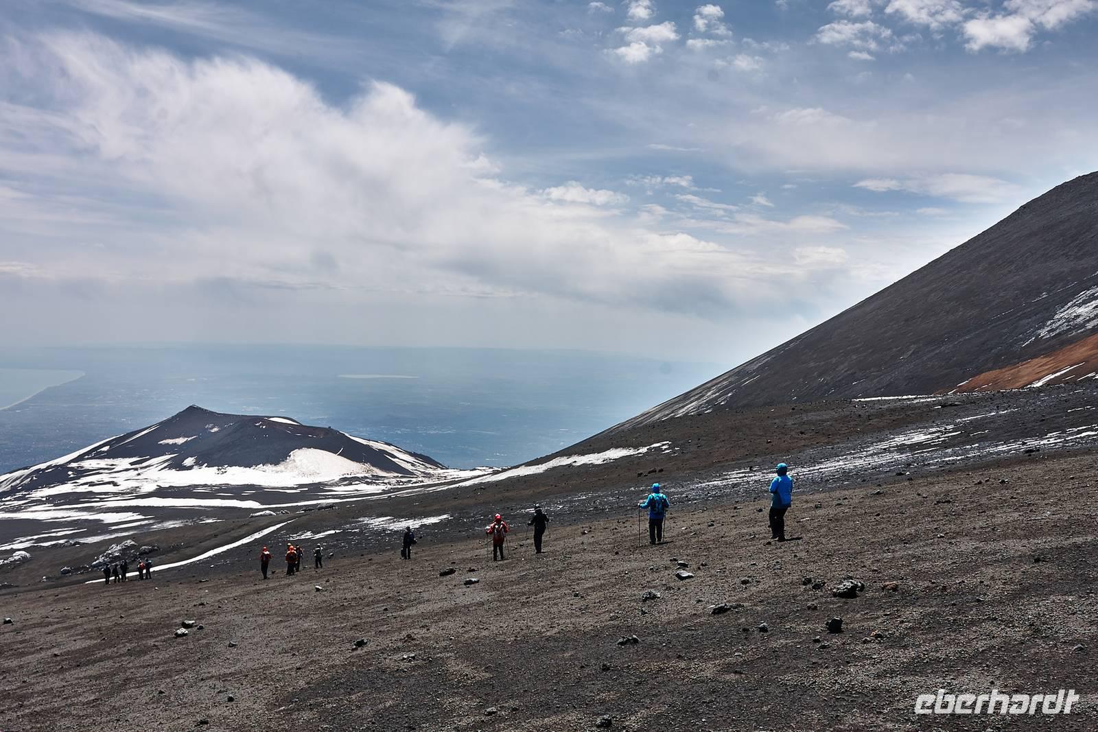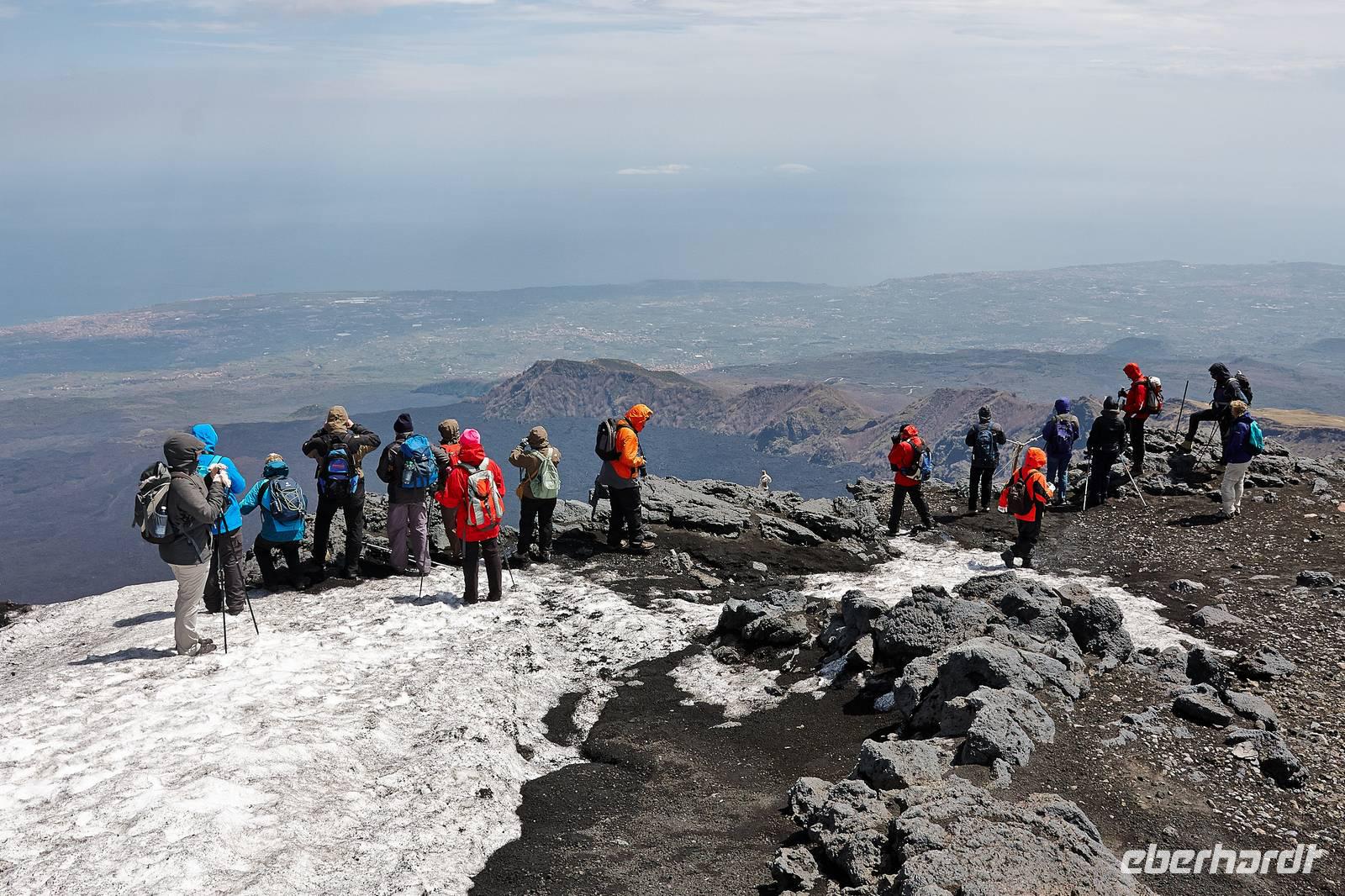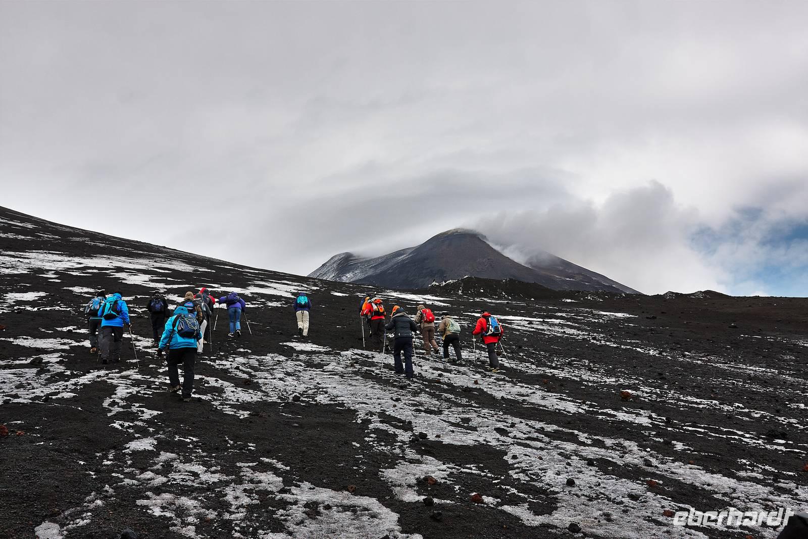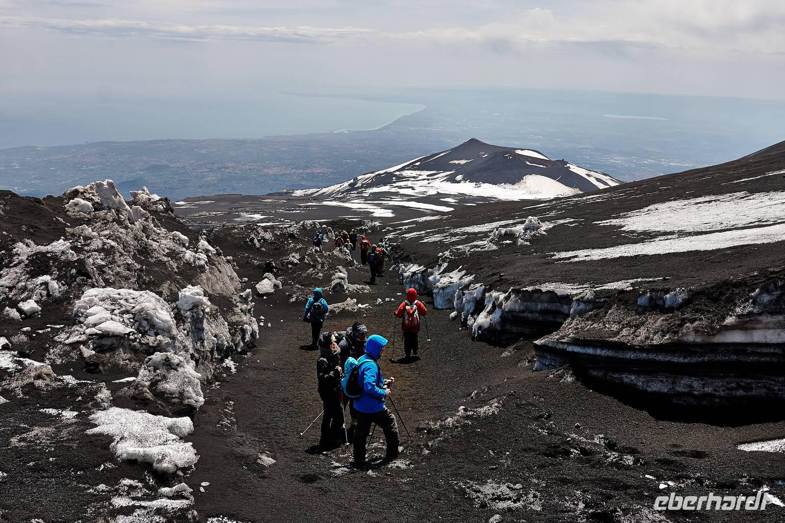 Ab 7.30 Uhr stand heute für uns das Frühstück in unserem separaten Frühstücksraum zur Verfügung. Die gesamte Wandergruppe und unser Wanderführer Jochen stärkten sich an dem leckeren Buffet und freuten sich auf einen spannenden Tag. 9.00 Uhr fuhren wir mit dem Bus zur Talstation des Ätna, wo es leider zu windig war, um mit der Drahtseilbahn nach oben zu fahren. Dafür standen Allradjeeps bereit, die uns auf ca. 2.500 m Höhe brachten. Danach ging es mit unserem Wanderführer Jochen und dem Vulkanologen Guiseppe zu Fuß weiter auf den Krater, der bei der Eruption 2002 entstanden ist und damit auf knapp 3.000 Höhenmeter. Von dort oben aus hatten wir eine wunderschöne Aussicht über die sizilianische Insel. Der Wind blies uns heftig um die Ohren, dafür schien aber die Sonne dazu. Unser Abstieg führte uns vorbei am Belvedere, wo wir einen schönen Ausblick über das Tal der Ochsen hatten. Weiter ging es vorbei am Cisternazza und dem M.te Escrivà über steile Abhänge und bester Aussicht zurück zur Talstation. Anschließend fuhren wir über die Serpentinenstraße zurück zum Hotel, wo wir noch etwas Freizeit genießen konnten. Danach gab es wieder ein leckeres Abendessen-Menü mit Fisch.