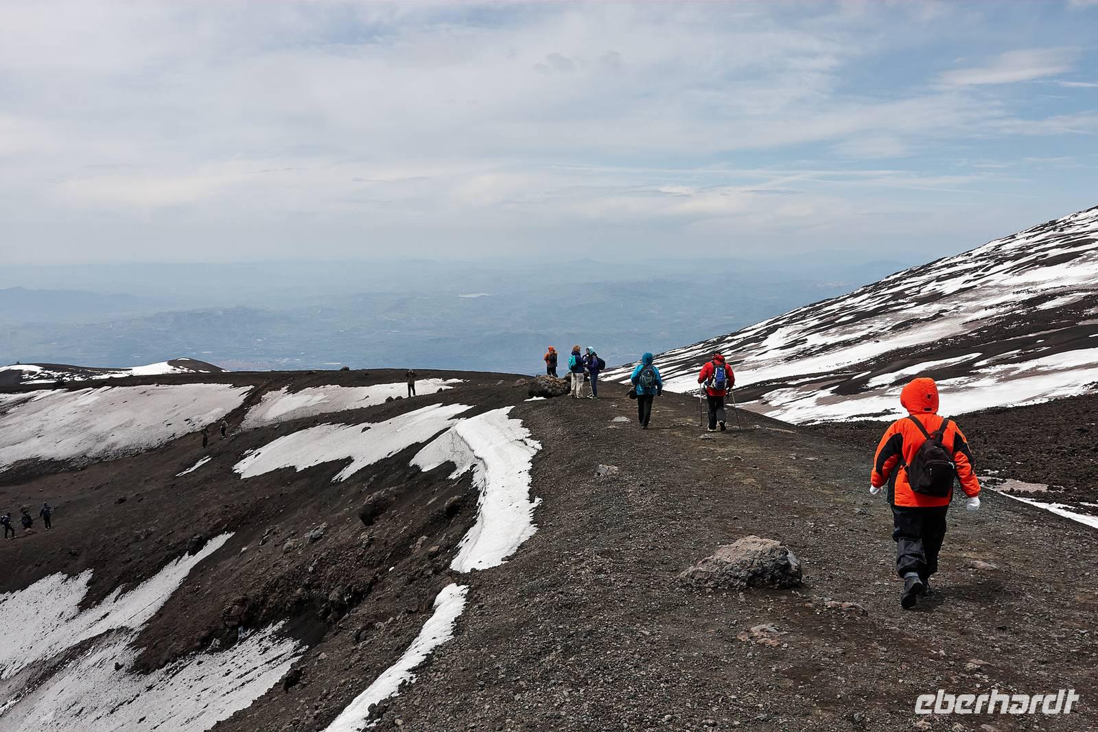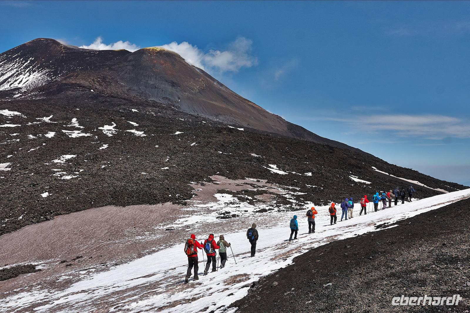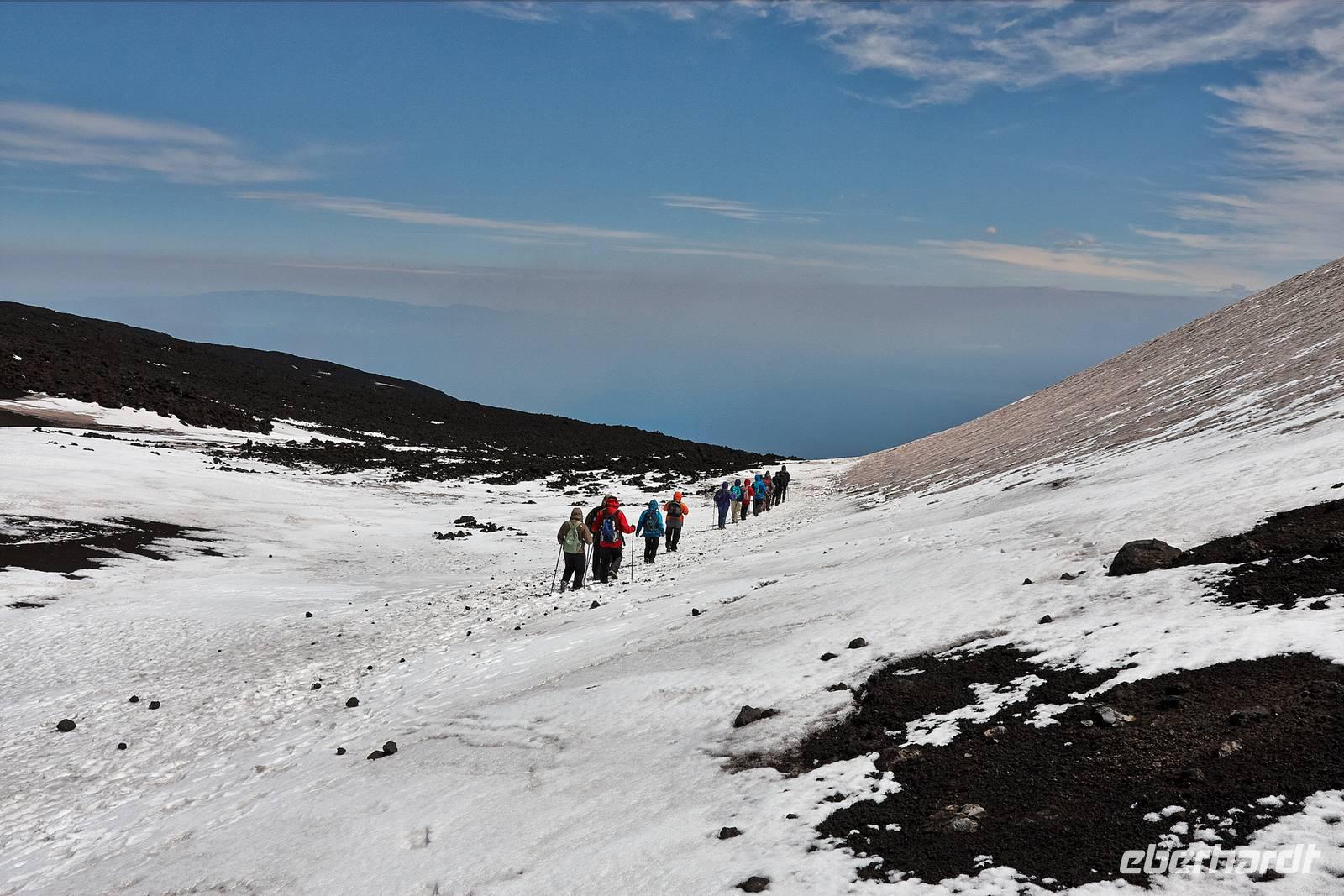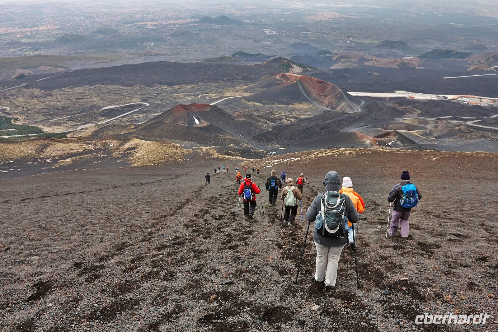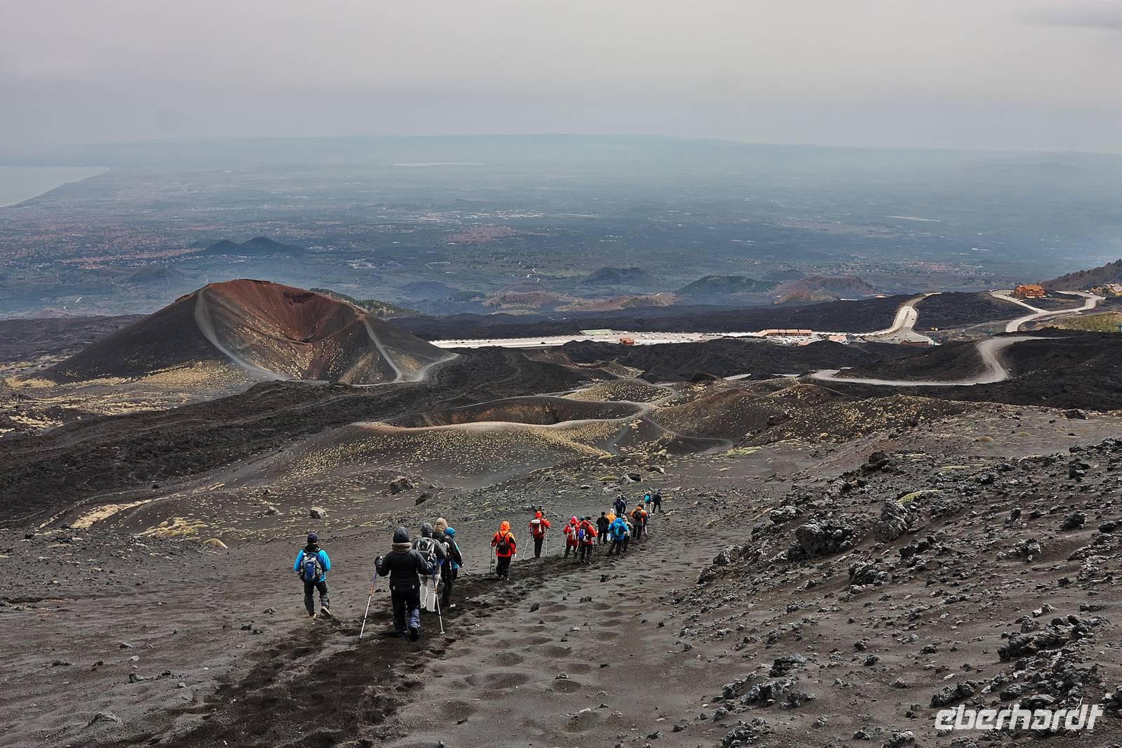 Ab 7.30 Uhr stand heute für uns das Frühstück in unserem separaten Frühstücksraum zur Verfügung. Die gesamte Wandergruppe und unser Wanderführer Jochen stärkten sich an dem leckeren Buffet und freuten sich auf einen spannenden Tag. 9.00 Uhr fuhren wir mit dem Bus zur Talstation des Ätna, wo es leider zu windig war, um mit der Drahtseilbahn nach oben zu fahren. Dafür standen Allradjeeps bereit, die uns auf ca. 2.500 m Höhe brachten. Danach ging es mit unserem Wanderführer Jochen und dem Vulkanologen Guiseppe zu Fuß weiter auf den Krater, der bei der Eruption 2002 entstanden ist und damit auf knapp 3.000 Höhenmeter. Von dort oben aus hatten wir eine wunderschöne Aussicht über die sizilianische Insel. Der Wind blies uns heftig um die Ohren, dafür schien aber die Sonne dazu. Unser Abstieg führte uns vorbei am Belvedere, wo wir einen schönen Ausblick über das Tal der Ochsen hatten. Weiter ging es vorbei am Cisternazza und dem M.te Escrivà über steile Abhänge und bester Aussicht zurück zur Talstation. Anschließend fuhren wir über die Serpentinenstraße zurück zum Hotel, wo wir noch etwas Freizeit genießen konnten. Danach gab es wieder ein leckeres Abendessen-Menü mit Fisch.