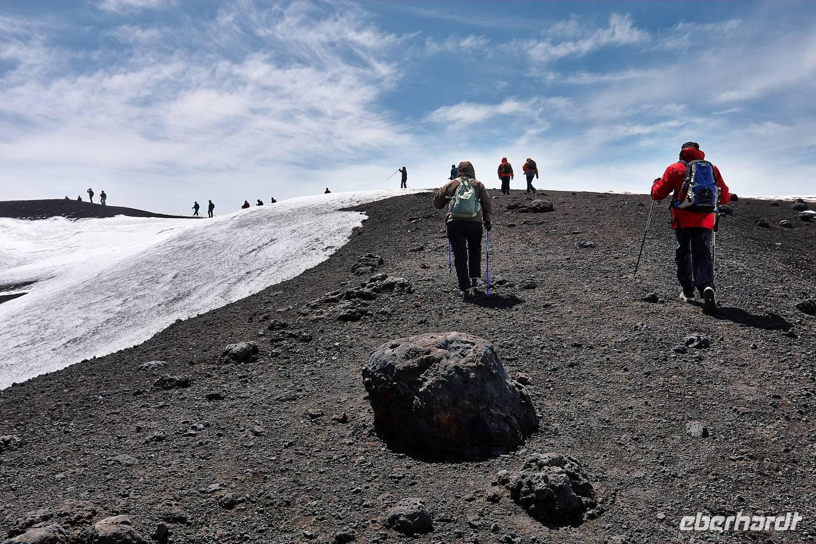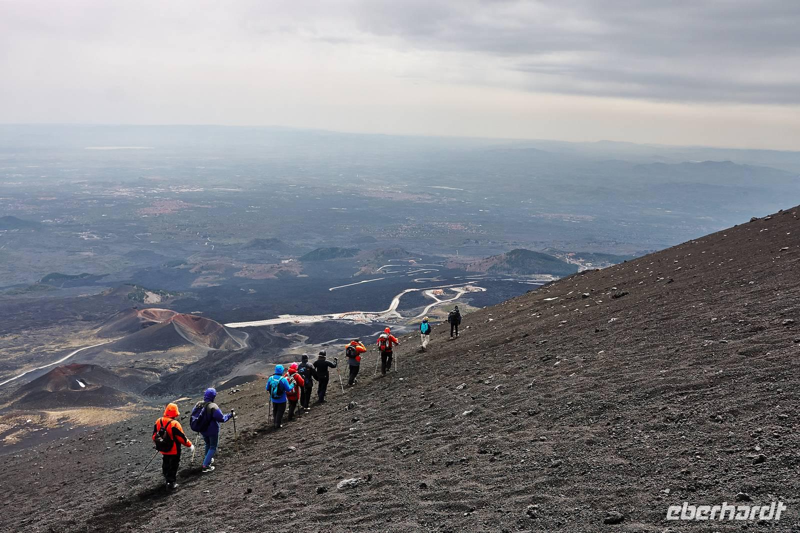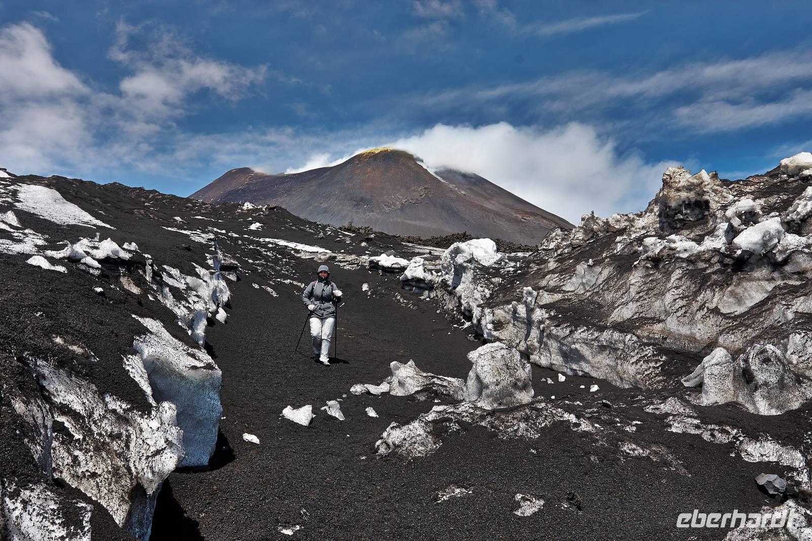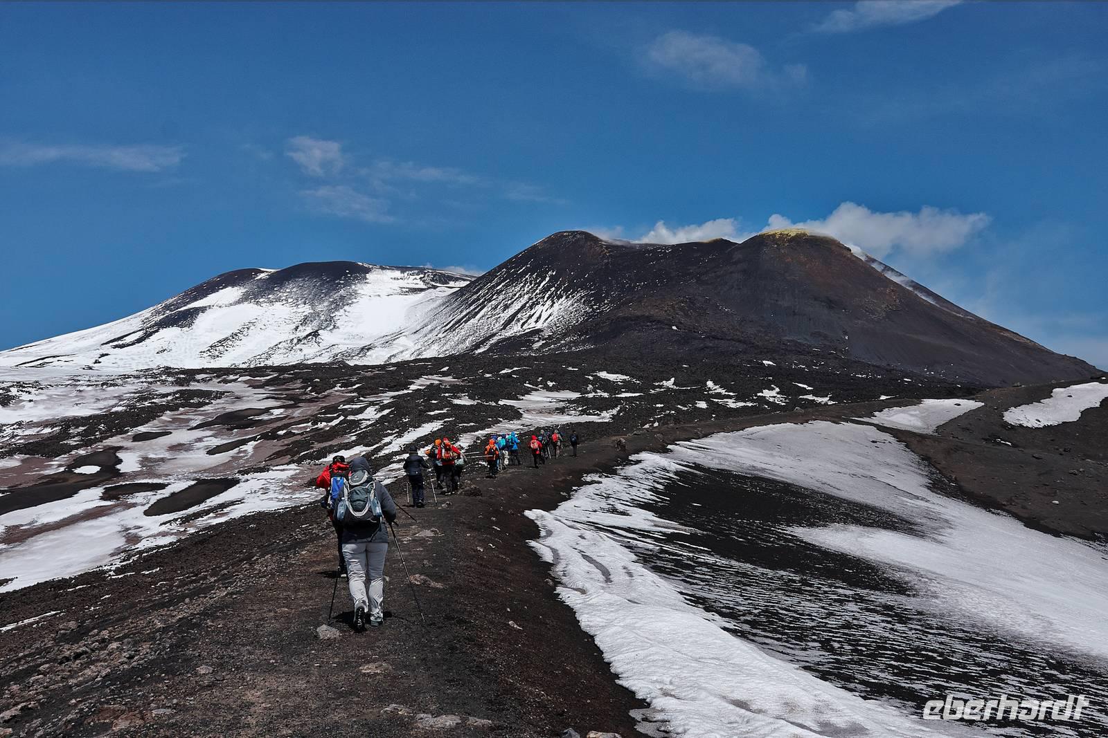 Ab 7.30 Uhr stand heute für uns das Frühstück in unserem separaten Frühstücksraum zur Verfügung. Die gesamte Wandergruppe und unser Wanderführer Jochen stärkten sich an dem leckeren Buffet und freuten sich auf einen spannenden Tag. 9.00 Uhr fuhren wir mit dem Bus zur Talstation des Ätna, wo es leider zu windig war, um mit der Drahtseilbahn nach oben zu fahren. Dafür standen Allradjeeps bereit, die uns auf ca. 2.500 m Höhe brachten. Danach ging es mit unserem Wanderführer Jochen und dem Vulkanologen Guiseppe zu Fuß weiter auf den Krater, der bei der Eruption 2002 entstanden ist und damit auf knapp 3.000 Höhenmeter. Von dort oben aus hatten wir eine wunderschöne Aussicht über die sizilianische Insel. Der Wind blies uns heftig um die Ohren, dafür schien aber die Sonne dazu. Unser Abstieg führte uns vorbei am Belvedere, wo wir einen schönen Ausblick über das Tal der Ochsen hatten. Weiter ging es vorbei am Cisternazza und dem M.te Escrivà über steile Abhänge und bester Aussicht zurück zur Talstation. Anschließend fuhren wir über die Serpentinenstraße zurück zum Hotel, wo wir noch etwas Freizeit genießen konnten. Danach gab es wieder ein leckeres Abendessen-Menü mit Fisch.