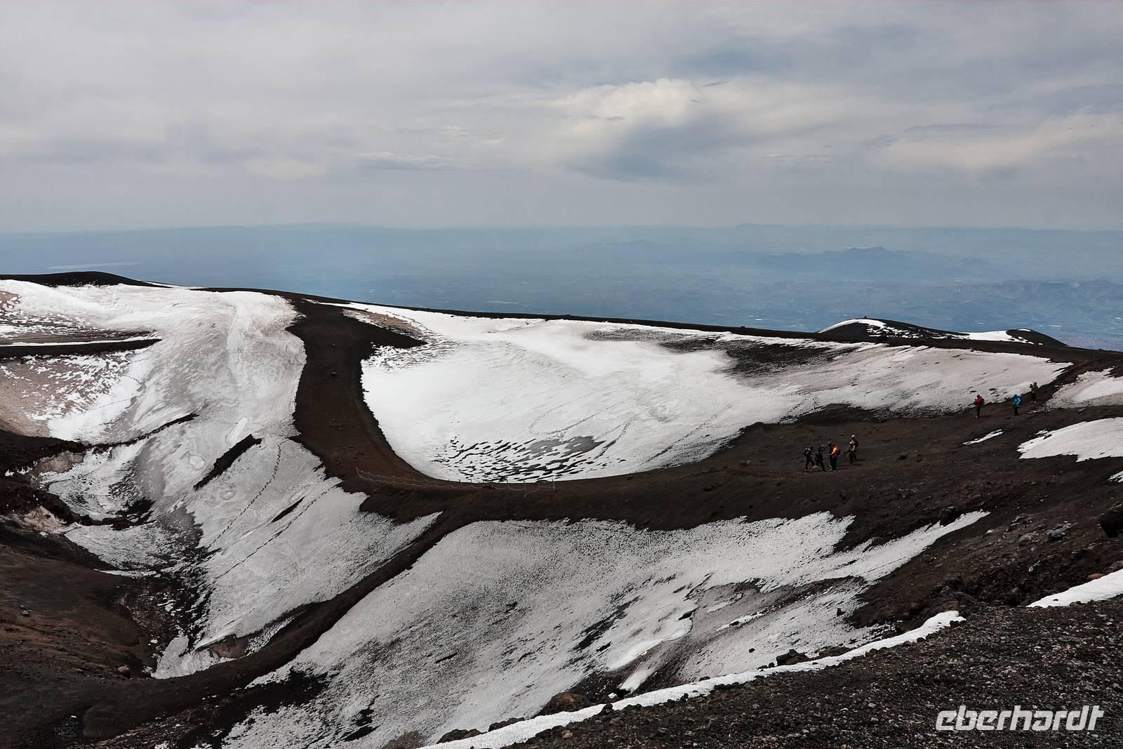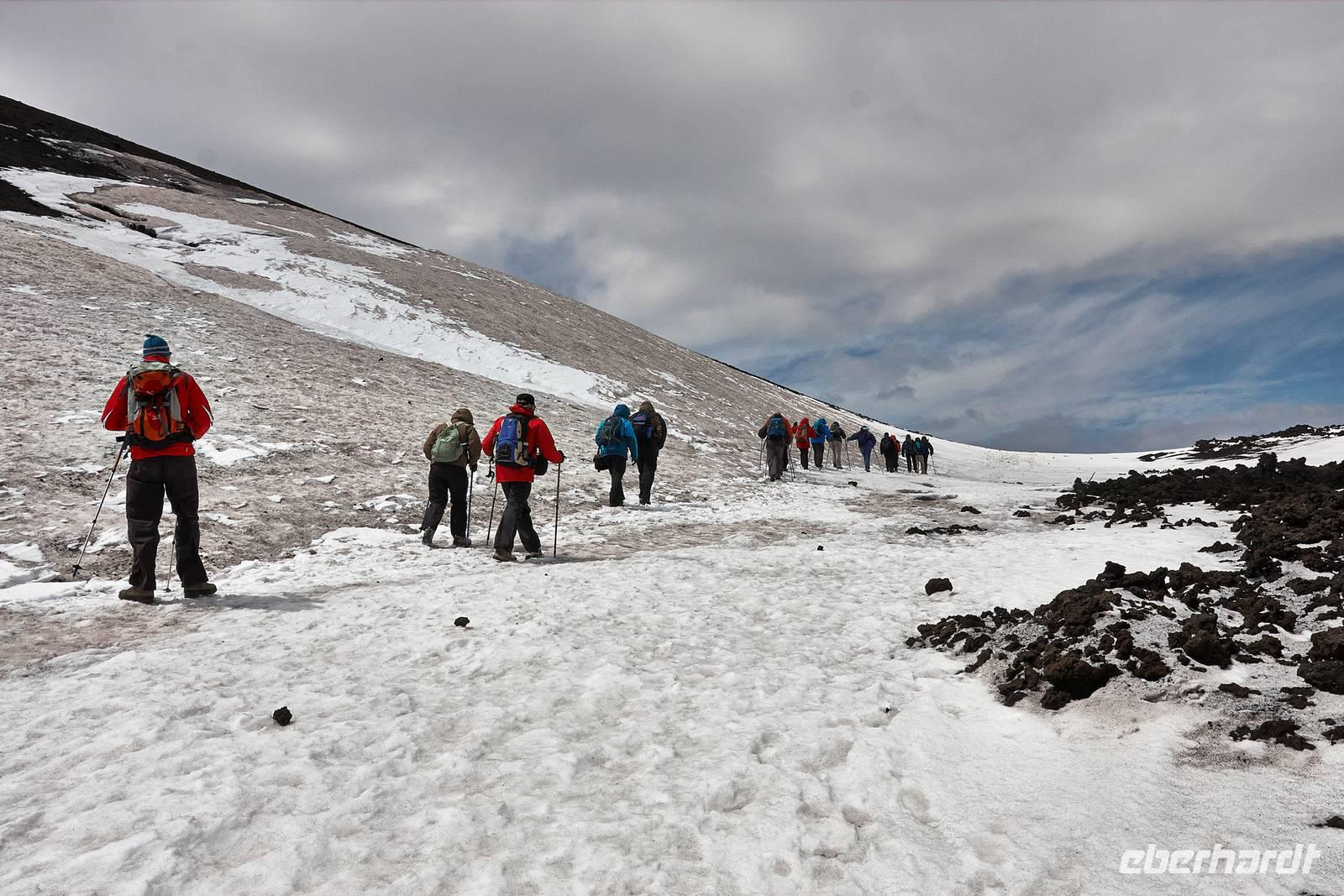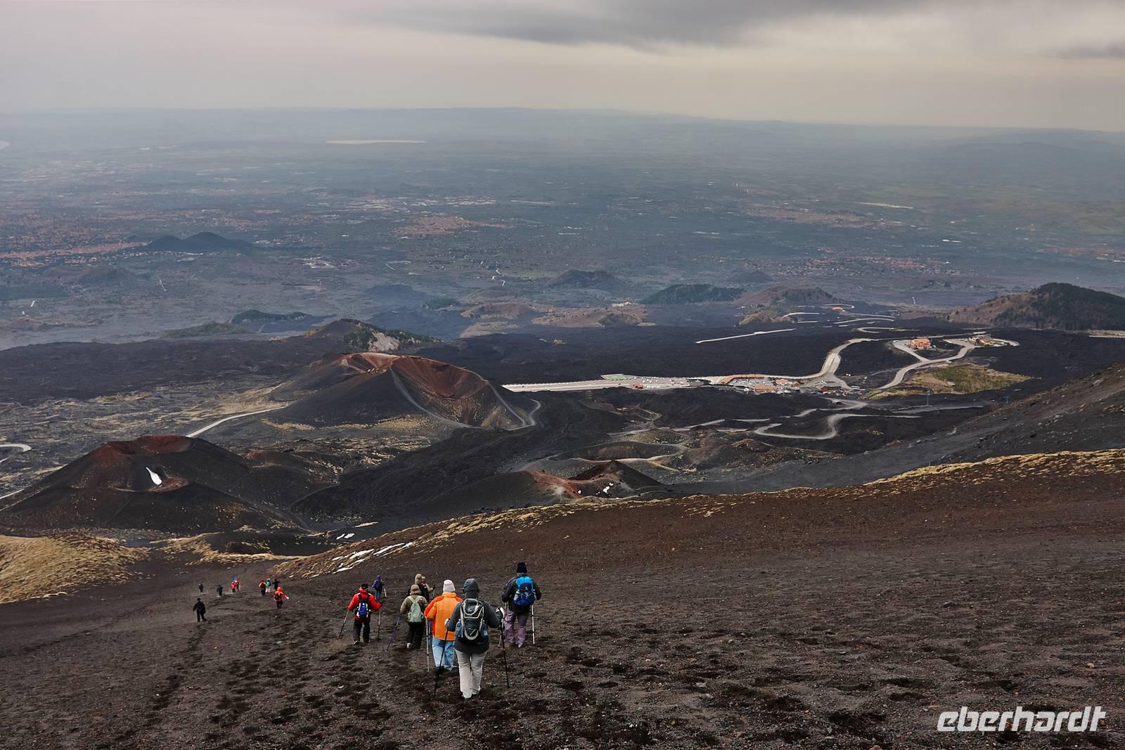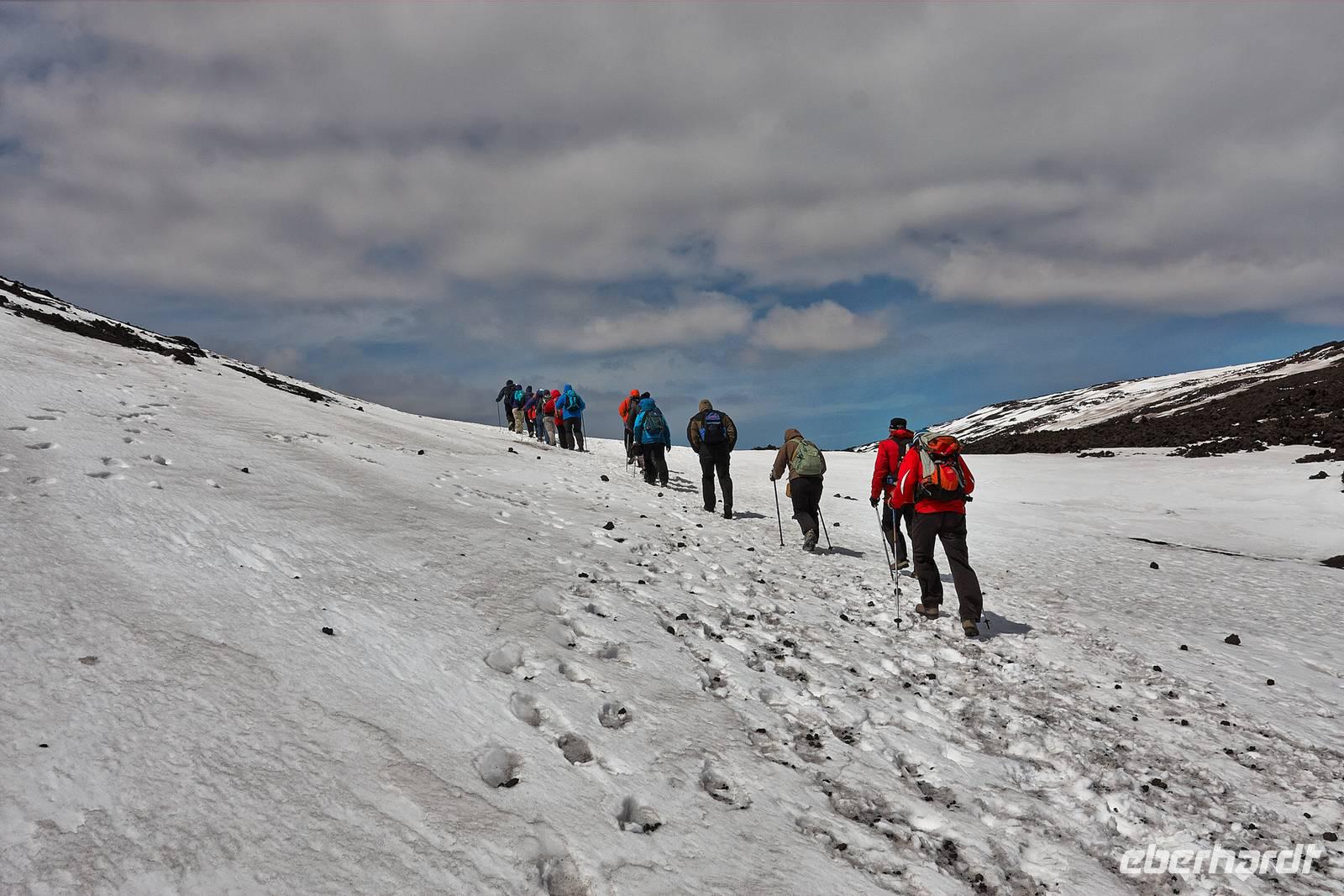 Ab 7.30 Uhr stand heute für uns das Frühstück in unserem separaten Frühstücksraum zur Verfügung. Die gesamte Wandergruppe und unser Wanderführer Jochen stärkten sich an dem leckeren Buffet und freuten sich auf einen spannenden Tag. 9.00 Uhr fuhren wir mit dem Bus zur Talstation des Ätna, wo es leider zu windig war, um mit der Drahtseilbahn nach oben zu fahren. Dafür standen Allradjeeps bereit, die uns auf ca. 2.500 m Höhe brachten. Danach ging es mit unserem Wanderführer Jochen und dem Vulkanologen Guiseppe zu Fuß weiter auf den Krater, der bei der Eruption 2002 entstanden ist und damit auf knapp 3.000 Höhenmeter. Von dort oben aus hatten wir eine wunderschöne Aussicht über die sizilianische Insel. Der Wind blies uns heftig um die Ohren, dafür schien aber die Sonne dazu. Unser Abstieg führte uns vorbei am Belvedere, wo wir einen schönen Ausblick über das Tal der Ochsen hatten. Weiter ging es vorbei am Cisternazza und dem M.te Escrivà über steile Abhänge und bester Aussicht zurück zur Talstation. Anschließend fuhren wir über die Serpentinenstraße zurück zum Hotel, wo wir noch etwas Freizeit genießen konnten. Danach gab es wieder ein leckeres Abendessen-Menü mit Fisch.