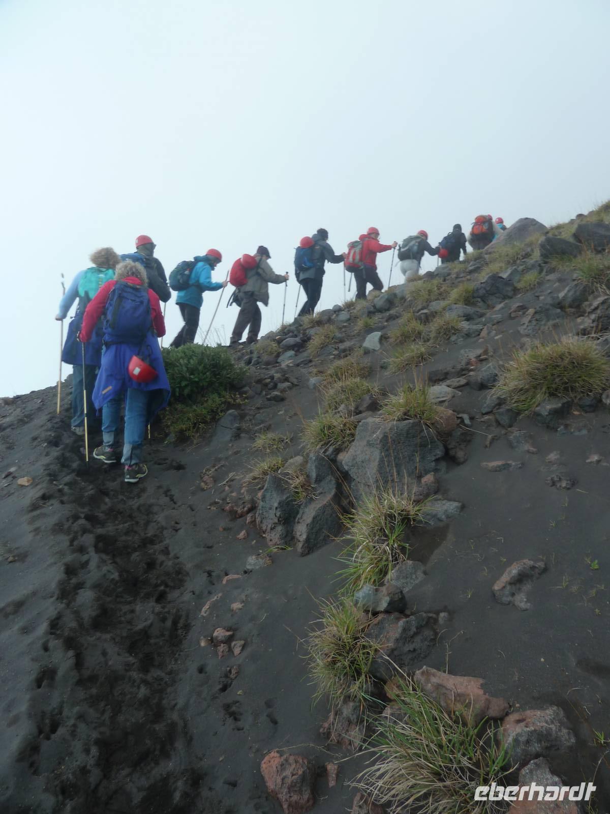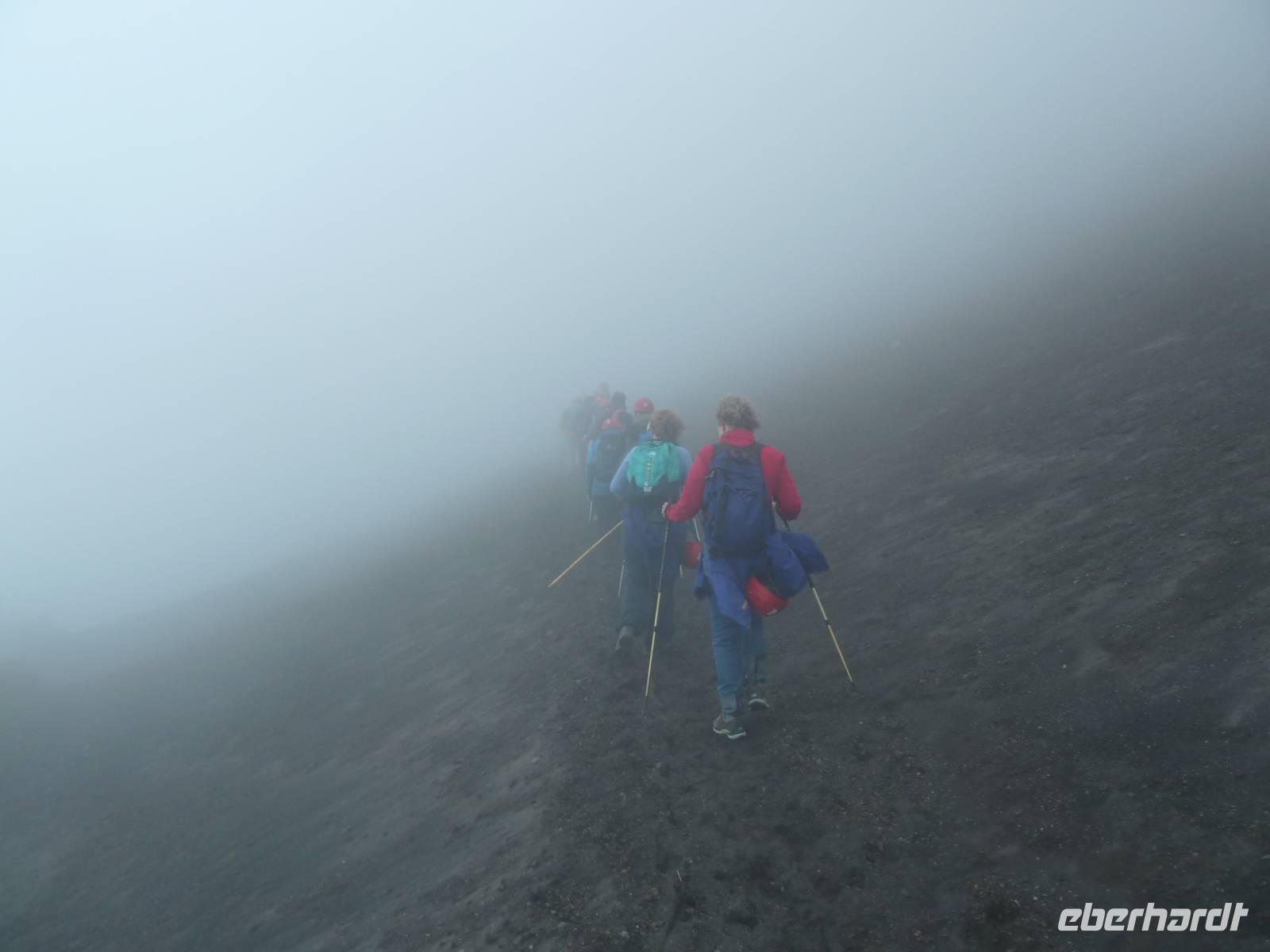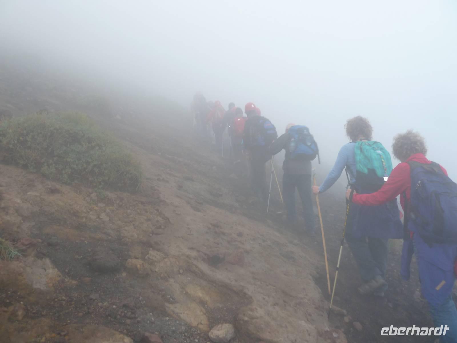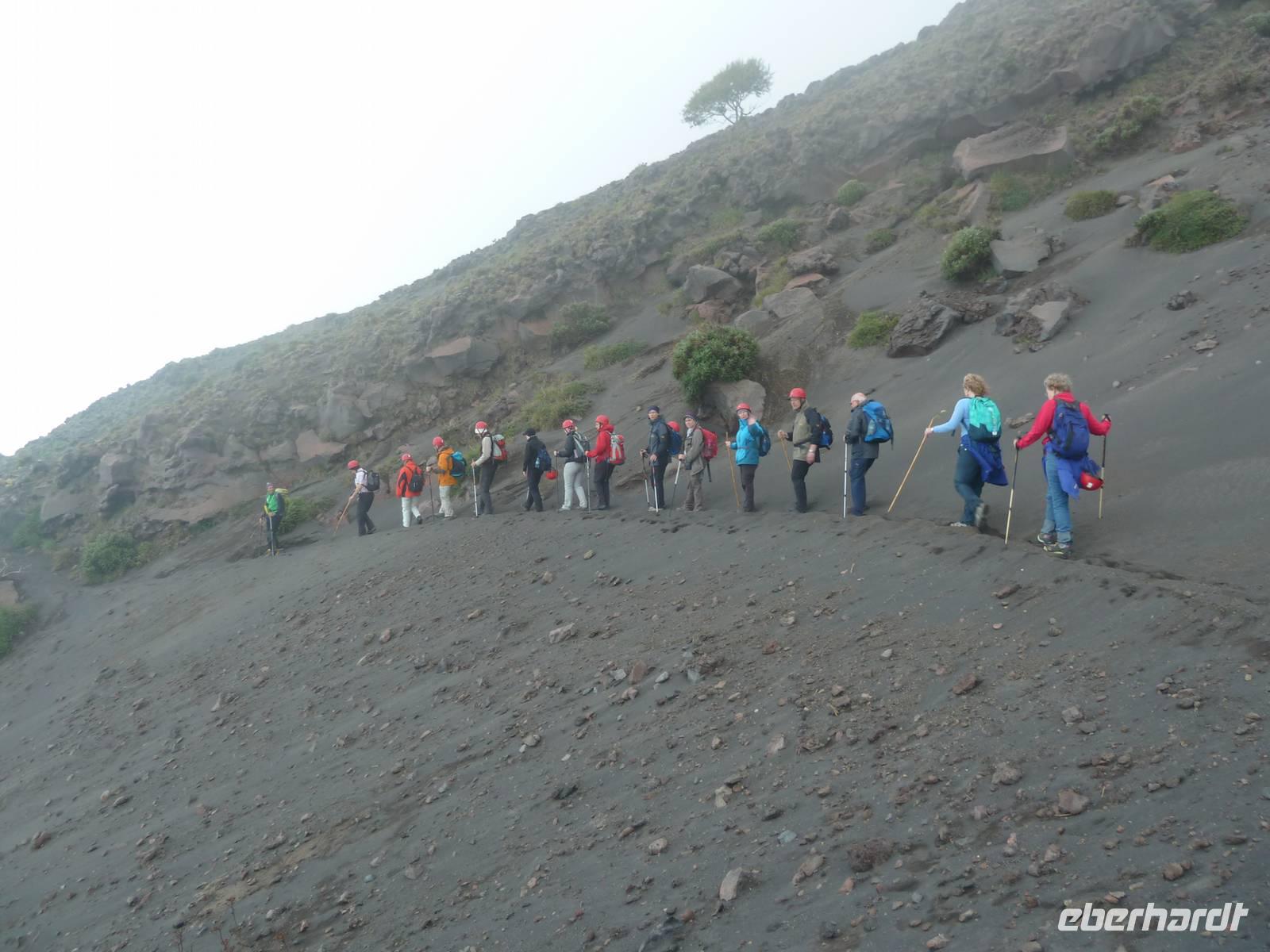 Nach der ersten spannenden Nachtwanderung über Stromboli konnten wir wieder ausschlafen und in aller Ruhe Frühstücken und die Insel genießen. Nach einem gemeinsamen Mittagessen im Hotel wurden die letzten Kräfte gestärkt. Einige wanderten die Strecke des gestrigen Abends ab, andere spazierten über die Insel oder genossen die Sonne und ein Bad im Meer. Gegen 17.00 Uhr ging unsere Wanderung auf 900 Höhenmeter mit unserem Bergführer Angelo los. Am Büro der Bergführer wurden wir mit Helmen ausgerüstet, um uns vor kleinen Steinbrocken zu schützen. Mit sehr viel Ruhe und schönem gleichmäßig langsamen Schritt brachte er uns sicher auf den Gipfelkrater des Strombolis. Zunächst war das Wetter gut und die Sicht einwandfrei. Aber je näher wir zur Wolkengrenze kamen, umso schlechter wurde die Sicht. Wir sehnten alle den Aufbruch der Wolkendecke entgegen und erhofften uns eine super Sicht in den Krater und auf spektakuläre Fotos von dem spukenden Vulkan. Doch leider wurden wir enttäuscht und obwohl wir direkt am Krater standen, hörten wir nur das Knallen der Explosionen uns sahen leider nichts. Die Wolkendecke wurde immer schlimmer und es war sicherer, den Abstieg ins Tal zu beginnen. Unser Wanderführer war großartig und brachte uns schnell und sicher aus der Wolkendecke durchs Lavafeld wieder ins Tal. Die Lichter von Stromboli-Stadt kamen immer näher und belohnten unsere Anstrengungen des Aufstieges. Aus jeder Sicht war es eine sehr spektakuläre und einzigartige Wanderung durch die Kraft der Wolken. Drei Wanderfreunde der Gruppe hatten leider nicht die Kraft, die 900 Höhenmeter zu überwinden und sind mit Jochen einen anderen Wanderweg auf 400 Höhenmeter, zur Pizzeria und anschließend zurück zum Hotel gewandert. Für diese drei war es ebenfalls sehr interessant, da Jochen sehr viel über die Insel und den Vulkan erzählte. Zum Ausklang des Tages trafen sich einige der Wandergruppe in der Hotelbar und ließ die Wanderung noch einmal Revue passieren.