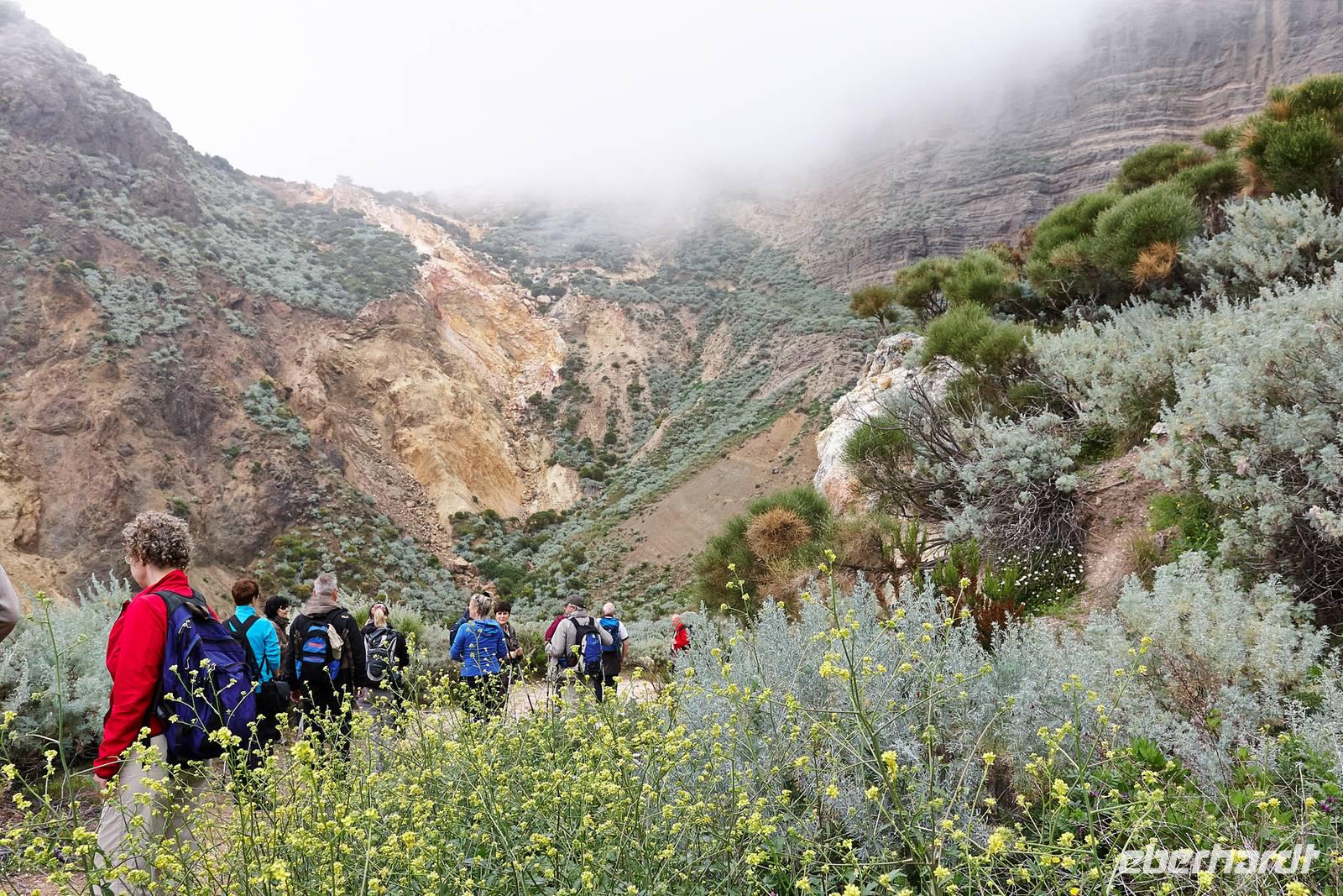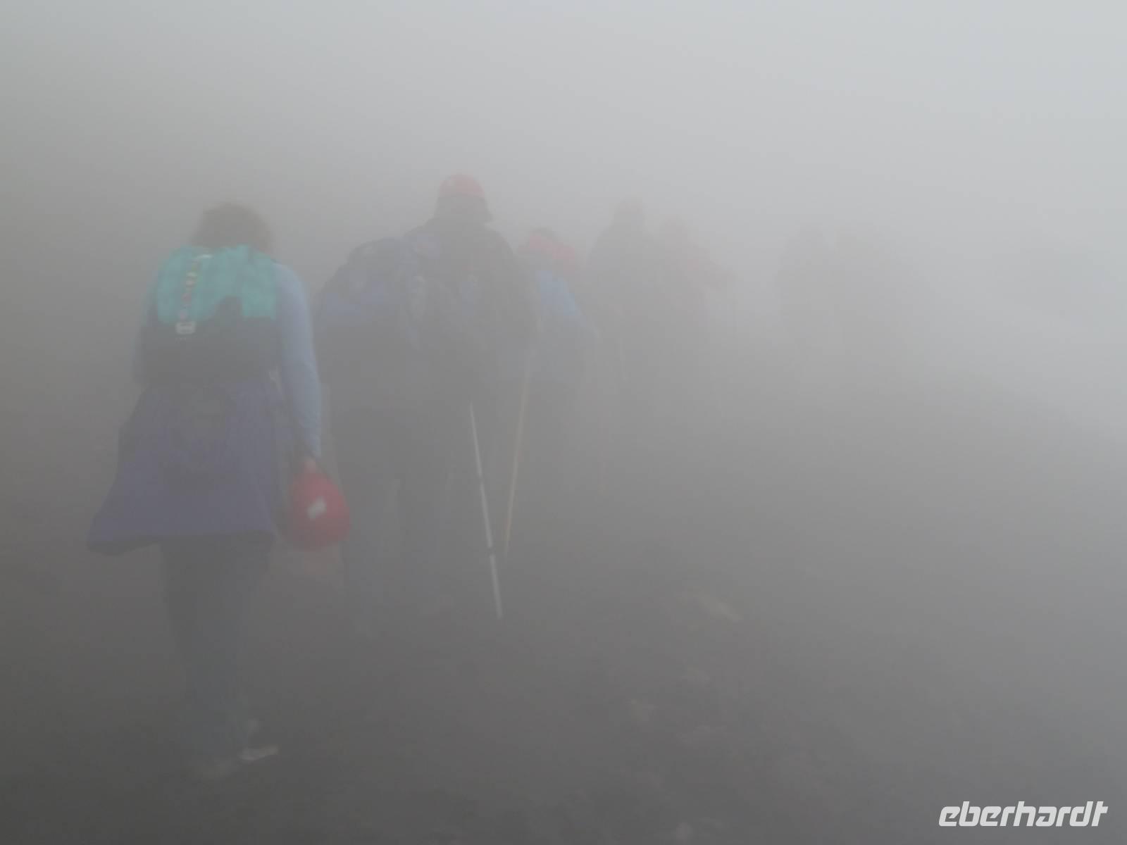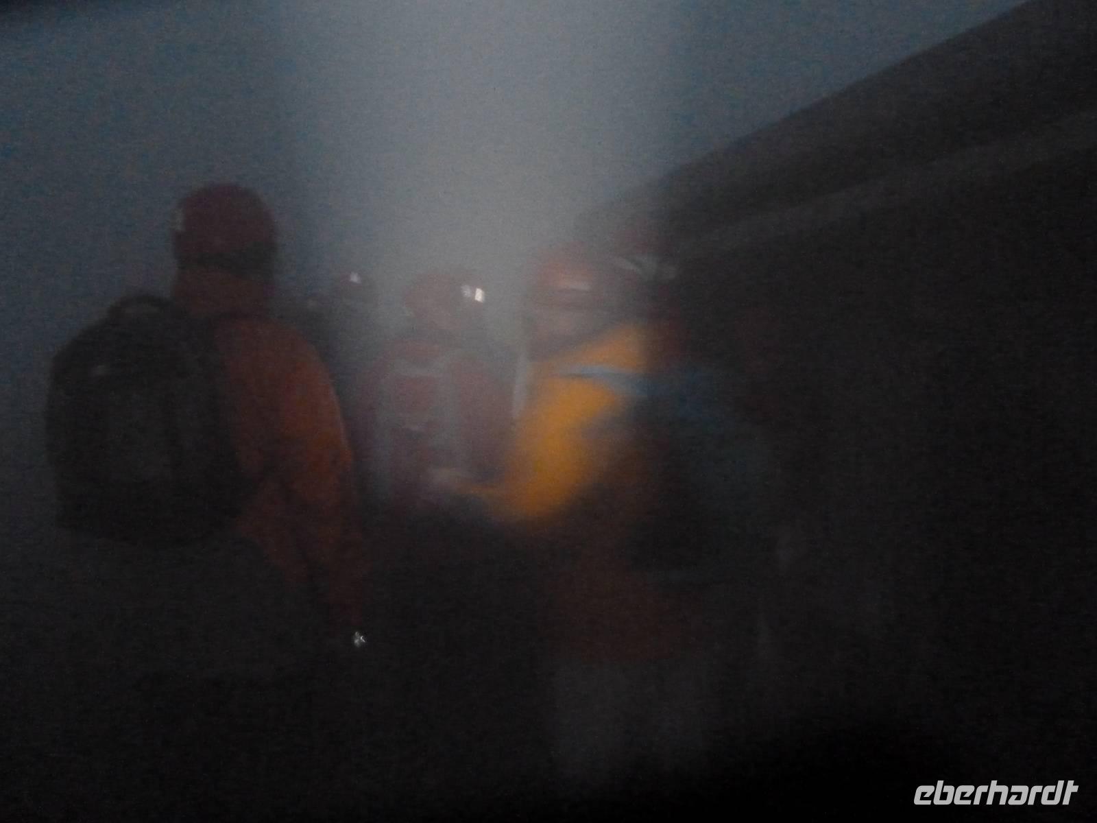 Nach der ersten spannenden Nachtwanderung über Stromboli konnten wir wieder ausschlafen und in aller Ruhe Frühstücken und die Insel genießen. Nach einem gemeinsamen Mittagessen im Hotel wurden die letzten Kräfte gestärkt. Einige wanderten die Strecke des gestrigen Abends ab, andere spazierten über die Insel oder genossen die Sonne und ein Bad im Meer. Gegen 17.00 Uhr ging unsere Wanderung auf 900 Höhenmeter mit unserem Bergführer Angelo los. Am Büro der Bergführer wurden wir mit Helmen ausgerüstet, um uns vor kleinen Steinbrocken zu schützen. Mit sehr viel Ruhe und schönem gleichmäßig langsamen Schritt brachte er uns sicher auf den Gipfelkrater des Strombolis. Zunächst war das Wetter gut und die Sicht einwandfrei. Aber je näher wir zur Wolkengrenze kamen, umso schlechter wurde die Sicht. Wir sehnten alle den Aufbruch der Wolkendecke entgegen und erhofften uns eine super Sicht in den Krater und auf spektakuläre Fotos von dem spukenden Vulkan. Doch leider wurden wir enttäuscht und obwohl wir direkt am Krater standen, hörten wir nur das Knallen der Explosionen uns sahen leider nichts. Die Wolkendecke wurde immer schlimmer und es war sicherer, den Abstieg ins Tal zu beginnen. Unser Wanderführer war großartig und brachte uns schnell und sicher aus der Wolkendecke durchs Lavafeld wieder ins Tal. Die Lichter von Stromboli-Stadt kamen immer näher und belohnten unsere Anstrengungen des Aufstieges. Aus jeder Sicht war es eine sehr spektakuläre und einzigartige Wanderung durch die Kraft der Wolken. Drei Wanderfreunde der Gruppe hatten leider nicht die Kraft, die 900 Höhenmeter zu überwinden und sind mit Jochen einen anderen Wanderweg auf 400 Höhenmeter, zur Pizzeria und anschließend zurück zum Hotel gewandert. Für diese drei war es ebenfalls sehr interessant, da Jochen sehr viel über die Insel und den Vulkan erzählte. Zum Ausklang des Tages trafen sich einige der Wandergruppe in der Hotelbar und ließ die Wanderung noch einmal Revue passieren.