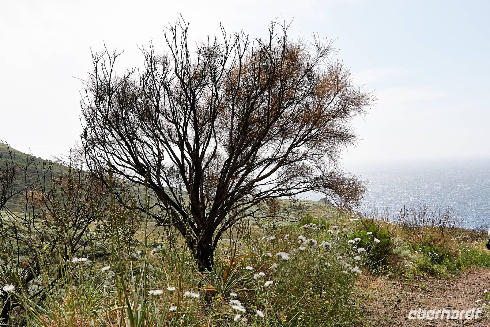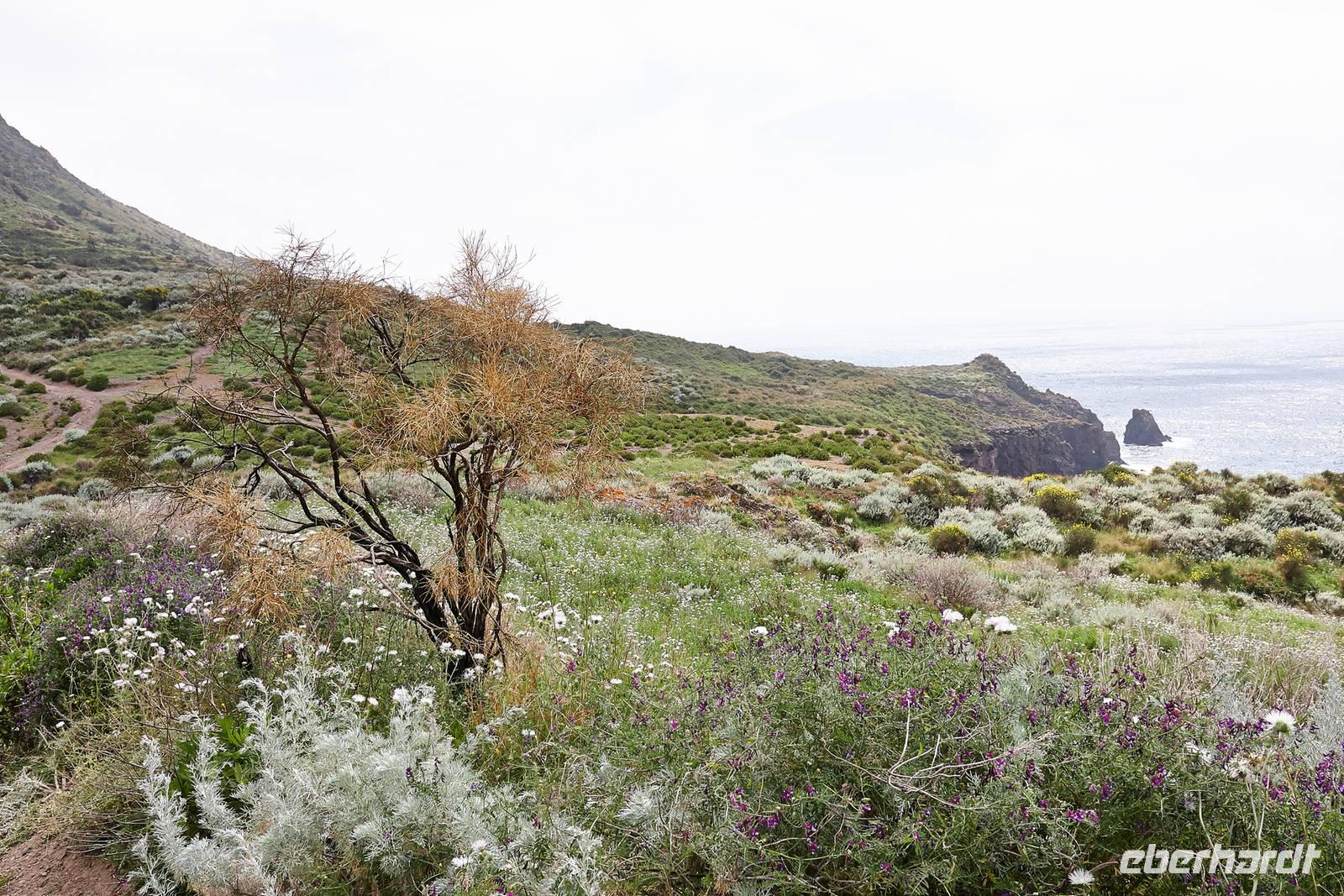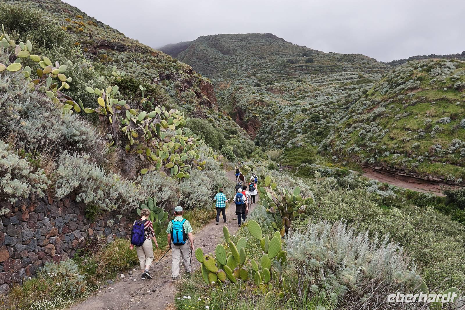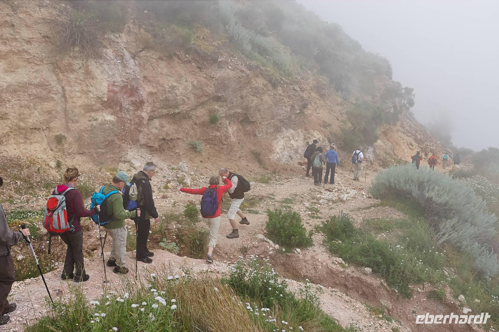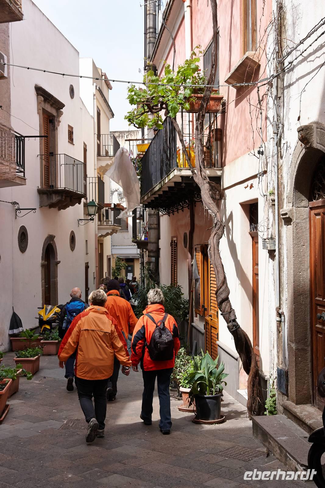 6.00 Uhr morgens kam der Weckruf zum Aufstehen, denn heute mussten wir unser Schiff erwischen, welches 9.00 Uhr in Milazzo ablegte. Das hieß kurz beim Frühstück stärken und ab in den Bus zur 1,5 stündigen Fahrt von Riposto nach Milazzo. Auf dem Weg erzählte uns Jochen wieder viel Wissenswertes und interessantes über Sizilien und die einzelnen Städte. Pünktlich erreichten wir unser Schiff, welches ebenfalls pünktlich losfuhr und uns über hohe Wellen nach Lipari, der Hauptinseln der Liparischen Inseln, brachte. Dort angekommen erwartete uns schon ein Shuttle, der unsere Koffer zum Hotel brachte. Wir liefen die wenigen Minuten zum Hotel und nutzten die Gelegenheit, auf den Burgberg, mit der herrlichen Aussicht über Lipari-Stadt und dem Hafen Marina Corta, hochzulaufen, über die Flaniermeile zu bummeln und dabei einen Imbiss zu uns zu nehmen. Gleichzeitig konnten wir die Stadt ein wenig kennen lernen. Gegen 12.00 Uhr kamen wir am Hotel an und hatten ein wenig Freizeit zum Frischmachen und um unseren Wanderrucksack zu packen, denn bereits 12.30 Uhr wartete der Bus, der uns zum Startpunkt unsrer heutigen Wanderung brachte. Vorbei an kleinen Fischerorten und alten Obsidian-Abbaustätten, machten wir sogar Halt, um Obsidian sammeln zu können. Danach starteten wir unsere Wanderung auf dem höchsten Punkt der Insel. Mitten in den Wolken liefen wir los, bergab über steinige Wege und wunderschönen blühenden Blumen. Weiter unten ließen die Wolken nach und die Sonne kam heraus, die die Aussicht noch schöner machte. Die volle Blütenbracht der kleinen und großen Blumen und der Bäume erleichterten den schwierigen Abstieg. Immer am Meer entlang ging es durch ein kleines Tal wieder hinauf in den Ort Pianoconte, wo eine kleine Bar gerade öffnete und die gesamte Gruppe sich erst mal stärken konnte. Danach ging es immer weiter bergab ins Tal Richtung Meer nach Lipari-Stadt und zurück zum Hotel. Hier nutzen einige der Gruppe die Zeit, um im Pool, dessen Wasser noch sehr frisch war, zu schwimmen. Danach klang der Tag mit einem leckeren Abendessen im Hotelrestaurant aus.