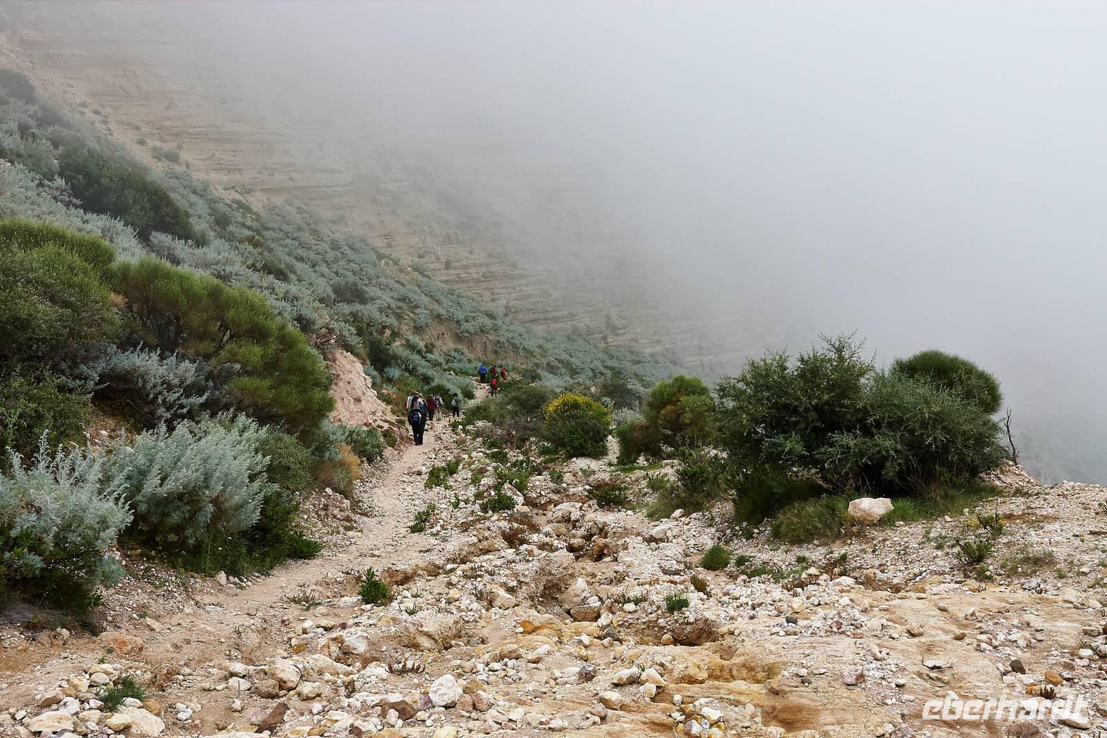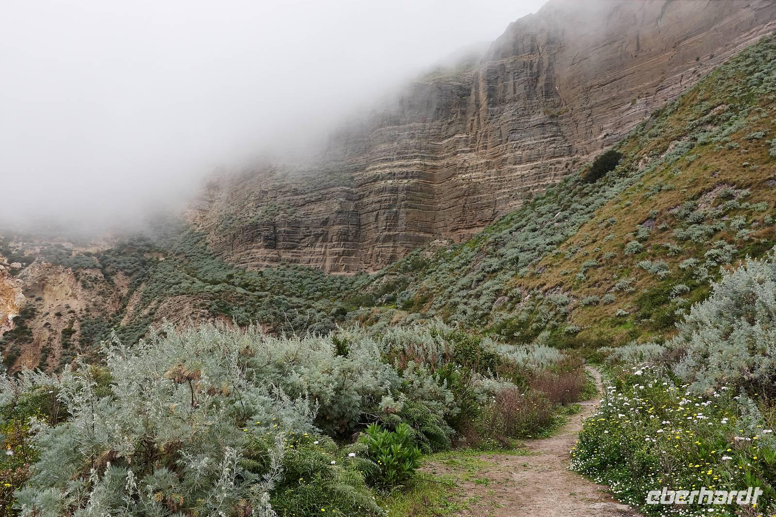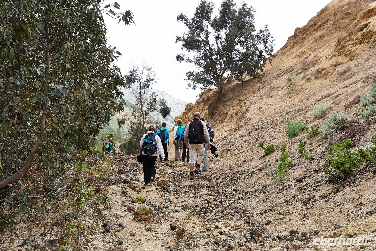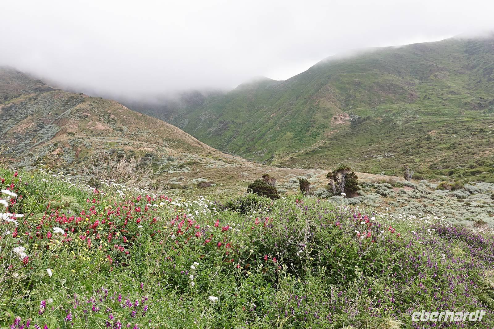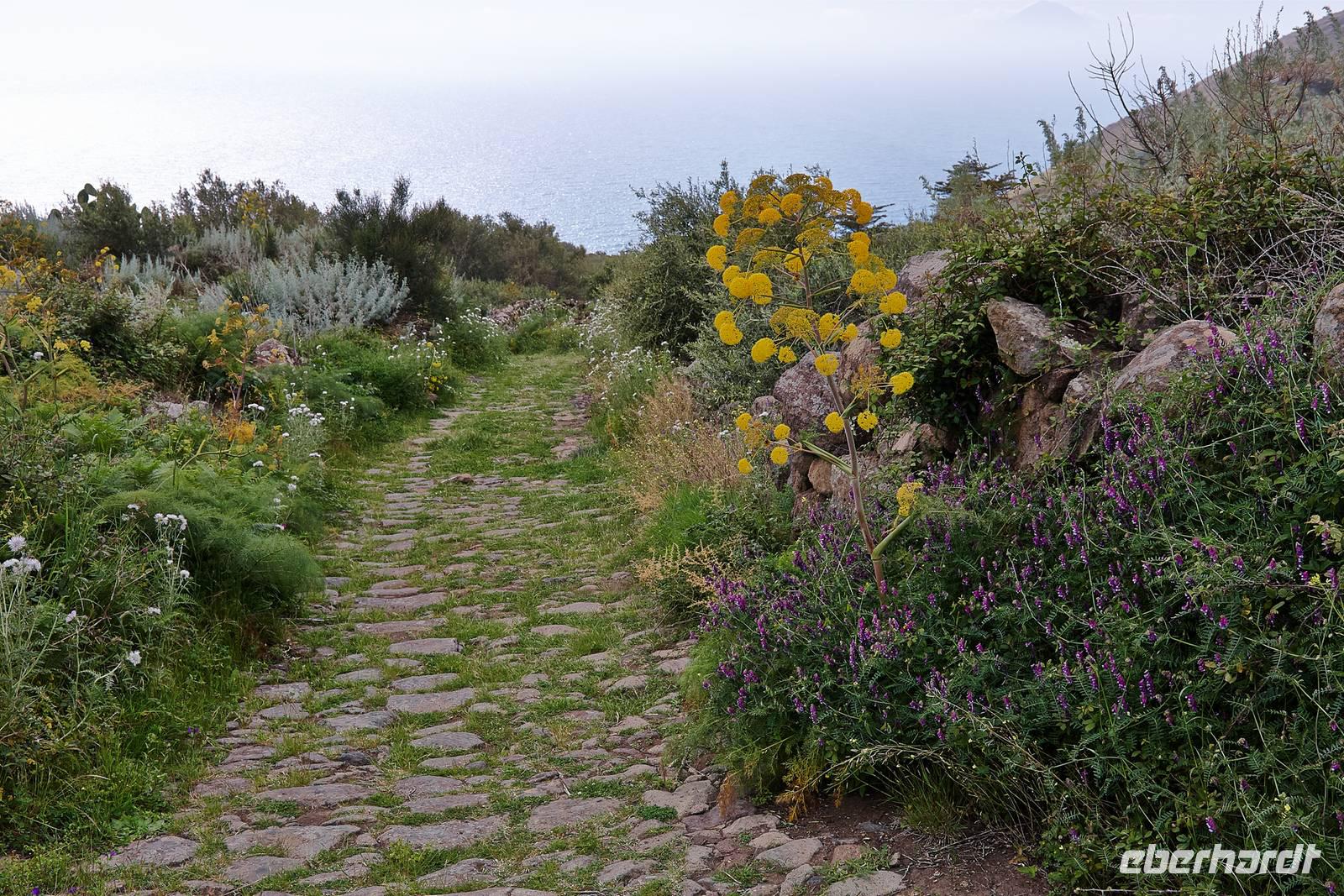 6.00 Uhr morgens kam der Weckruf zum Aufstehen, denn heute mussten wir unser Schiff erwischen, welches 9.00 Uhr in Milazzo ablegte. Das hieß kurz beim Frühstück stärken und ab in den Bus zur 1,5 stündigen Fahrt von Riposto nach Milazzo. Auf dem Weg erzählte uns Jochen wieder viel Wissenswertes und interessantes über Sizilien und die einzelnen Städte. Pünktlich erreichten wir unser Schiff, welches ebenfalls pünktlich losfuhr und uns über hohe Wellen nach Lipari, der Hauptinseln der Liparischen Inseln, brachte. Dort angekommen erwartete uns schon ein Shuttle, der unsere Koffer zum Hotel brachte. Wir liefen die wenigen Minuten zum Hotel und nutzten die Gelegenheit, auf den Burgberg, mit der herrlichen Aussicht über Lipari-Stadt und dem Hafen Marina Corta, hochzulaufen, über die Flaniermeile zu bummeln und dabei einen Imbiss zu uns zu nehmen. Gleichzeitig konnten wir die Stadt ein wenig kennen lernen. Gegen 12.00 Uhr kamen wir am Hotel an und hatten ein wenig Freizeit zum Frischmachen und um unseren Wanderrucksack zu packen, denn bereits 12.30 Uhr wartete der Bus, der uns zum Startpunkt unsrer heutigen Wanderung brachte. Vorbei an kleinen Fischerorten und alten Obsidian-Abbaustätten, machten wir sogar Halt, um Obsidian sammeln zu können. Danach starteten wir unsere Wanderung auf dem höchsten Punkt der Insel. Mitten in den Wolken liefen wir los, bergab über steinige Wege und wunderschönen blühenden Blumen. Weiter unten ließen die Wolken nach und die Sonne kam heraus, die die Aussicht noch schöner machte. Die volle Blütenbracht der kleinen und großen Blumen und der Bäume erleichterten den schwierigen Abstieg. Immer am Meer entlang ging es durch ein kleines Tal wieder hinauf in den Ort Pianoconte, wo eine kleine Bar gerade öffnete und die gesamte Gruppe sich erst mal stärken konnte. Danach ging es immer weiter bergab ins Tal Richtung Meer nach Lipari-Stadt und zurück zum Hotel. Hier nutzen einige der Gruppe die Zeit, um im Pool, dessen Wasser noch sehr frisch war, zu schwimmen. Danach klang der Tag mit einem leckeren Abendessen im Hotelrestaurant aus.