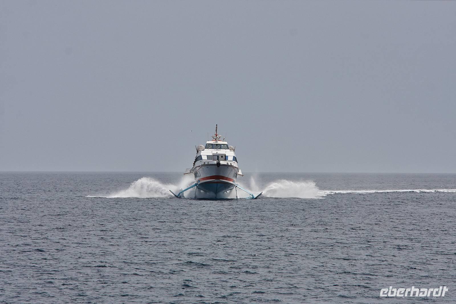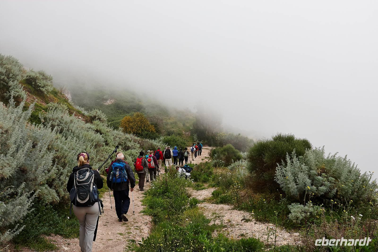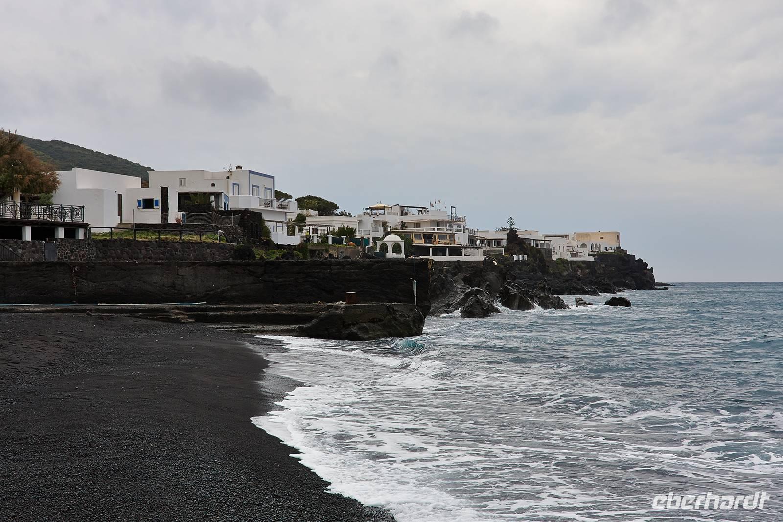 Heute konnte die gesamte Wandergruppe ausschlafen, denn unser Boot nach Stromboli legte erst 12.00 Uhr ab. Da andere Gruppen die Überfahrt abgesagt hatten, hatten wir ein kleines Boot für uns allein. Ca. 13.30 Uhr kamen wir auf Stromboli an. Zur Begrüßung gab es für die Reisenden ein kleines Glas Malvasia, über das sich die Gruppe sehr freute. Unsere Koffer wurden mit einem Auto zum Hotel gebracht und wir liefen durch die kleine Stadt und Jochen zeigte uns die Insel und erzählte schon einiges dazu. Nachdem wir im Hotel angekommen waren, hatten wir erst einmal Freizeit, um ins Meer zu gehen oder um noch ein bisschen die kleine Stadt zu erkunden. Da wir heute nicht im Hotel aßen, sondern in einer Pizzeria beim alten Observatorium, wanderten wir gegen 17.00 Uhr los. Bereits 1 Stunde später erreichten wir die Pizzeria auf ca. 100 Höhenmeter. Bevor wir einkehrten, wollten wir auf 400 Höhenmeter, um zu schauen, ob wir den Vulkan in Aktion erleben können. Doch leider hingen die Wolken zu tief und zu dick, sodass wir zwar die Eruptionen hören, aber leider nichts sehen konnten. So stiegen wir wieder hinab und freuten uns auf das leckere Essen in der Pizzeria. Anschließend wanderten jeder für sich oder in kleinen Gruppen durch die dunkle Sternennacht zurück zum Hotel. Ohne Taschenlampen konnte man nichts sehen, aber wir waren alle gut vorbereitet und sind alle gut im Hotel angekommen. Die Wandergruppe genoss die Wanderung durch die Wolkendecke und durch die dunkle Romantik der Insel.