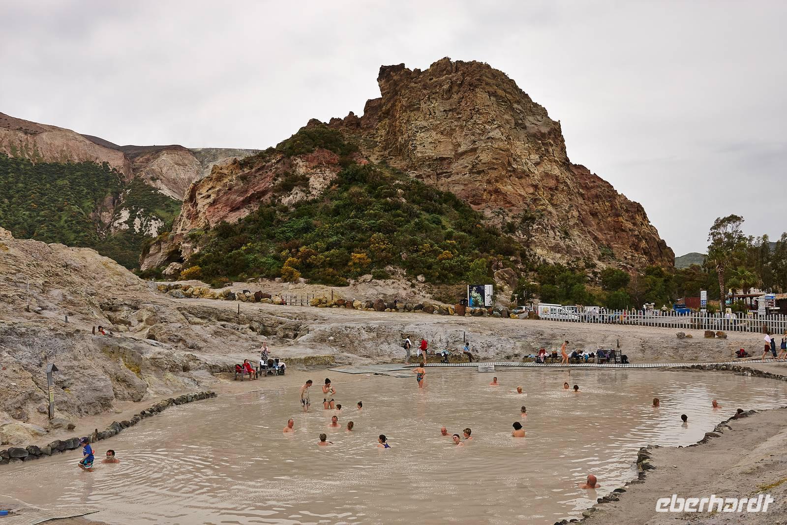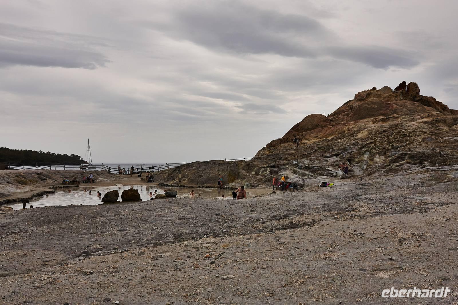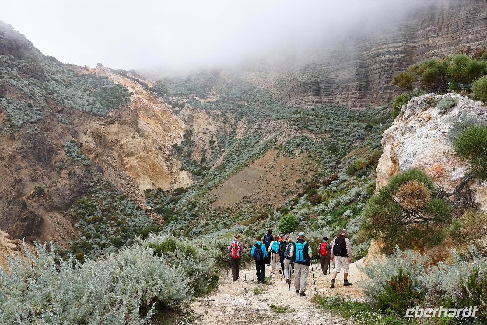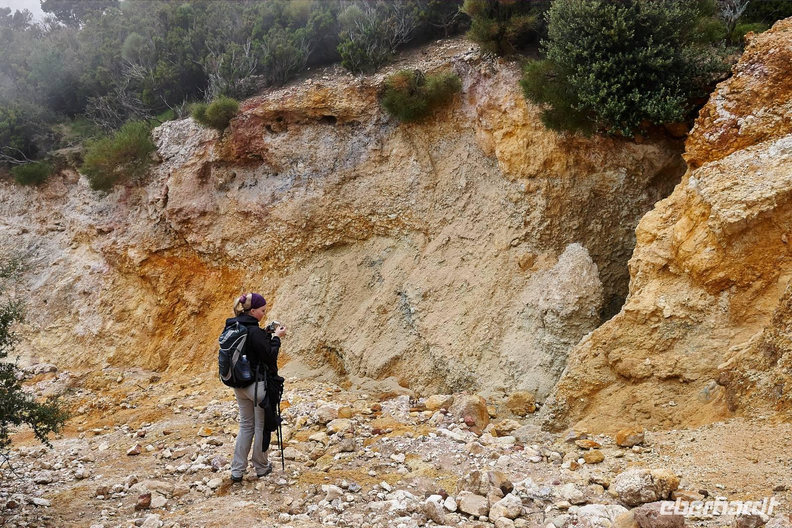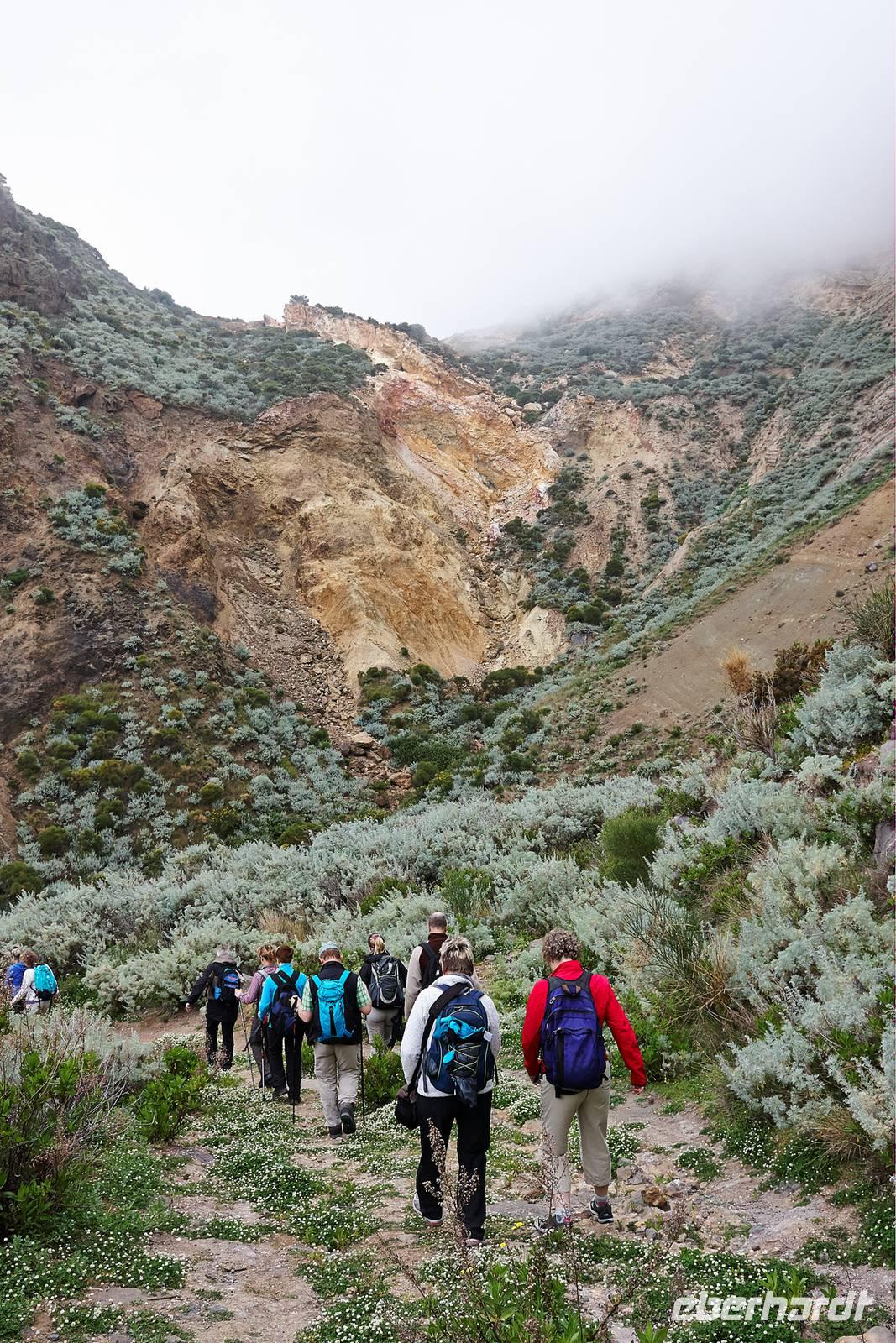 Heute konnten wir mal ein bisschen länger schlafen, denn unser Schiff nach Vulcano legte erst 10.00 Uhr ab. Die Wandergruppe konnte sich in aller Ruhe beim Frühstück stärken und beim Weg zum Hafen warmlaufen. Das Schiff legte rechtzeitig ab und bevor wir anlegten, fuhren wir noch eine Runde um die Insel und trafen auf die Höhle des Äeolos und auf die Statue der kleinen Meerjungfrau. Ca. 11.45 Uhr ging unsere Wanderung auf den Vulkan von Vulcano los. Die ca. 300 Höhenmeter legten die schnellsten der Gruppe in einer halben Stunde zurück, die anderen brauchten ca. 45 Minuten. Alle genossen die gute Aussicht über die Insel und das Meer. Die austretenden Schwefeldämpfe waren ebenso beeindruckend wie auch hier der Blick in den Krater, und die Naturgewalt, die damit verbunden ist. Einige der Gruppe liefen noch um den Krater herum und erreichten eine Höhe von ca. 400 Meter. Langsam stiegen wir nach und nach ab und genossen weiterhin die Aussicht und die Magie der Natur. Im Tal angekommen wartete bereits im „il Cratere" ein leckeres Essen aus 2 Gängen auf uns. Danach liefen wir zum Schwefelbad, in dem fast die gesamte Gruppe ein Bad nahm. Anschließend genossen wir noch unsere Freizeit auf der Insel, bevor 17.30 Uhr unser Schiff wieder ablegte und wir nach Lipari zurück ins Hotel kehrten. Hier wartete bereits wieder ein leckeres Abendessen auf uns und alle freuten sich auf die Highlight-Insel der Wanderreise.