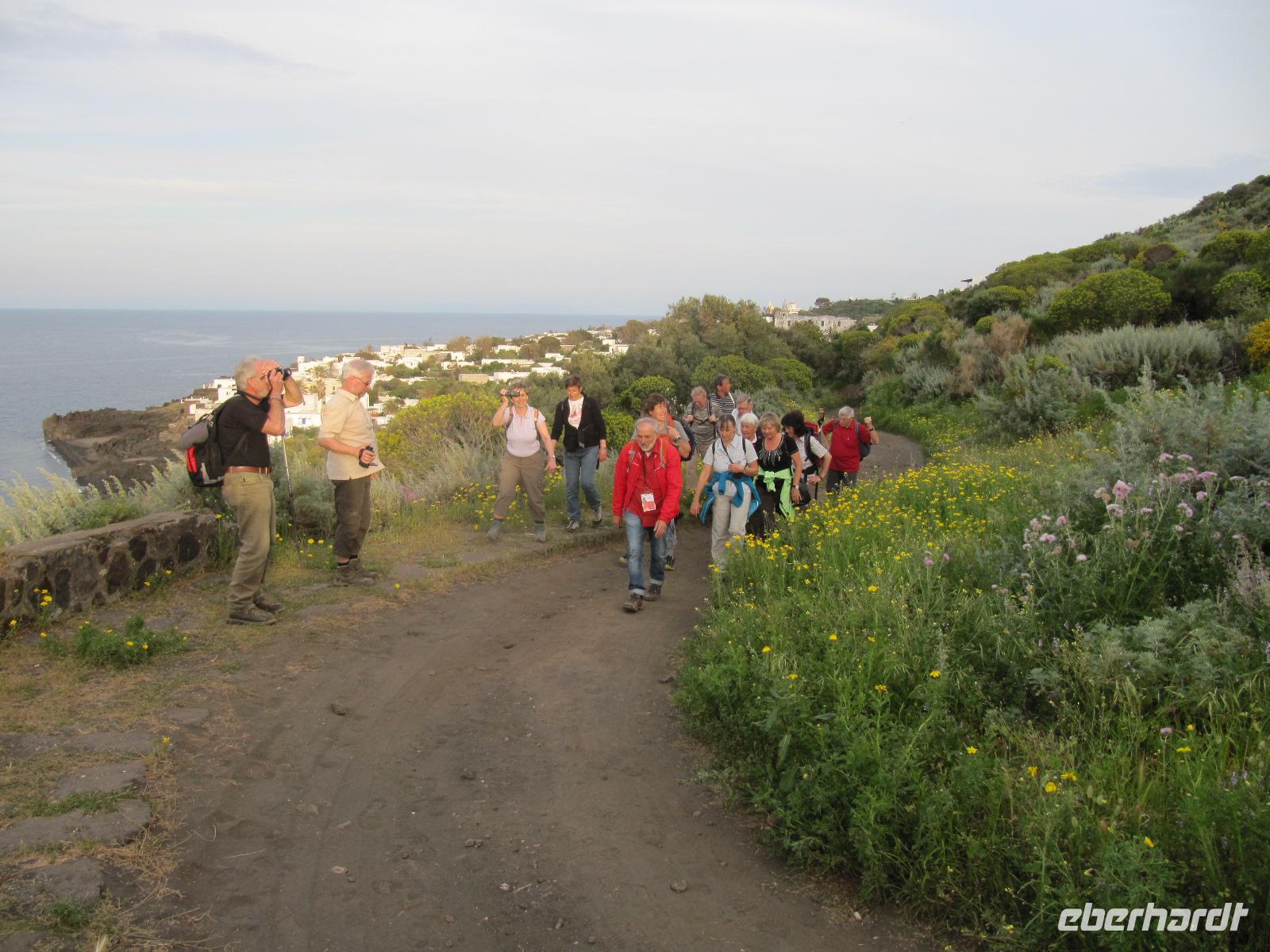 Um 6.45 Uhr verließen wir das Hotel und fuhren nach Milazzo. Von dort aus ging es mit dem Schiff, das wir ganz für uns hatten, auf direktem Wege nach Lipari. Dort wartete auch schon der Gepäcktransfer und wir gingen ins direkt am Meer gelegene Hotel, um uns kurz frisch zu machen und die Kleidung dem schönen Wetter anzupassen. Danach unternahmen wir eine Stadtbesichtigung, bei der der Burgberg mit einer über 5000 Jahre alten Siedlungsgeschichte, samt Kreuzgang und antikem Friedhof besonders in Erinnerung geblieben sind. Gestaunt haben wir auch, als Vincenzo einfach so eine Scherbe vom Boden aufhob und sie auf ein Alter von über 1000 Jahren bestimmen konnte. Nach einer Mittagspause ging es dann gestärkt zur Inselrundfahrt, um einen besseren Überblick über die Insel zu bekommen. Danach begannen wir unsere Tageswanderung. Auf Schusters Rappen ging es an einer alten Mine, der Küste und der ältesten Therme im Mittelmeerraum vorbei zum fantastischen Aussichtspunkt Cuatroocci.