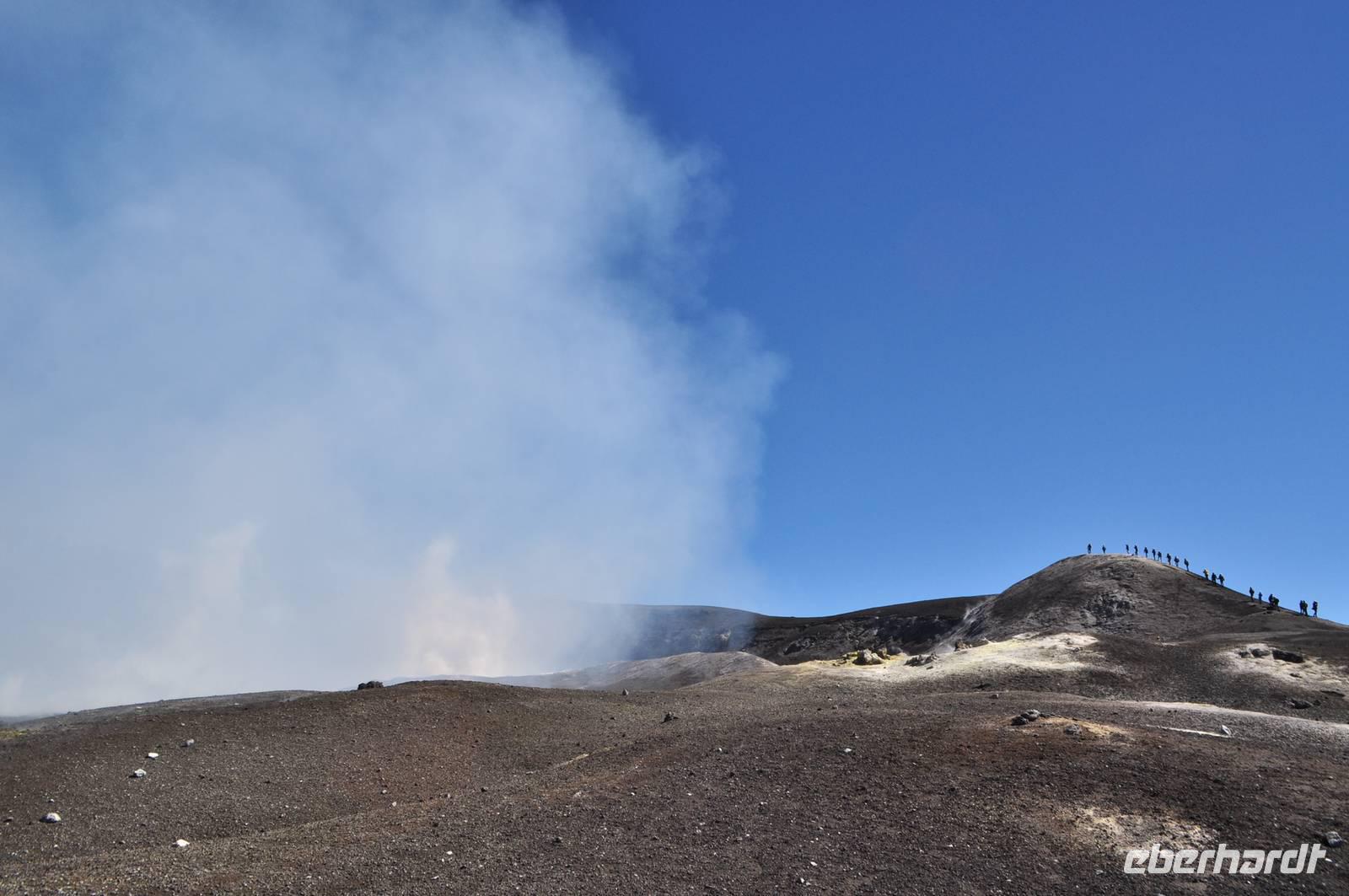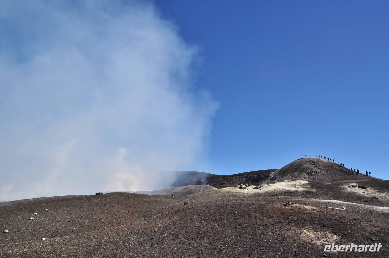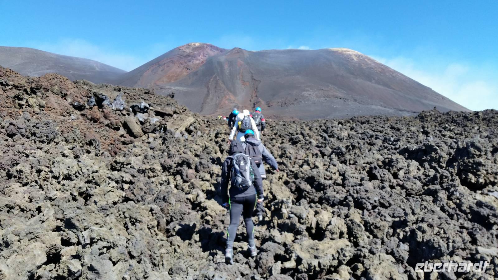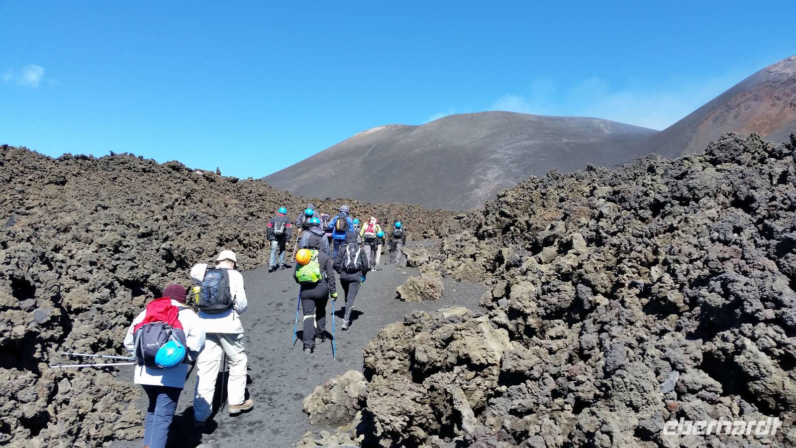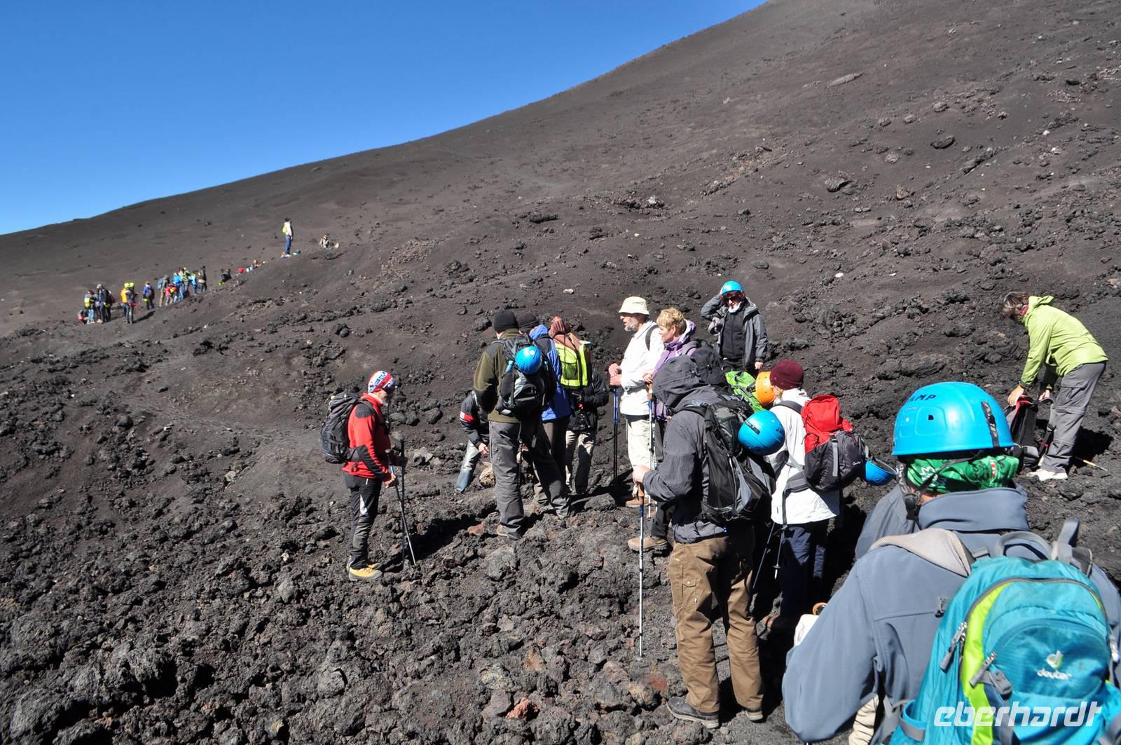 Während in Spitzenzeiten mehrere tausend Touristen täglich mit Allradbussen bis auf 2.900 m gebracht werden, ist der Zugang zur Gipfelregion nur 50 Gästen pro Tag mit einem speziellen Permit gestattet. Aufgrund der Aktivität des Ätna ist auch ein zertifizierter Vulkan-Führer gesetzlich vorgeschrieben, er steht per Funk in Verbindung mit dem Institut des INGV, dem geologischen Dienst. Dennoch treffen wir unterwegs einige Leichtsinnige, die weder Permit noch Guide haben, sie erwartet in der Regel eine Anzeige der Carabineri.