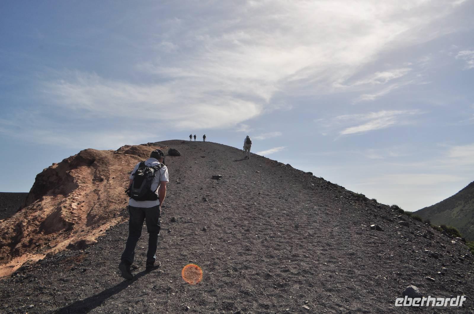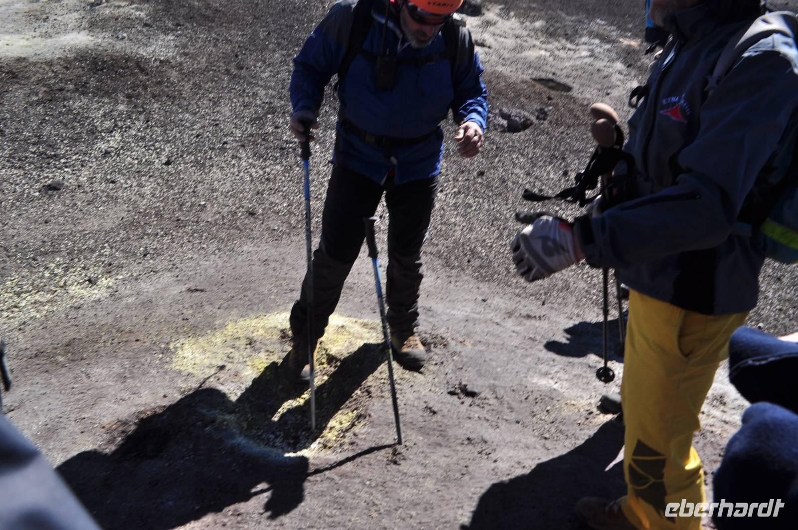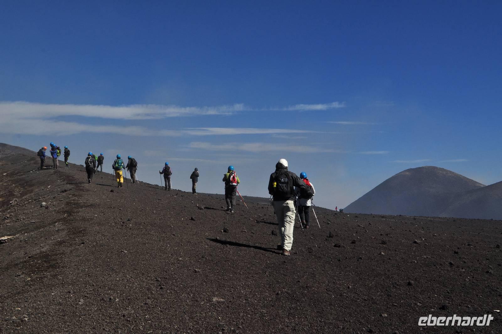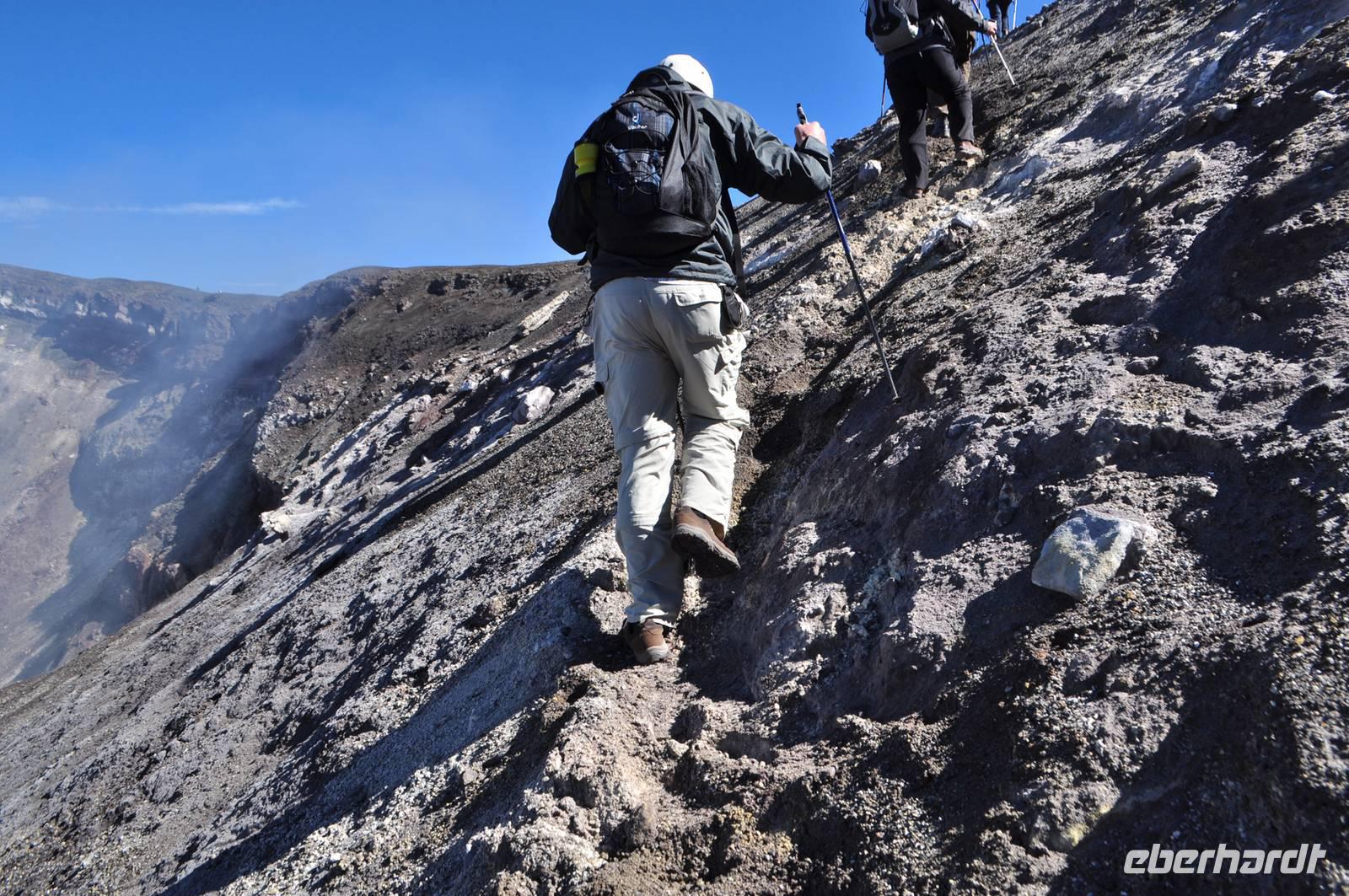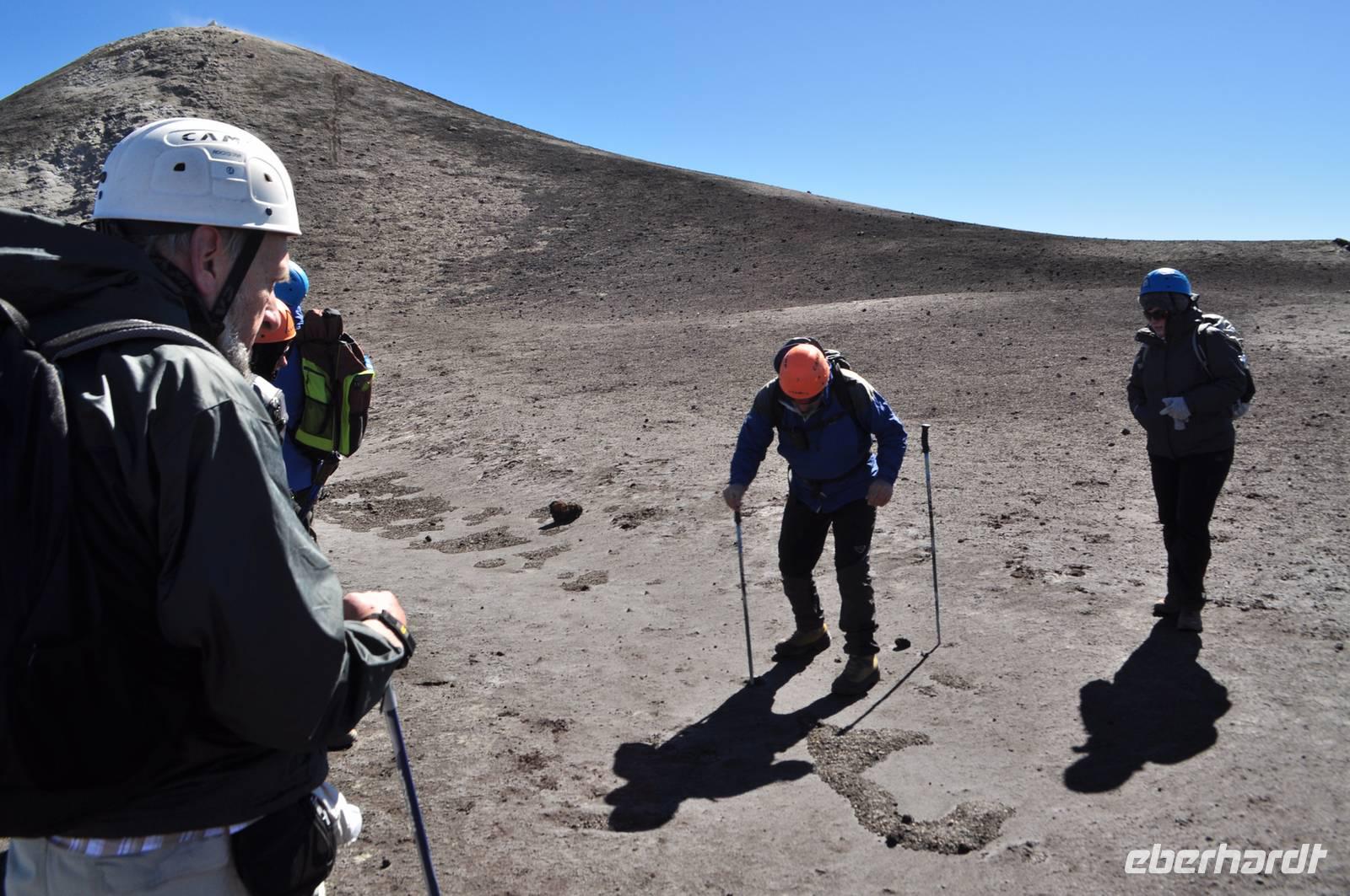 Ich bin überzeugt, dass dieser Moment allen Gästen noch lang in Erinnerung bleiben wird. Wir folgen dem Kraterrand in Richtung Südost-Krater. Immer neue Einblicke und Weitblicke eröffnen sich uns. Nach ca. einer Stunde Aufenthalt beginnen wir tiefbeeindruckt mit dem Abstieg. Auch das natürlich ein Abenteuer. Es geht in Richtung Südosten über ein steiles Aschefeld. Für den Abstieg, eine sogenannte Asche-Abfahrt wendet man idealerweise eine spezielle Gehtechnik an. Der Schwerpunkt wird vollständig auf die Fersen gelegt, unter zu Hilfenahme von Trekkingstöcken springt man eher als das man geht durch das weiche Material. Mit federnden Knien macht das unheimlich viel Spaß. Unabdingbar sind dafür neben den Stöcken auch hohe feste Schuhe, möglichst fest geschnürt.