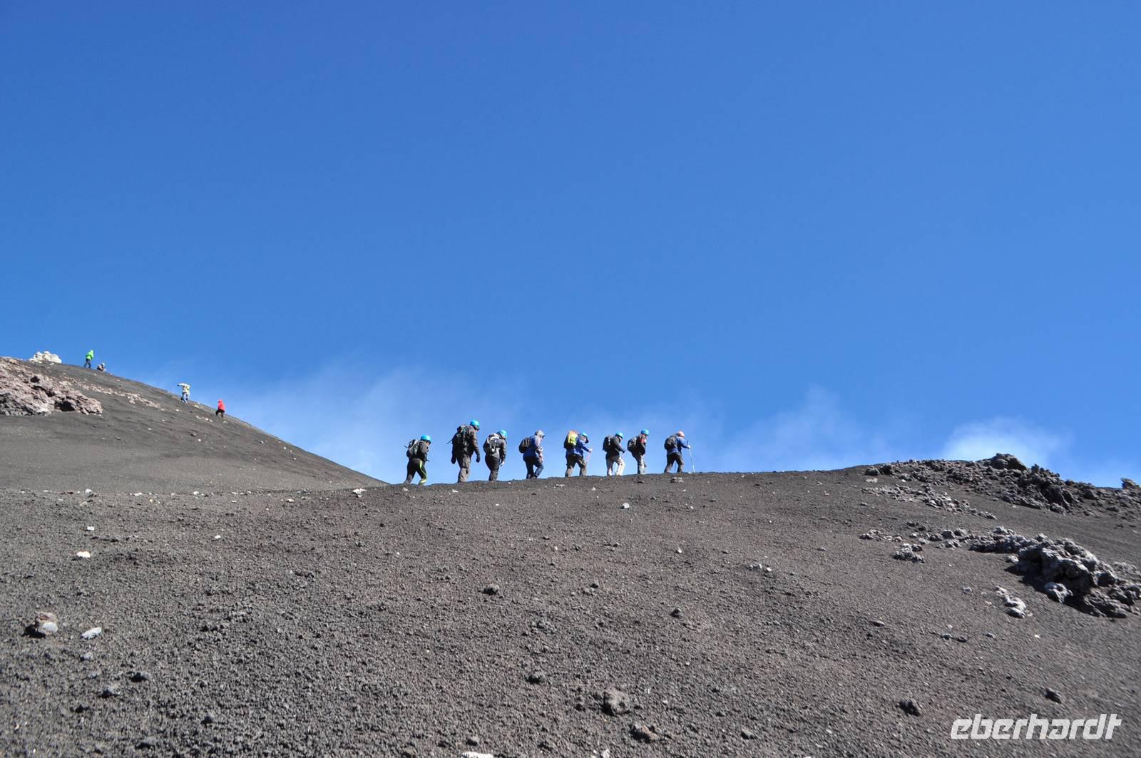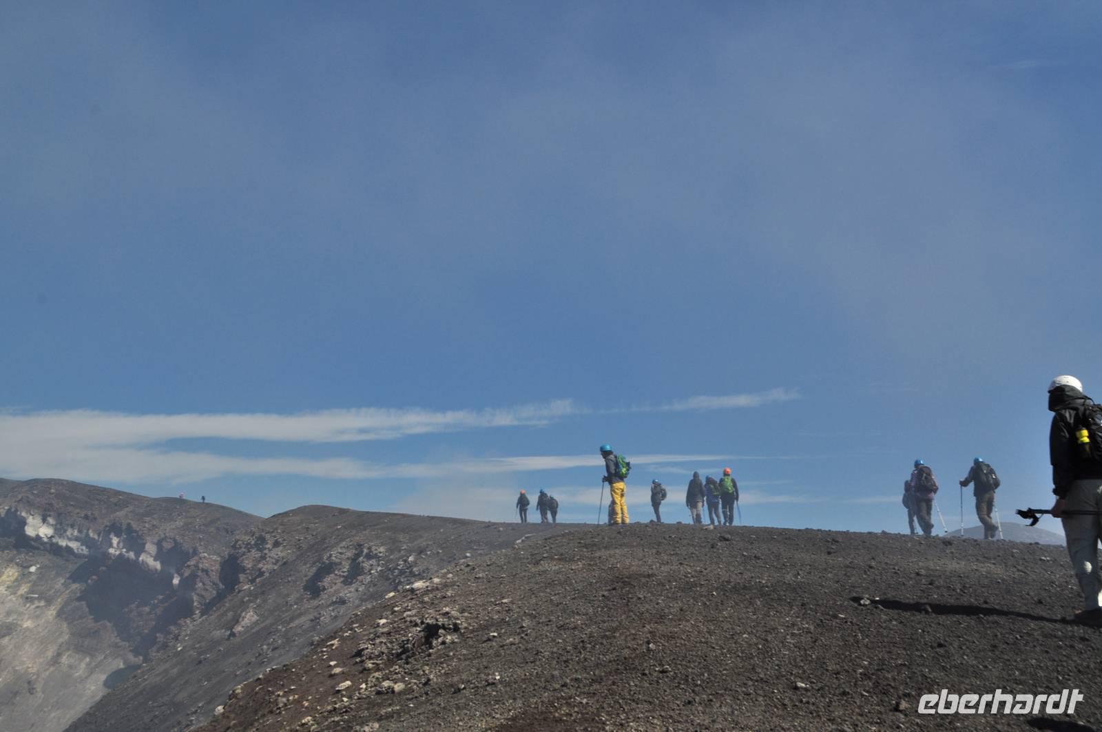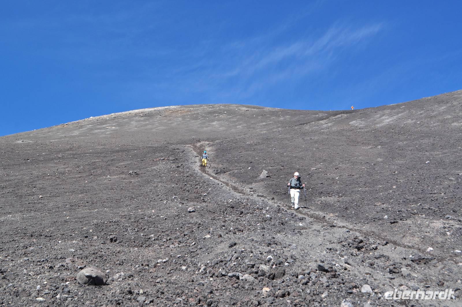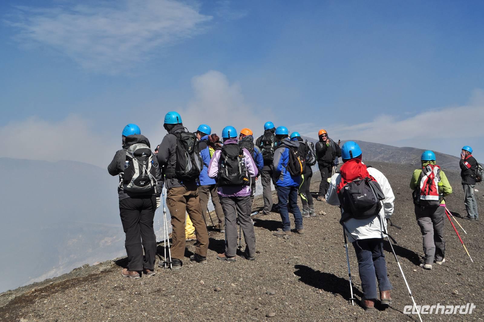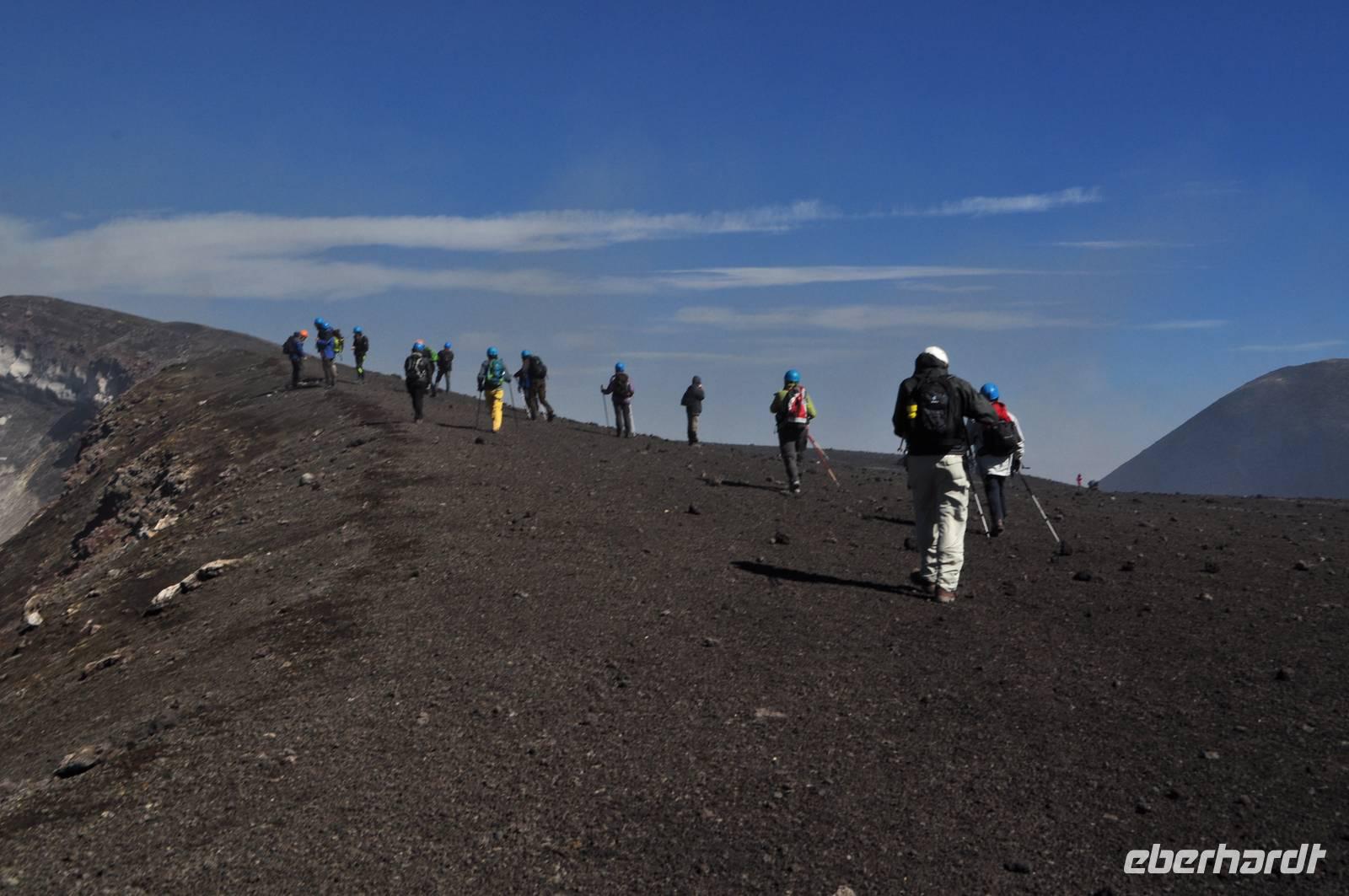 Ich bin überzeugt, dass dieser Moment allen Gästen noch lang in Erinnerung bleiben wird. Wir folgen dem Kraterrand in Richtung Südost-Krater. Immer neue Einblicke und Weitblicke eröffnen sich uns. Nach ca. einer Stunde Aufenthalt beginnen wir tiefbeeindruckt mit dem Abstieg. Auch das natürlich ein Abenteuer. Es geht in Richtung Südosten über ein steiles Aschefeld. Für den Abstieg, eine sogenannte Asche-Abfahrt wendet man idealerweise eine spezielle Gehtechnik an. Der Schwerpunkt wird vollständig auf die Fersen gelegt, unter zu Hilfenahme von Trekkingstöcken springt man eher als das man geht durch das weiche Material. Mit federnden Knien macht das unheimlich viel Spaß. Unabdingbar sind dafür neben den Stöcken auch hohe feste Schuhe, möglichst fest geschnürt.
