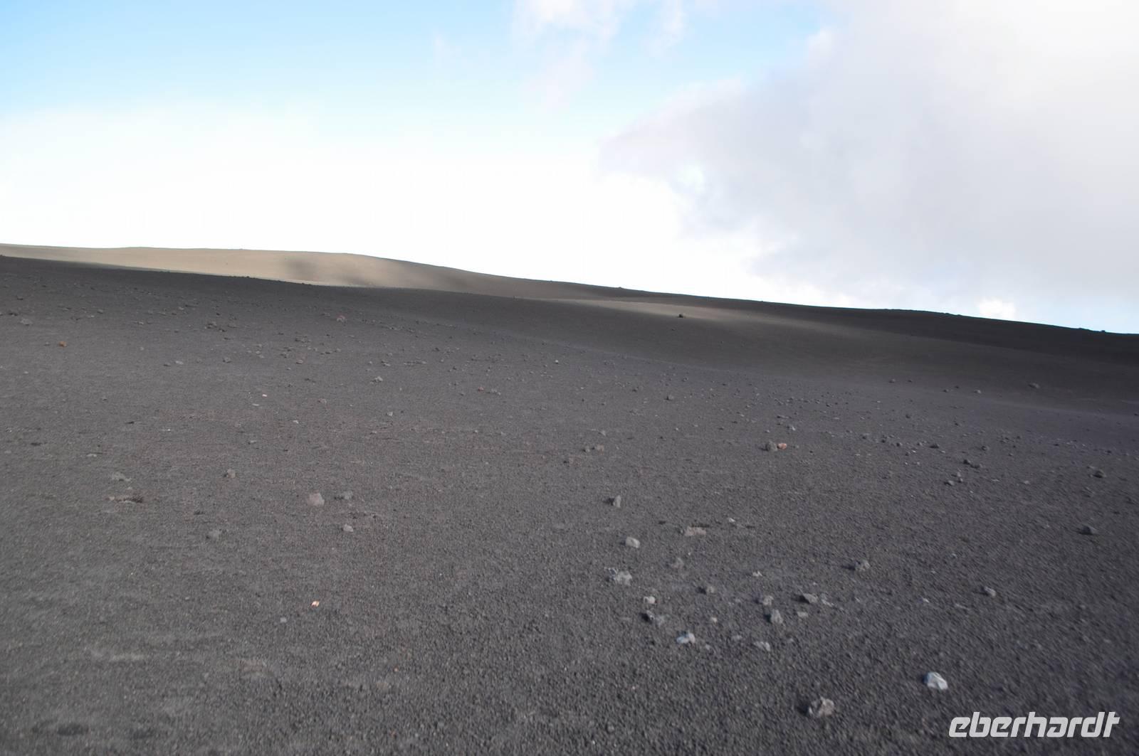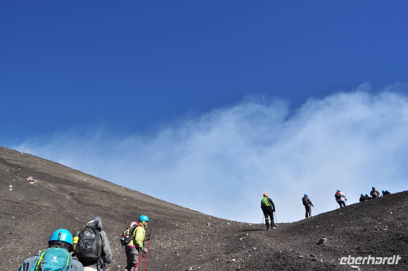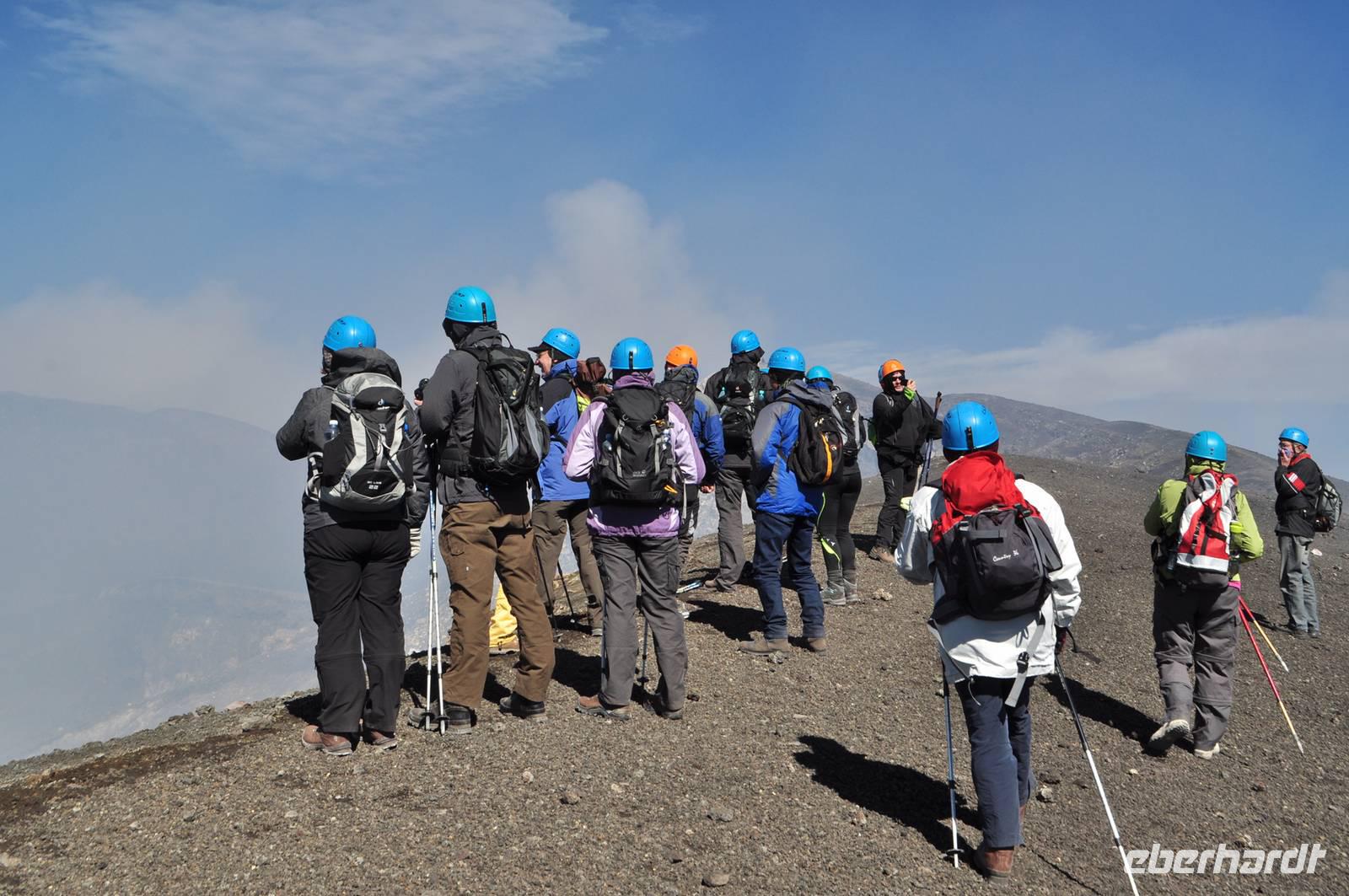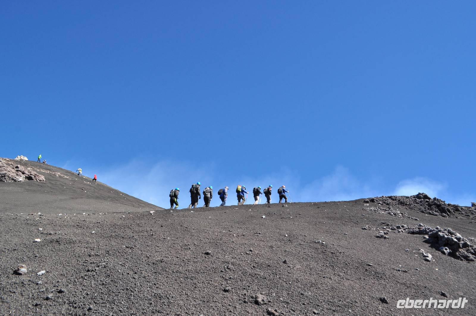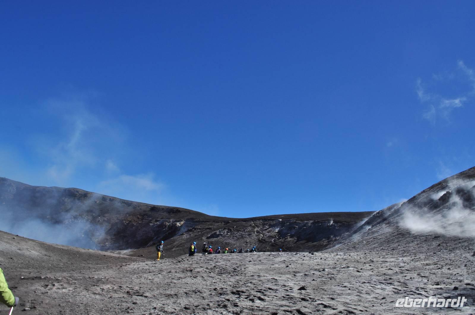 Ich bin überzeugt, dass dieser Moment allen Gästen noch lang in Erinnerung bleiben wird. Wir folgen dem Kraterrand in Richtung Südost-Krater. Immer neue Einblicke und Weitblicke eröffnen sich uns. Nach ca. einer Stunde Aufenthalt beginnen wir tiefbeeindruckt mit dem Abstieg. Auch das natürlich ein Abenteuer. Es geht in Richtung Südosten über ein steiles Aschefeld. Für den Abstieg, eine sogenannte Asche-Abfahrt wendet man idealerweise eine spezielle Gehtechnik an. Der Schwerpunkt wird vollständig auf die Fersen gelegt, unter zu Hilfenahme von Trekkingstöcken springt man eher als das man geht durch das weiche Material. Mit federnden Knien macht das unheimlich viel Spaß. Unabdingbar sind dafür neben den Stöcken auch hohe feste Schuhe, möglichst fest geschnürt.