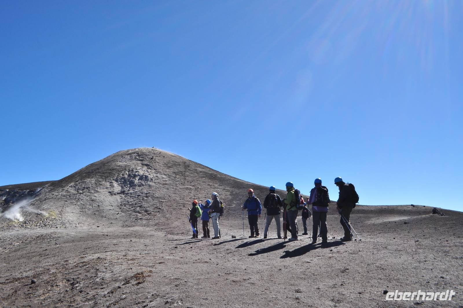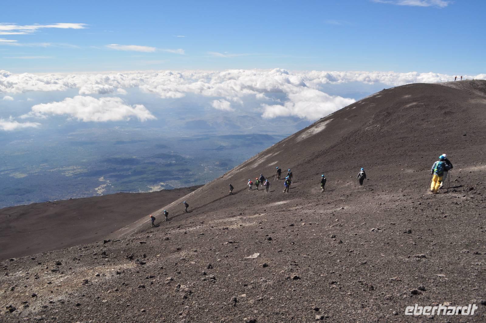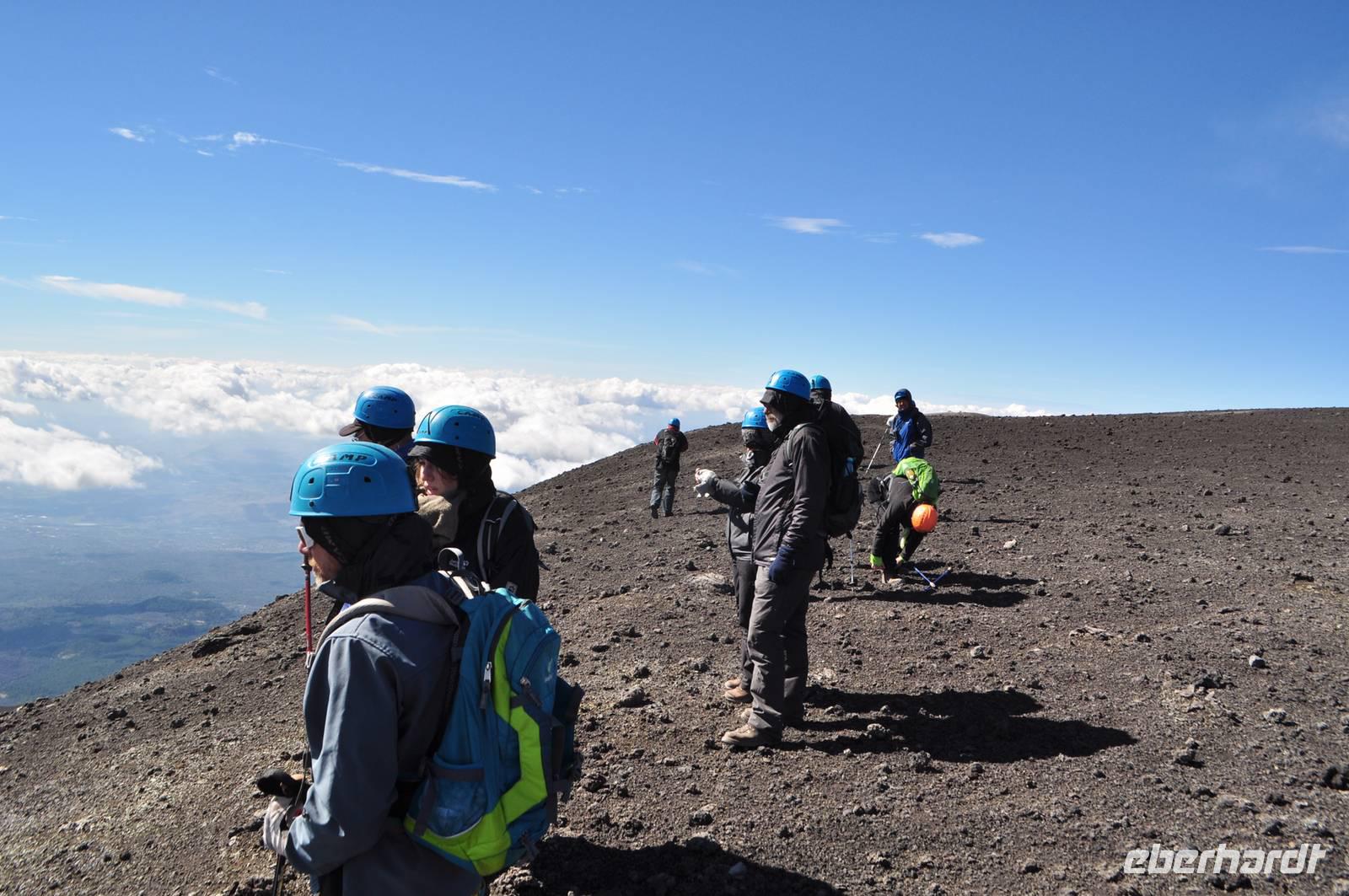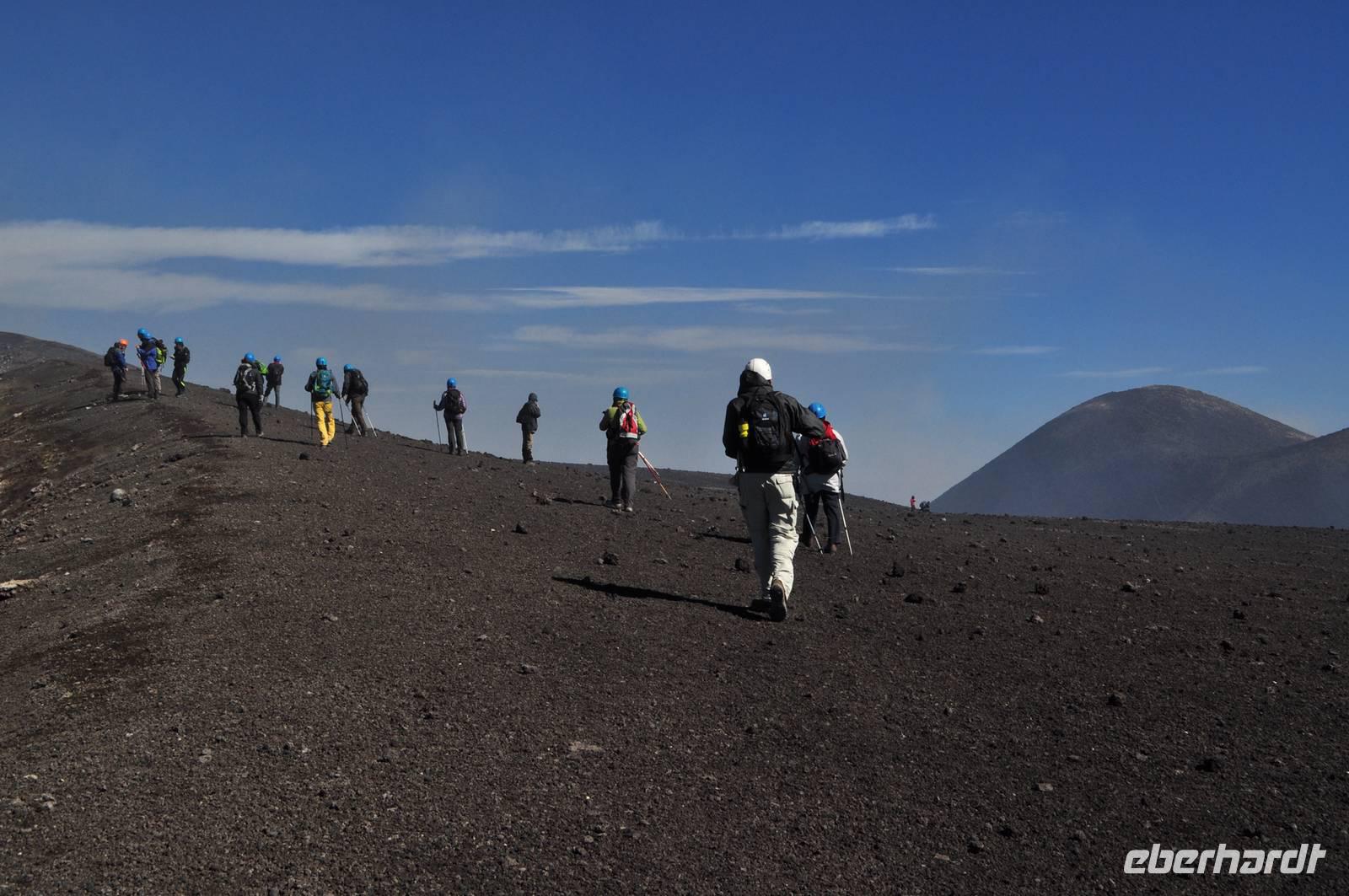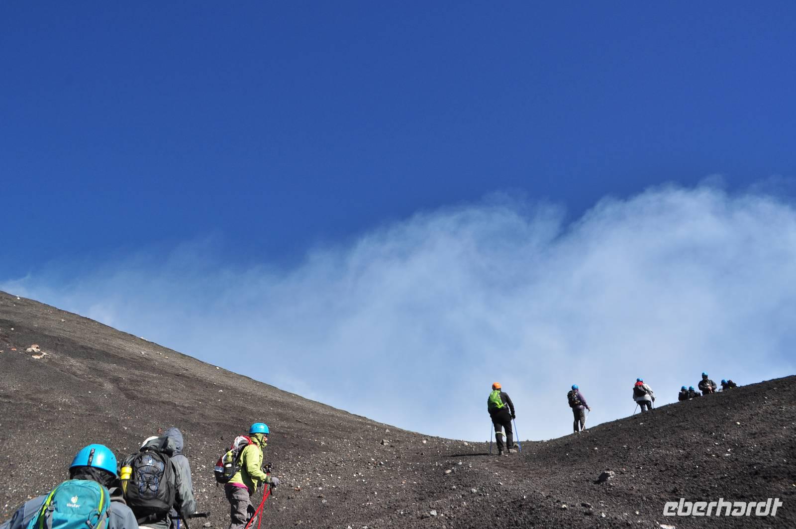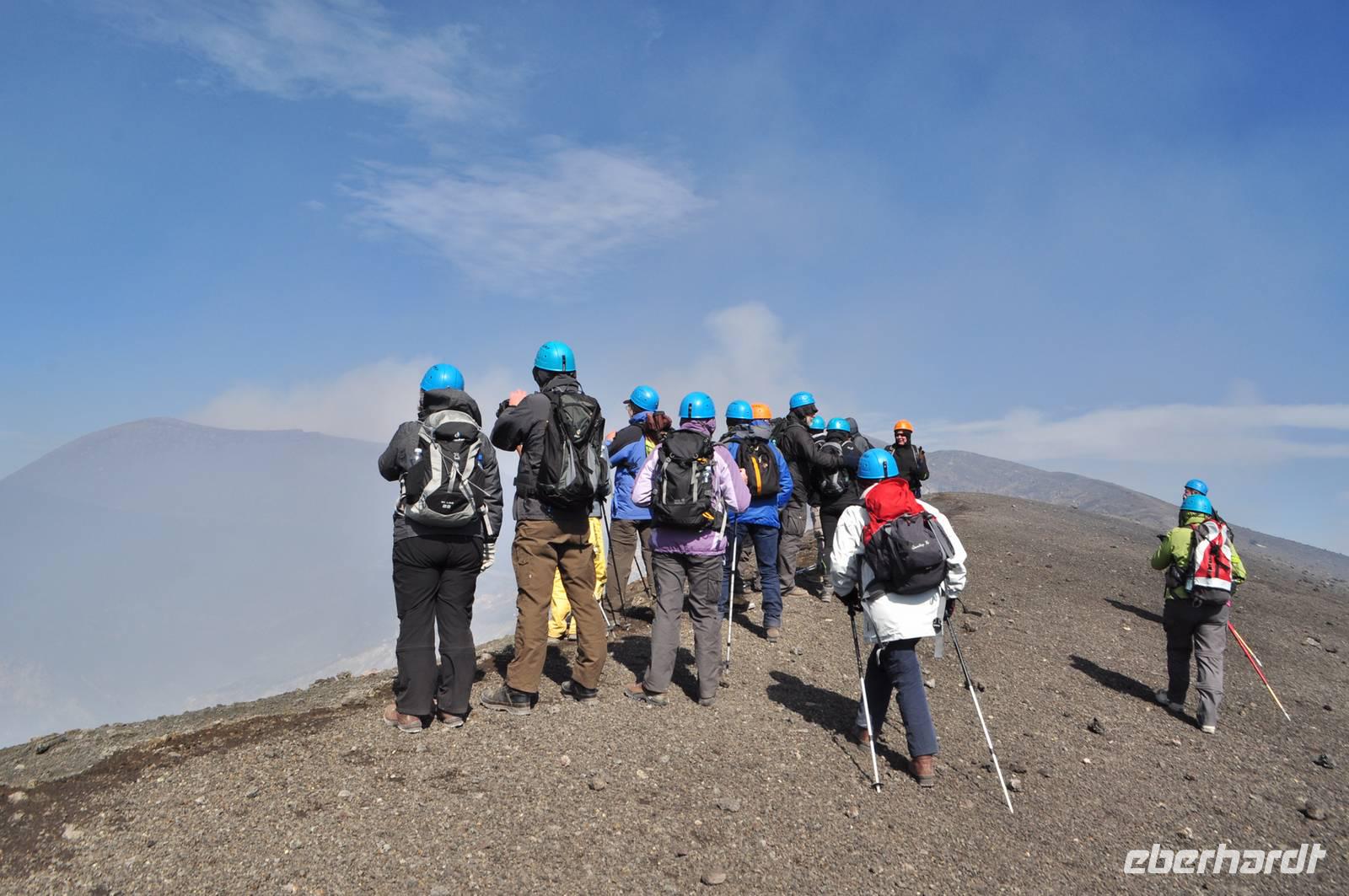 Ich bin überzeugt, dass dieser Moment allen Gästen noch lang in Erinnerung bleiben wird. Wir folgen dem Kraterrand in Richtung Südost-Krater. Immer neue Einblicke und Weitblicke eröffnen sich uns. Nach ca. einer Stunde Aufenthalt beginnen wir tiefbeeindruckt mit dem Abstieg. Auch das natürlich ein Abenteuer. Es geht in Richtung Südosten über ein steiles Aschefeld. Für den Abstieg, eine sogenannte Asche-Abfahrt wendet man idealerweise eine spezielle Gehtechnik an. Der Schwerpunkt wird vollständig auf die Fersen gelegt, unter zu Hilfenahme von Trekkingstöcken springt man eher als das man geht durch das weiche Material. Mit federnden Knien macht das unheimlich viel Spaß. Unabdingbar sind dafür neben den Stöcken auch hohe feste Schuhe, möglichst fest geschnürt.
