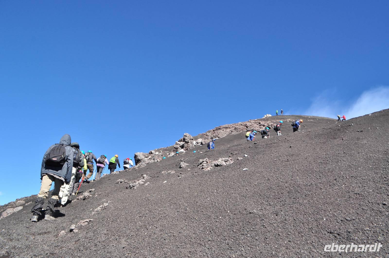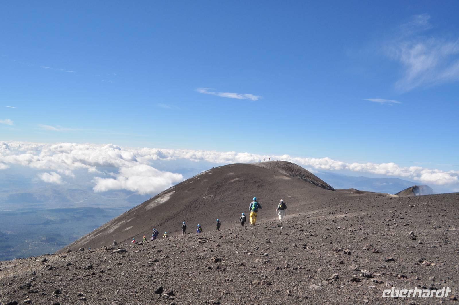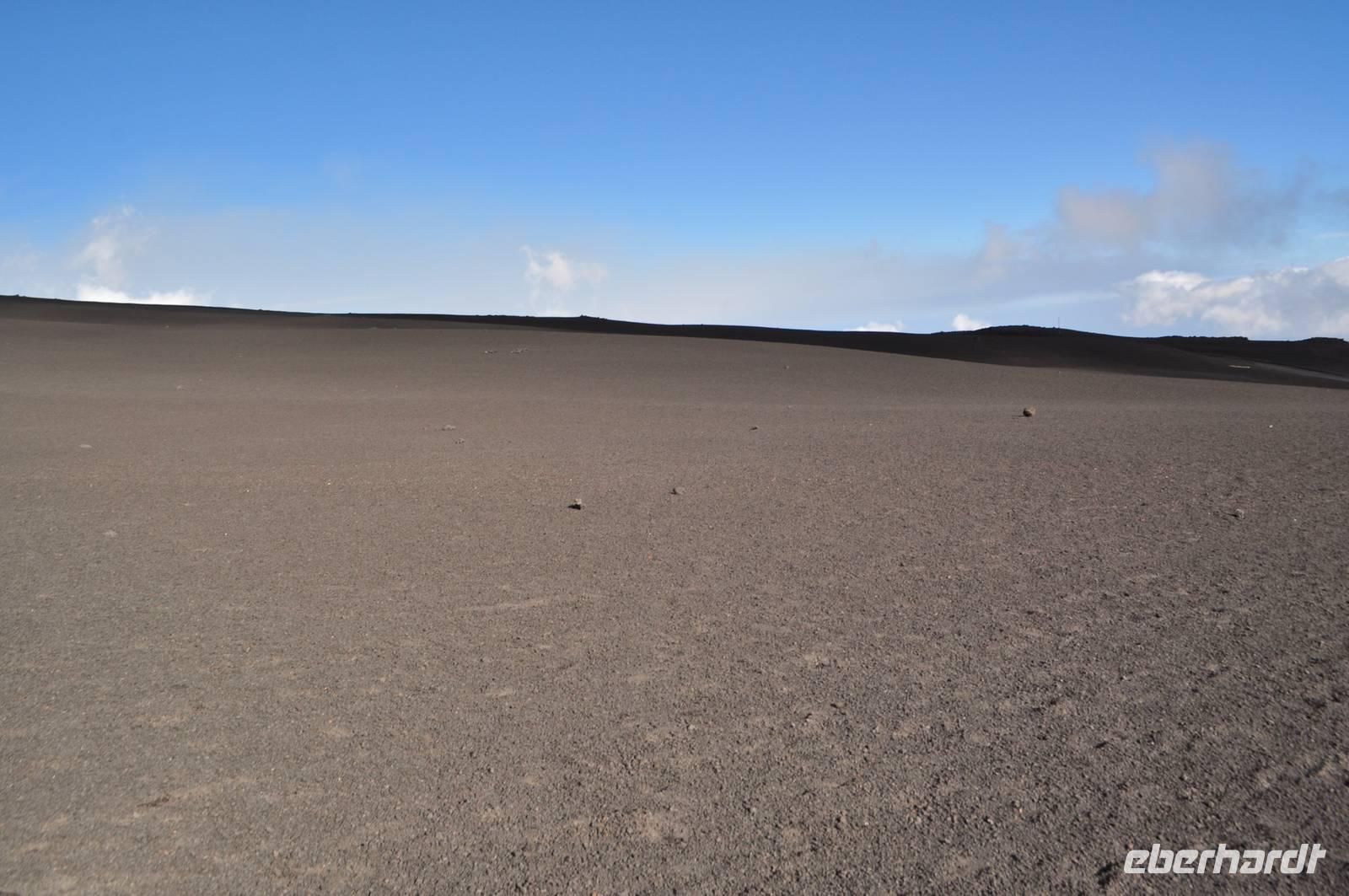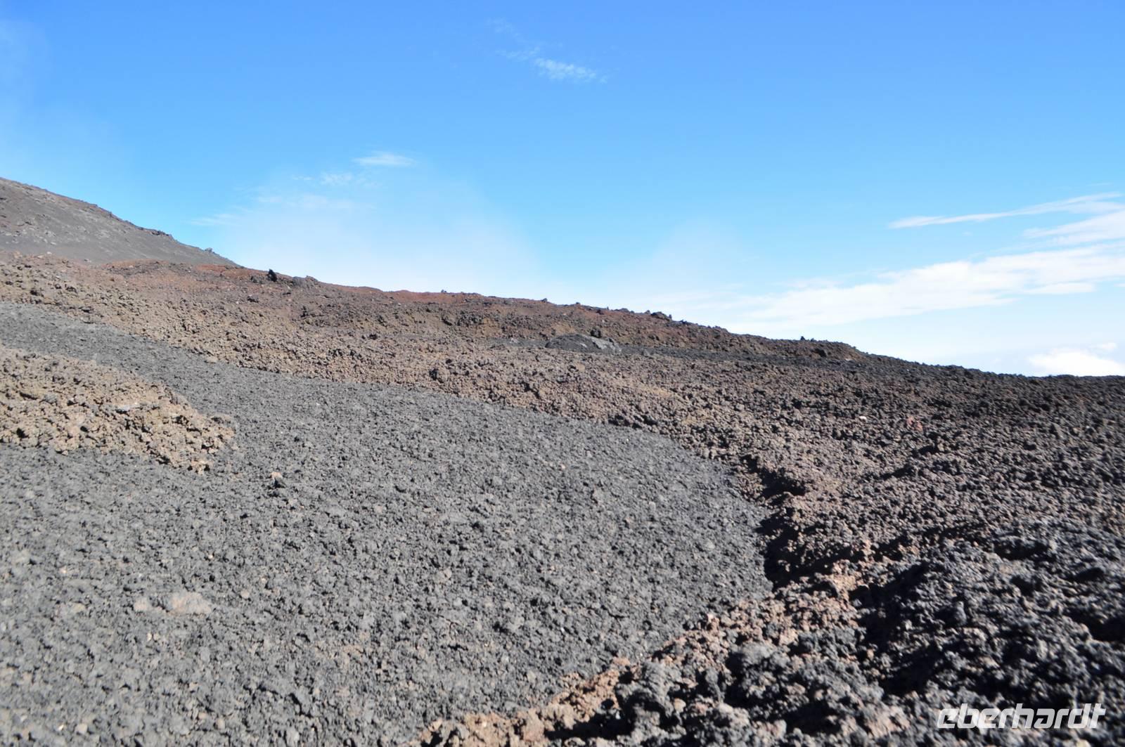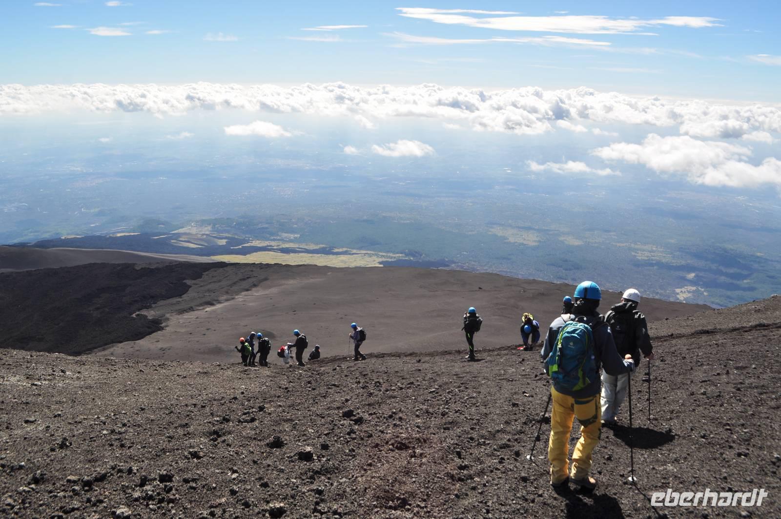 Ich bin überzeugt, dass dieser Moment allen Gästen noch lang in Erinnerung bleiben wird. Wir folgen dem Kraterrand in Richtung Südost-Krater. Immer neue Einblicke und Weitblicke eröffnen sich uns. Nach ca. einer Stunde Aufenthalt beginnen wir tiefbeeindruckt mit dem Abstieg. Auch das natürlich ein Abenteuer. Es geht in Richtung Südosten über ein steiles Aschefeld. Für den Abstieg, eine sogenannte Asche-Abfahrt wendet man idealerweise eine spezielle Gehtechnik an. Der Schwerpunkt wird vollständig auf die Fersen gelegt, unter zu Hilfenahme von Trekkingstöcken springt man eher als das man geht durch das weiche Material. Mit federnden Knien macht das unheimlich viel Spaß. Unabdingbar sind dafür neben den Stöcken auch hohe feste Schuhe, möglichst fest geschnürt.