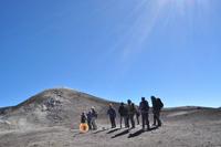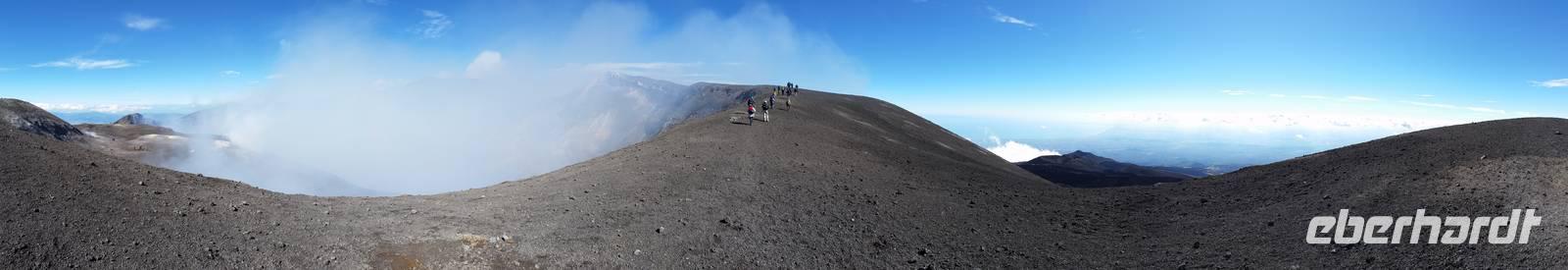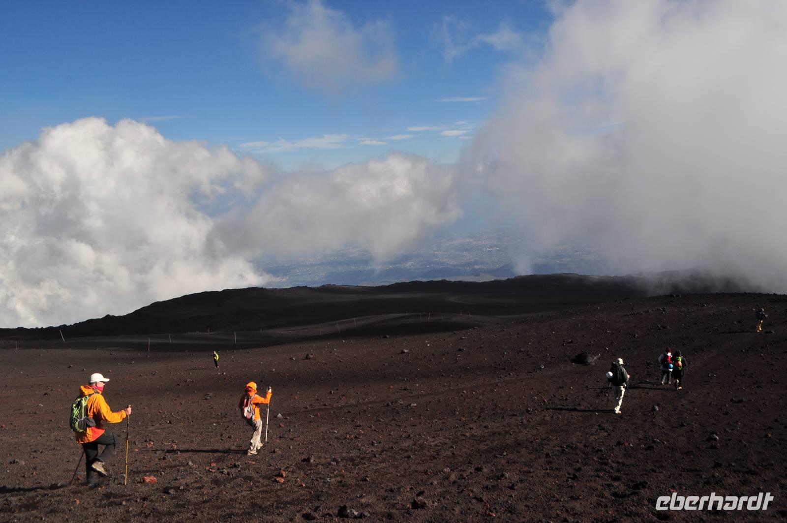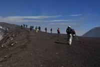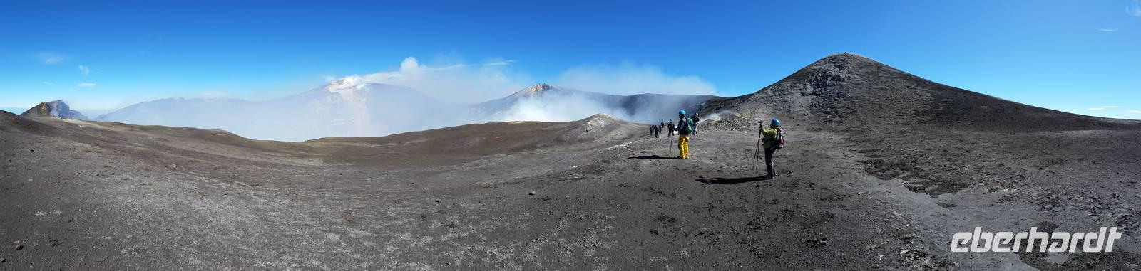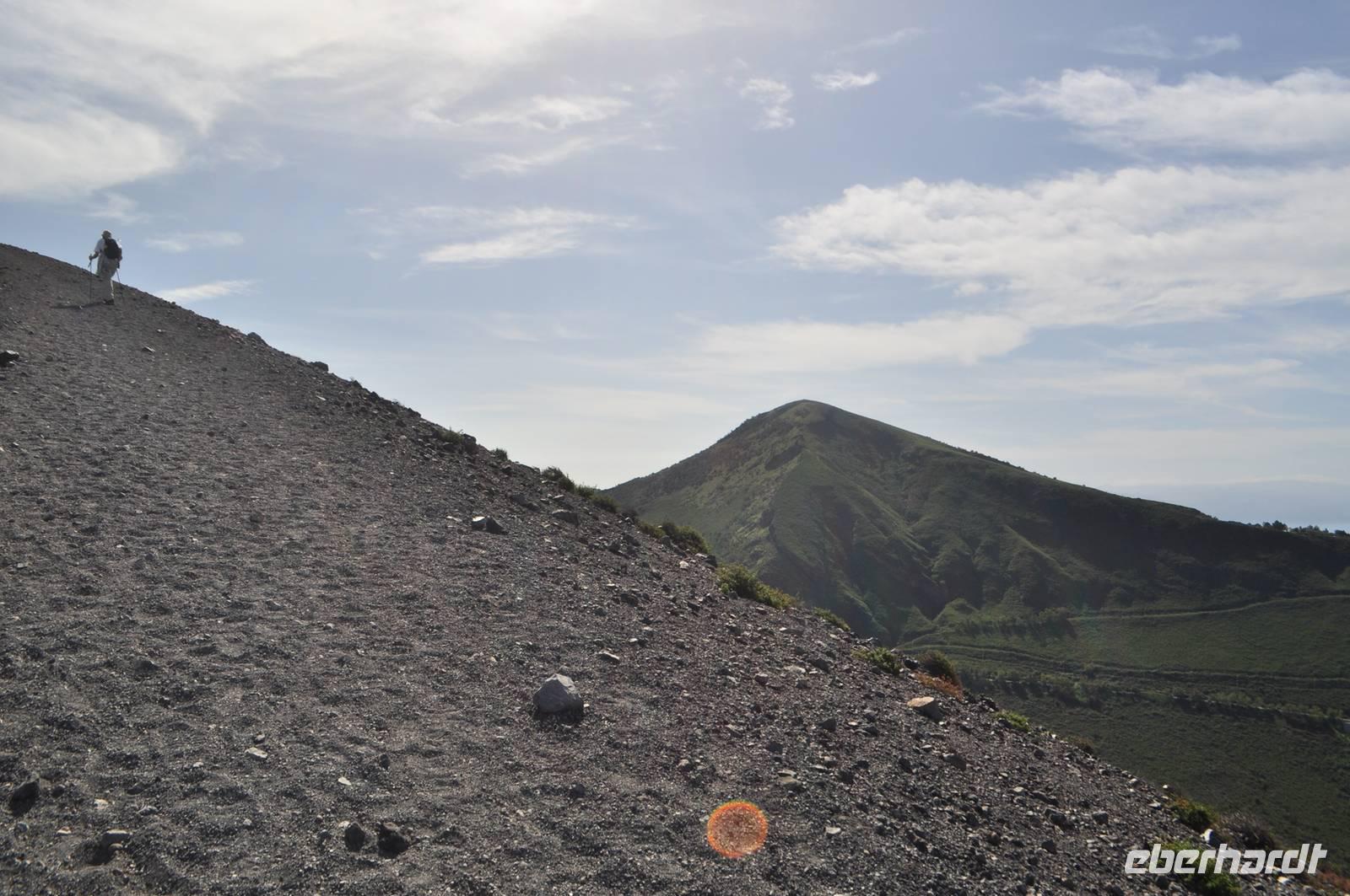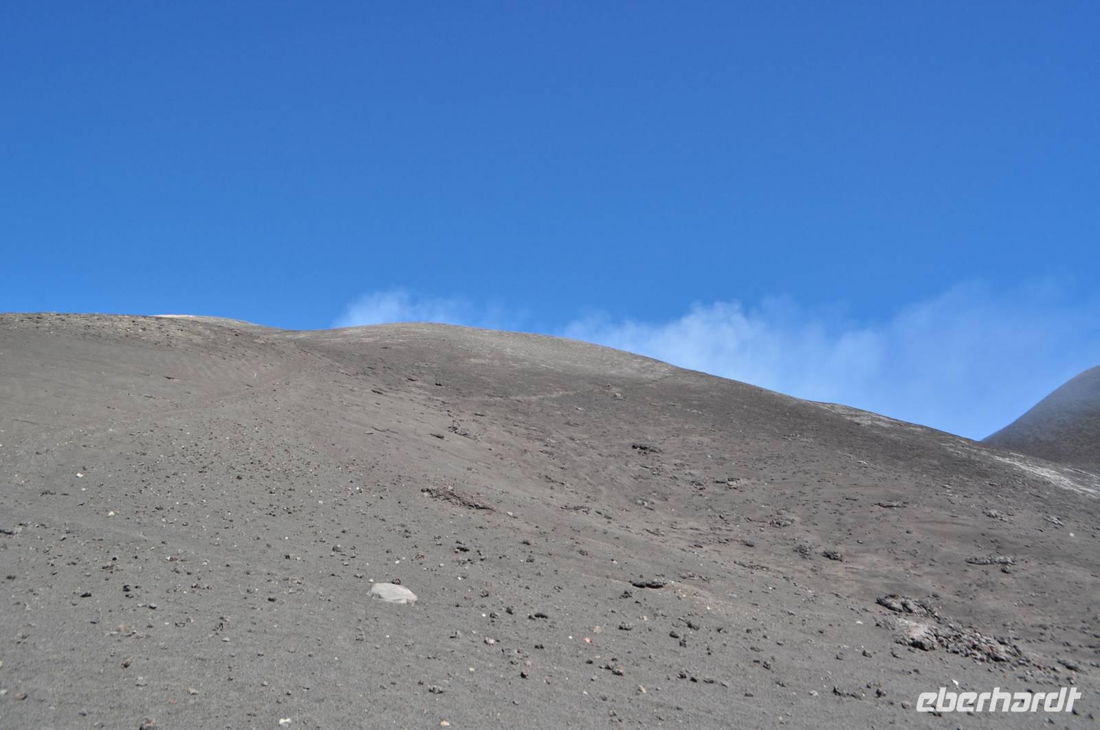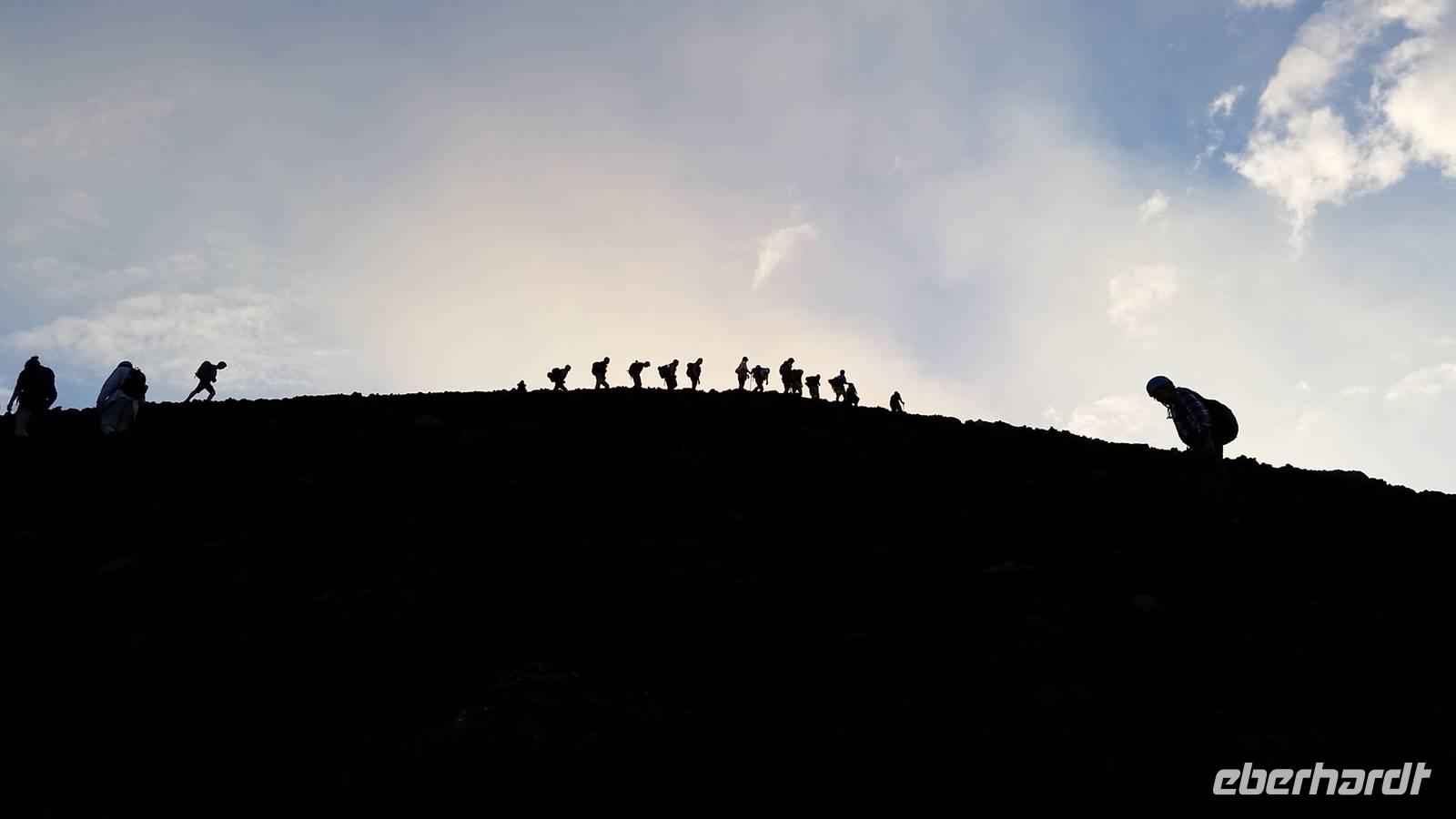 Ich bin überzeugt, dass dieser Moment allen Gästen noch lang in Erinnerung bleiben wird. Wir folgen dem Kraterrand in Richtung Südost-Krater. Immer neue Einblicke und Weitblicke eröffnen sich uns. Nach ca. einer Stunde Aufenthalt beginnen wir tiefbeeindruckt mit dem Abstieg. Auch das natürlich ein Abenteuer. Es geht in Richtung Südosten über ein steiles Aschefeld. Für den Abstieg, eine sogenannte Asche-Abfahrt wendet man idealerweise eine spezielle Gehtechnik an. Der Schwerpunkt wird vollständig auf die Fersen gelegt, unter zu Hilfenahme von Trekkingstöcken springt man eher als das man geht durch das weiche Material. Mit federnden Knien macht das unheimlich viel Spaß. Unabdingbar sind dafür neben den Stöcken auch hohe feste Schuhe, möglichst fest geschnürt.
