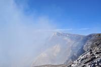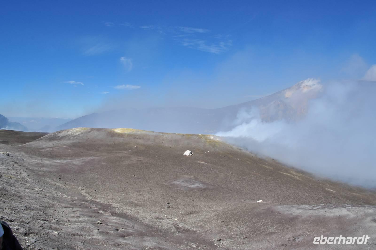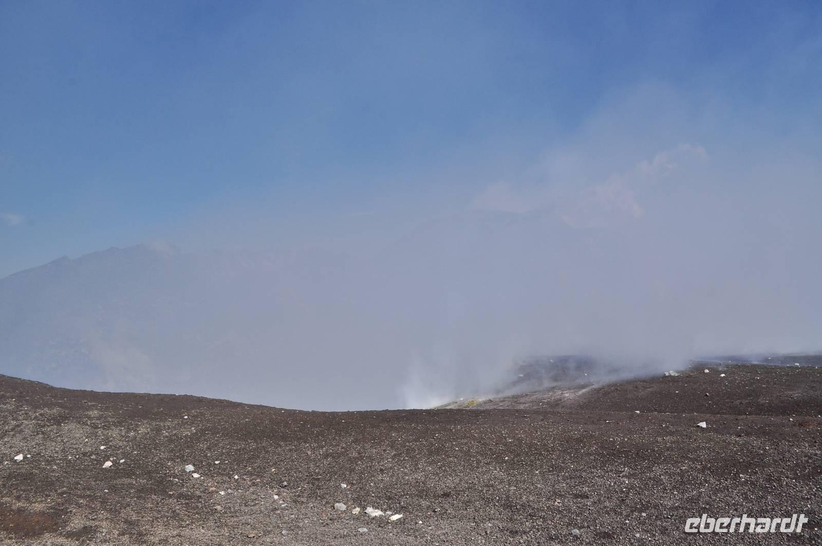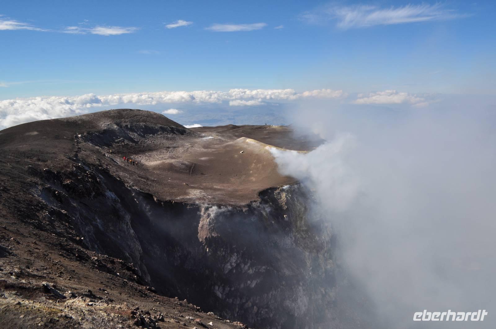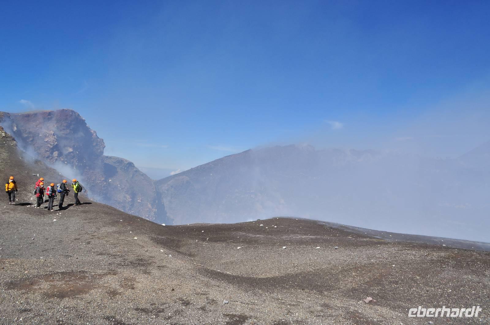 Bei ca. 7°C Lufttemperatur und eisigem Wind erreichen wir den Kraterrand des Bocca Nuova. Aus ihm steigt viel Gas auf. Zwischendrin erlaubt der Wind uns Blicke in diesen gewaltigen Krater. In Zweier-Trupps dürfen wir unter Aufsicht über den Kante in das Kraterinnere blicken. Mehr wir ein paar Augenblicke sind jedoch angesichts des beißenden sauren Dampfes nicht möglich. Voragine und Bocca Nuova bilden nach den Ausbrüchen um das Jahr 2000 nahezu einen Krater mit einem unglaublichen Durchmesser von gut 900m.