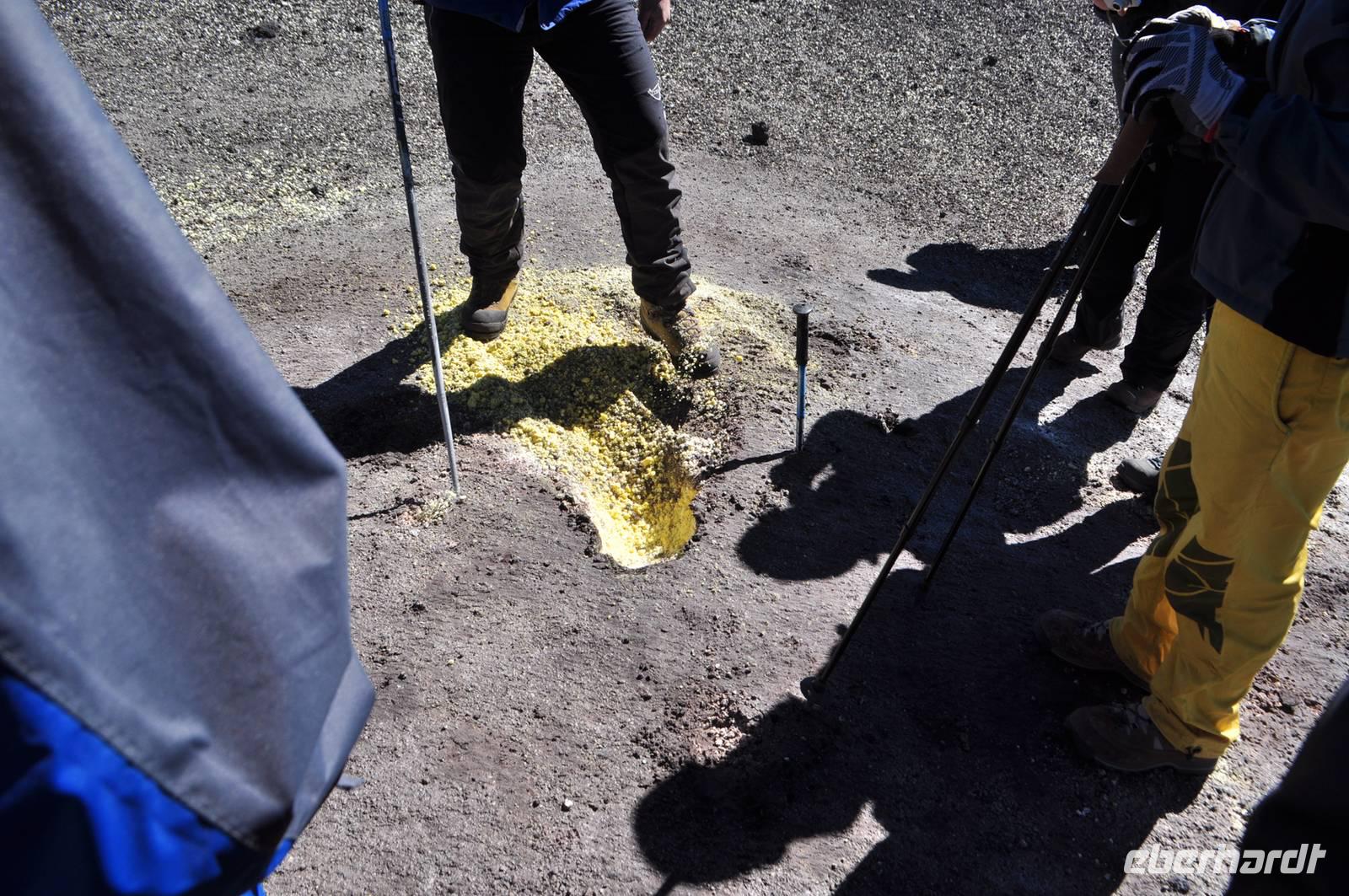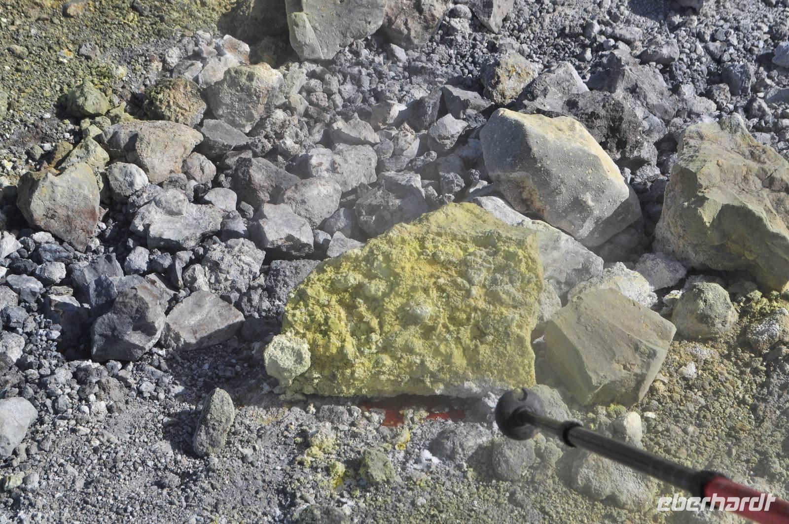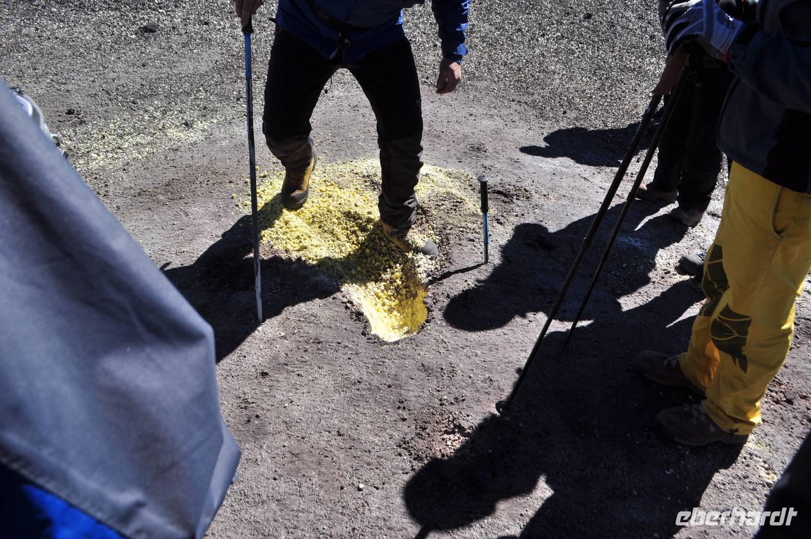 Wir haben das Glück auf dieser Reise Chemiker dabei zu haben, die uns ein wenig über Schwefel und seine chemischen Verbindungen erläutern. Meine wichtigste Erkenntnis, so lange Schwefeldämpfe „stinken" ist die Konzentration für den Menschen vielleicht unangenehm, aber nicht gefährlich. Steigt die Konzentration stinken Schwefelverbindungen nicht mehr und werden gefährlich. Während wir darüber sprechen, müssen wir beobachten wie Personen ohne Schutz zum Kraterboden absteigen. Ein gefährliches Unterfangen, da man nicht sicher sein kann ob sich lebensbedrohliche Gase angesammelt haben.