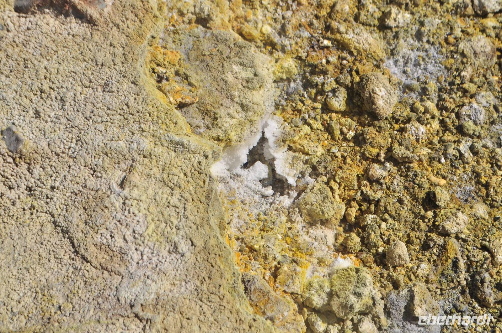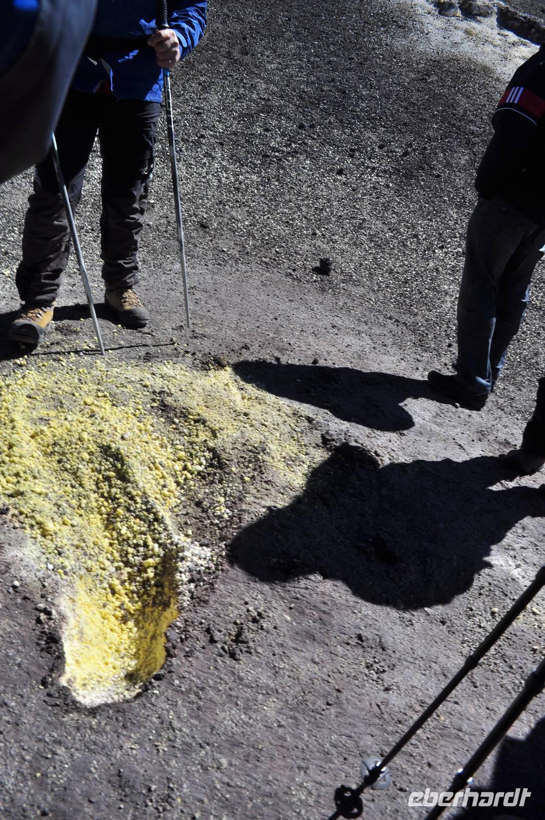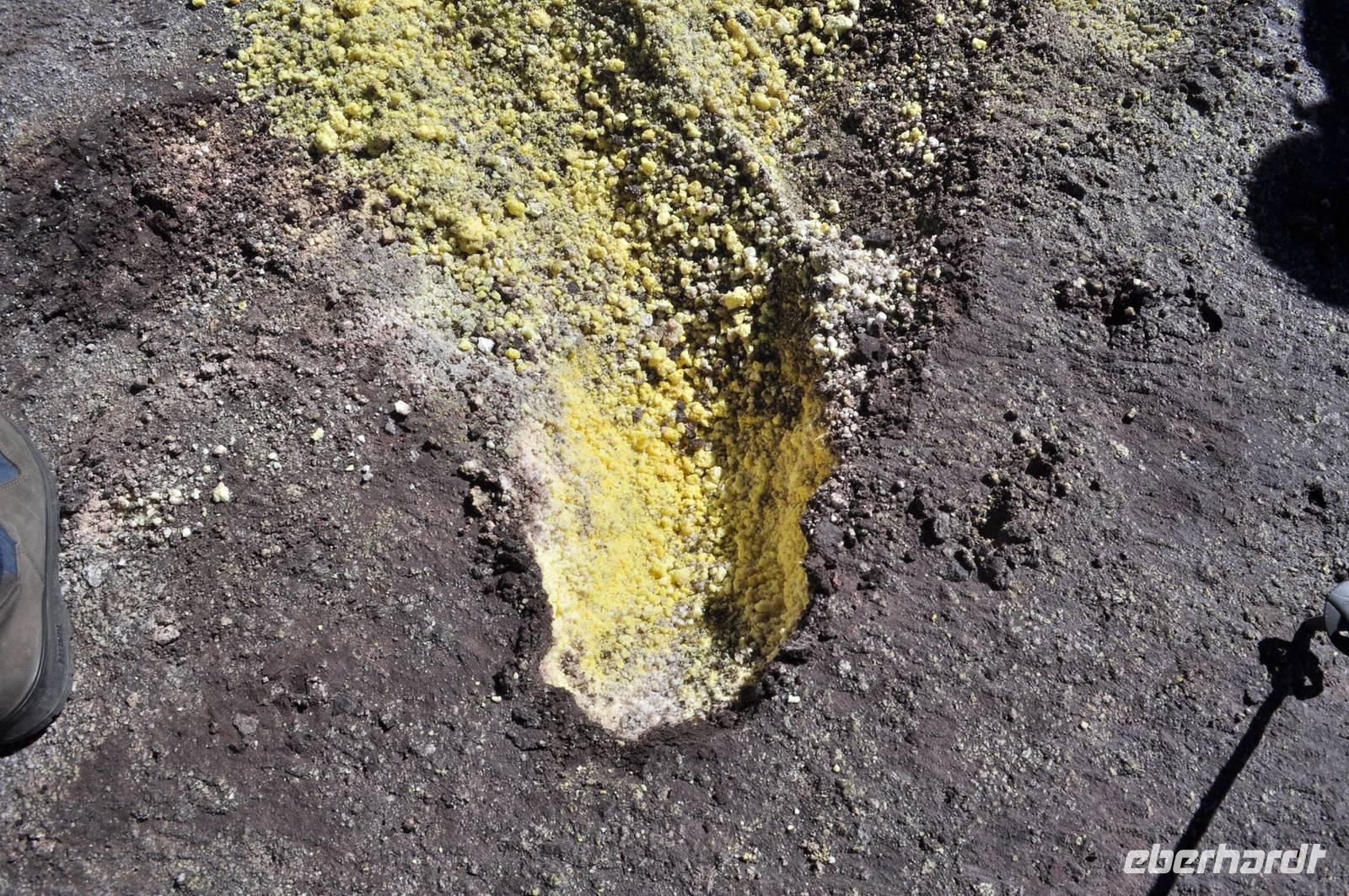Wir haben das Glück auf dieser Reise Chemiker dabei zu haben, die uns ein wenig über Schwefel und seine chemischen Verbindungen erläutern. Meine wichtigste Erkenntnis, so lange Schwefeldämpfe „stinken" ist die Konzentration für den Menschen vielleicht unangenehm, aber nicht gefährlich. Steigt die Konzentration stinken Schwefelverbindungen nicht mehr und werden gefährlich. Während wir darüber sprechen, müssen wir beobachten wie Personen ohne Schutz zum Kraterboden absteigen. Ein gefährliches Unterfangen, da man nicht sicher sein kann ob sich lebensbedrohliche Gase angesammelt haben.