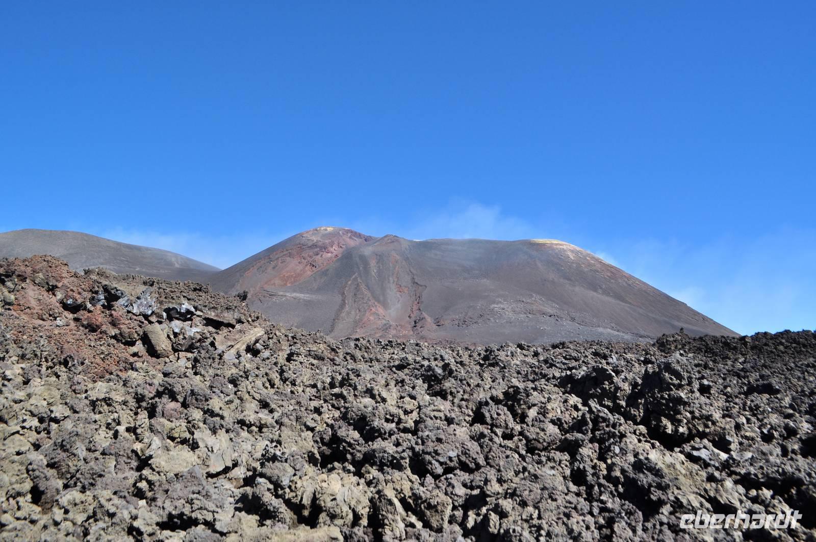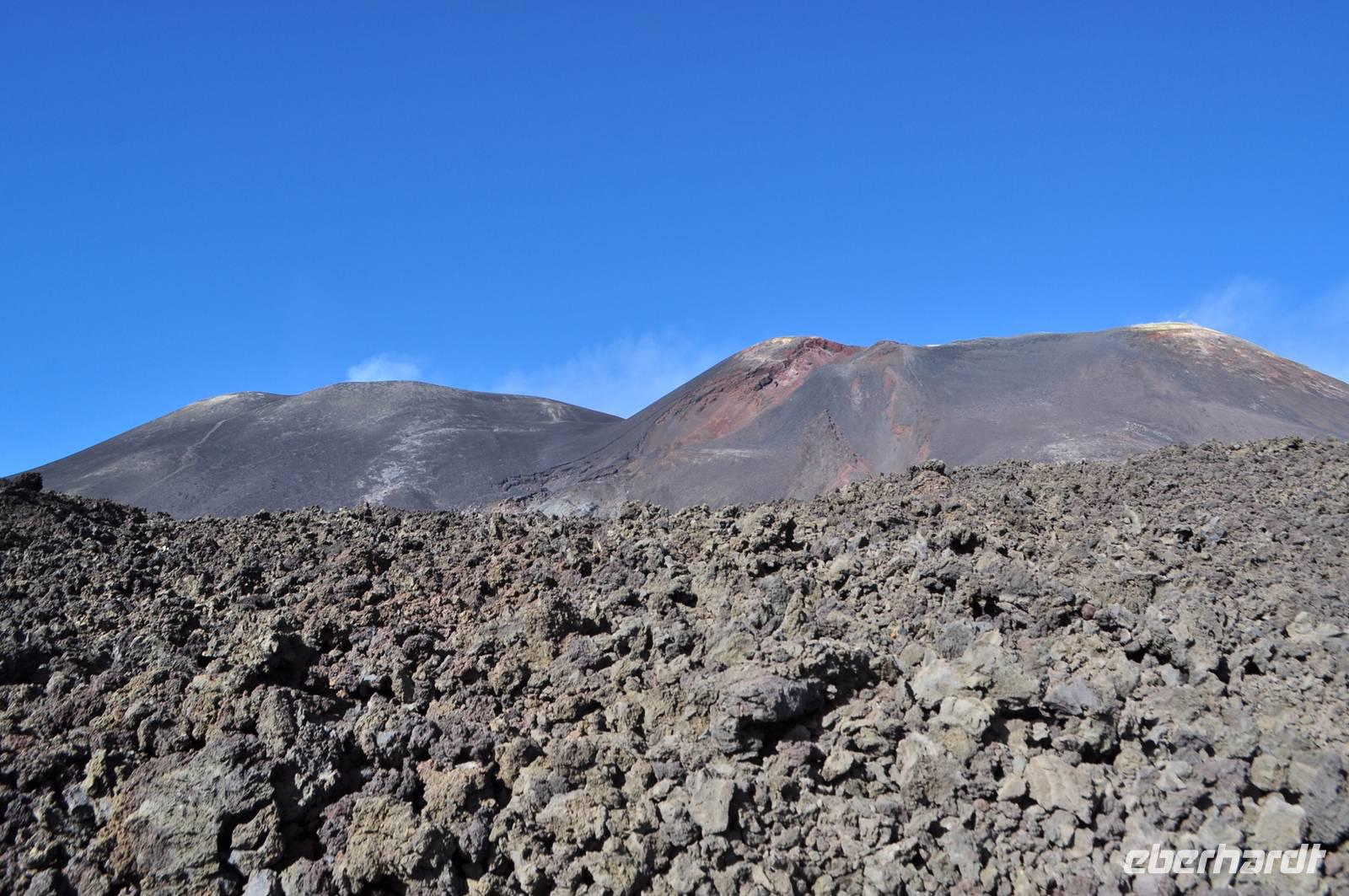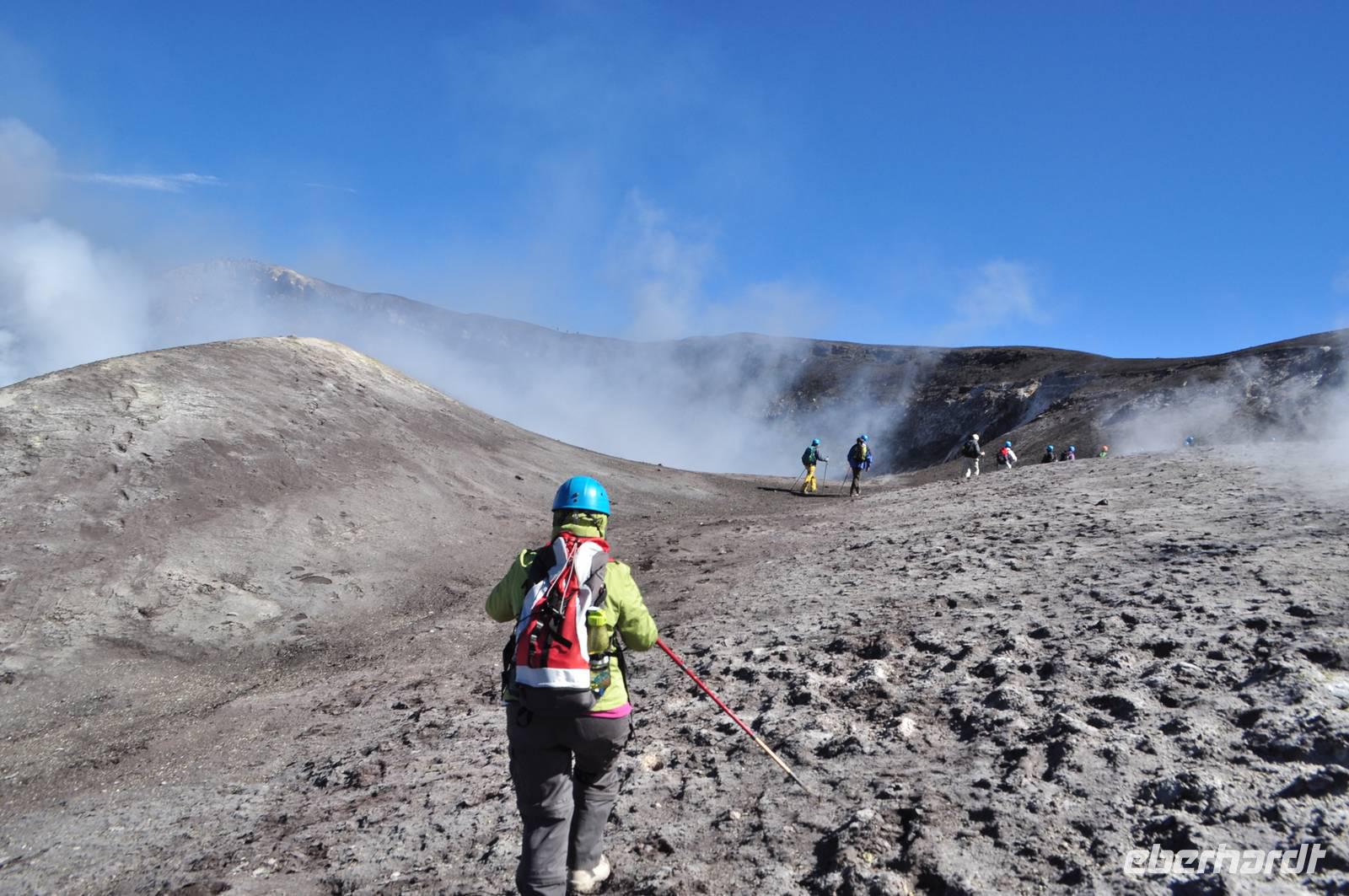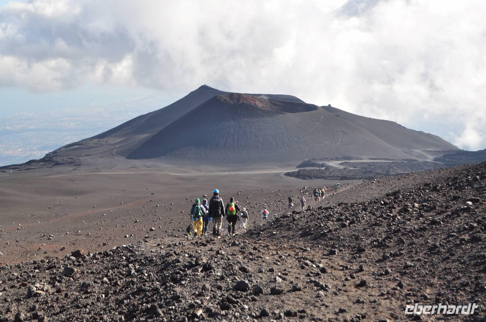 Wir steigen von Südwesten her auf. Der Ätna hat gegenwärtig fünf Hauptkrater, die von der Hochebene Piano del Lago aufragen. Ab 1788 wuchs von dieser Ebene der neue Zentralkegel empor. Im Jahr 1911 entstand der sogenannte Nordostkegel. Im Zentralkomplex folgte 1968 dann der Bocca Nuova, der „Neuer Schlund" über den wir aufsteigen. Der eigentliche Hauptkrater, die sogenannte Voragine wurde nur durch einen schmalen Grat getrennt. Der aktivste Krater der letzten Jahrzehnte ist der Südostkrater, der ab dem Jahr 1979 entstand.
