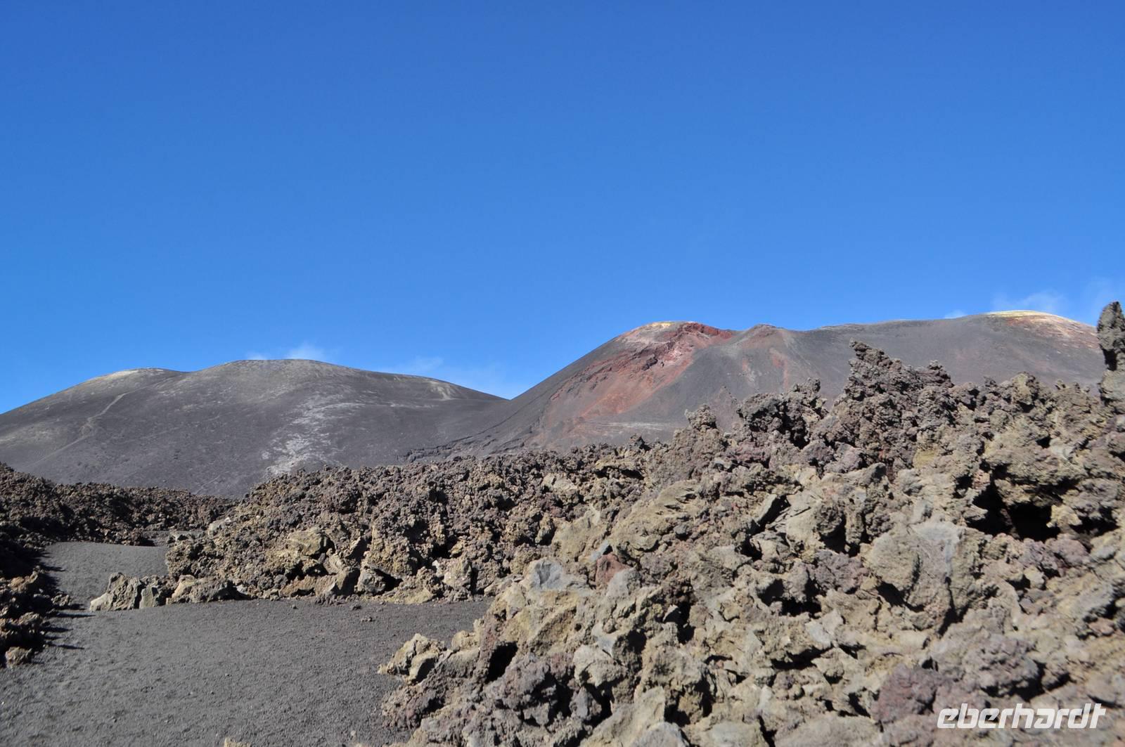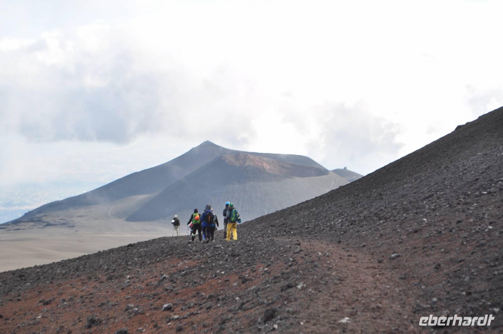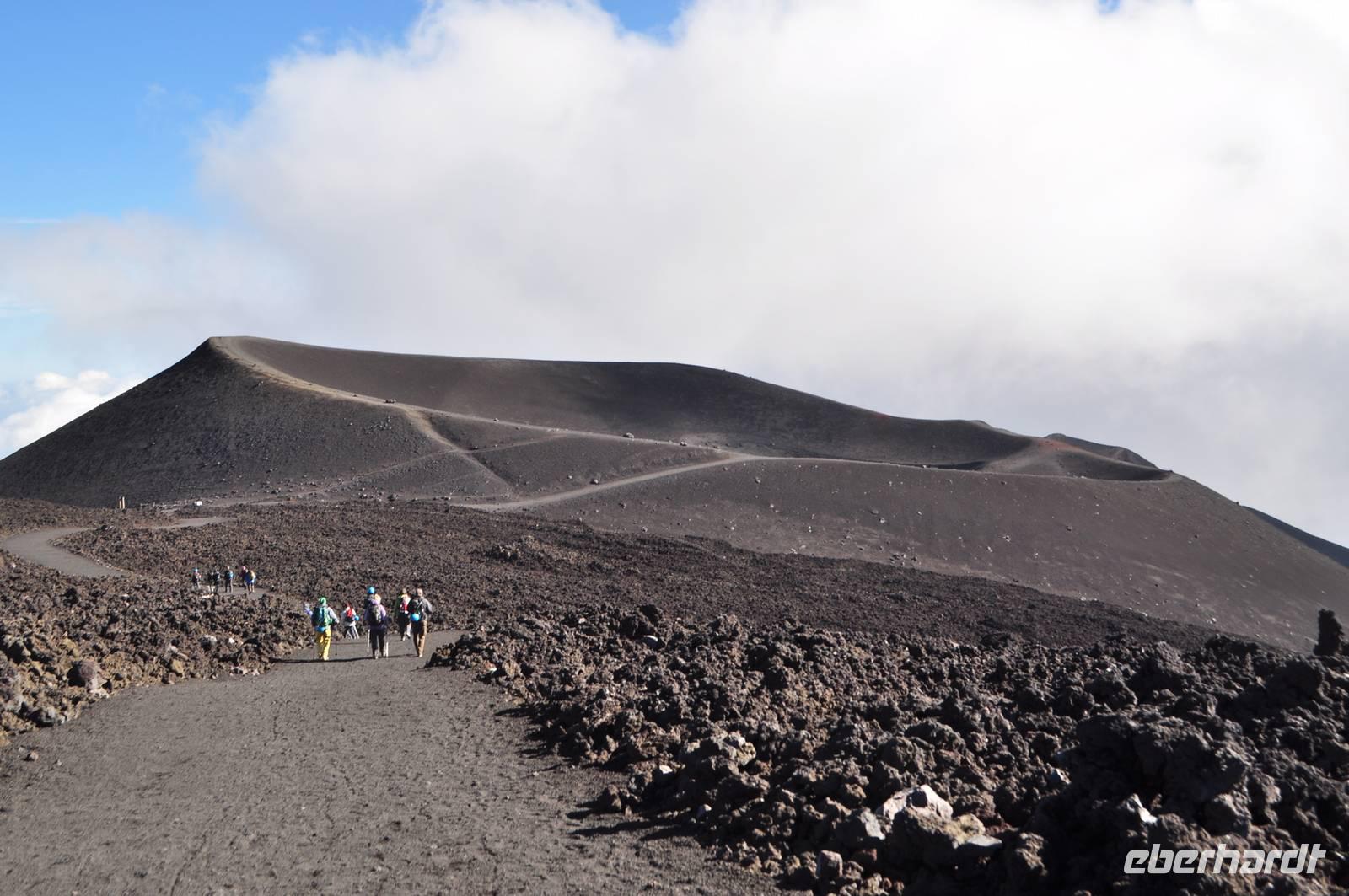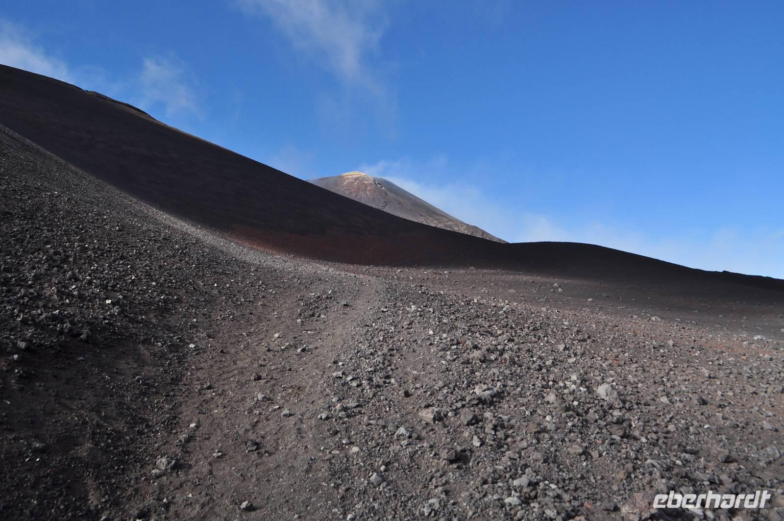 Wir steigen von Südwesten her auf. Der Ätna hat gegenwärtig fünf Hauptkrater, die von der Hochebene Piano del Lago aufragen. Ab 1788 wuchs von dieser Ebene der neue Zentralkegel empor. Im Jahr 1911 entstand der sogenannte Nordostkegel. Im Zentralkomplex folgte 1968 dann der Bocca Nuova, der „Neuer Schlund" über den wir aufsteigen. Der eigentliche Hauptkrater, die sogenannte Voragine wurde nur durch einen schmalen Grat getrennt. Der aktivste Krater der letzten Jahrzehnte ist der Südostkrater, der ab dem Jahr 1979 entstand.