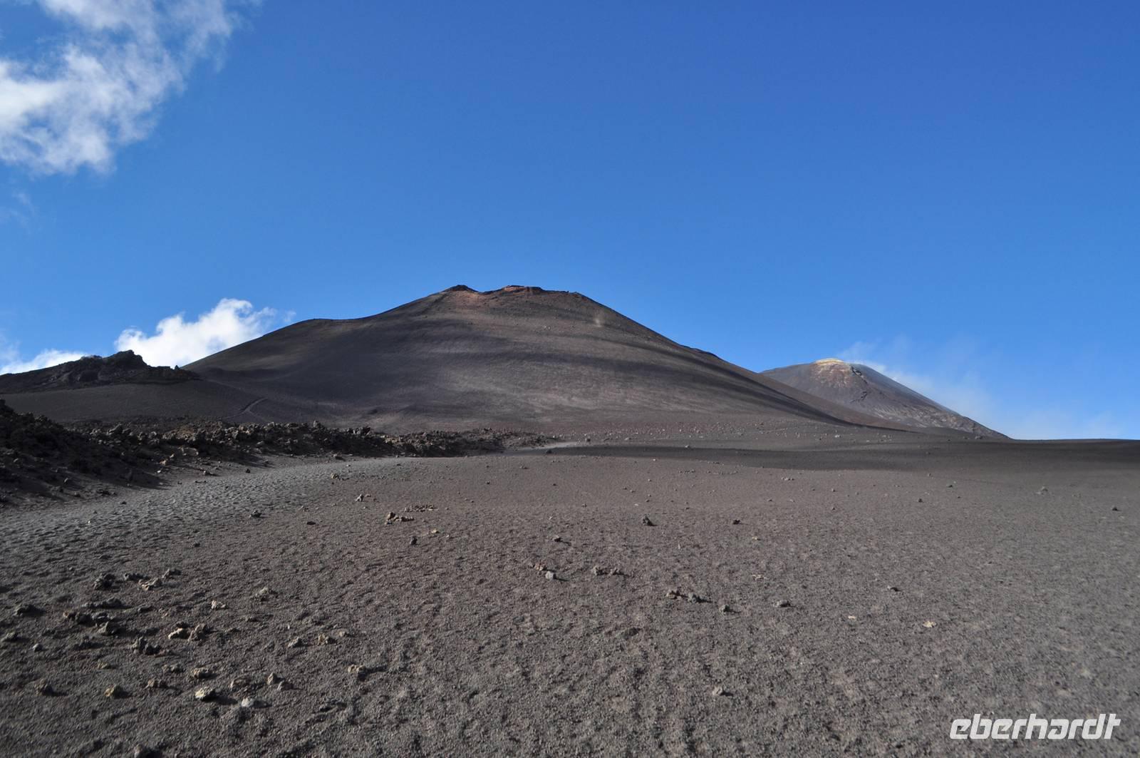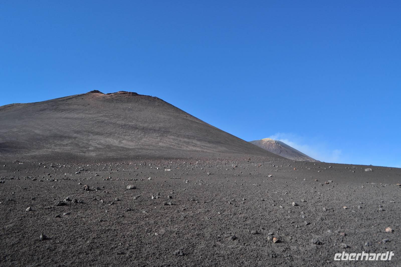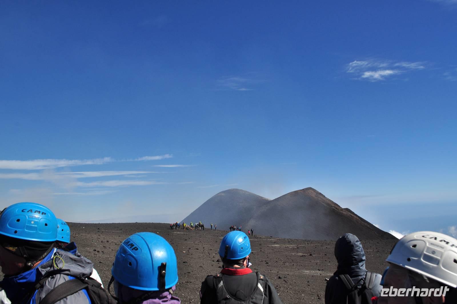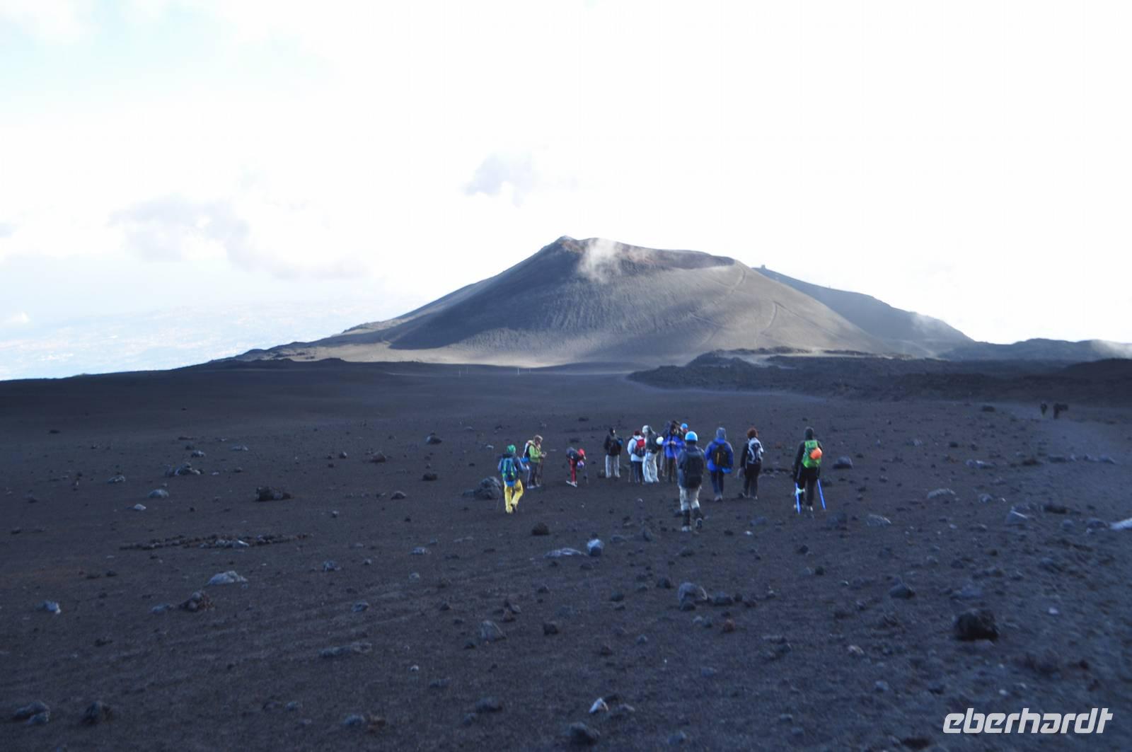 Wir steigen von Südwesten her auf. Der Ätna hat gegenwärtig fünf Hauptkrater, die von der Hochebene Piano del Lago aufragen. Ab 1788 wuchs von dieser Ebene der neue Zentralkegel empor. Im Jahr 1911 entstand der sogenannte Nordostkegel. Im Zentralkomplex folgte 1968 dann der Bocca Nuova, der „Neuer Schlund" über den wir aufsteigen. Der eigentliche Hauptkrater, die sogenannte Voragine wurde nur durch einen schmalen Grat getrennt. Der aktivste Krater der letzten Jahrzehnte ist der Südostkrater, der ab dem Jahr 1979 entstand.