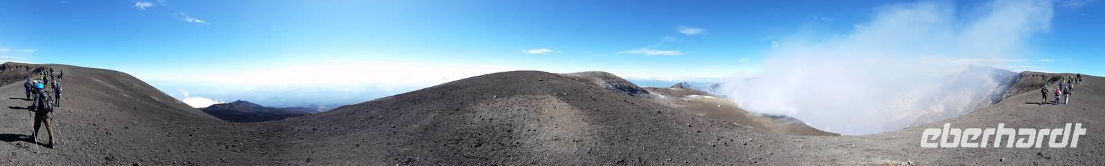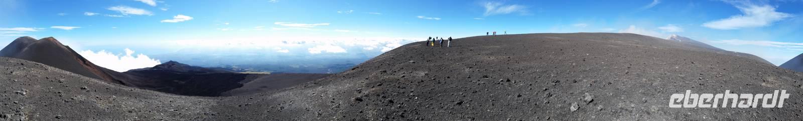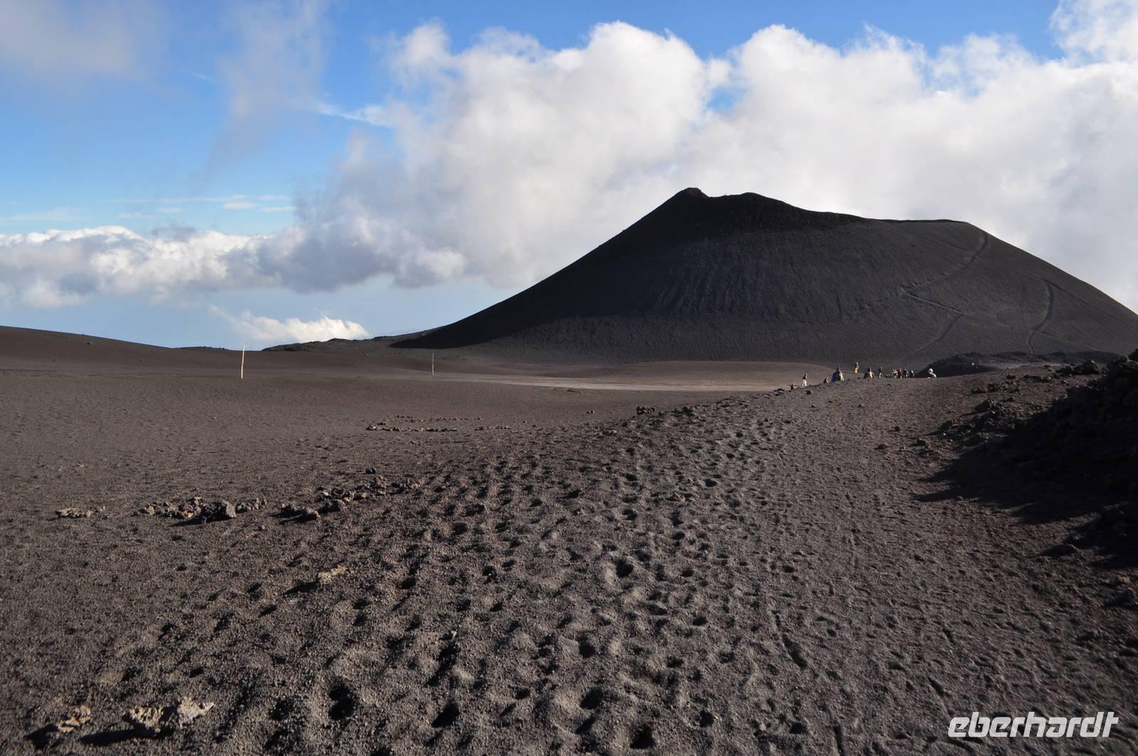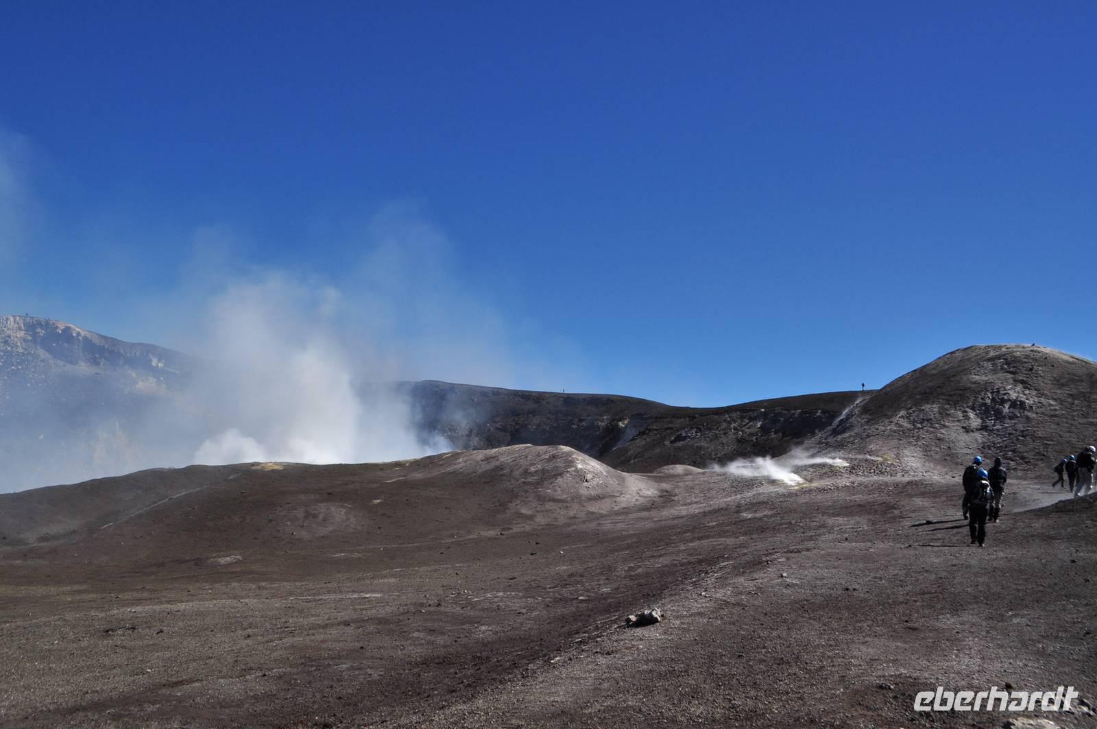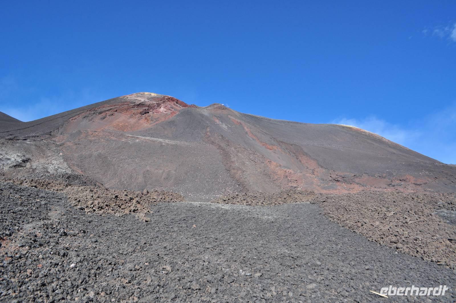 Wir steigen von Südwesten her auf. Der Ätna hat gegenwärtig fünf Hauptkrater, die von der Hochebene Piano del Lago aufragen. Ab 1788 wuchs von dieser Ebene der neue Zentralkegel empor. Im Jahr 1911 entstand der sogenannte Nordostkegel. Im Zentralkomplex folgte 1968 dann der Bocca Nuova, der „Neuer Schlund" über den wir aufsteigen. Der eigentliche Hauptkrater, die sogenannte Voragine wurde nur durch einen schmalen Grat getrennt. Der aktivste Krater der letzten Jahrzehnte ist der Südostkrater, der ab dem Jahr 1979 entstand.