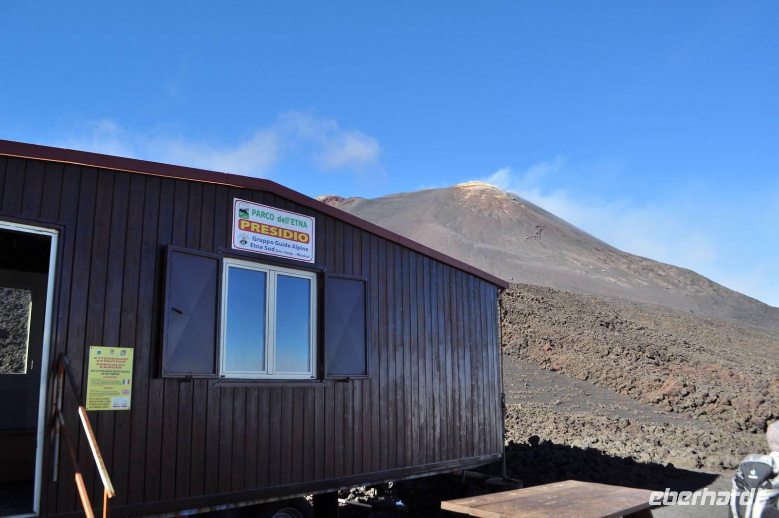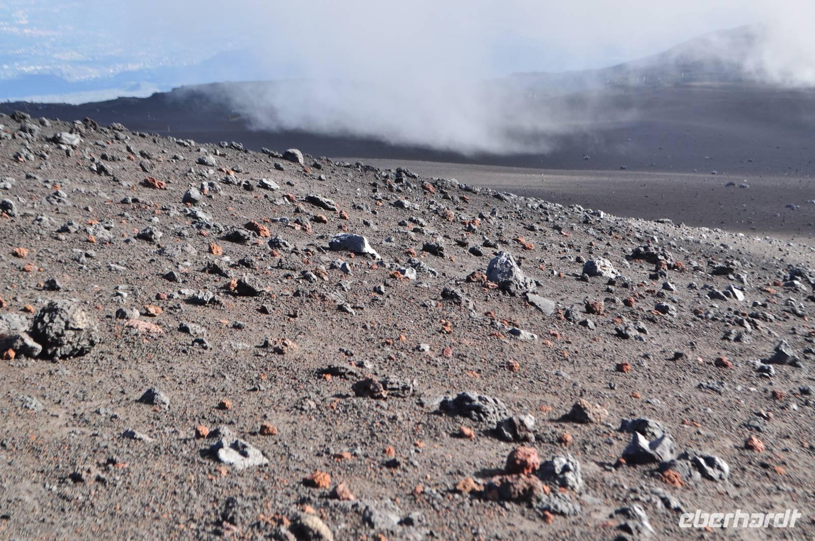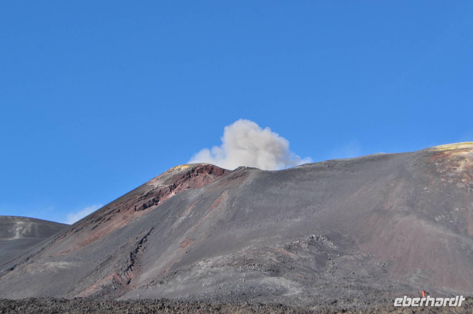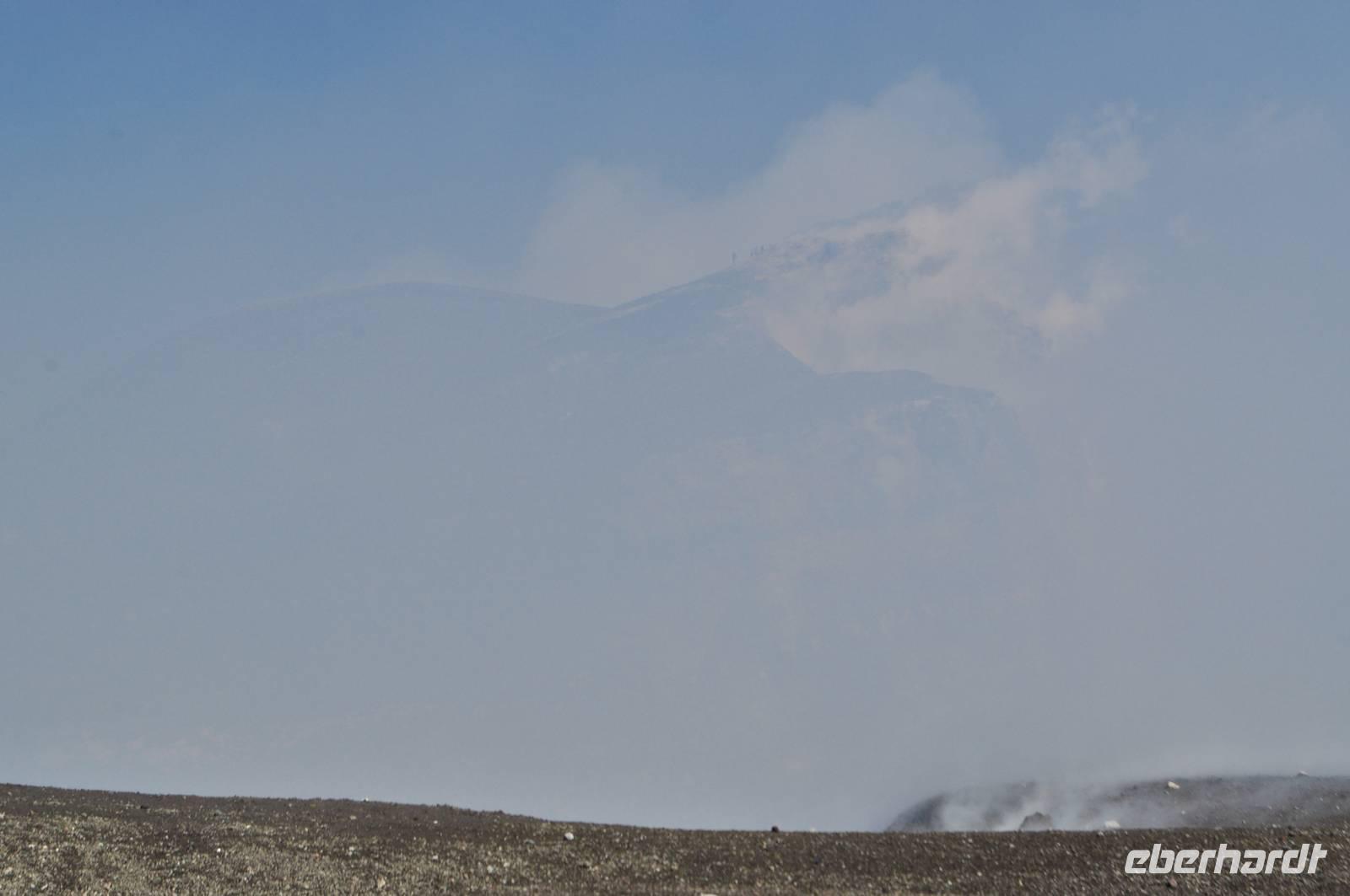 Während der Auffahrt bekomme ich die Info, dass die Aktivität des Ätna in den letzten Stunden zugenommen hat, die letzte größere Explosion fand nach mehreren Monaten Pause heute Morgen gegen 7 Uhr statt. Ebenso hat die seismische Aktivität zugenommen. Das Ausgasen der Hauptkrater seien ebenso Indizien für eine Eruption. Ich solle mir aber keine Sorgen machen die Emission ist heute „nicht hoch", sondern „sehr hoch"!