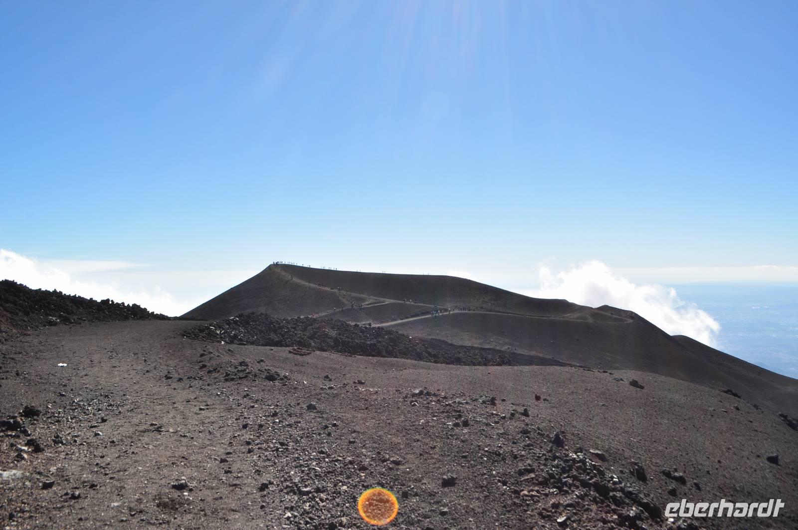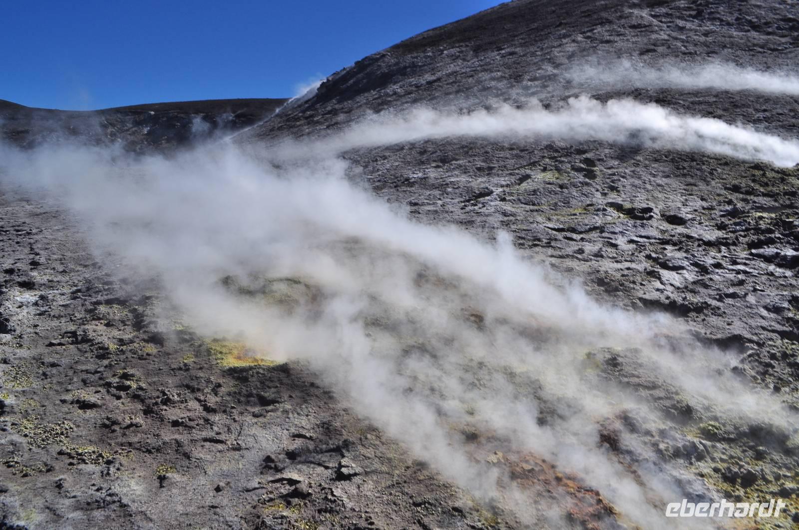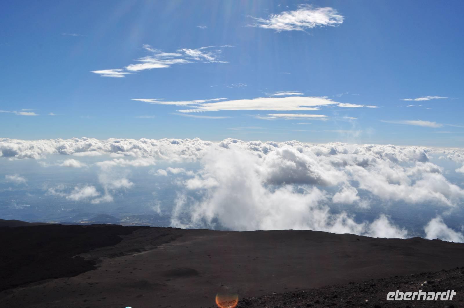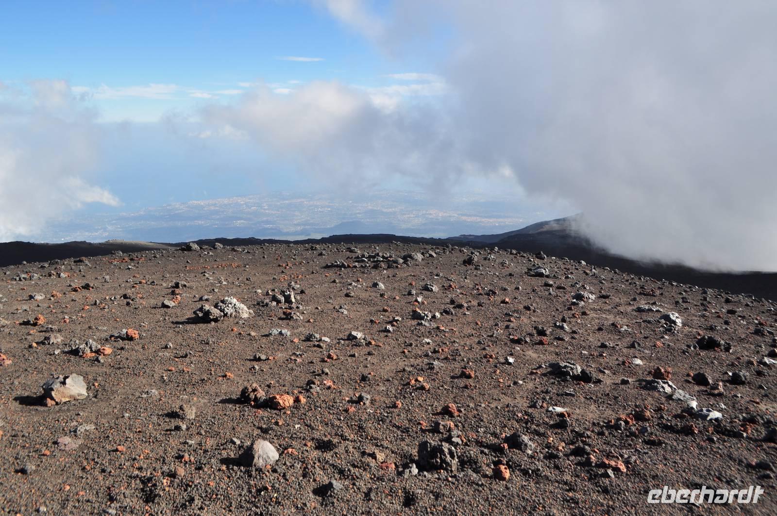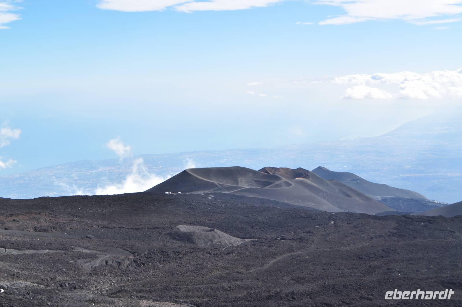 Während der Auffahrt bekomme ich die Info, dass die Aktivität des Ätna in den letzten Stunden zugenommen hat, die letzte größere Explosion fand nach mehreren Monaten Pause heute Morgen gegen 7 Uhr statt. Ebenso hat die seismische Aktivität zugenommen. Das Ausgasen der Hauptkrater seien ebenso Indizien für eine Eruption. Ich solle mir aber keine Sorgen machen die Emission ist heute „nicht hoch", sondern „sehr hoch"!