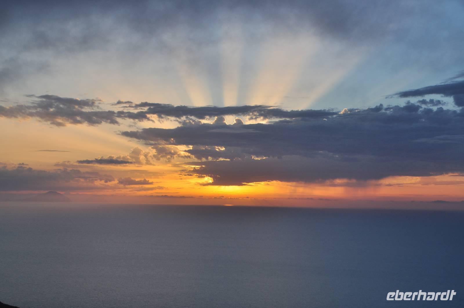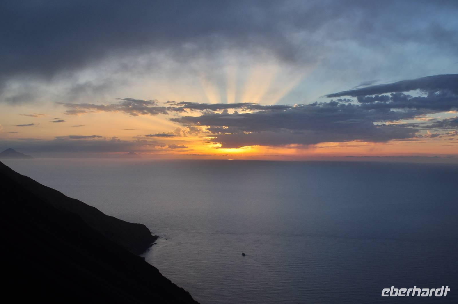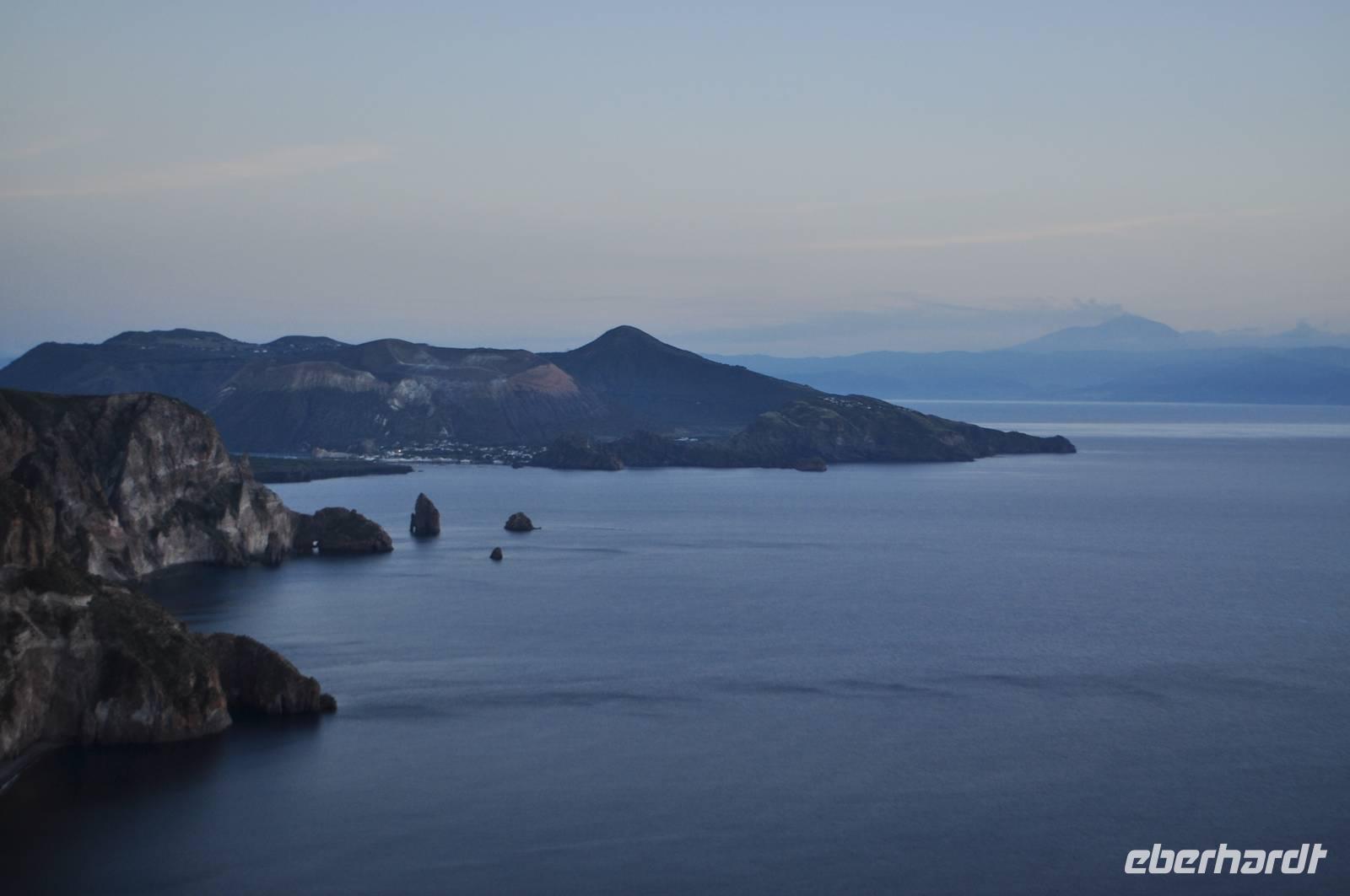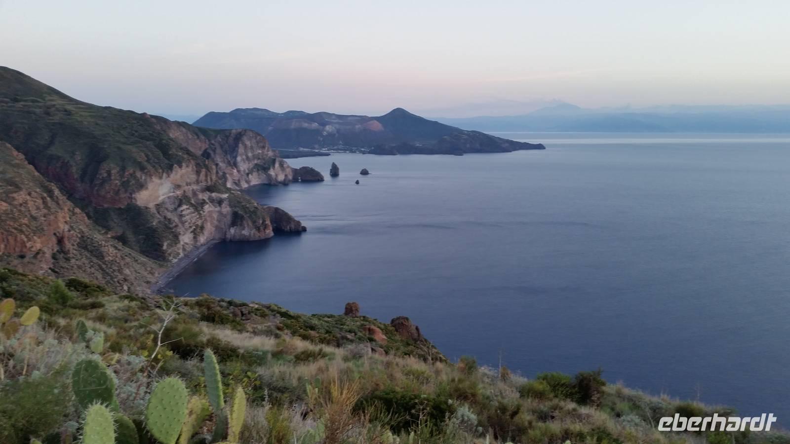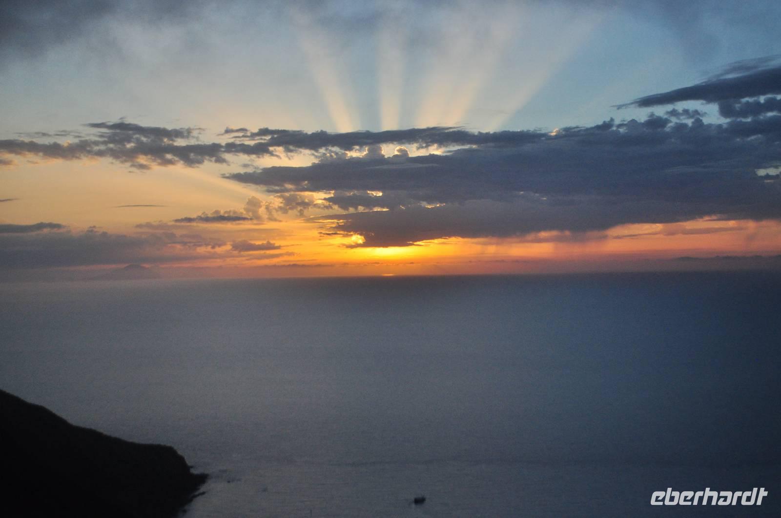 Man benötigt vier Augen (Quattroocci) um die ganze Schönheit dieses Ausblickes zu genießen. Unmittelbar vor Sonnenuntergang treffen wir ein und genießen den klaren Blick nach Vulcano.