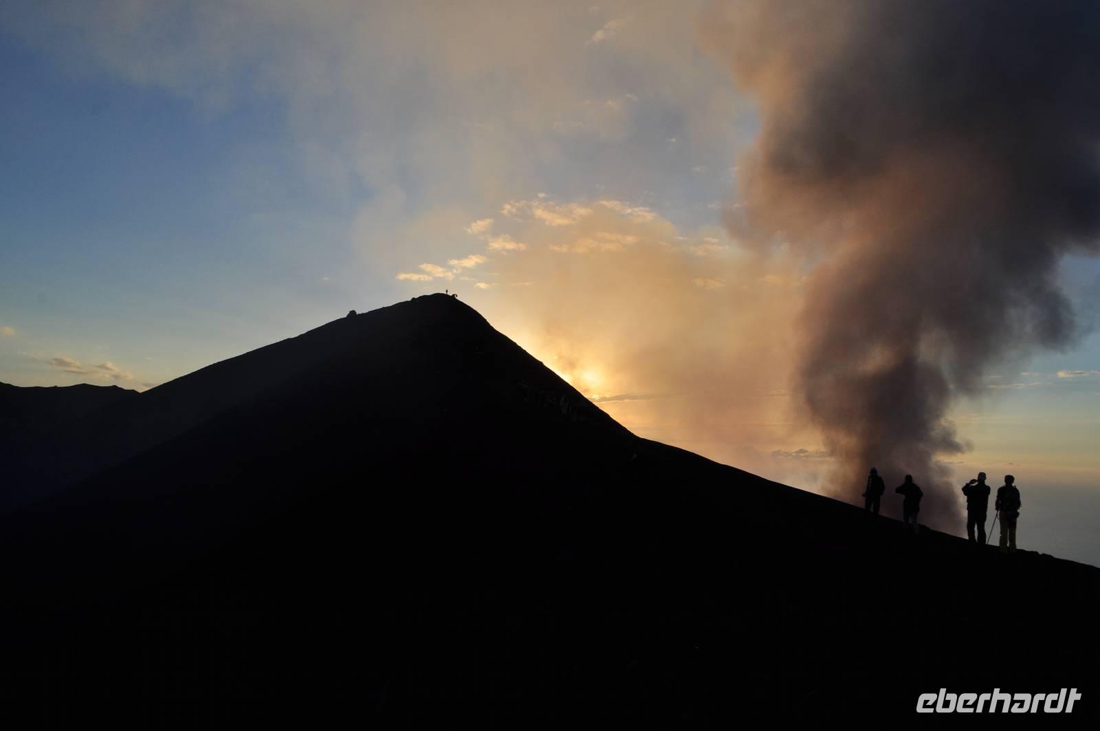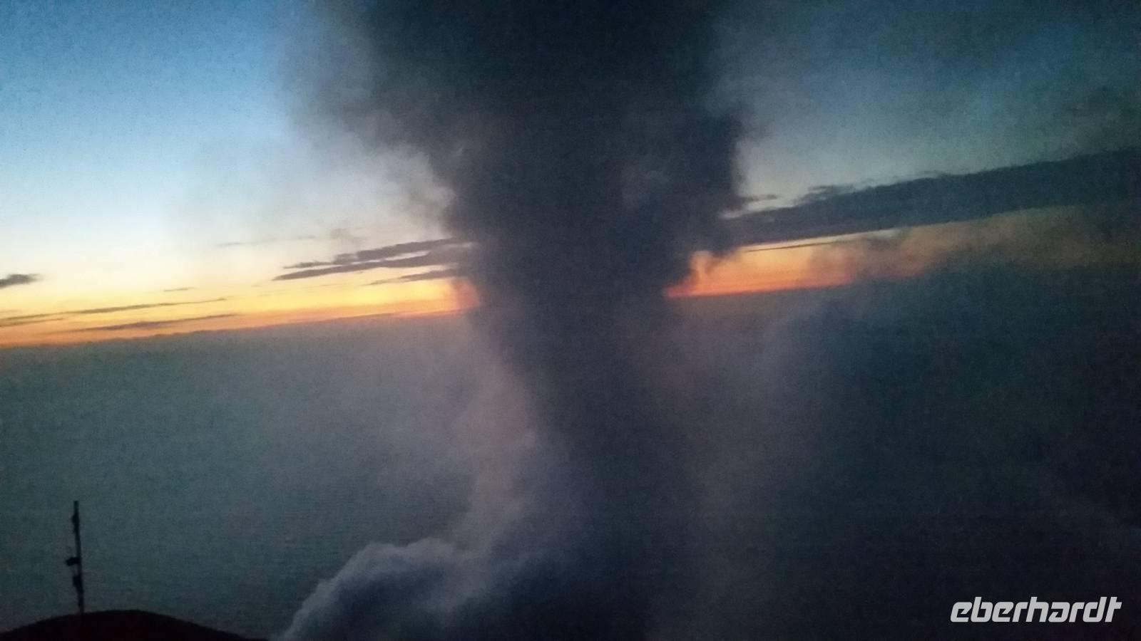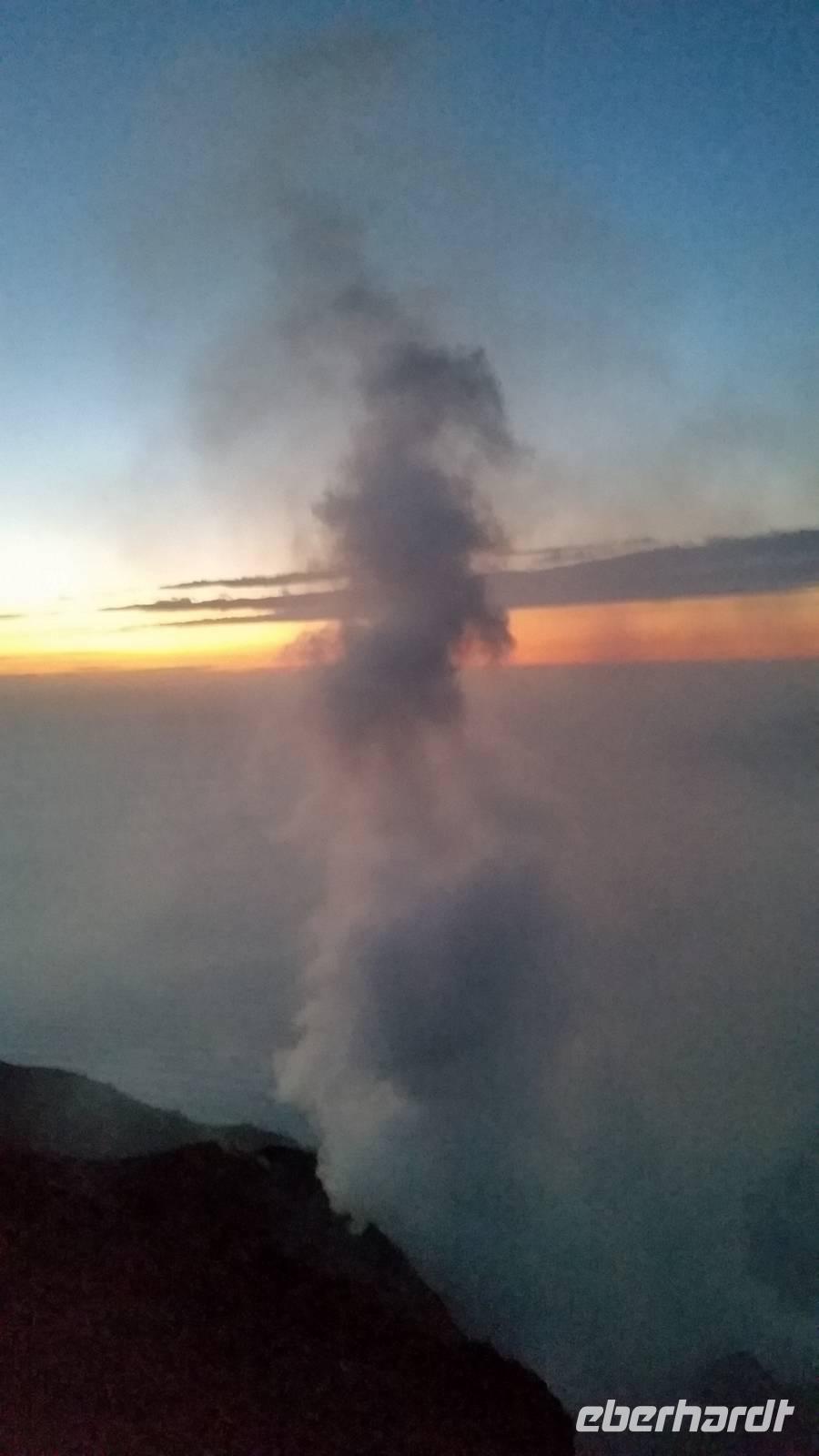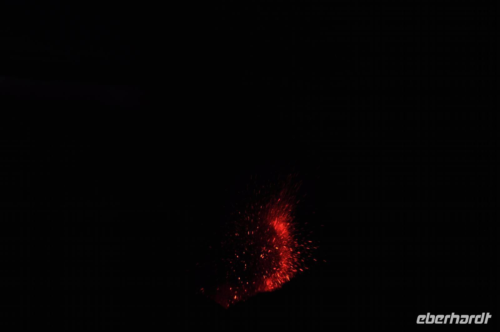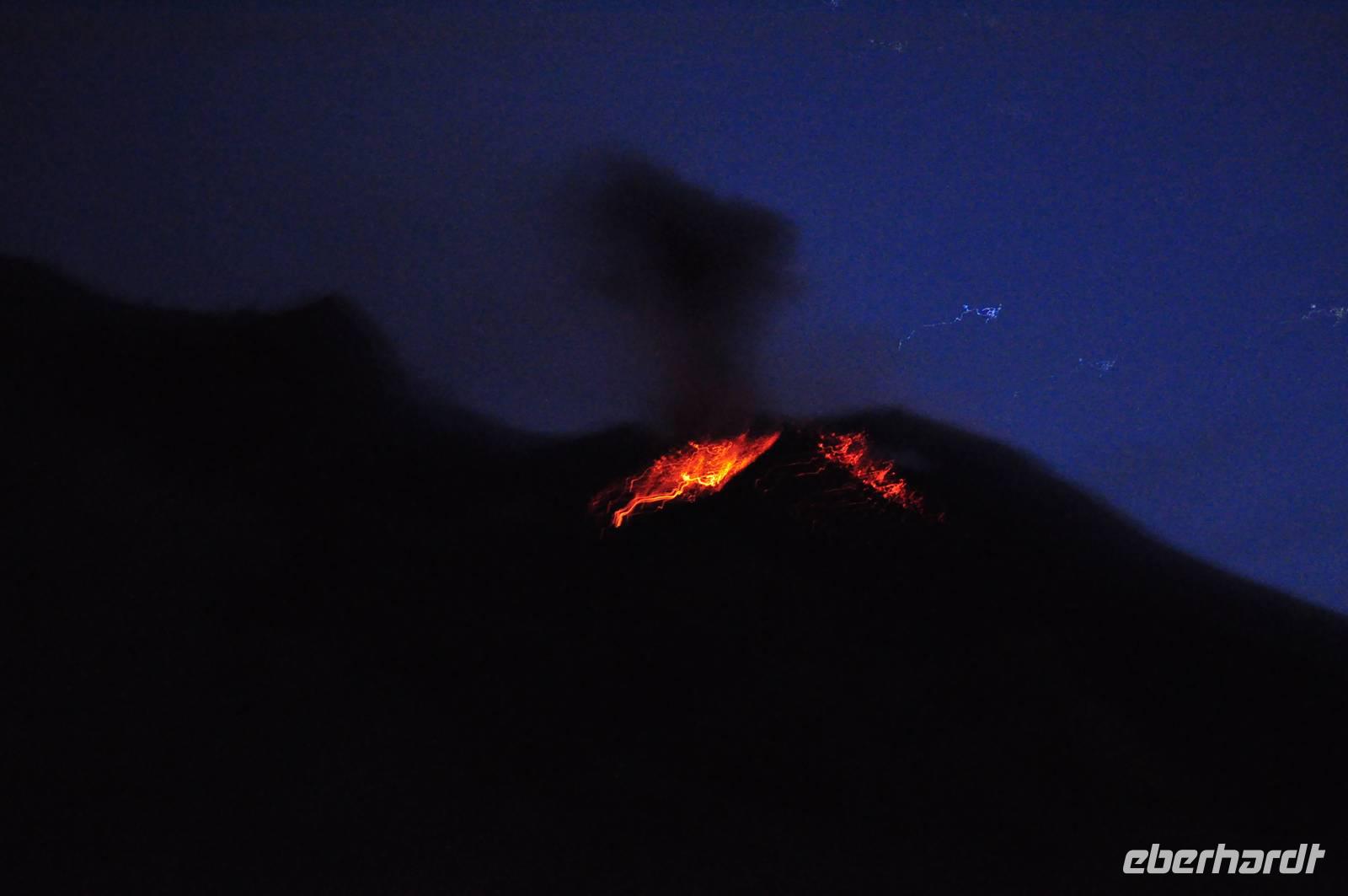 Wir sitzen auf dem Gipfelgrat in ca. 942m Höhe. Die Sonne ist untergegangen. Kurz vor den Eruptionen nehmen wir ein Grollen wahr, dann bricht er aus. Eine Gas- und Tephrawolke wird ausgestoßen. Rotglühendes Material fliegt durch die Luft und lagert sich im Krater ab. Ein beeindruckendes Naturschauspiel.