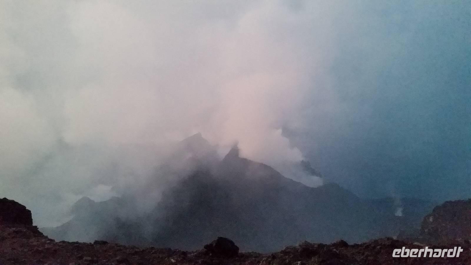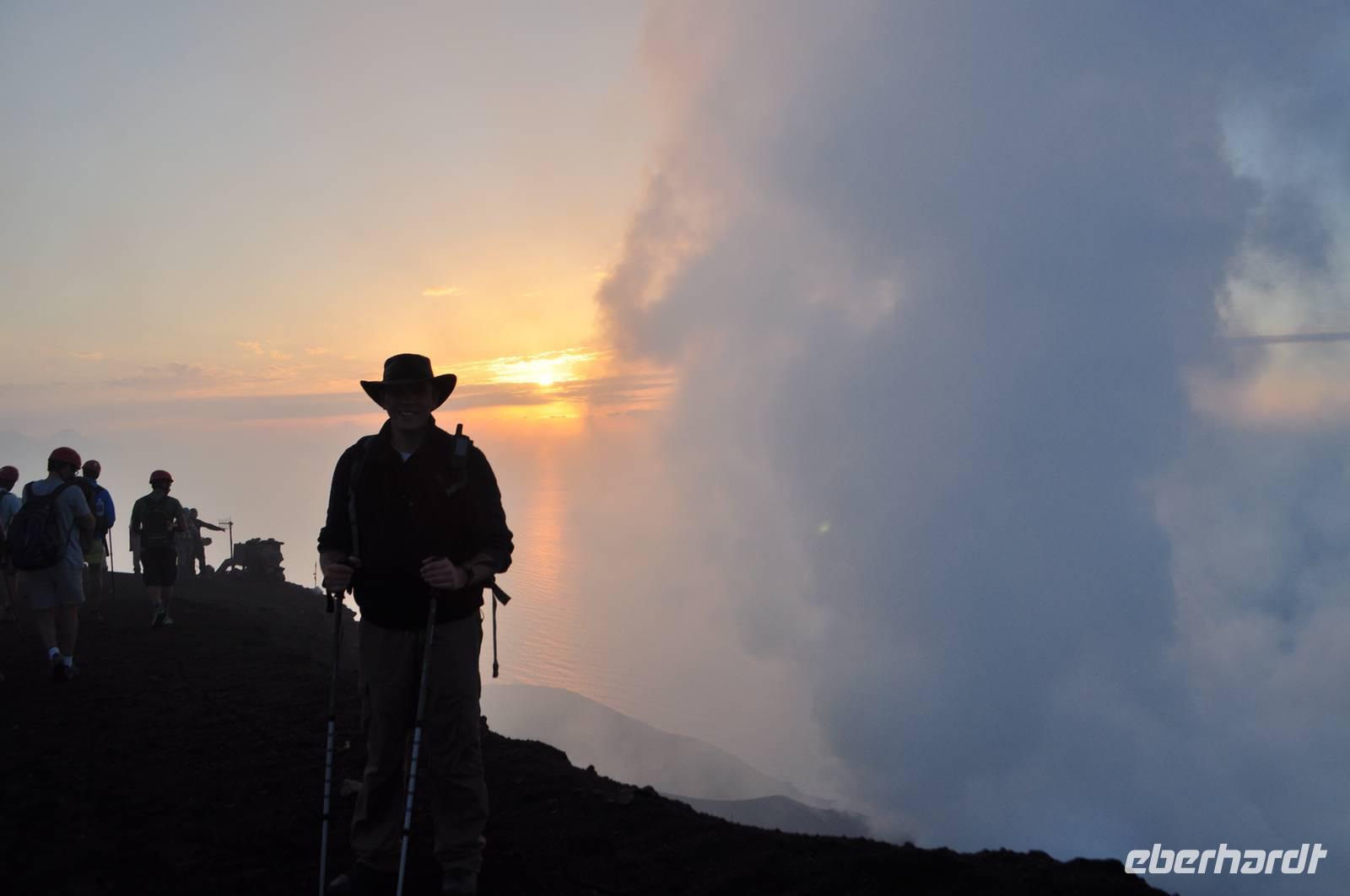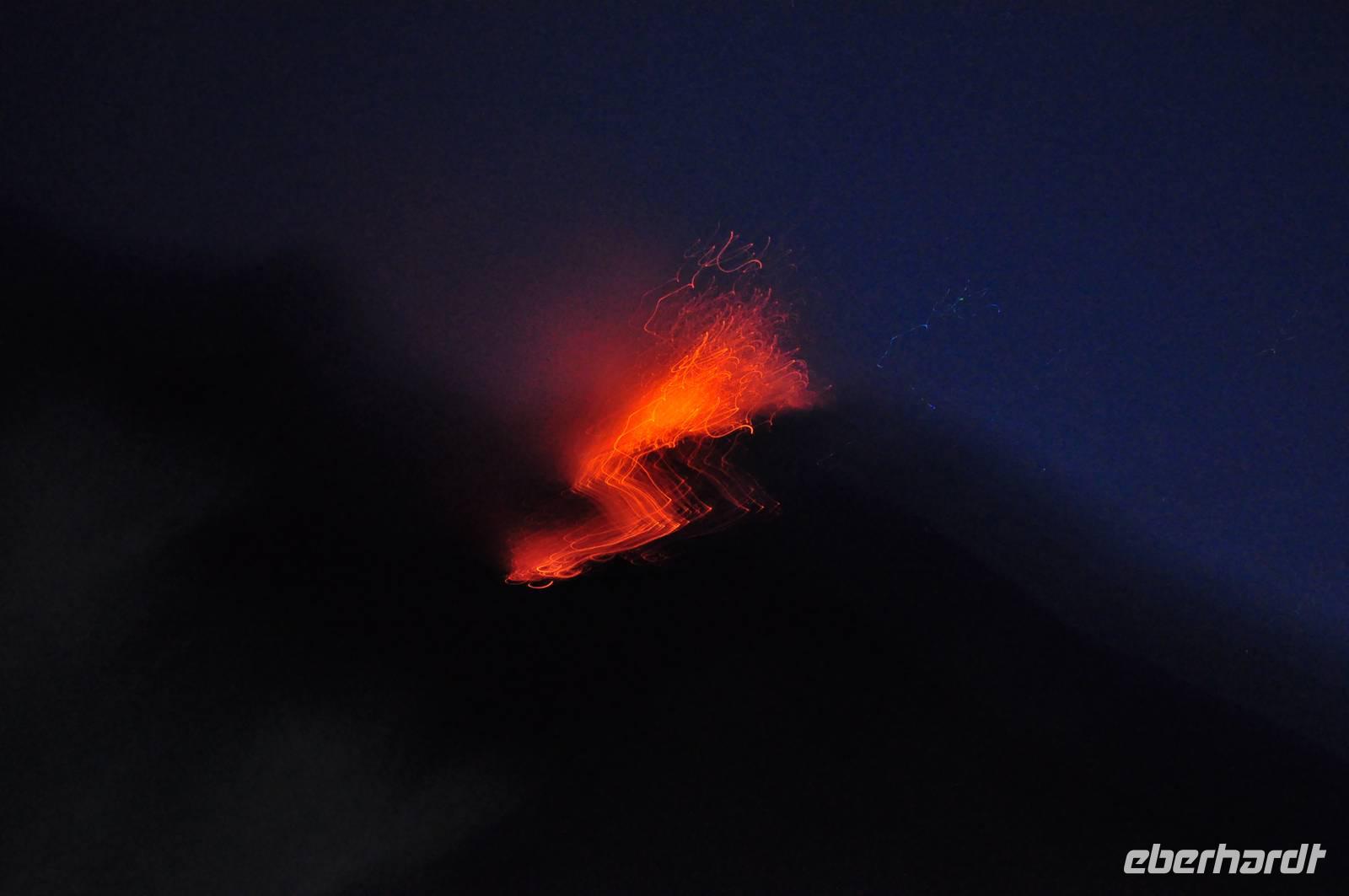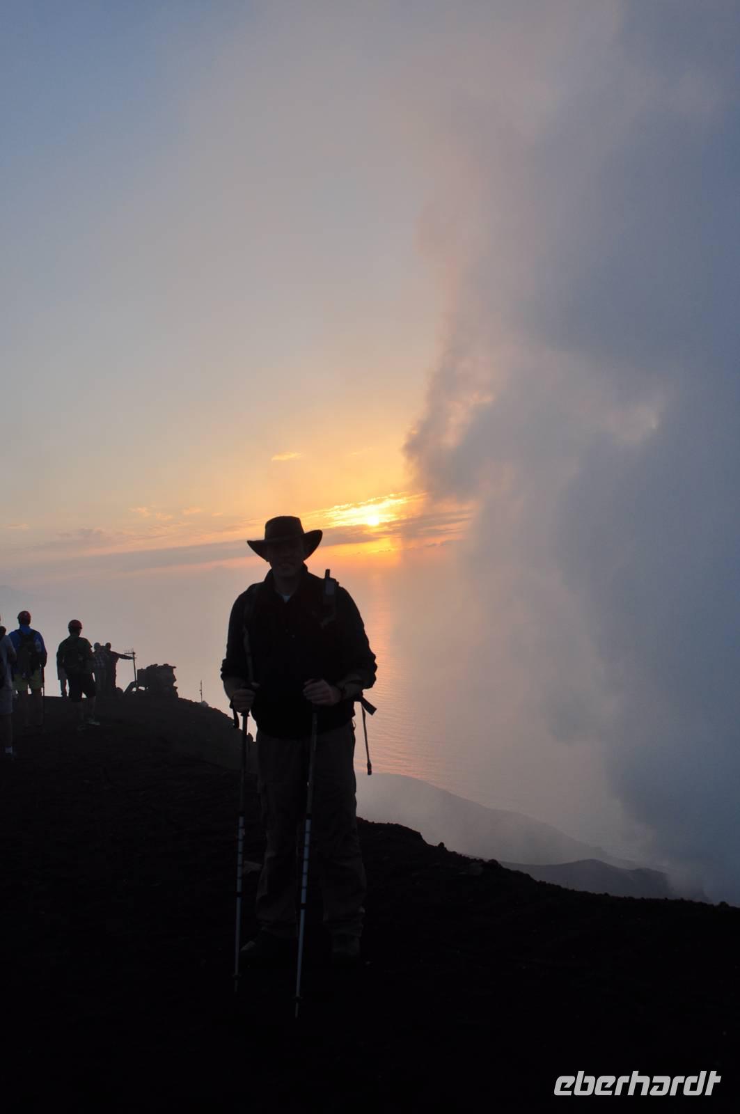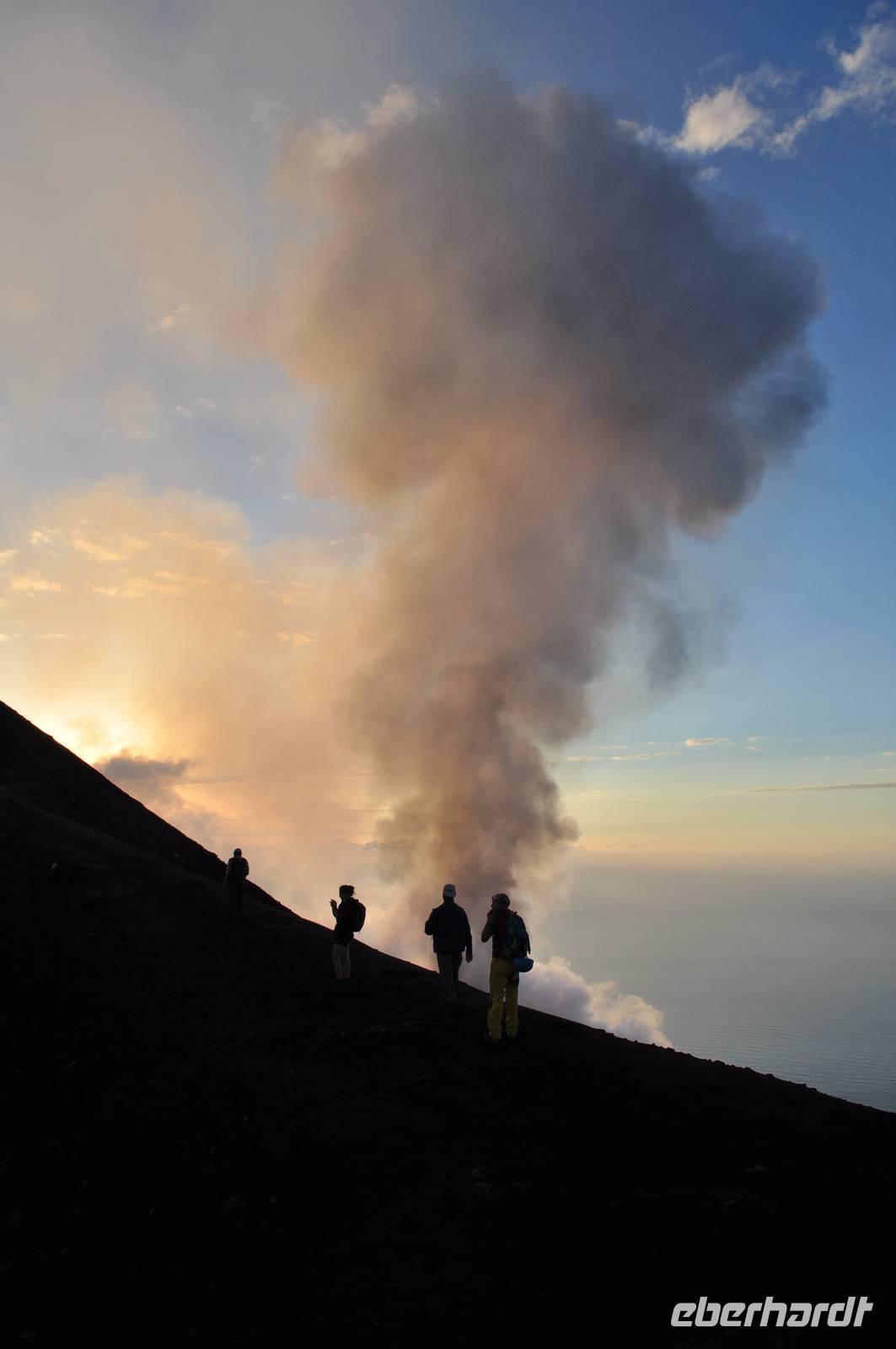 Wir sitzen auf dem Gipfelgrat in ca. 942m Höhe. Die Sonne ist untergegangen. Kurz vor den Eruptionen nehmen wir ein Grollen wahr, dann bricht er aus. Eine Gas- und Tephrawolke wird ausgestoßen. Rotglühendes Material fliegt durch die Luft und lagert sich im Krater ab. Ein beeindruckendes Naturschauspiel.